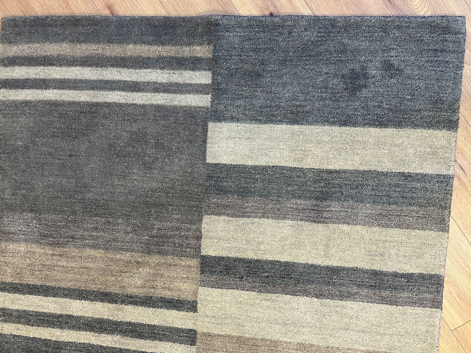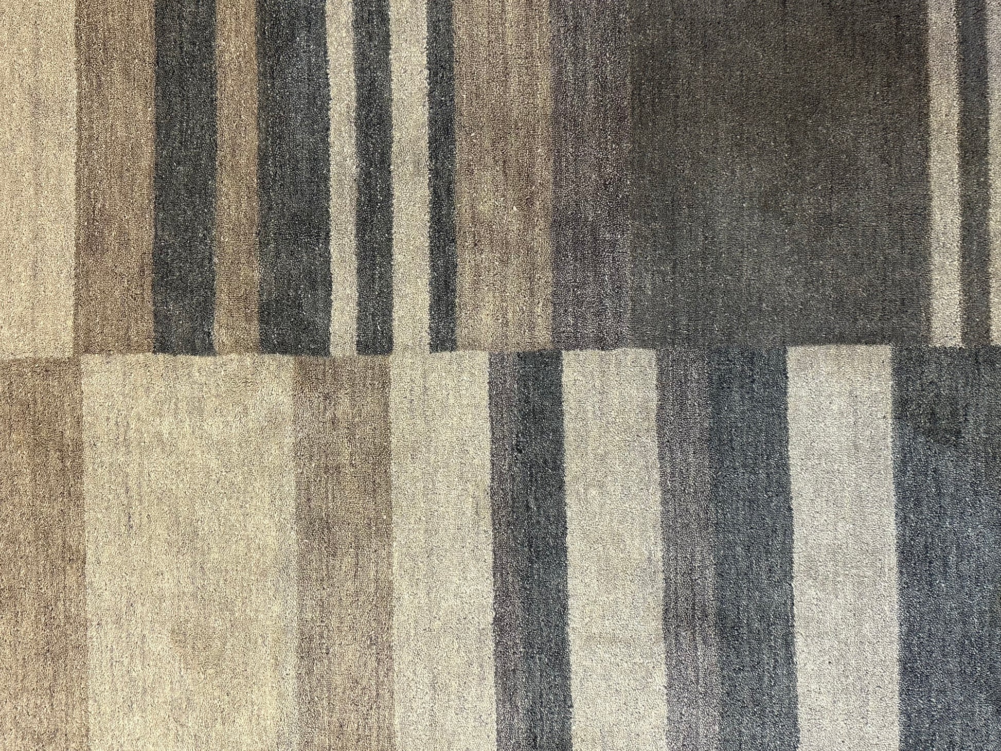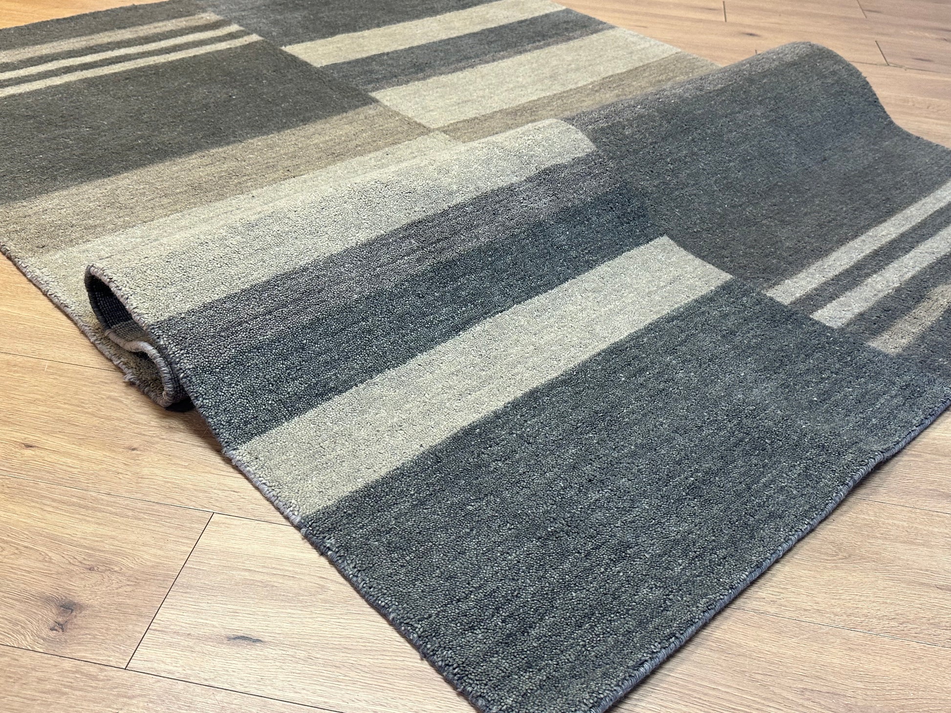 angeboten wird ein handgeknüpfter Gabbeh Teppich aus reiner Schurwolle. Das moderne Blockstreifen-Design in gedeckten Grau- und Beigetönen sorgt für eine klare, zeitlose Optik. Durch die harmonische Farbkomposition und die minimalistische Gestaltung fügt sich dieser Teppich nahtlos in moderne wie klassische Wohnräume ein.