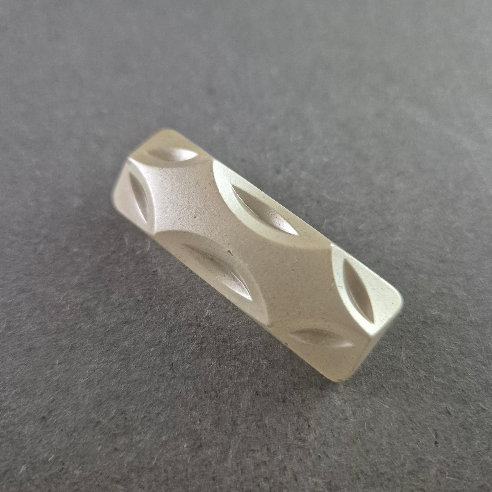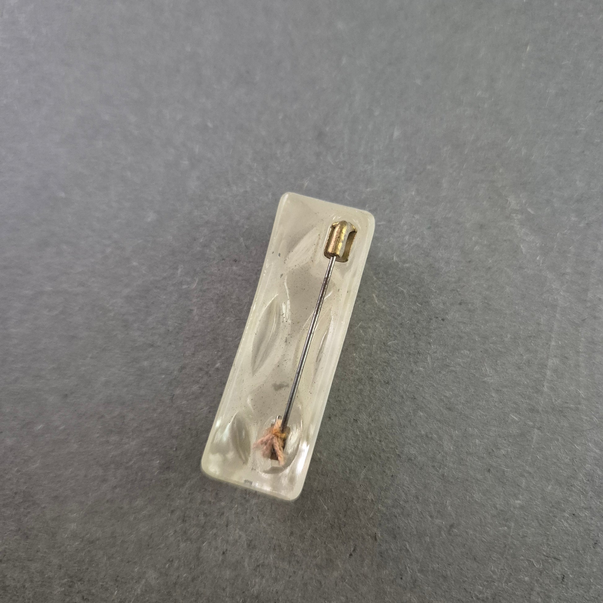 Diese elegante Vintage-Brosche überzeugt mit einer schlichten, rechteckigen Form und einem geometrisch eingeritzten Muster. Die elfenbeinfarbene Oberfläche mit mattem Finish verleiht dem Accessoire einen dezenten, doch stilvollen Charakter. Die Anstecknadel auf der Rückseite macht das Stück perfekt für Jacken, Blusen oder Taschen – ein zurückhaltender Eyecatcher für Liebhaber minimalistischer Formen.