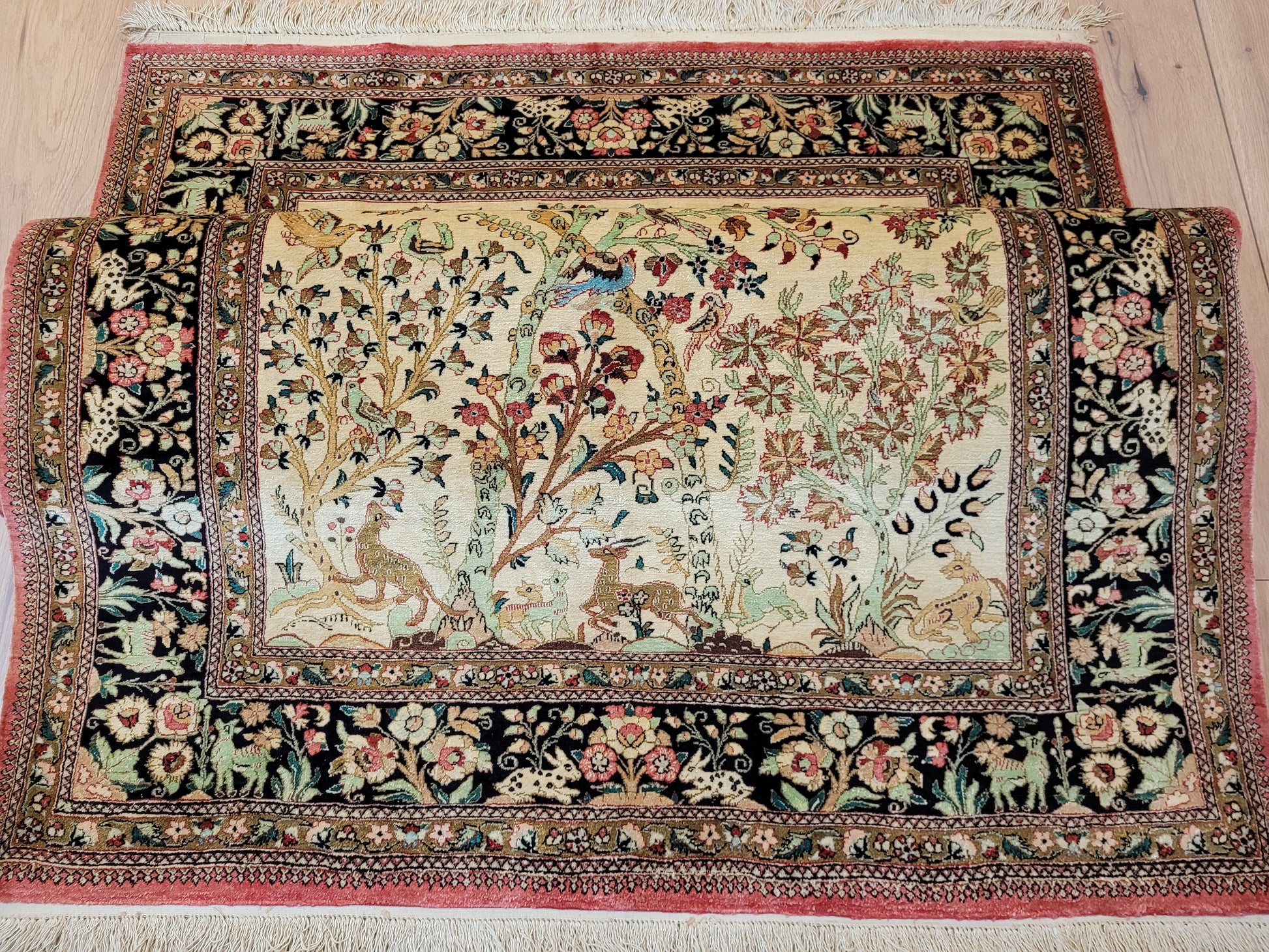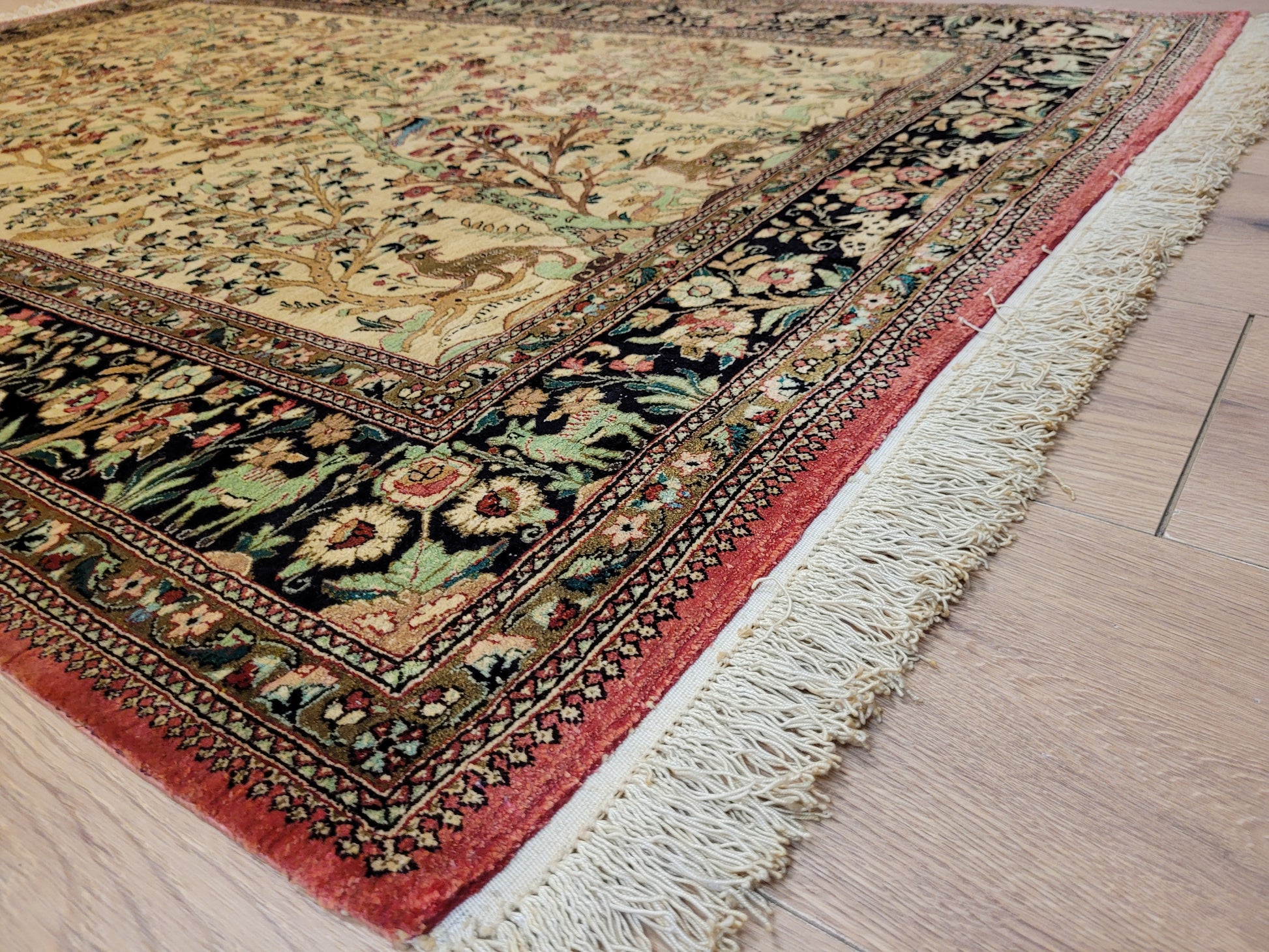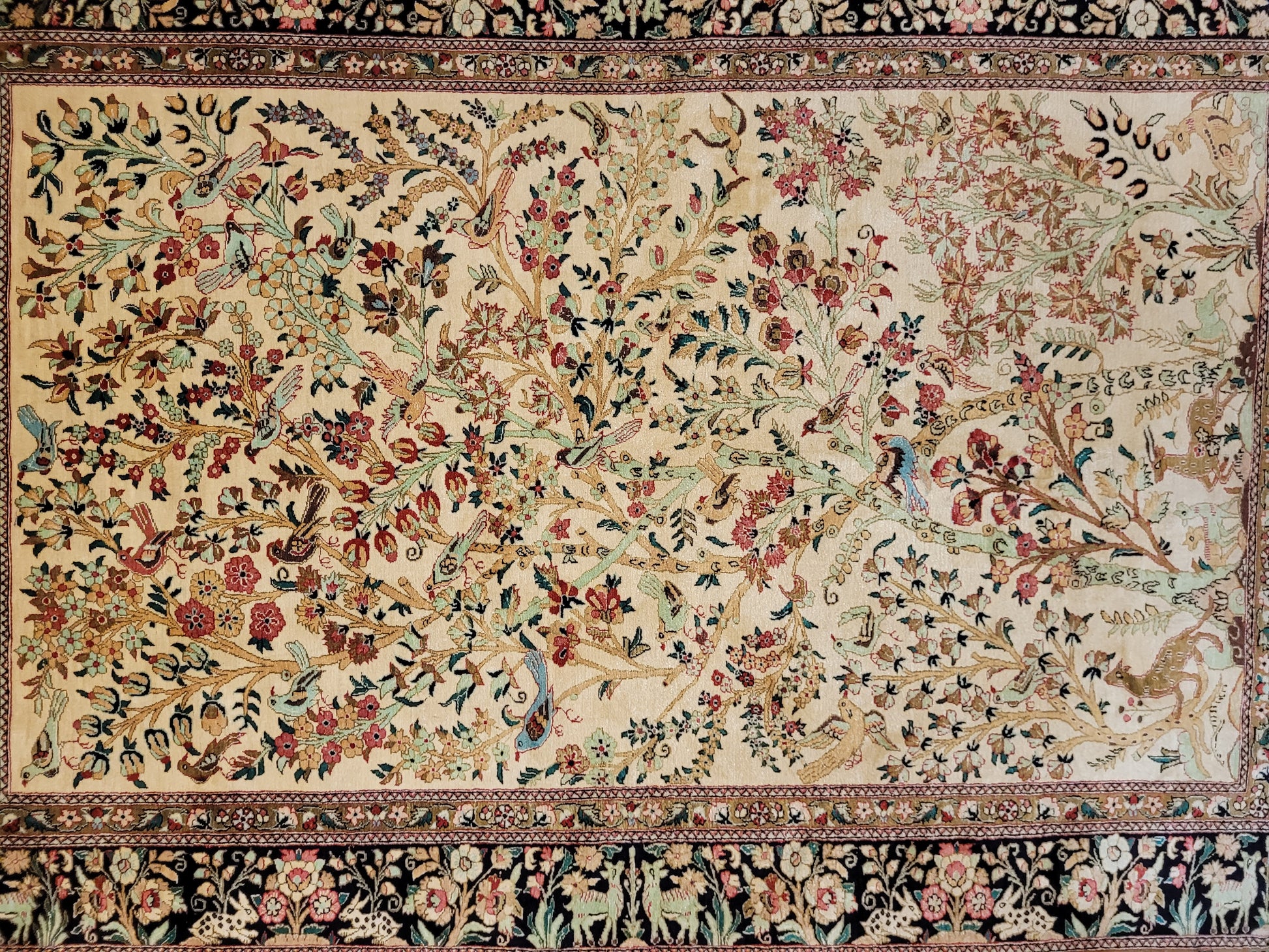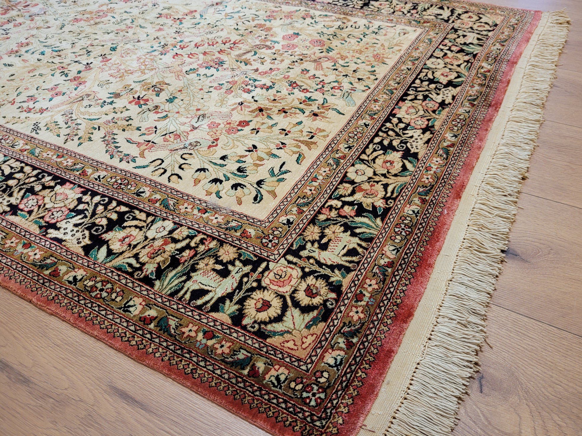 angeboten wird ein meisterhaft gearbeiteter Ghom Teppich aus reiner Seide auf Seide, handgeknüpft in feiner Knüpfung. Das detailreiche Design zeigt eine figürliche Jagdszene mit Gazellen, Hirschen, Hasen und Vögeln, eingebettet in eine üppige Blüten- und Rankenlandschaft. Die Bordüre mit kunstvollen floralen Ornamenten und Tierdarstellungen rahmt das Gesamtbild edel ein.