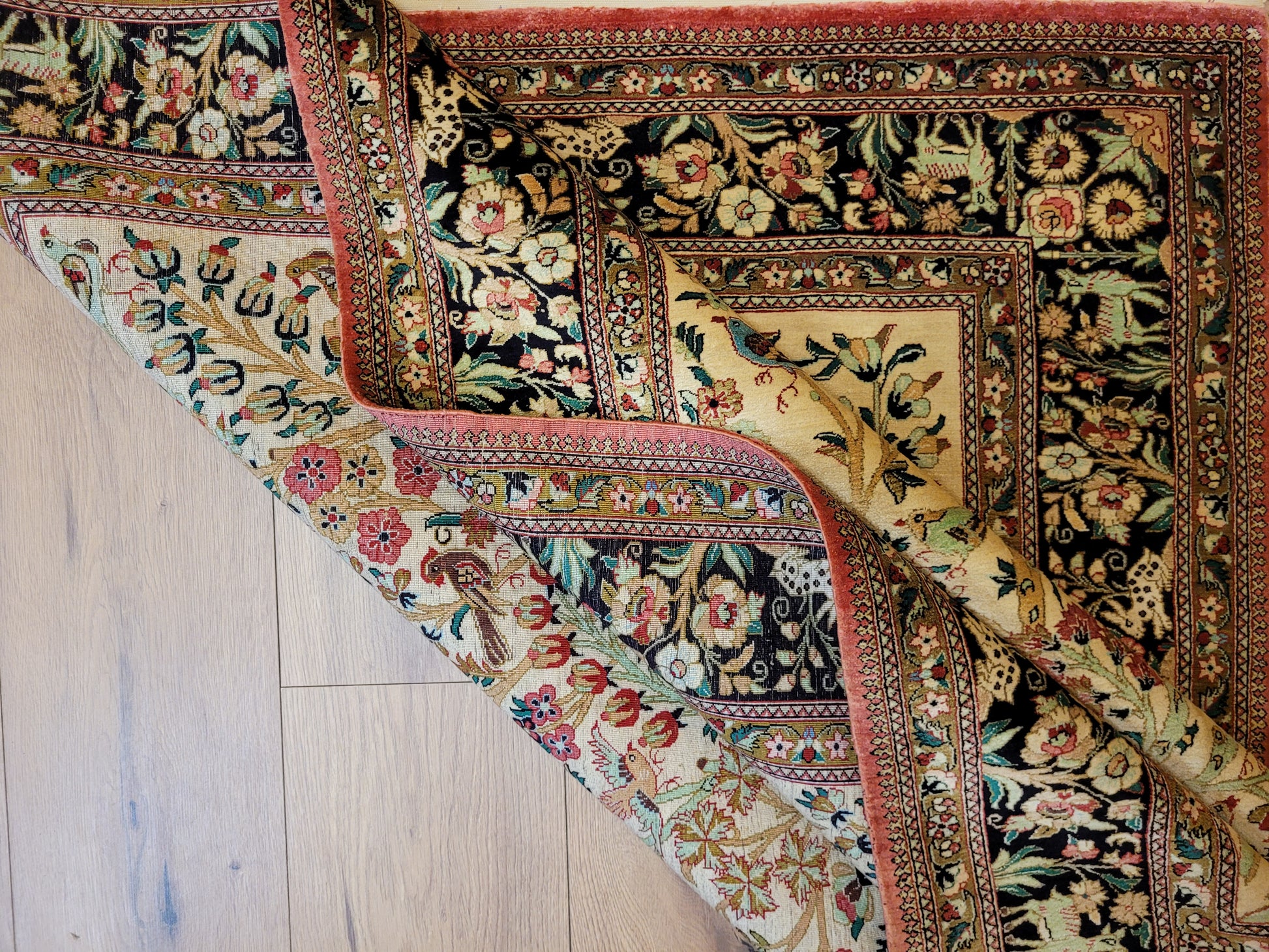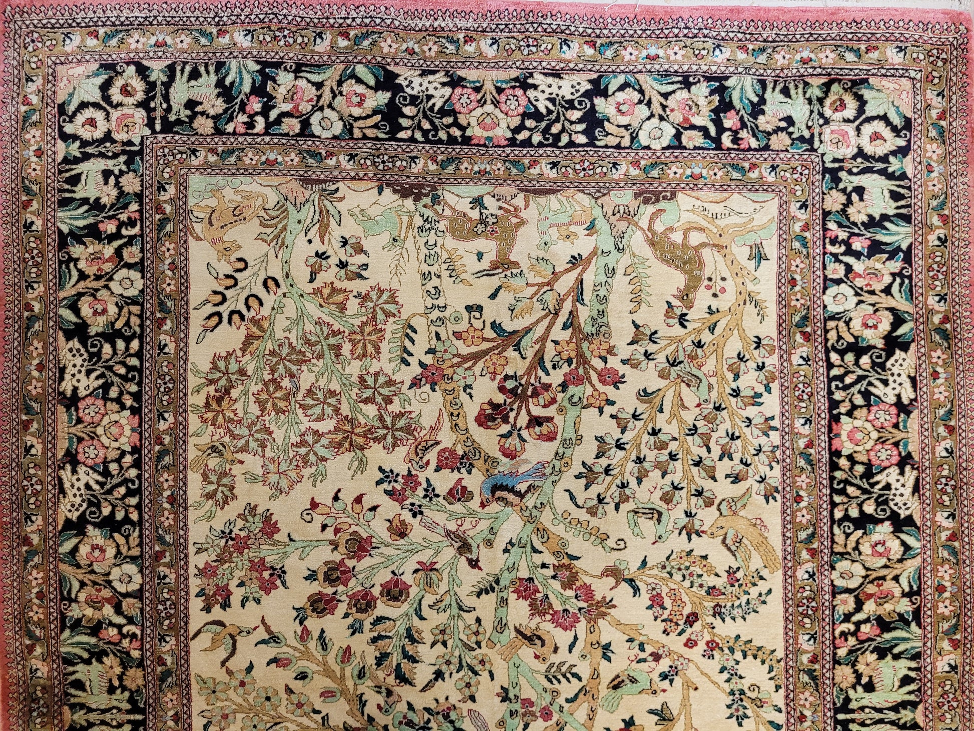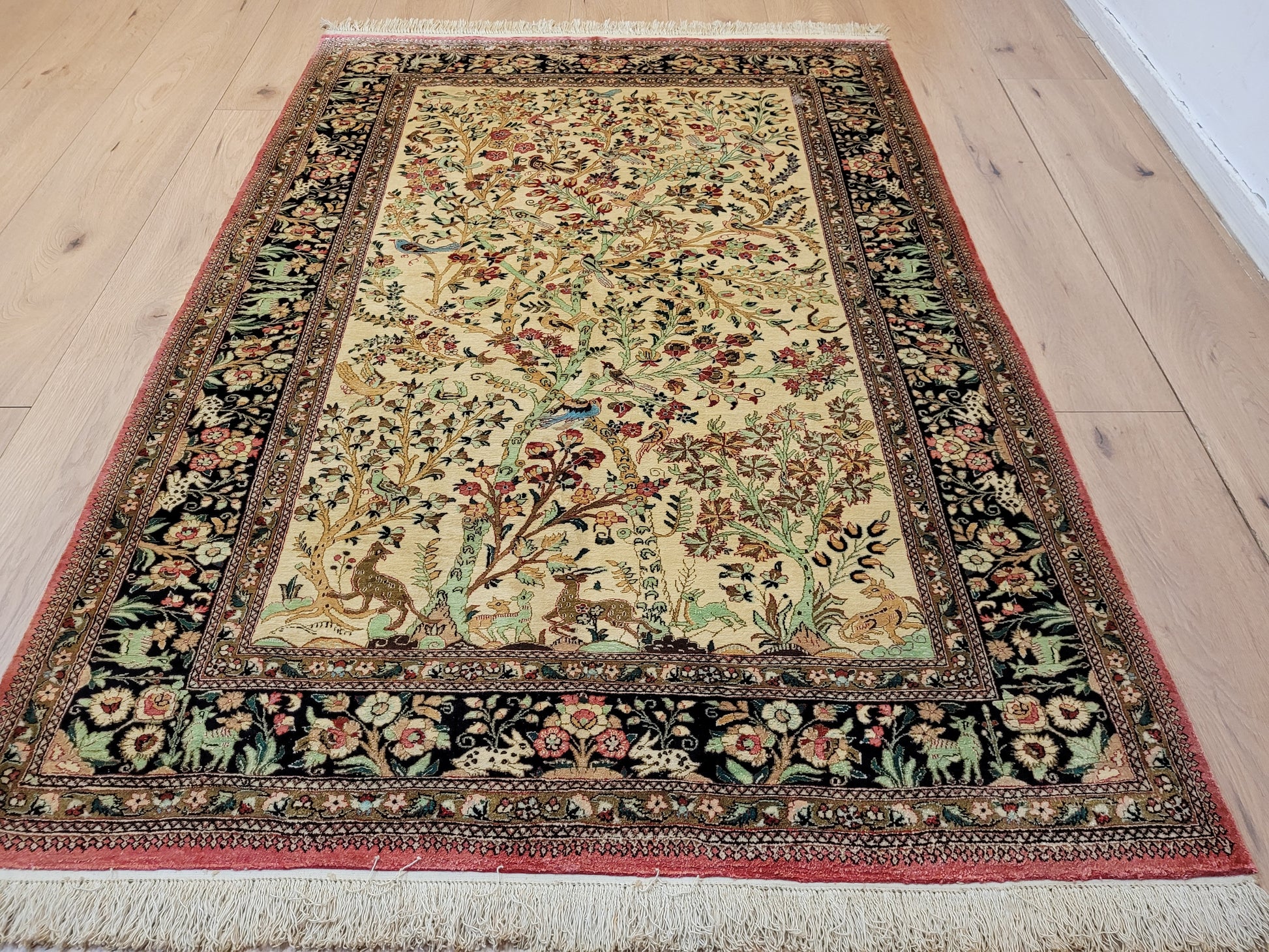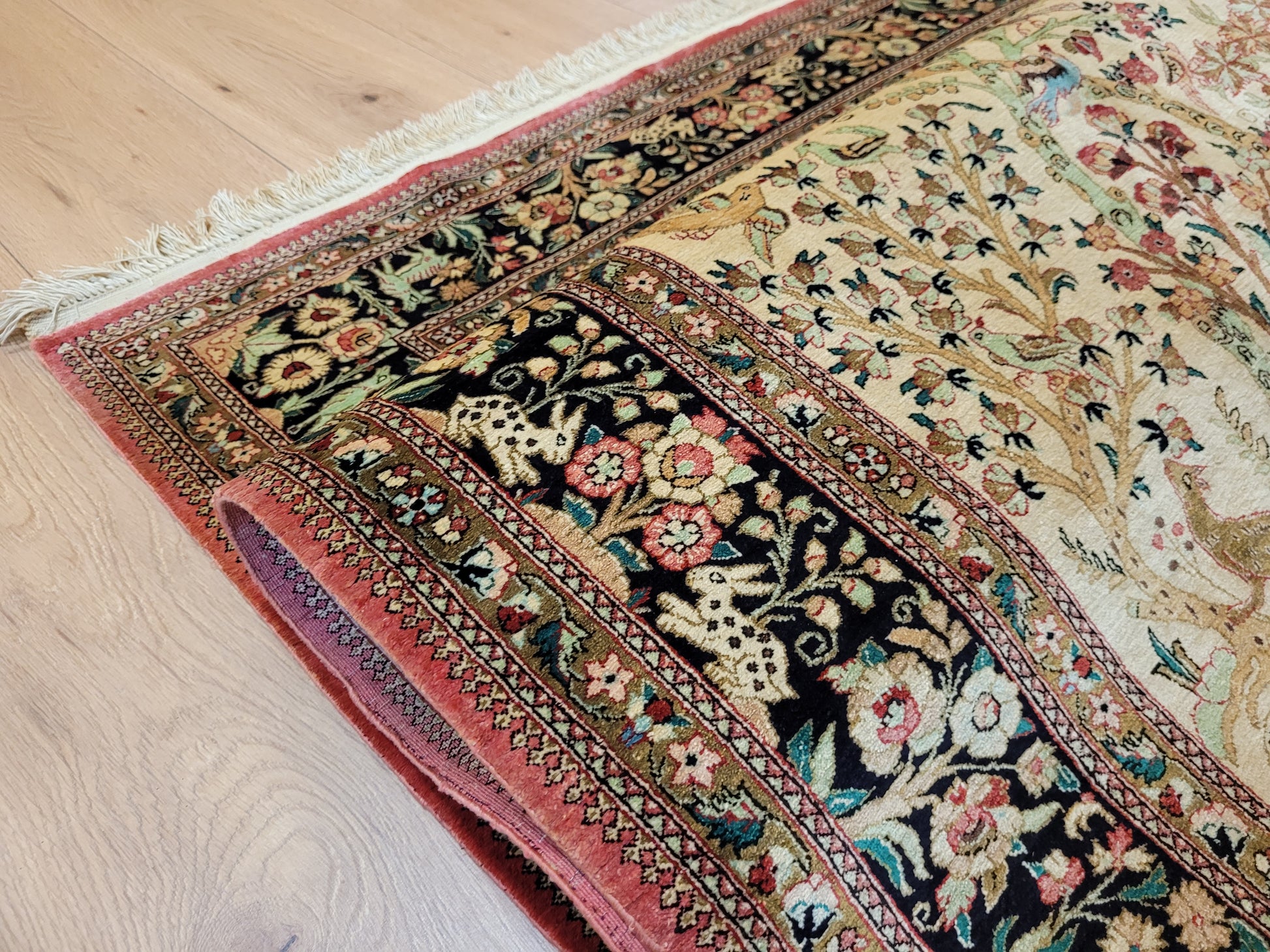 angeboten wird ein meisterhaft gearbeiteter Ghom Teppich aus reiner Seide auf Seide, handgeknüpft in feiner Knüpfung. Das detailreiche Design zeigt eine figürliche Jagdszene mit Gazellen, Hirschen, Hasen und Vögeln, eingebettet in eine üppige Blüten- und Rankenlandschaft. Die Bordüre mit kunstvollen floralen Ornamenten und Tierdarstellungen rahmt das Gesamtbild edel ein.