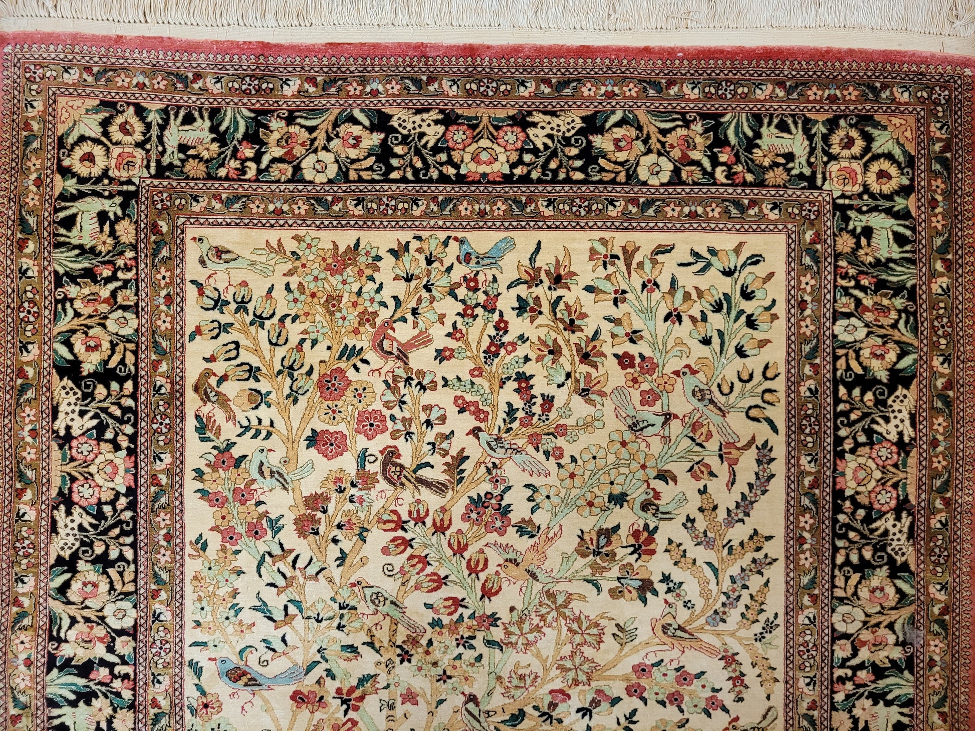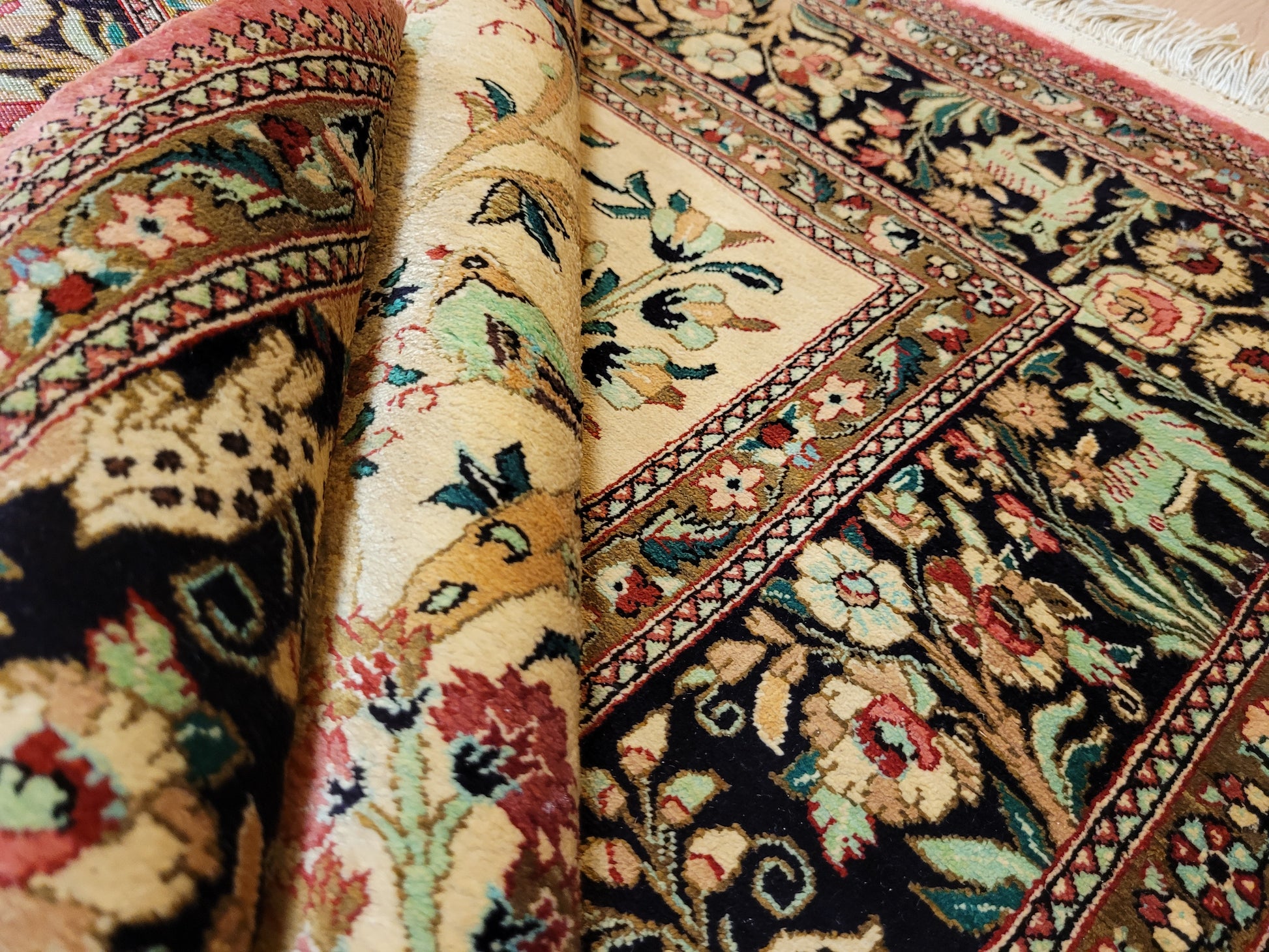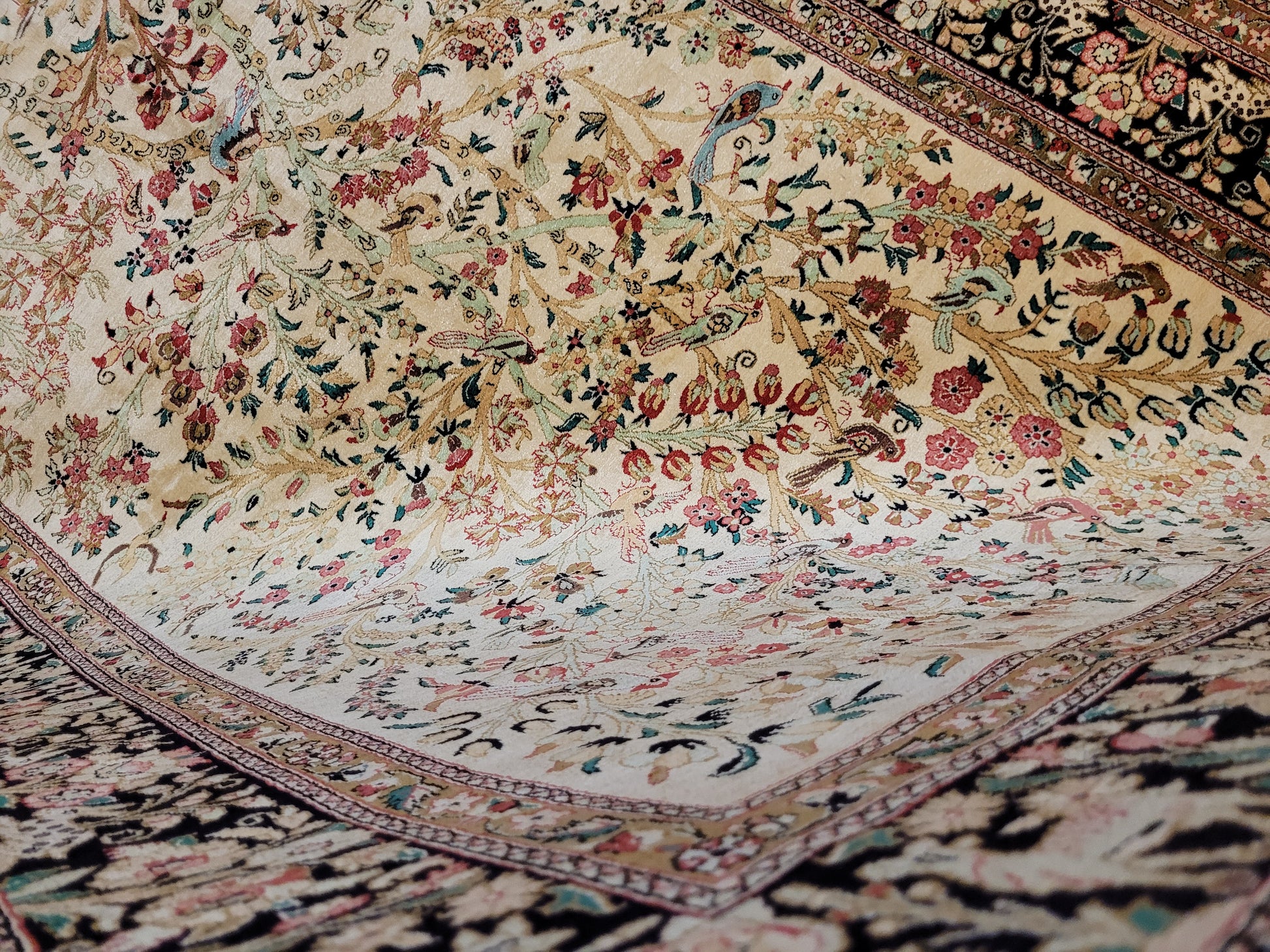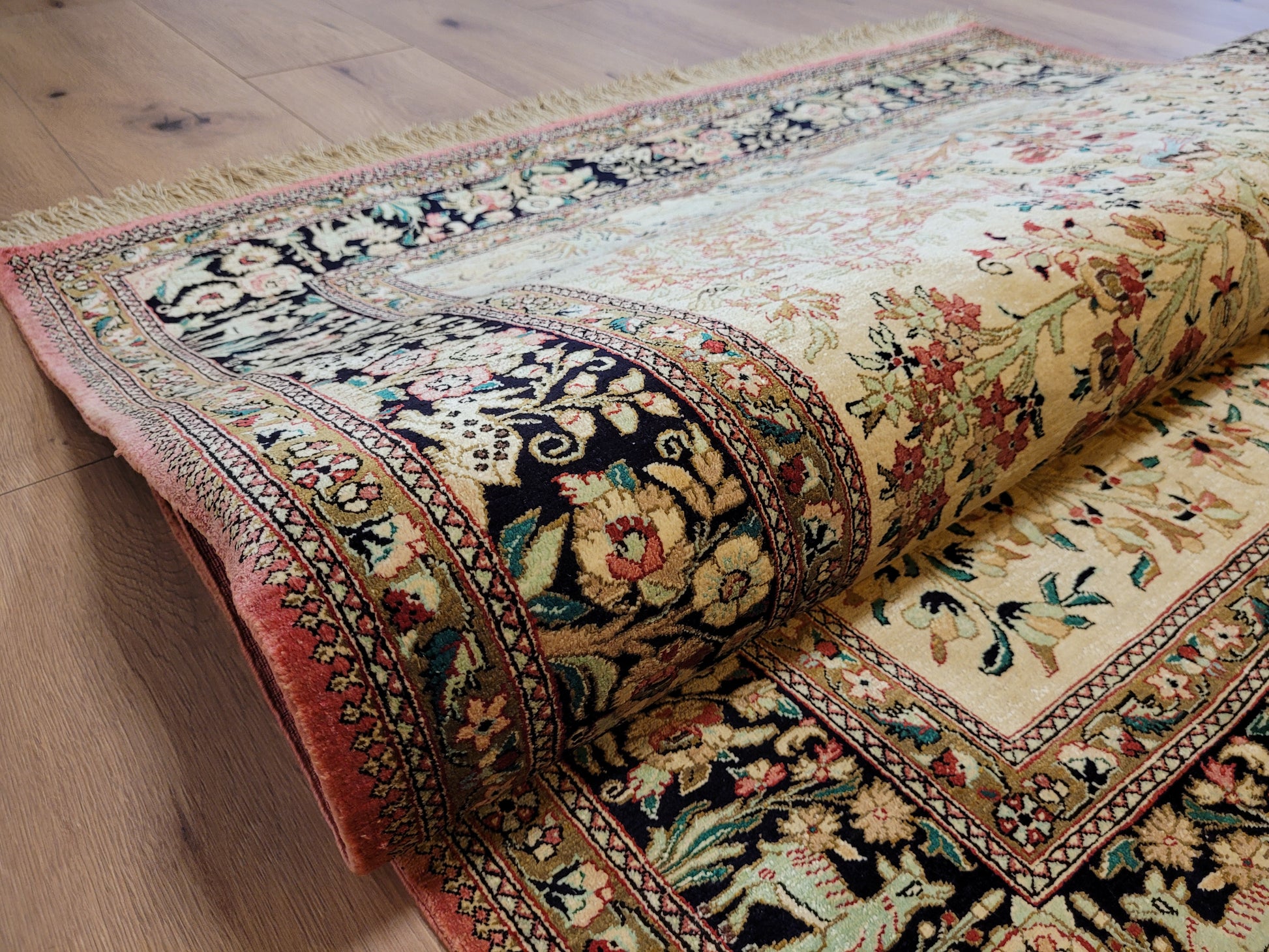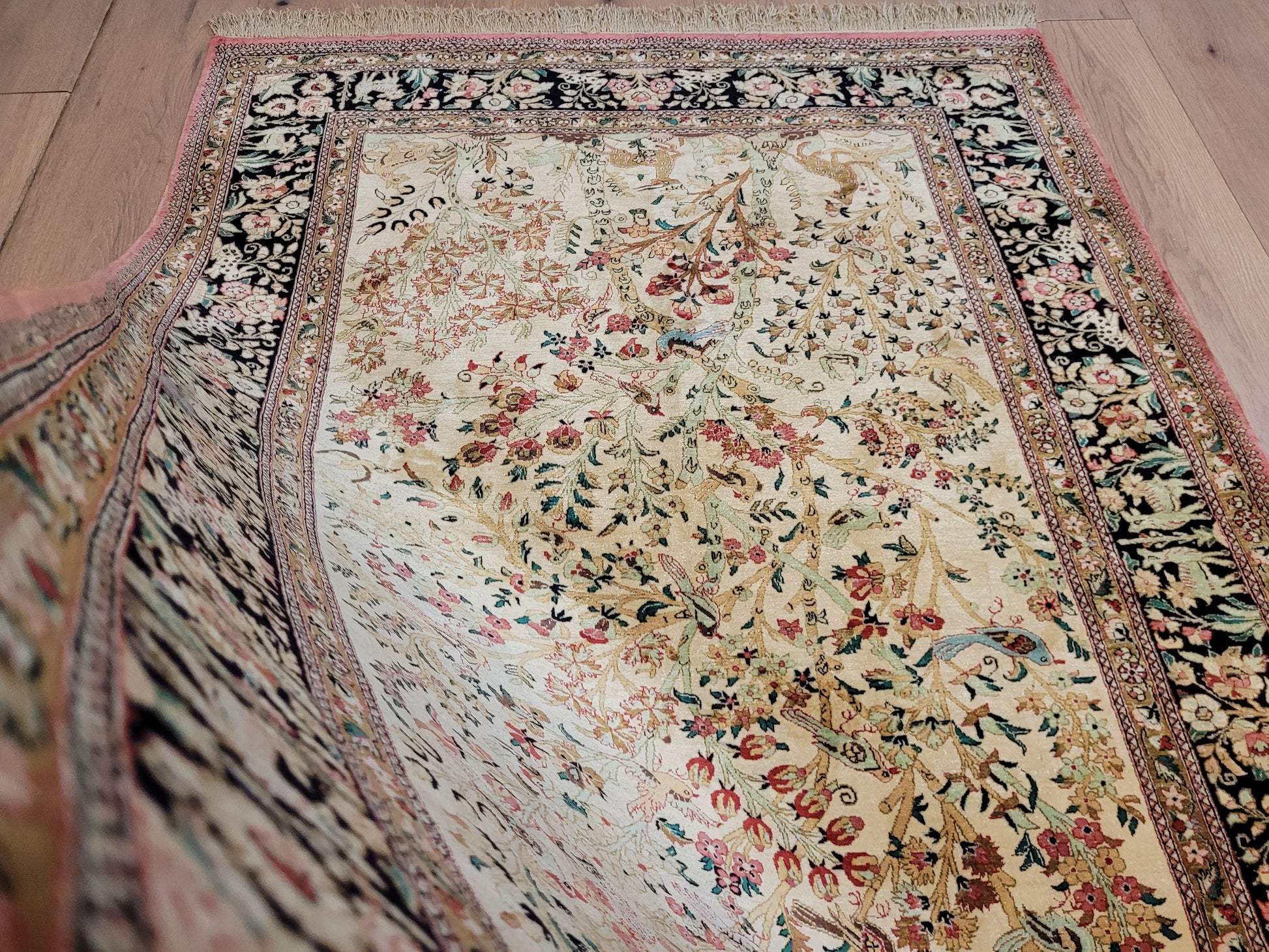Ghom Teppich Seide auf Seide Jagdszene florales Motiv feine Knüpfung