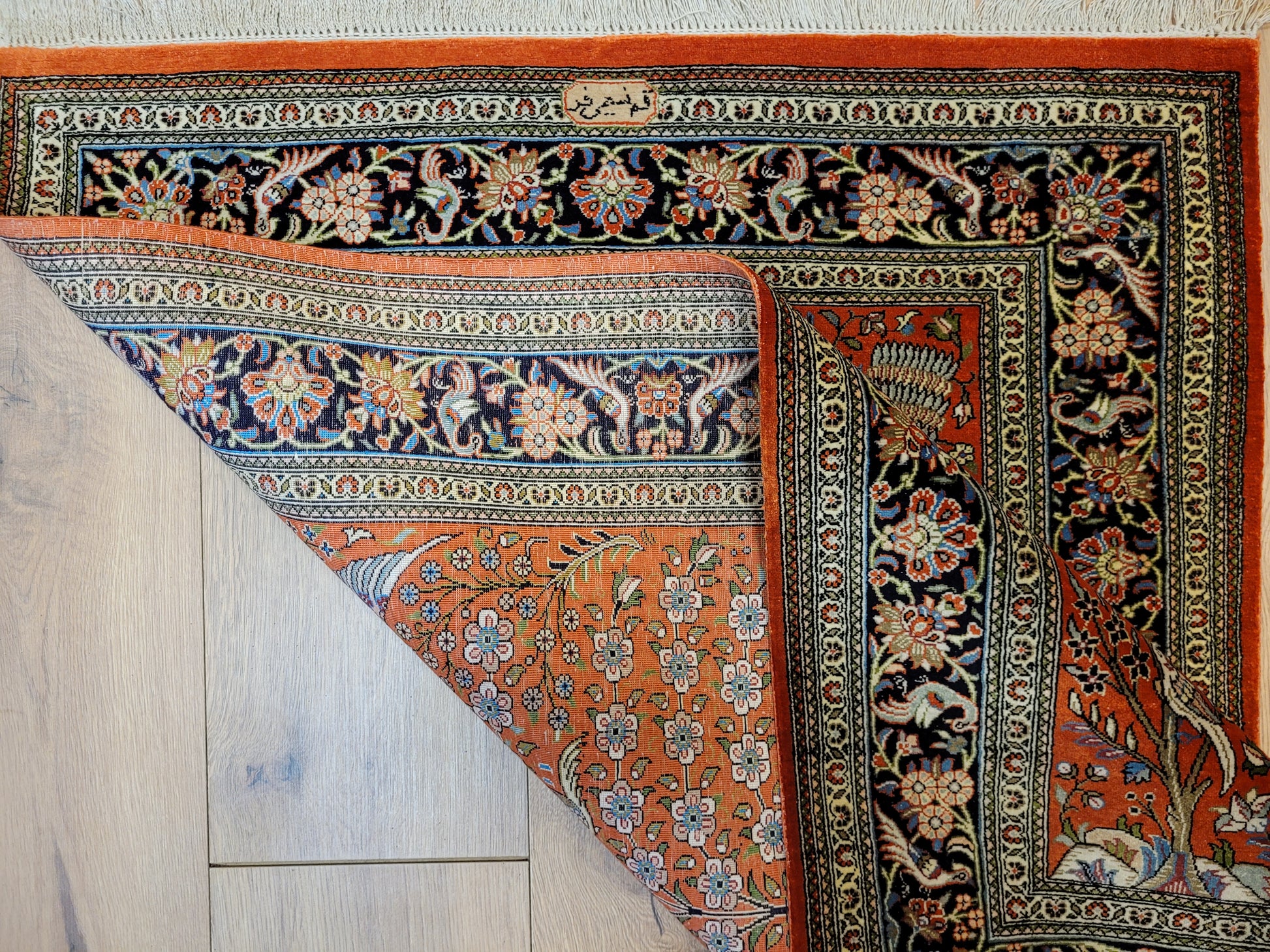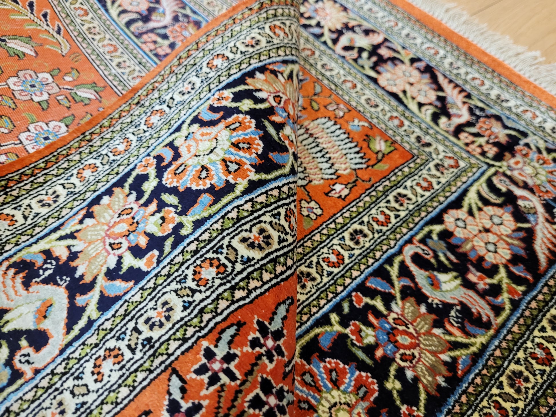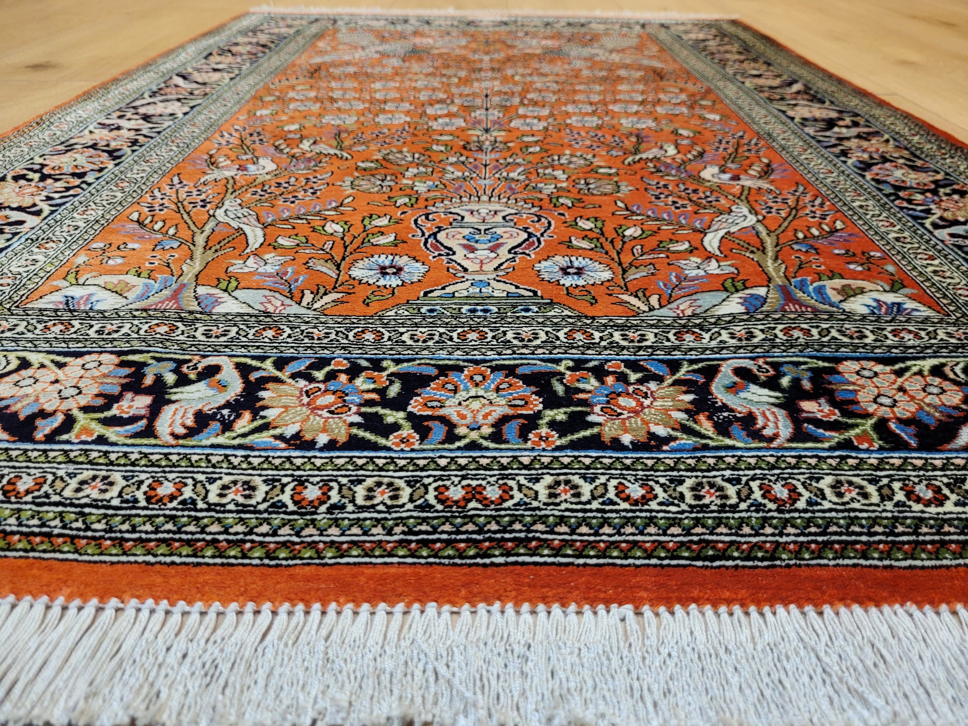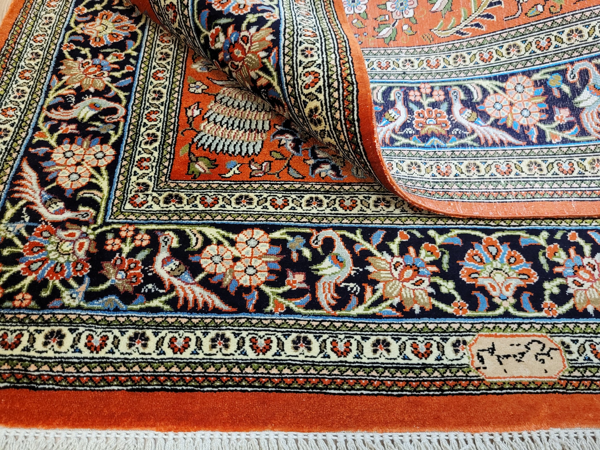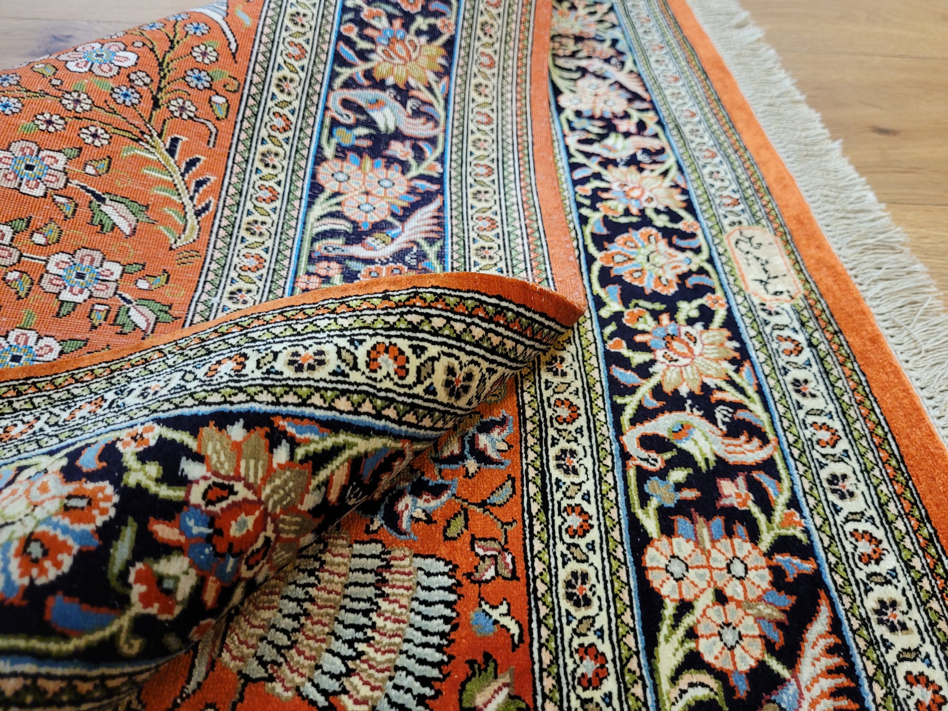 angeboten wird ein exquisites Ghom Teppich-Meisterwerk aus reiner Seide auf Seide, handgeknüpft in äußerst feiner Ausführung. Das Design zeigt ein prachtvolles florales Arrangement mit Blütenzweigen, Vögeln und einem zentralen Vasendekor. Zwei große Paradiesvögel schmücken die obere Partie des Feldes und verleihen dem Teppich eine besonders edle Ausstrahlung. Die umlaufende Bordüre ist reich verziert mit Blütenranken und kontrastiert eindrucksvoll das leuchtende orangefarbene Grundfeld. Eine Signatur im oberen Bereich unterstreicht die künstlerische Qualität dieses Stückes.