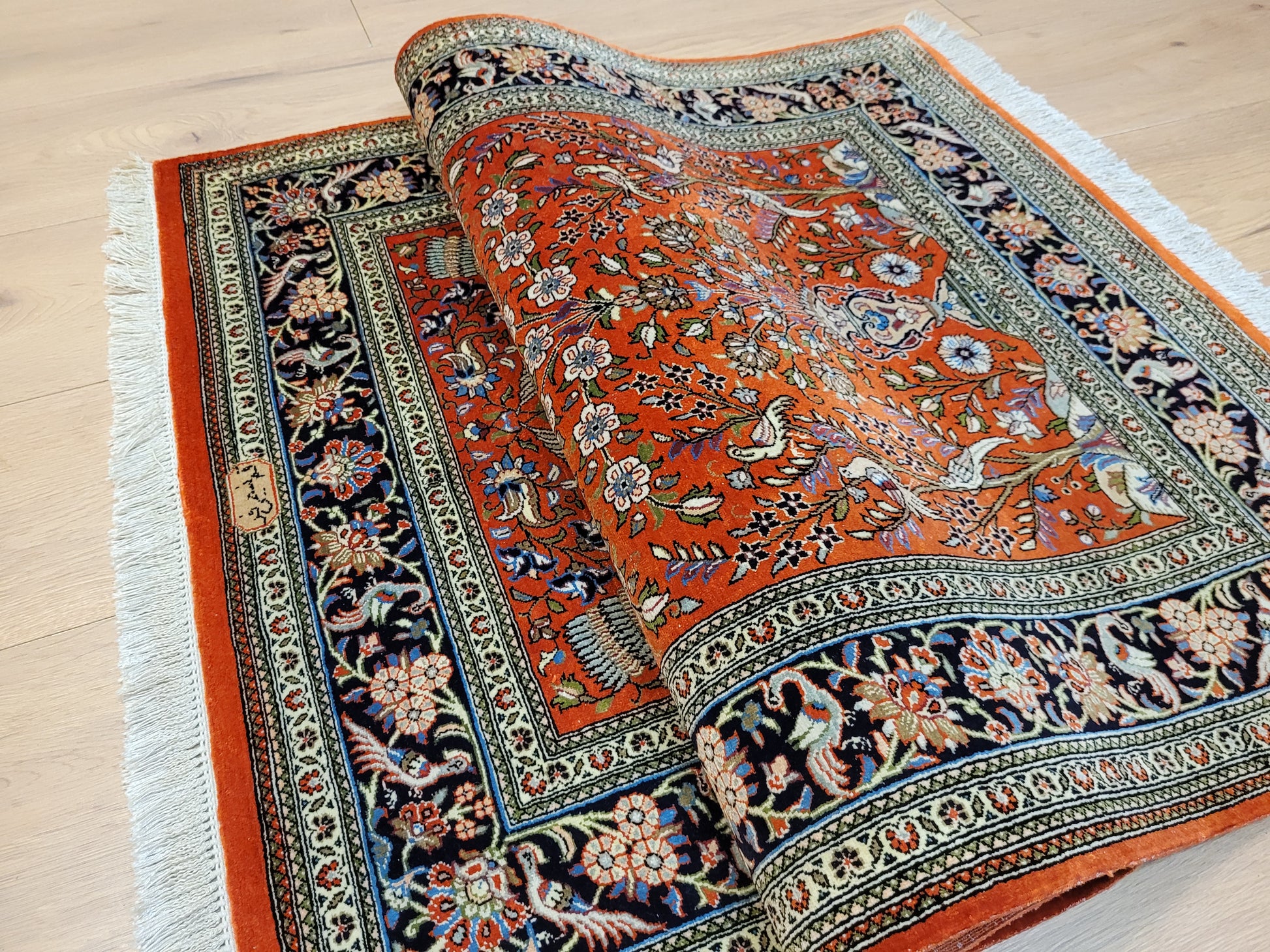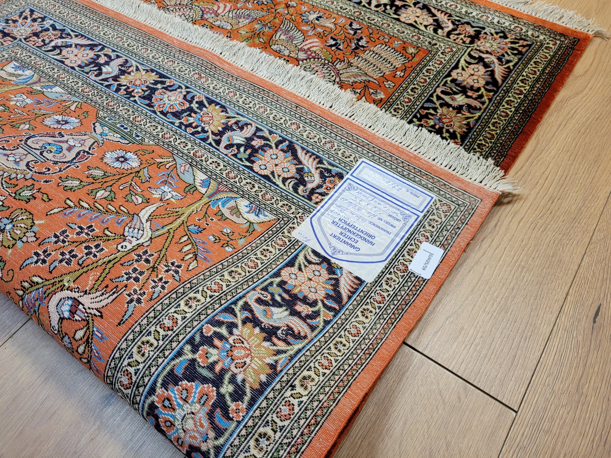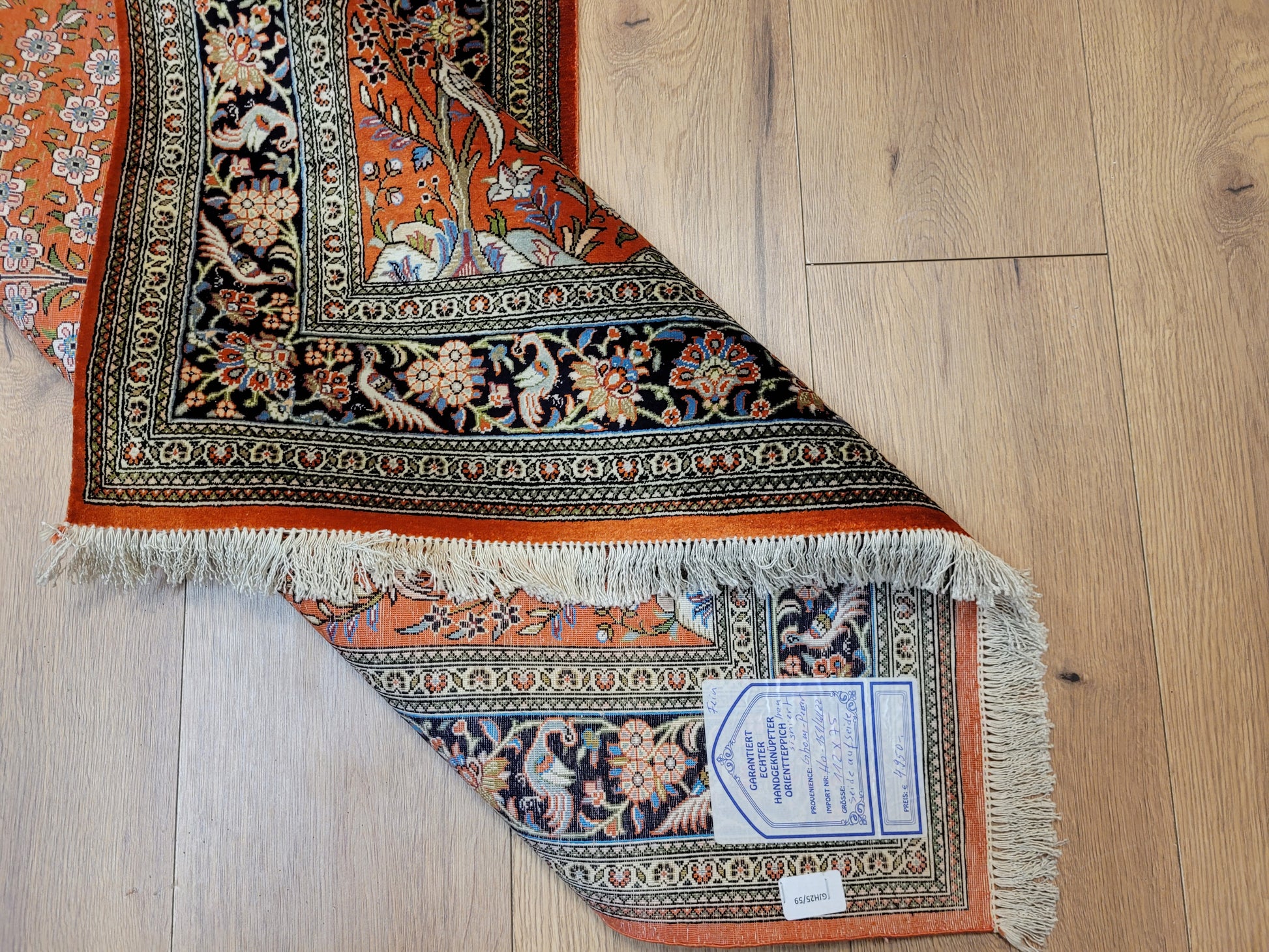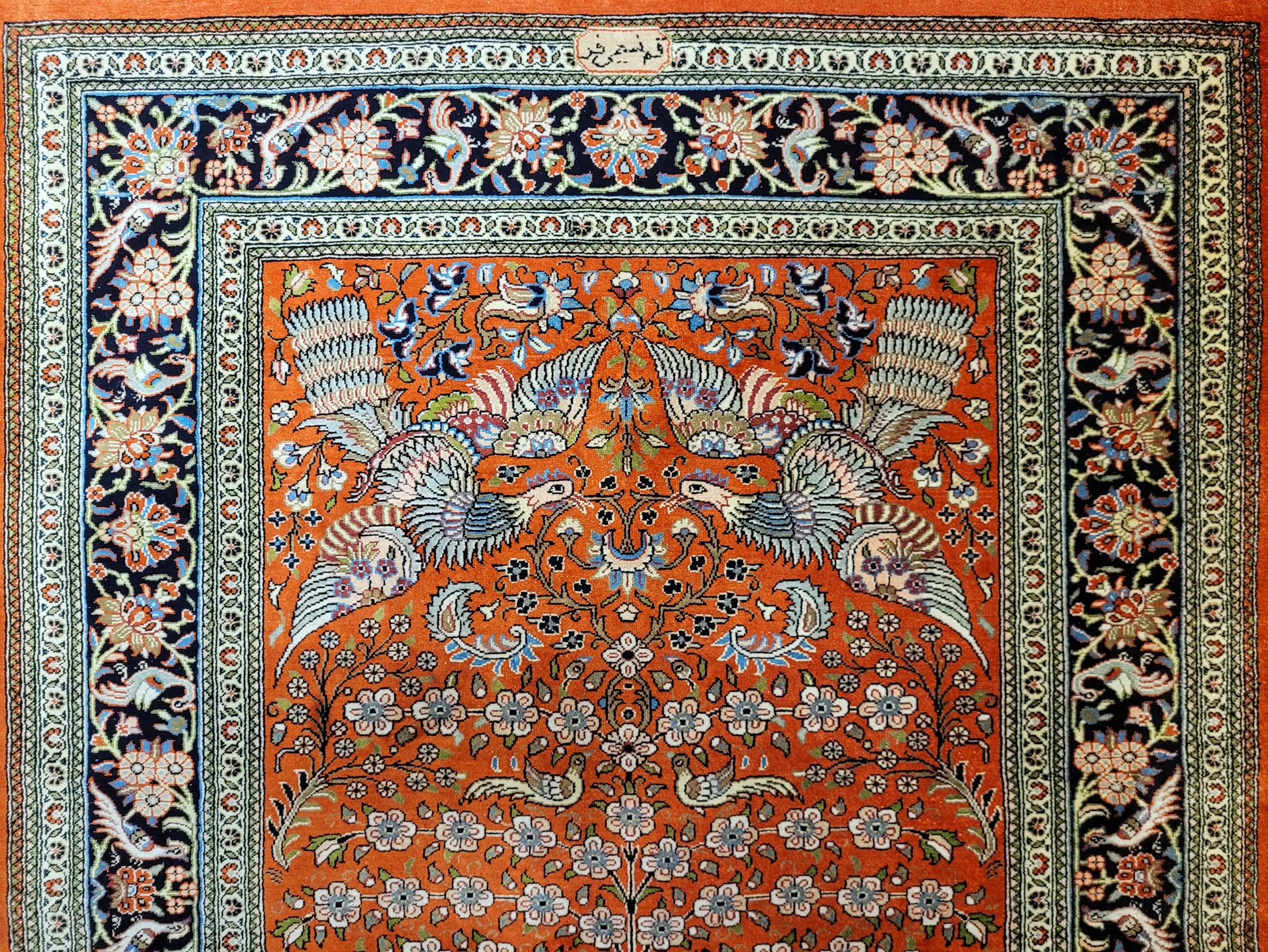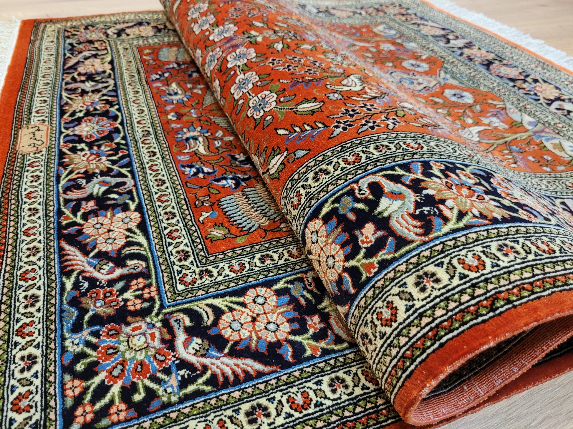 angeboten wird ein exquisites Ghom Teppich-Meisterwerk aus reiner Seide auf Seide, handgeknüpft in äußerst feiner Ausführung. Das Design zeigt ein prachtvolles florales Arrangement mit Blütenzweigen, Vögeln und einem zentralen Vasendekor. Zwei große Paradiesvögel schmücken die obere Partie des Feldes und verleihen dem Teppich eine besonders edle Ausstrahlung. Die umlaufende Bordüre ist reich verziert mit Blütenranken und kontrastiert eindrucksvoll das leuchtende orangefarbene Grundfeld. Eine Signatur im oberen Bereich unterstreicht die künstlerische Qualität dieses Stückes.