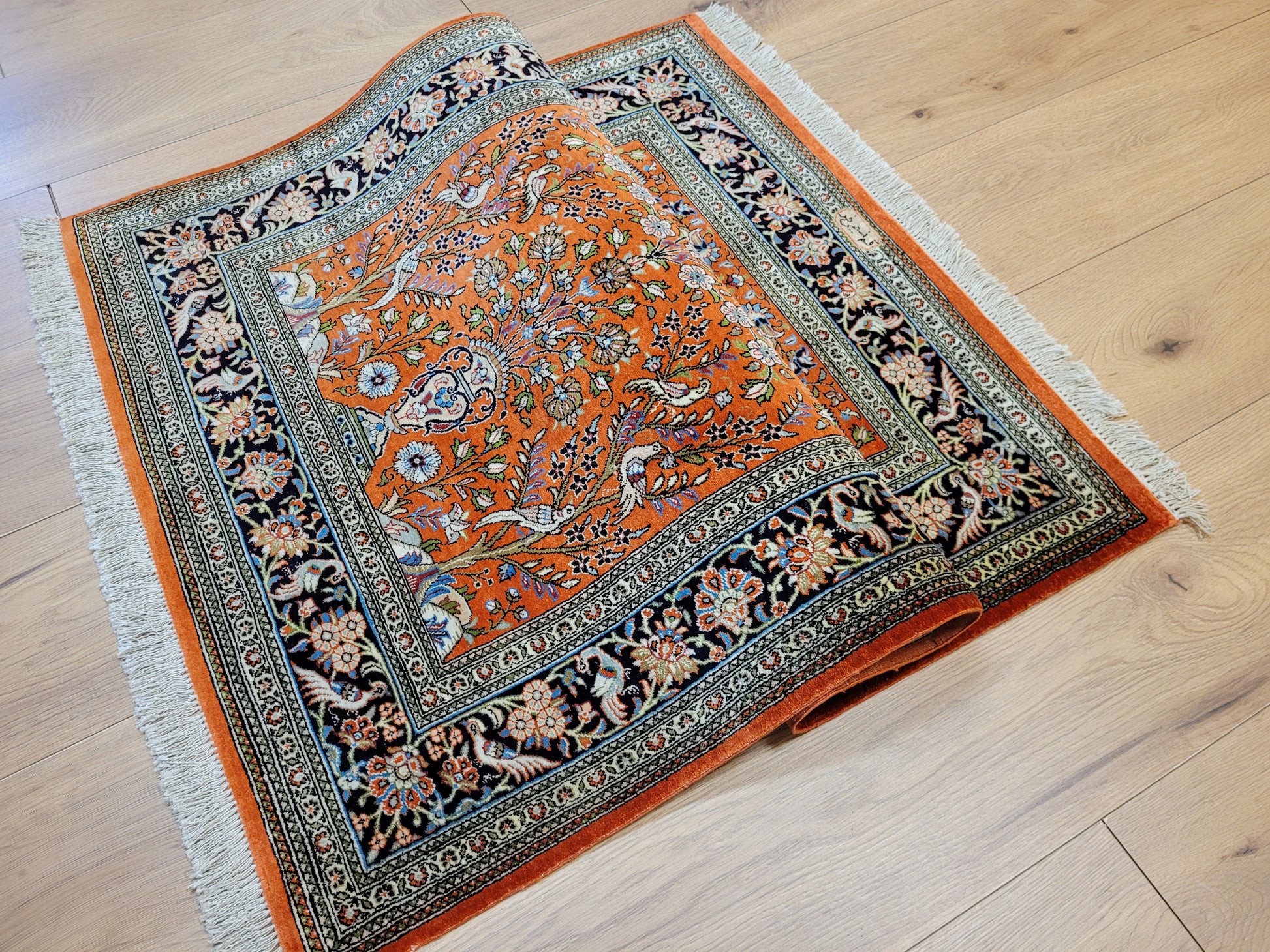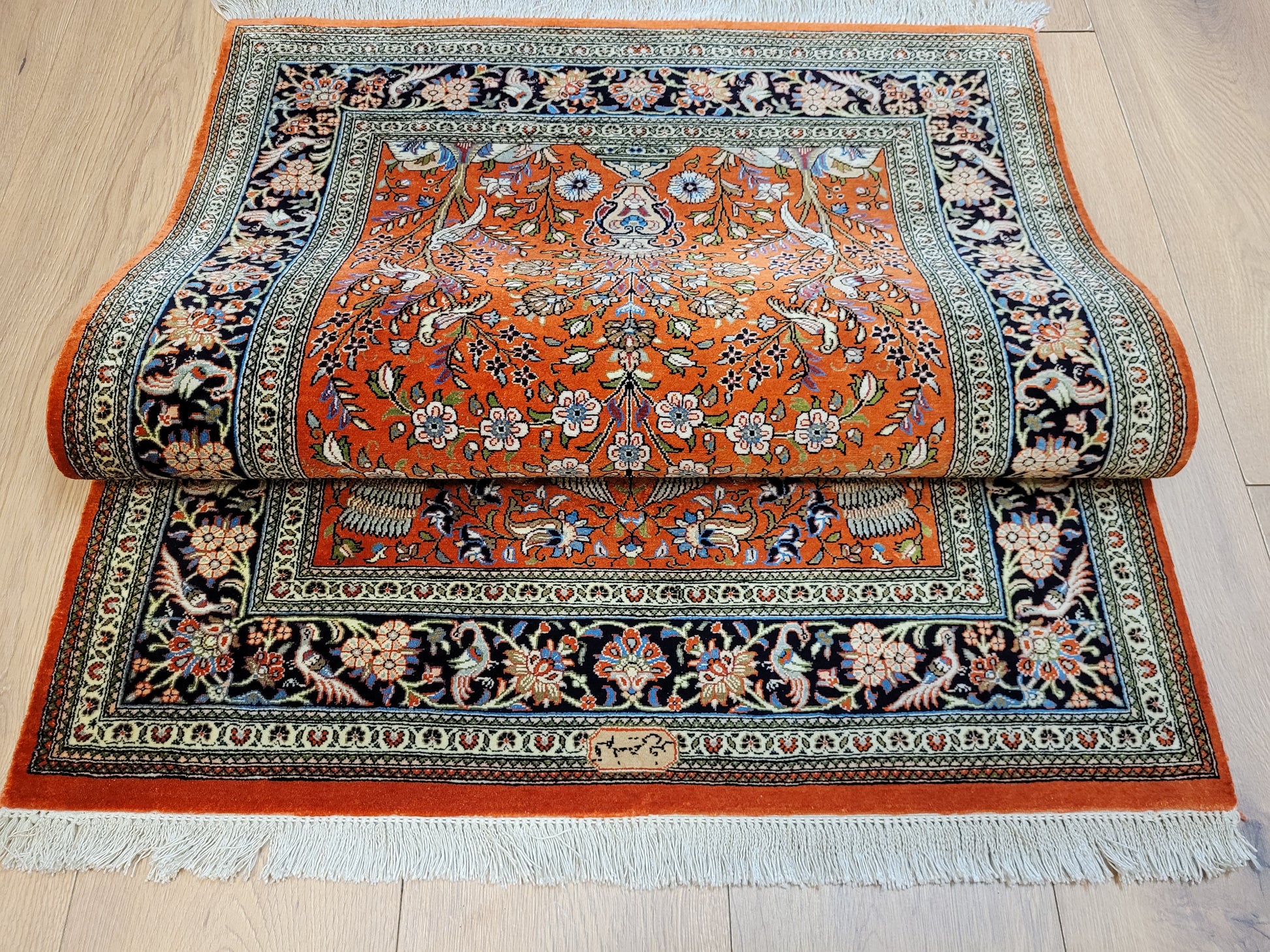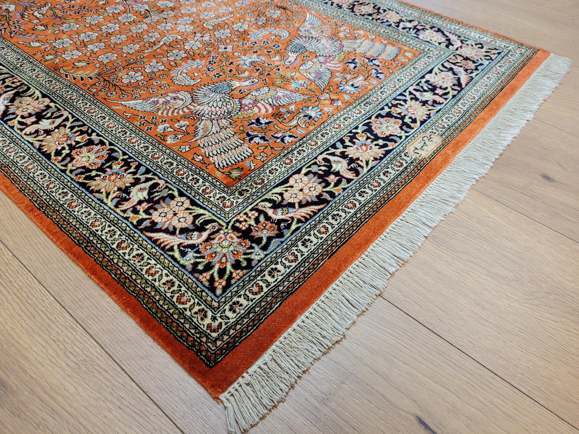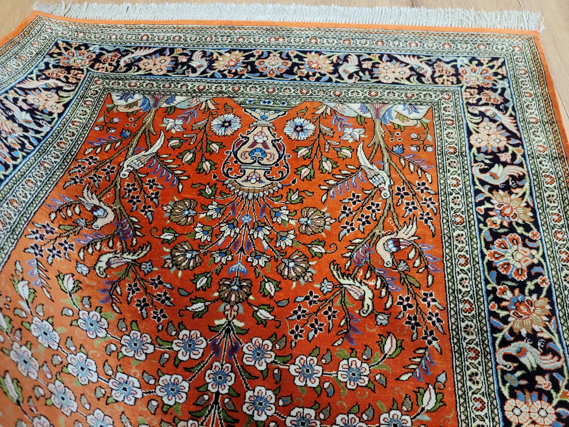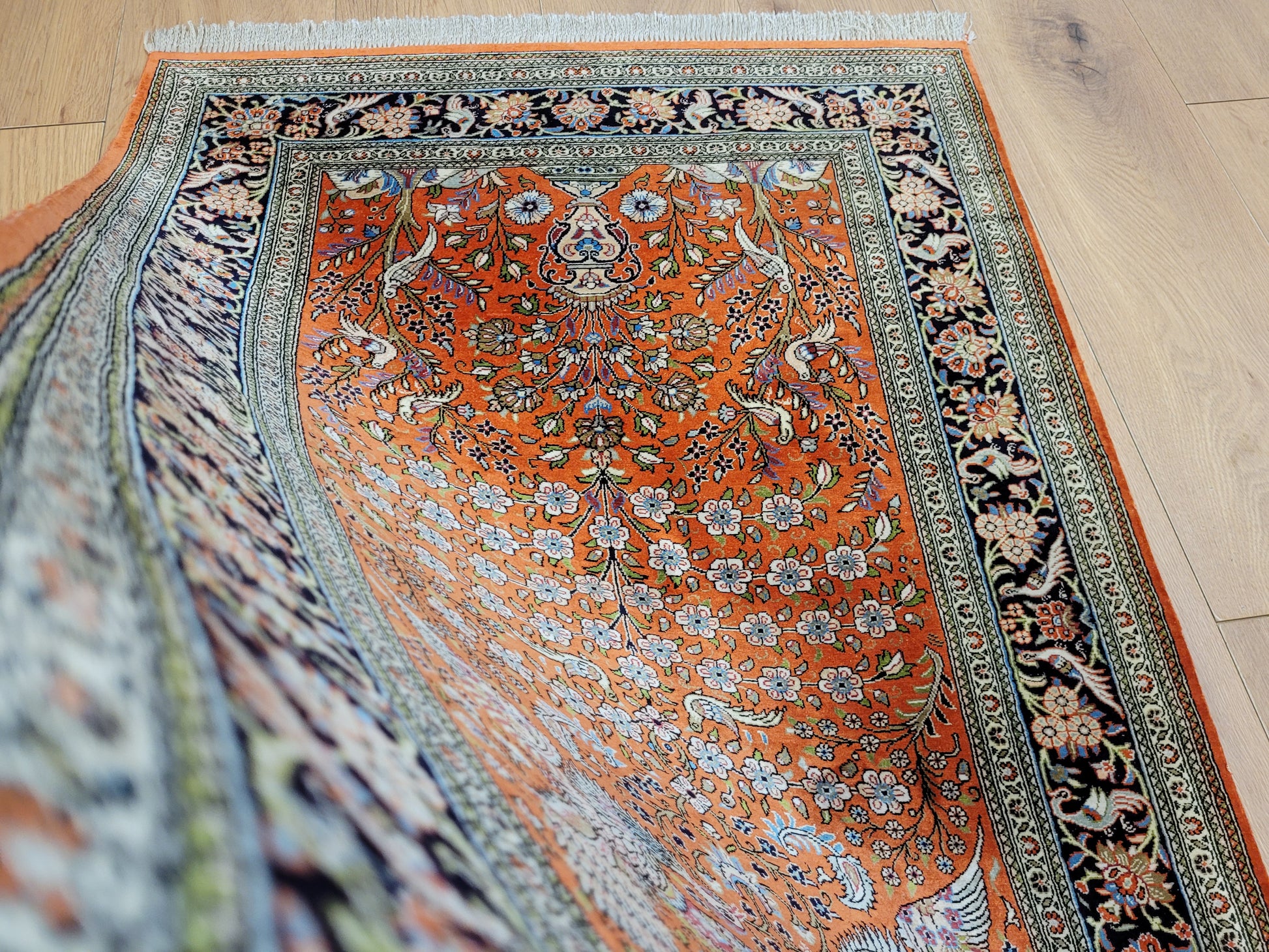 angeboten wird ein exquisites Ghom Teppich-Meisterwerk aus reiner Seide auf Seide, handgeknüpft in äußerst feiner Ausführung. Das Design zeigt ein prachtvolles florales Arrangement mit Blütenzweigen, Vögeln und einem zentralen Vasendekor. Zwei große Paradiesvögel schmücken die obere Partie des Feldes und verleihen dem Teppich eine besonders edle Ausstrahlung. Die umlaufende Bordüre ist reich verziert mit Blütenranken und kontrastiert eindrucksvoll das leuchtende orangefarbene Grundfeld. Eine Signatur im oberen Bereich unterstreicht die künstlerische Qualität dieses Stückes.
