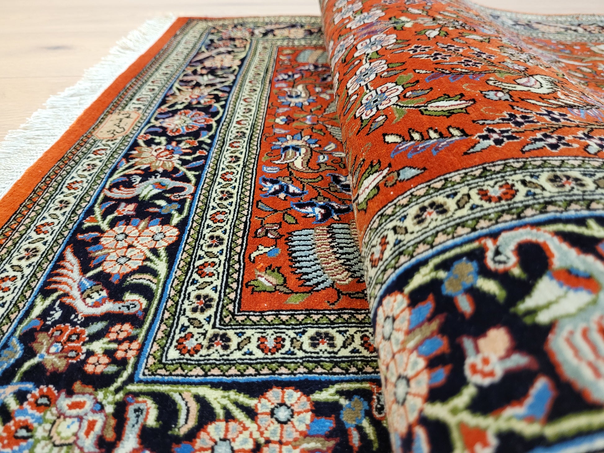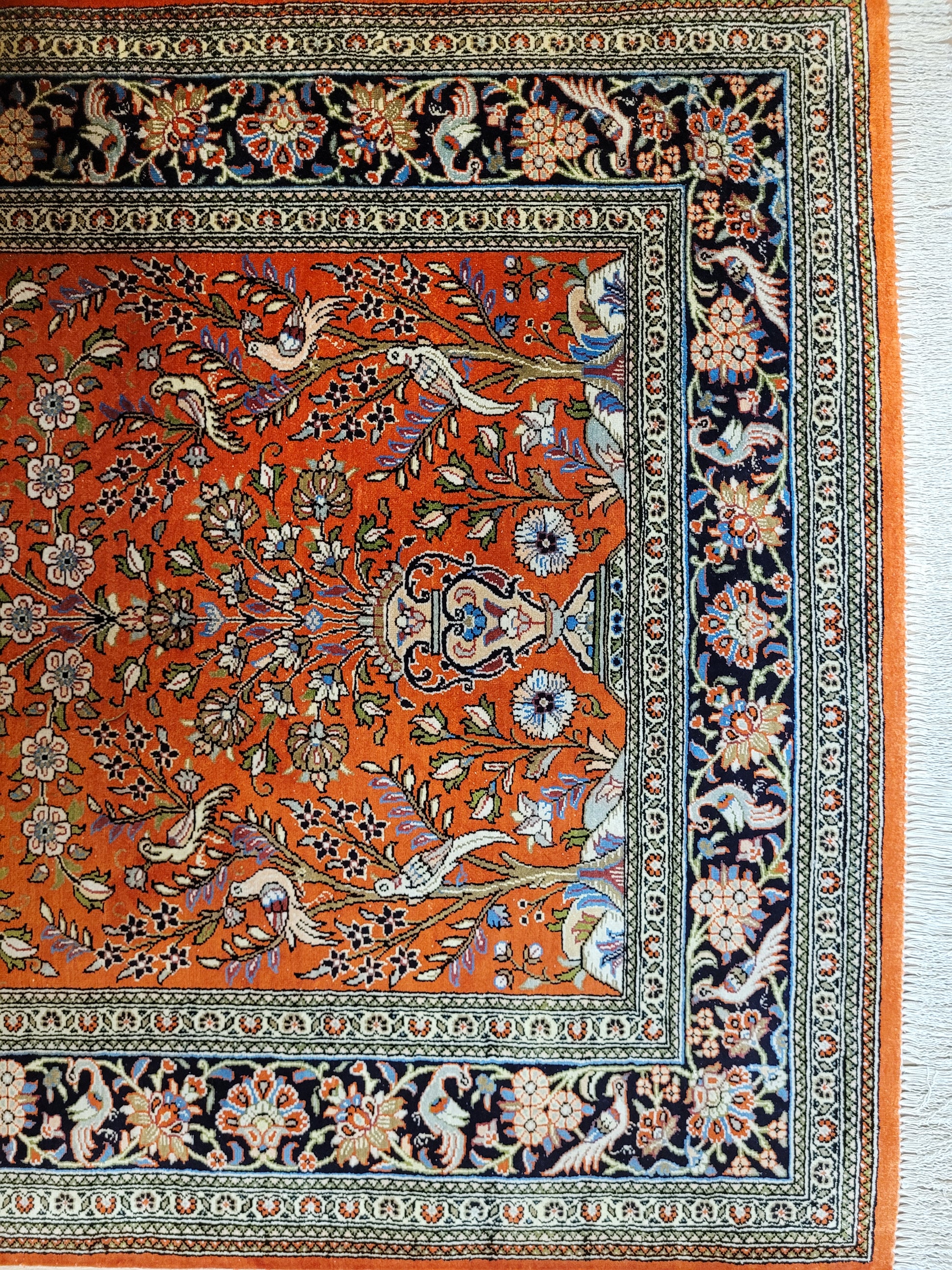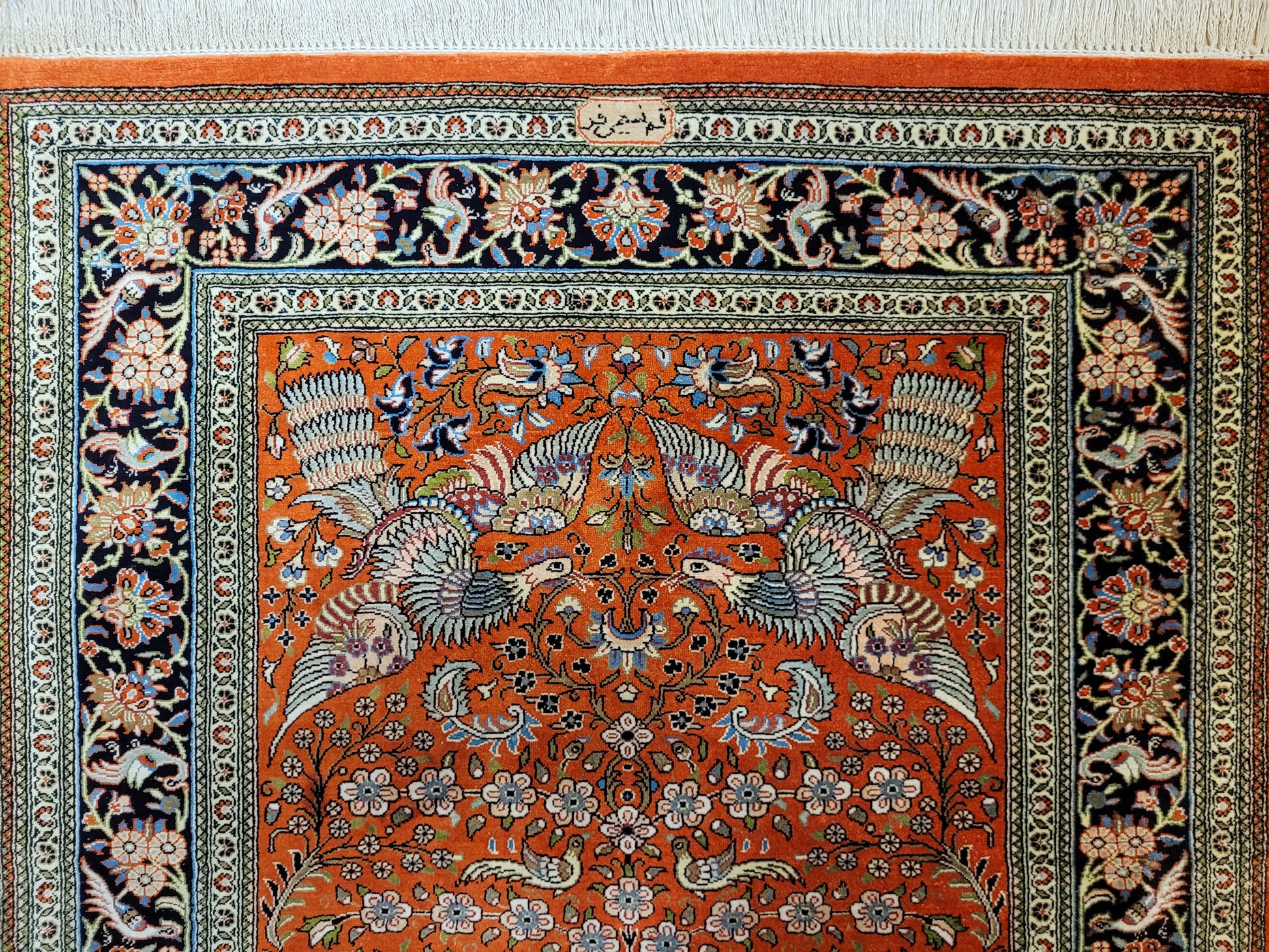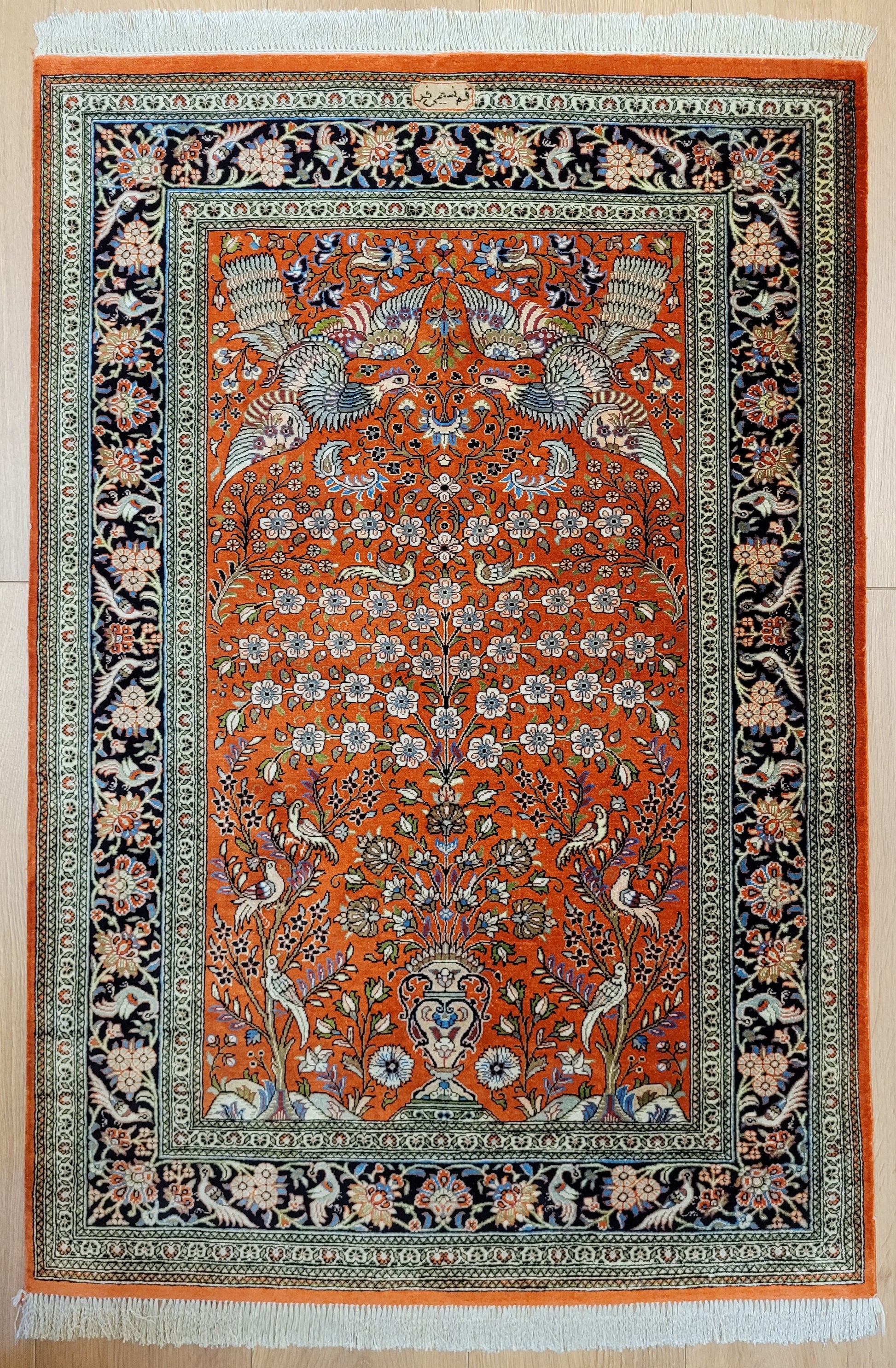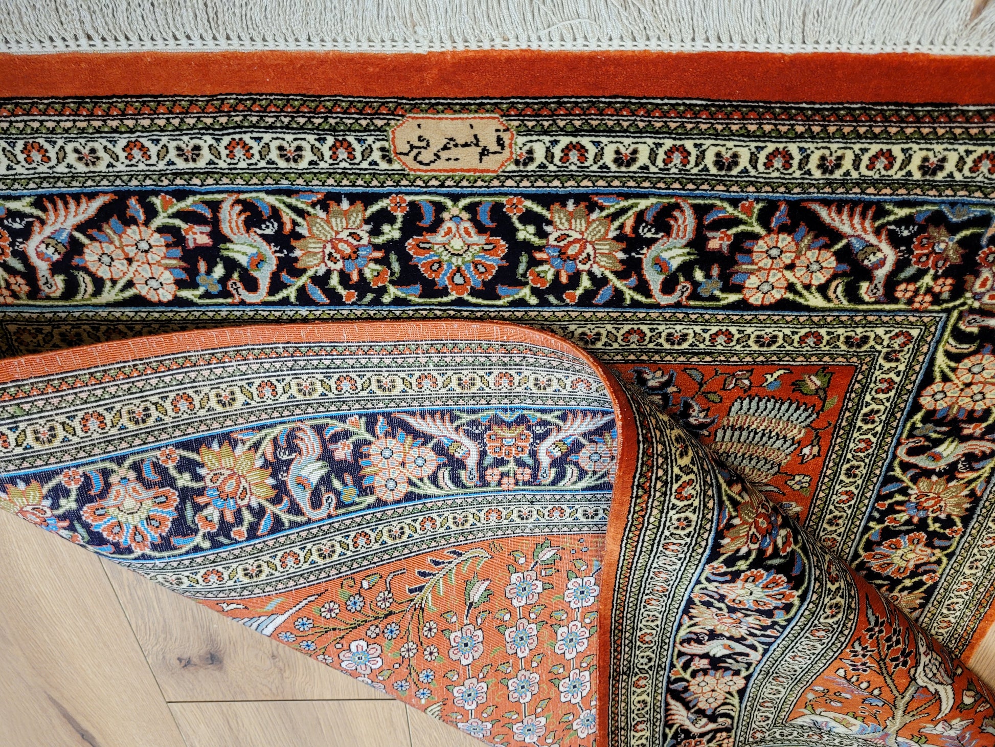 angeboten wird ein exquisites Ghom Teppich-Meisterwerk aus reiner Seide auf Seide, handgeknüpft in äußerst feiner Ausführung. Das Design zeigt ein prachtvolles florales Arrangement mit Blütenzweigen, Vögeln und einem zentralen Vasendekor. Zwei große Paradiesvögel schmücken die obere Partie des Feldes und verleihen dem Teppich eine besonders edle Ausstrahlung. Die umlaufende Bordüre ist reich verziert mit Blütenranken und kontrastiert eindrucksvoll das leuchtende orangefarbene Grundfeld. Eine Signatur im oberen Bereich unterstreicht die künstlerische Qualität dieses Stückes.