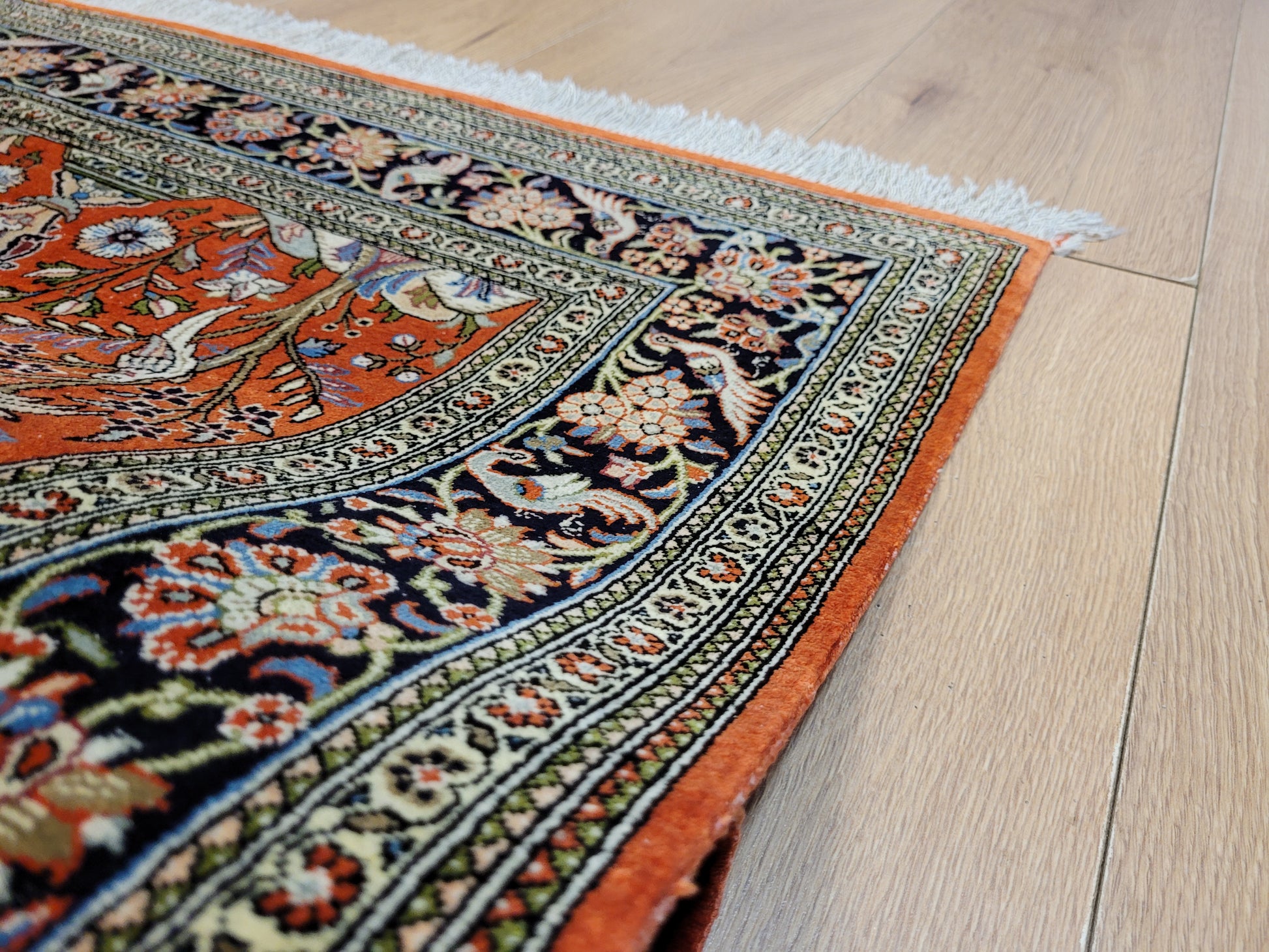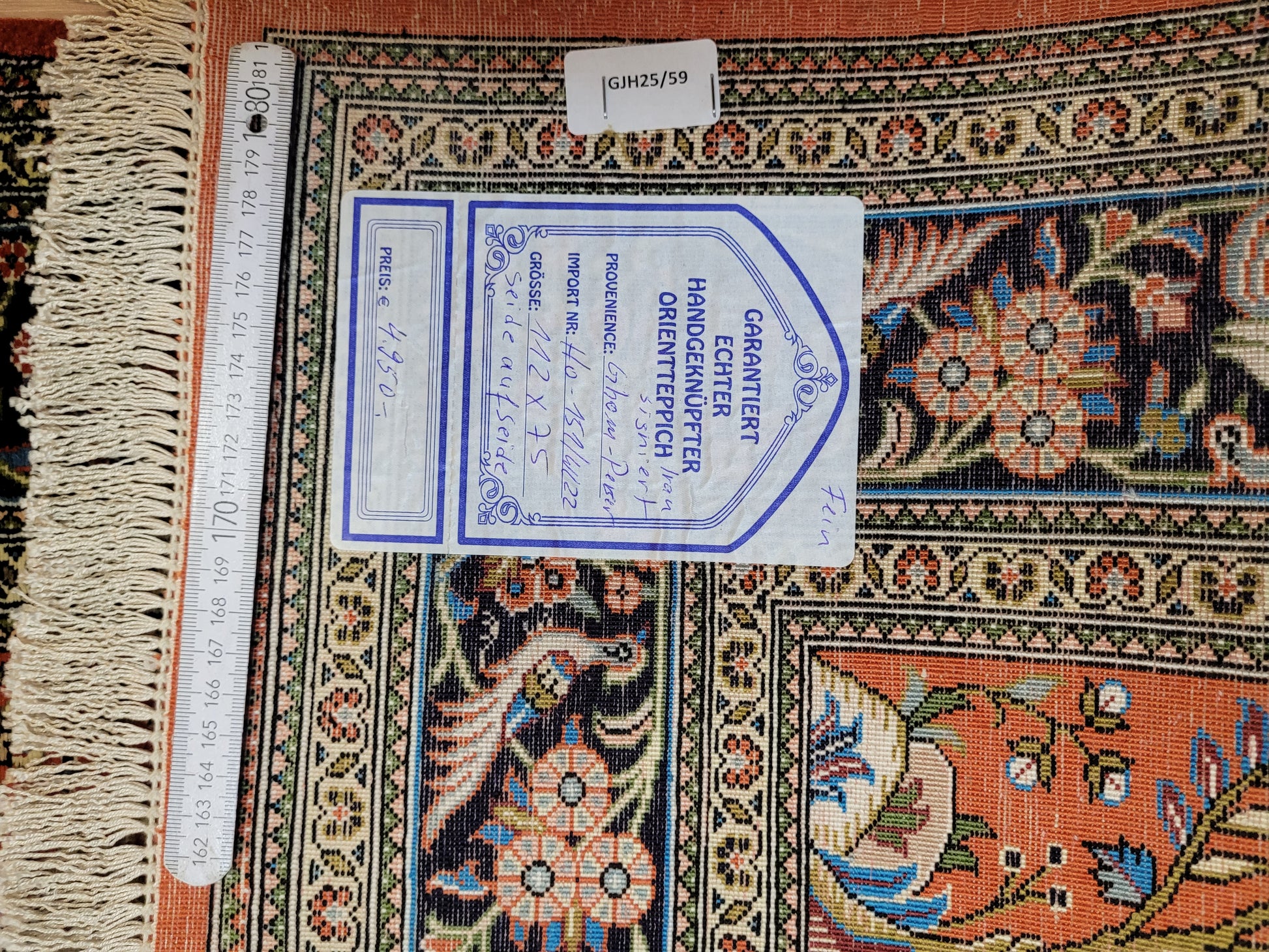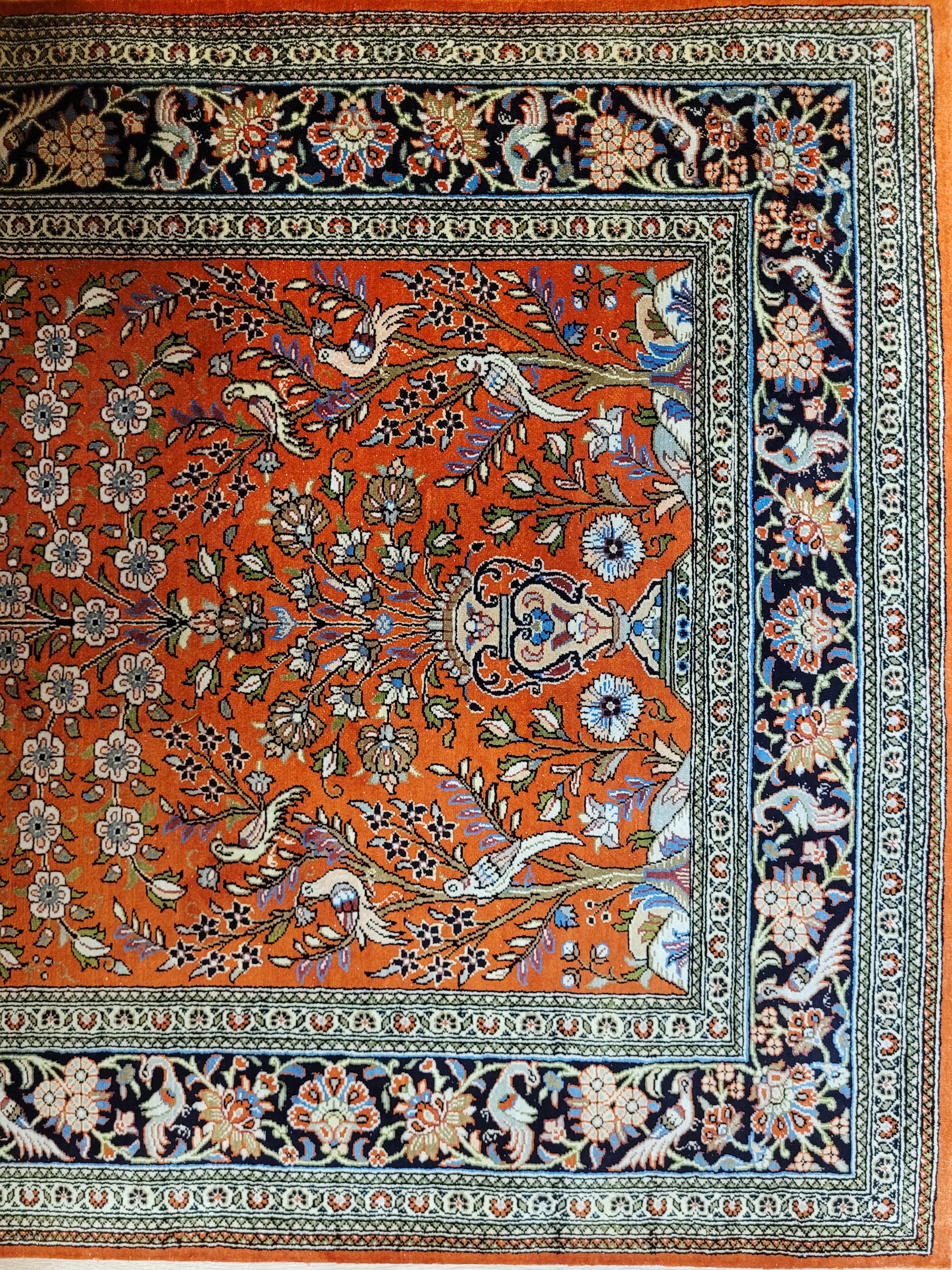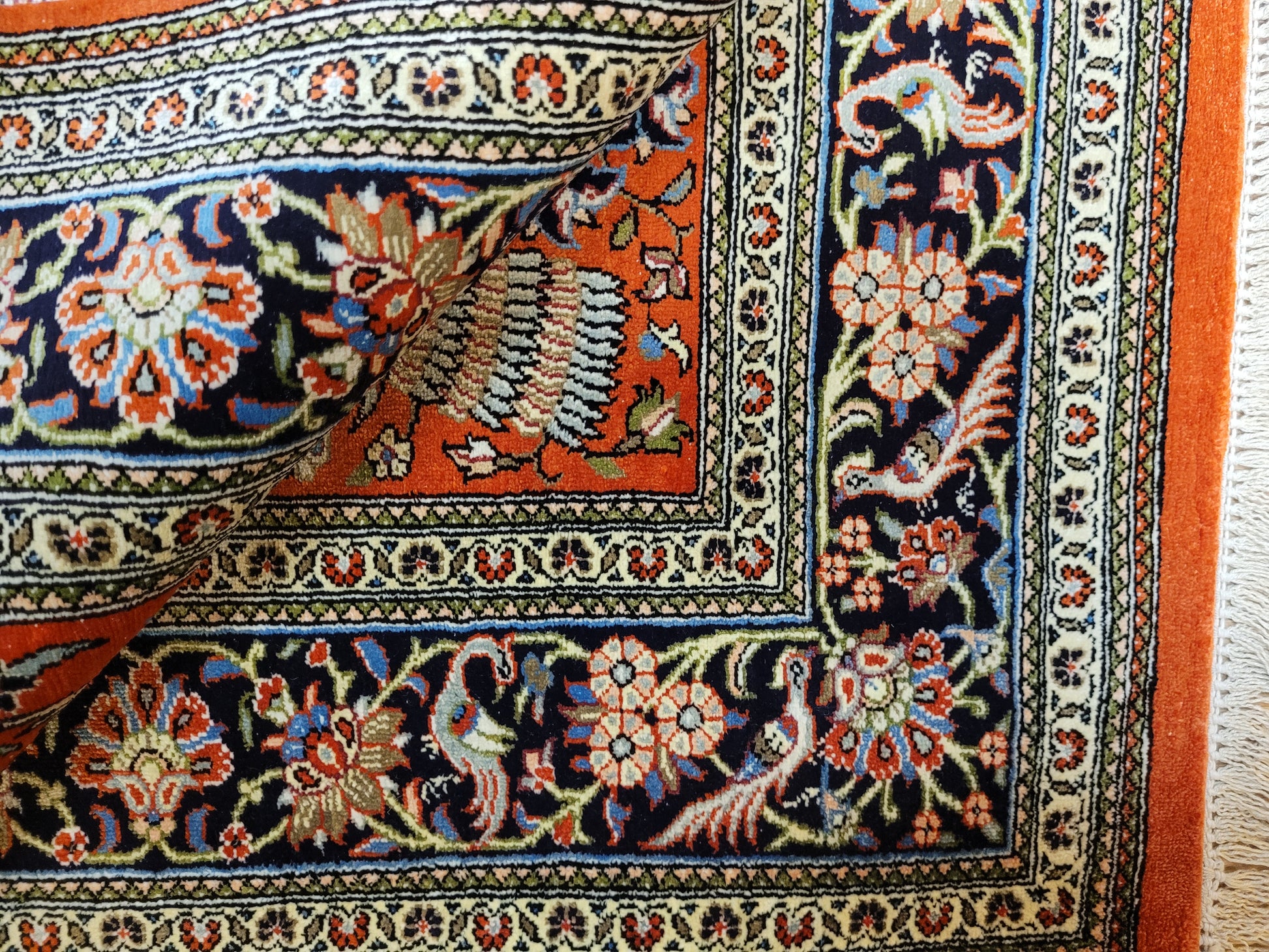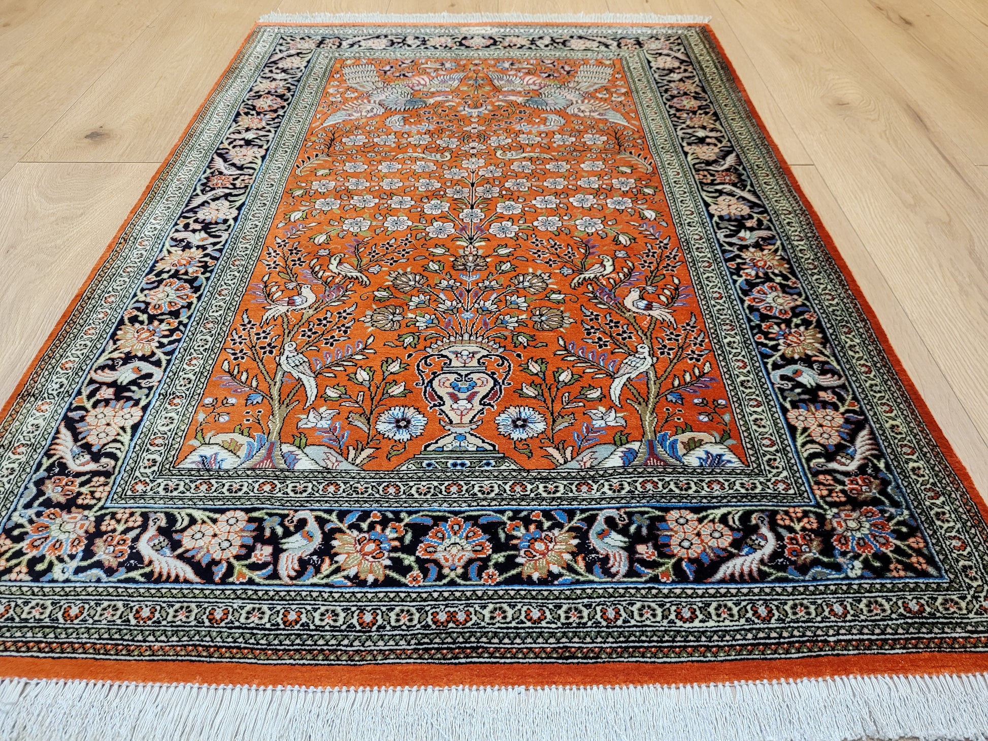 angeboten wird ein exquisites Ghom Teppich-Meisterwerk aus reiner Seide auf Seide, handgeknüpft in äußerst feiner Ausführung. Das Design zeigt ein prachtvolles florales Arrangement mit Blütenzweigen, Vögeln und einem zentralen Vasendekor. Zwei große Paradiesvögel schmücken die obere Partie des Feldes und verleihen dem Teppich eine besonders edle Ausstrahlung. Die umlaufende Bordüre ist reich verziert mit Blütenranken und kontrastiert eindrucksvoll das leuchtende orangefarbene Grundfeld. Eine Signatur im oberen Bereich unterstreicht die künstlerische Qualität dieses Stückes.