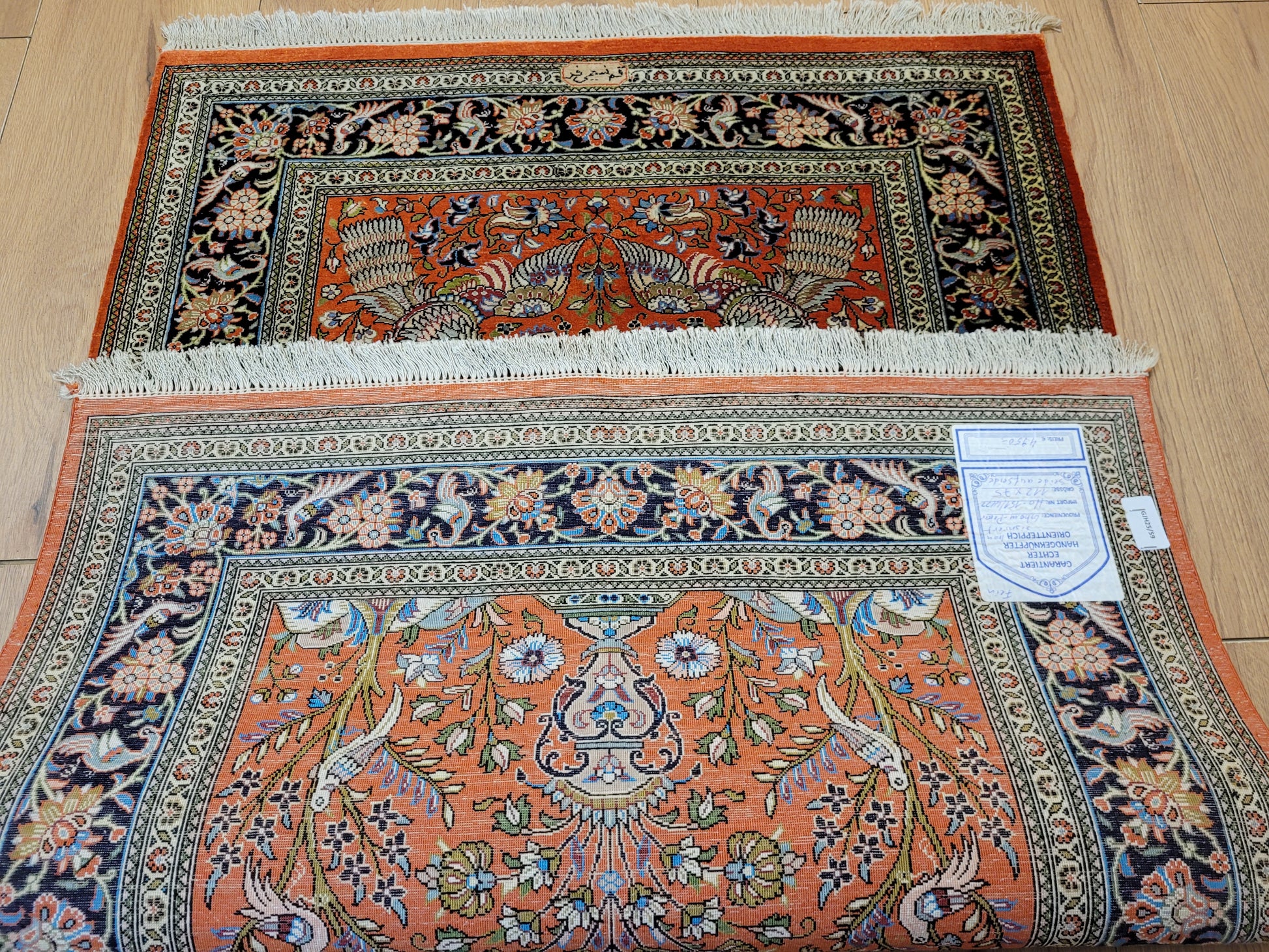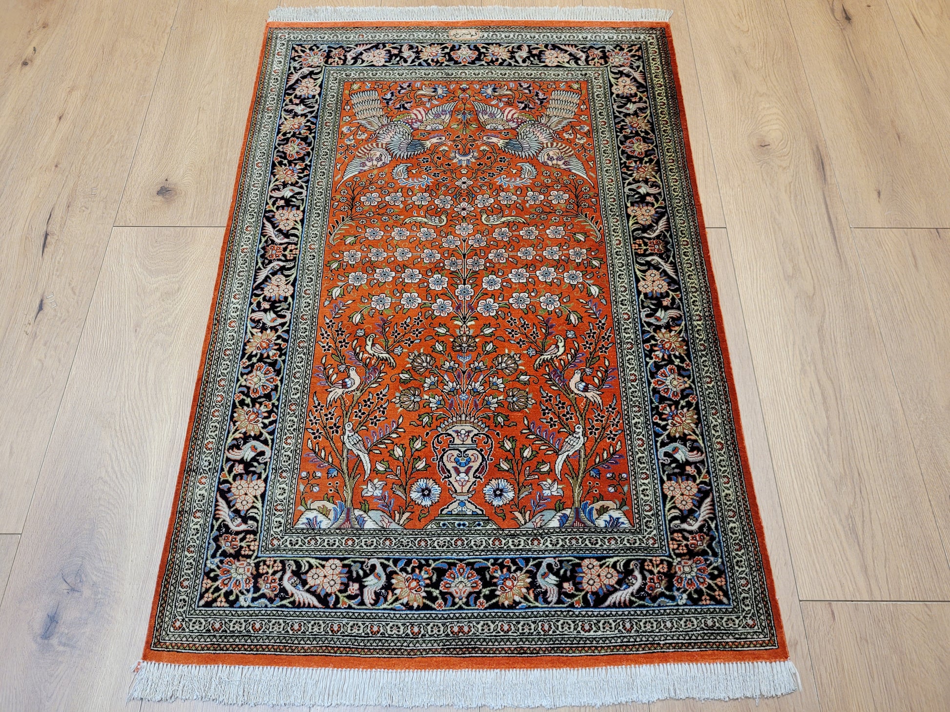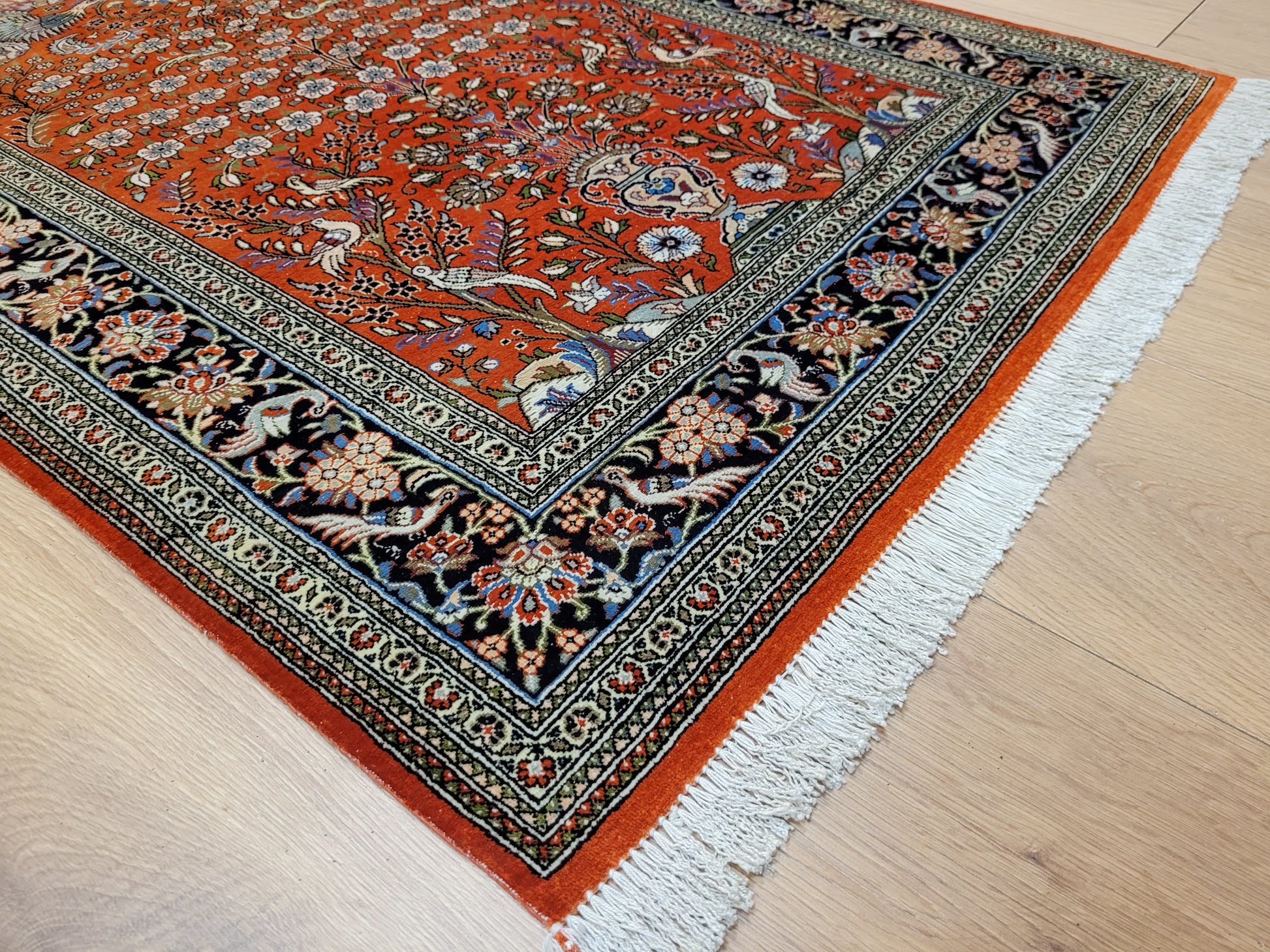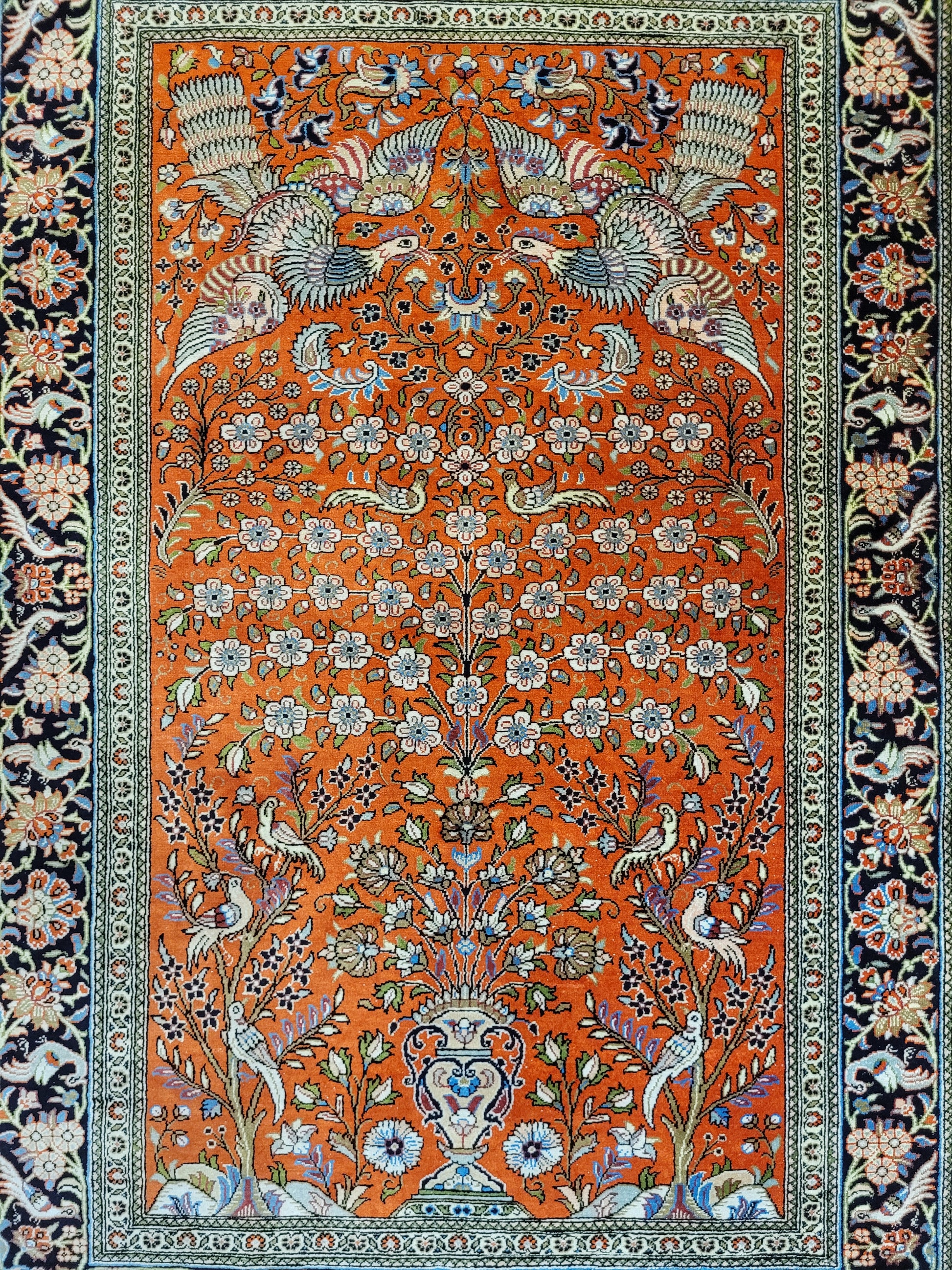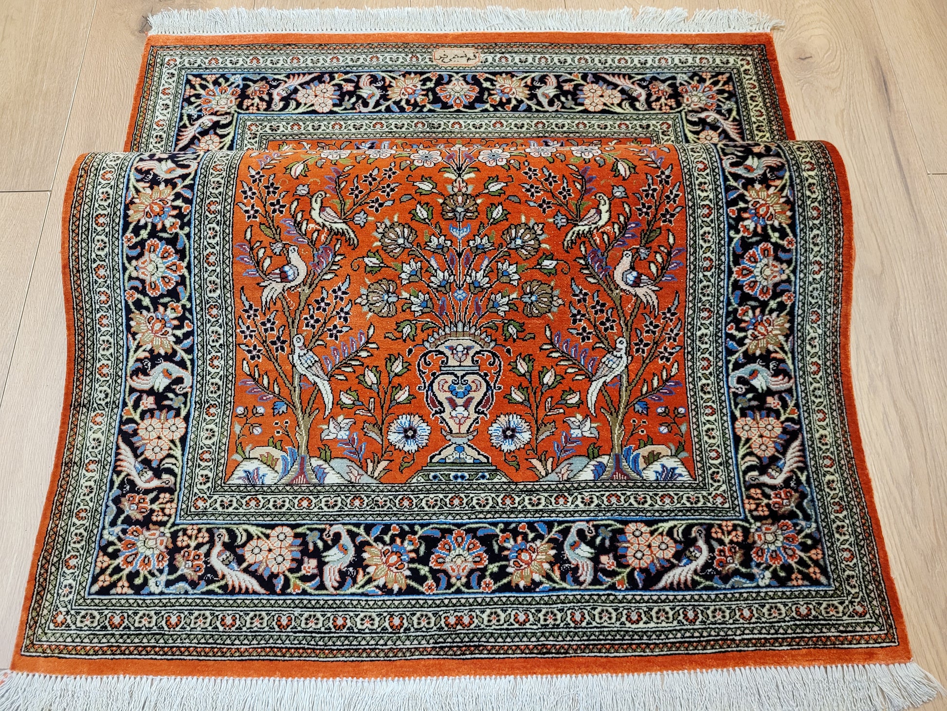 angeboten wird ein exquisites Ghom Teppich-Meisterwerk aus reiner Seide auf Seide, handgeknüpft in äußerst feiner Ausführung. Das Design zeigt ein prachtvolles florales Arrangement mit Blütenzweigen, Vögeln und einem zentralen Vasendekor. Zwei große Paradiesvögel schmücken die obere Partie des Feldes und verleihen dem Teppich eine besonders edle Ausstrahlung. Die umlaufende Bordüre ist reich verziert mit Blütenranken und kontrastiert eindrucksvoll das leuchtende orangefarbene Grundfeld. Eine Signatur im oberen Bereich unterstreicht die künstlerische Qualität dieses Stückes.