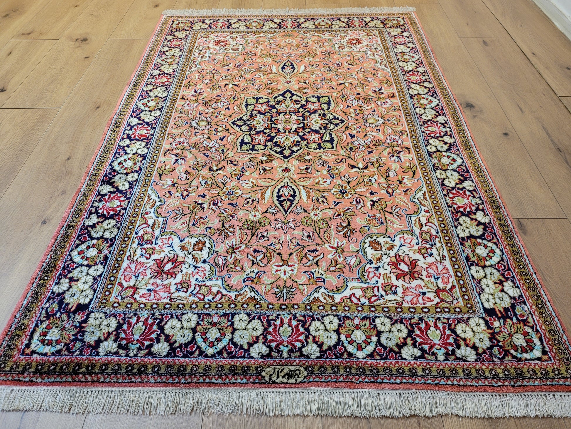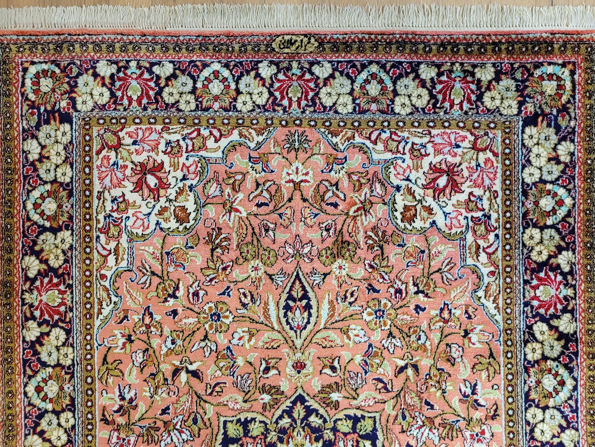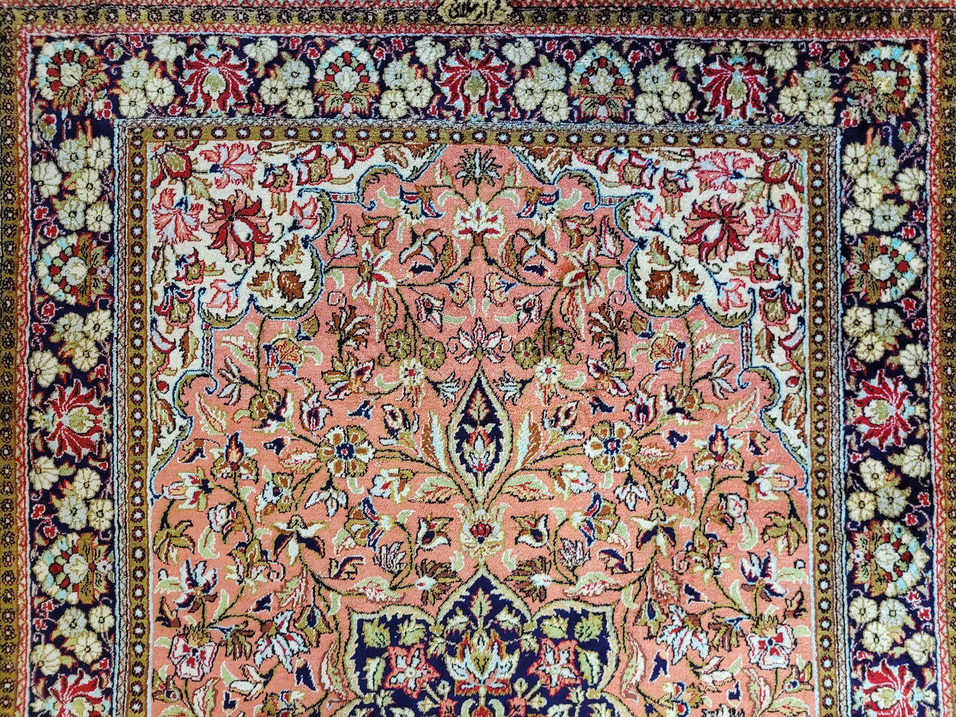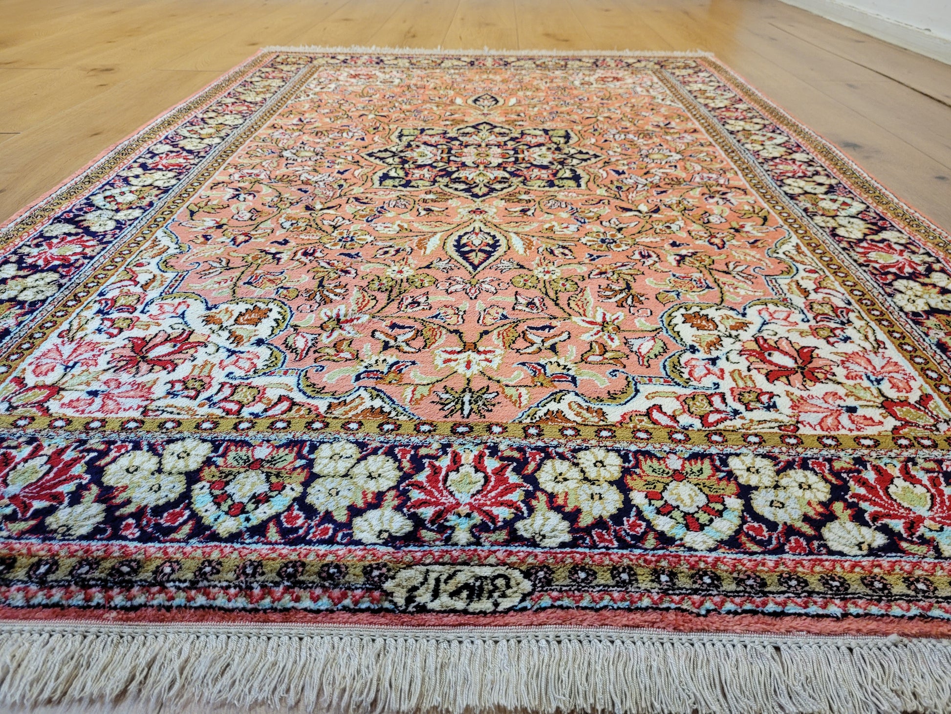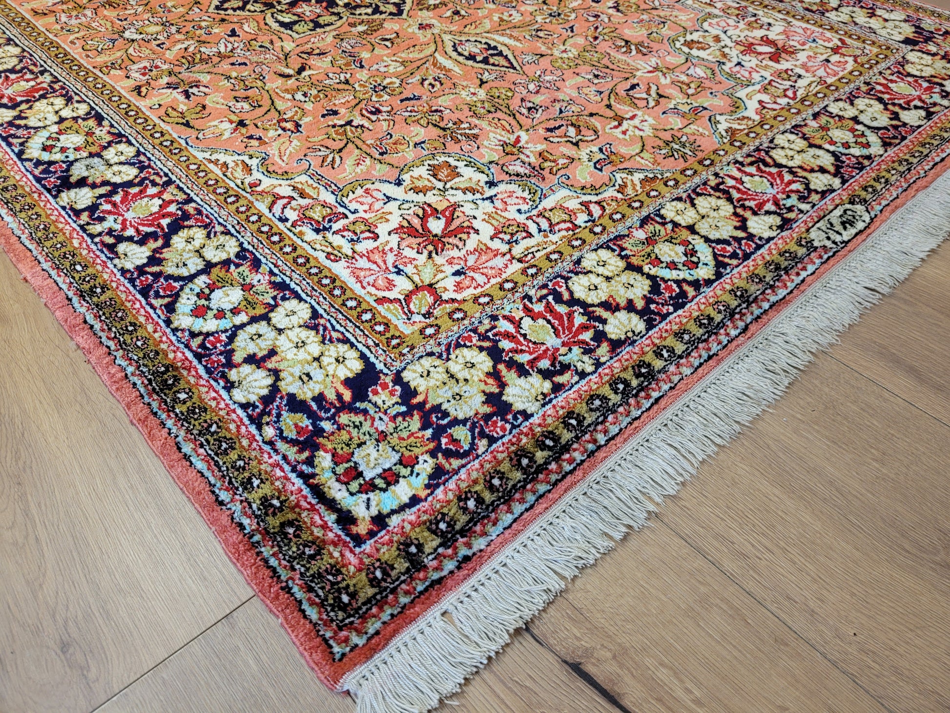angeboten wird ein edler Ghom Seidenteppich, handgeknüpft auf feiner Seidenkette in meisterhafter Qualität. Das zentrale Medaillon in tiefem Dunkelblau ist reich mit Blütenornamenten ausgearbeitet und eingebettet in ein warmes, lachsfarbenes Feld. Über das gesamte Teppichfeld verteilen sich elegante Ranken, Blüten und Palmetten in harmonischer Symmetrie. Die prachtvolle Bordüre mit floralen Mustern in kräftigem Dunkelblau, Rot, Beige und Grün rahmt die Komposition kunstvoll ein. Eine Besonderheit dieses Teppichs ist die Signatur des Knüpfmeisters, die seine künstlerische Herkunft und Exklusivität hervorhebt.