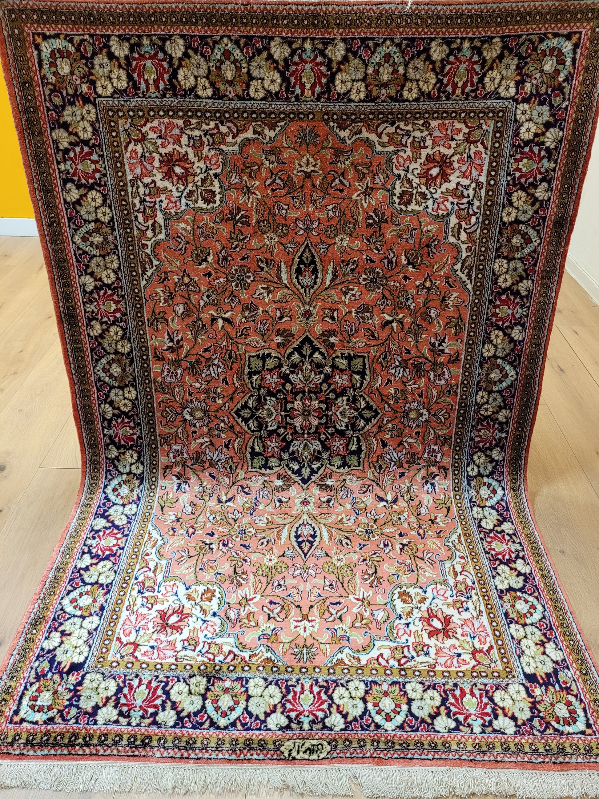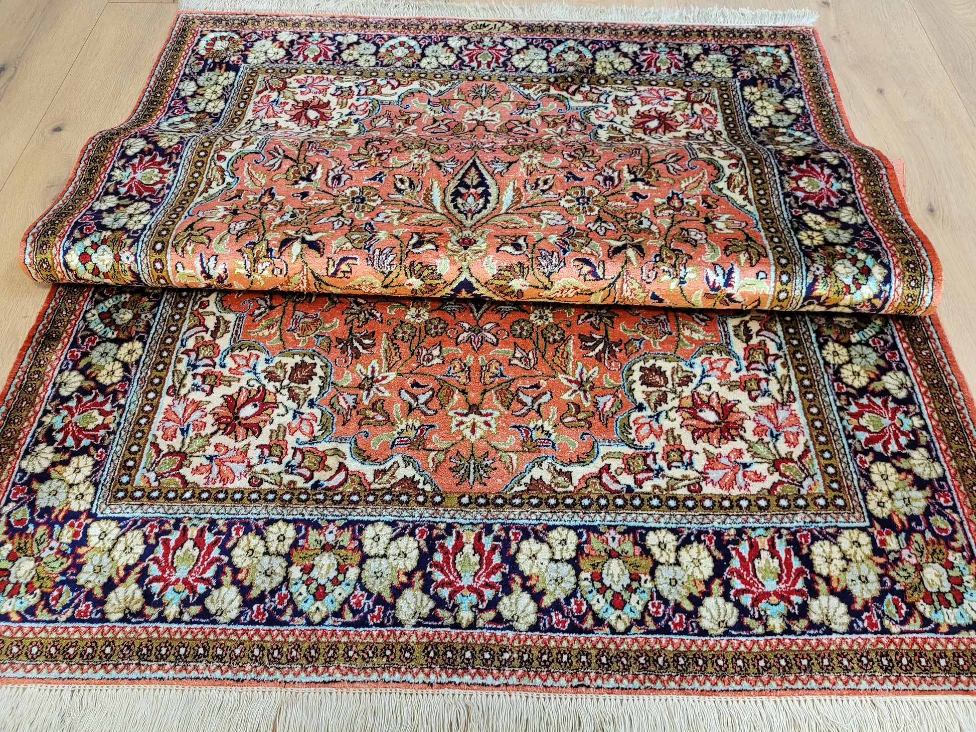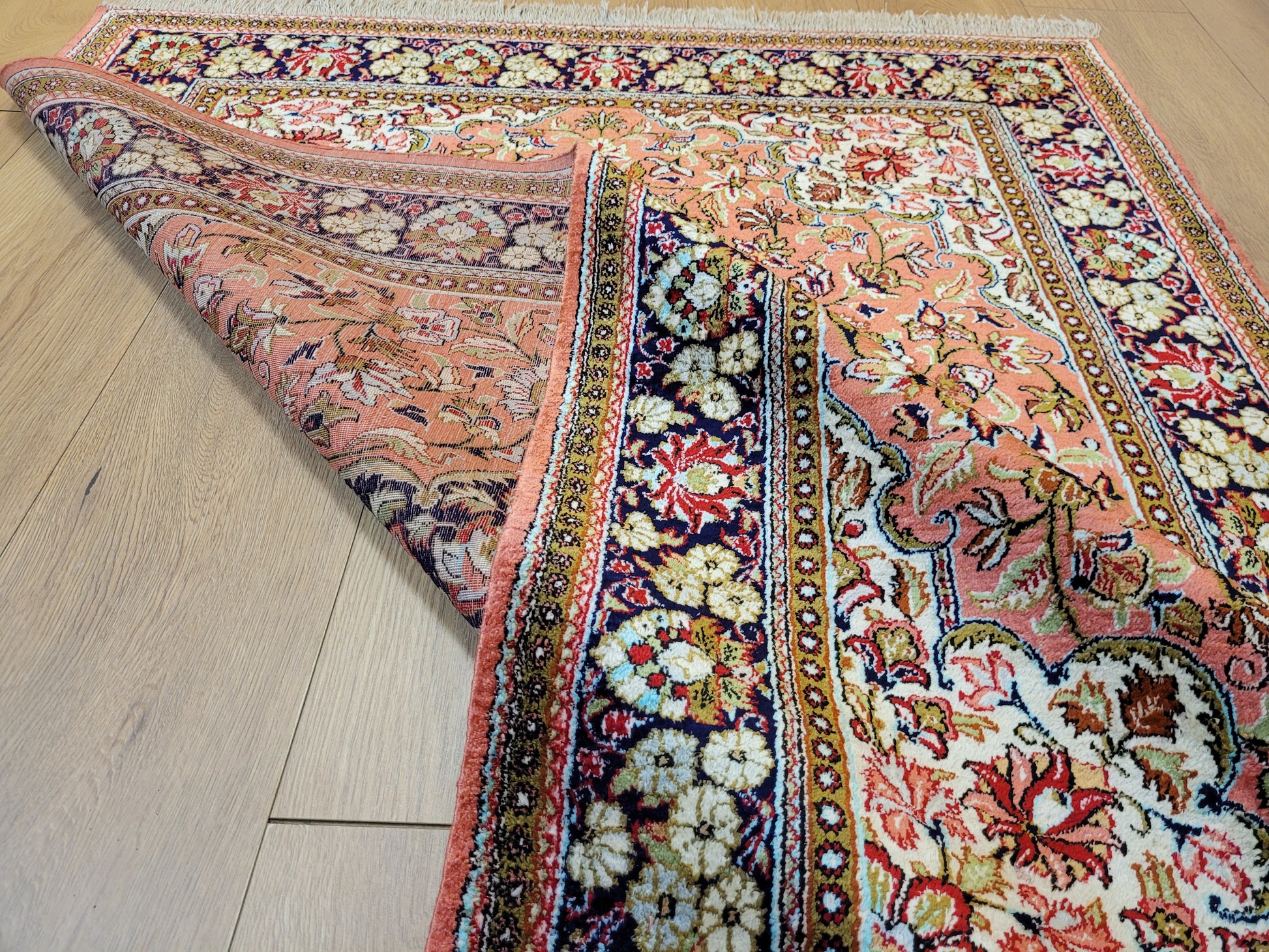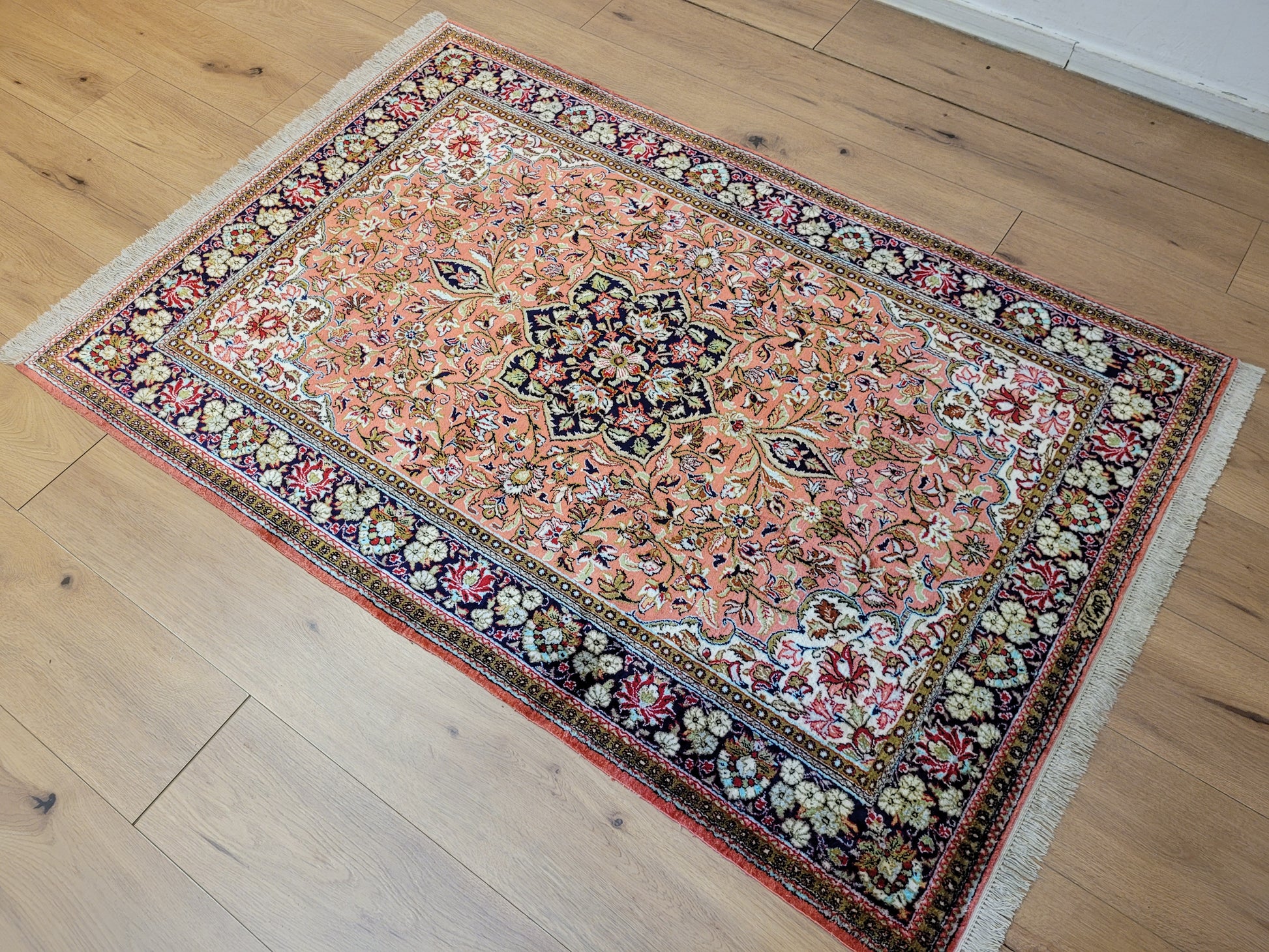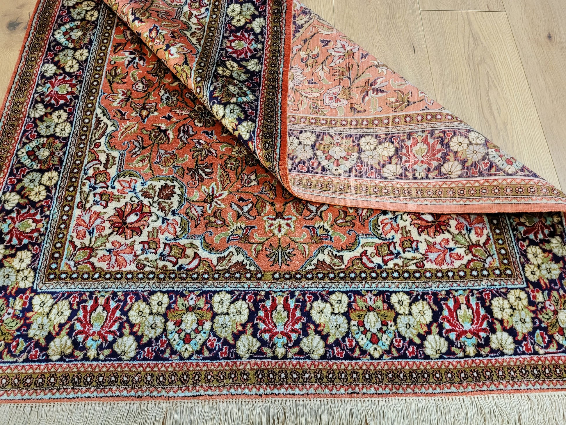 angeboten wird ein edler Ghom Seidenteppich, handgeknüpft auf feiner Seidenkette in meisterhafter Qualität. Das zentrale Medaillon in tiefem Dunkelblau ist reich mit Blütenornamenten ausgearbeitet und eingebettet in ein warmes, lachsfarbenes Feld. Über das gesamte Teppichfeld verteilen sich elegante Ranken, Blüten und Palmetten in harmonischer Symmetrie. Die prachtvolle Bordüre mit floralen Mustern in kräftigem Dunkelblau, Rot, Beige und Grün rahmt die Komposition kunstvoll ein. Eine Besonderheit dieses Teppichs ist die Signatur des Knüpfmeisters, die seine künstlerische Herkunft und Exklusivität hervorhebt.