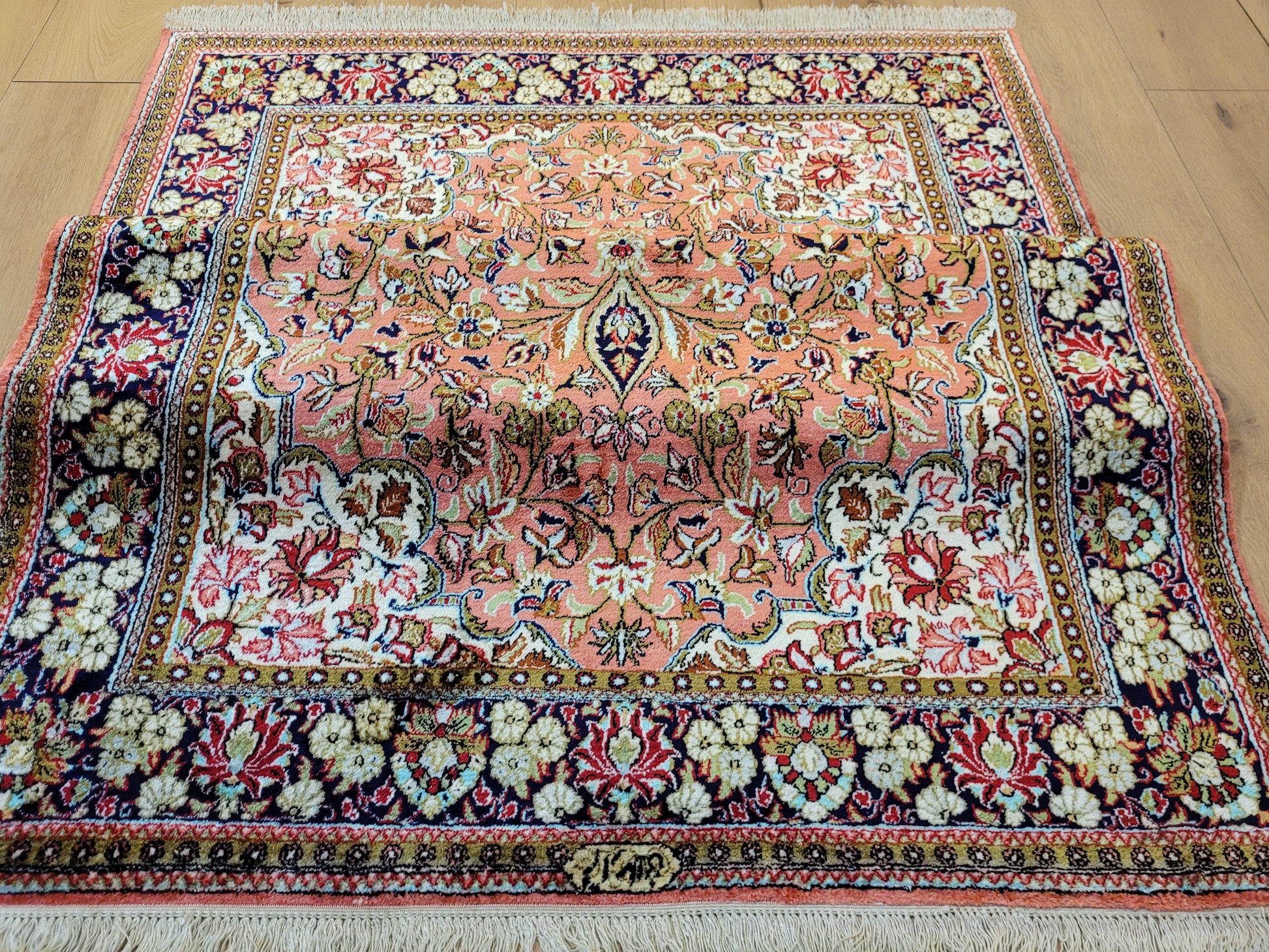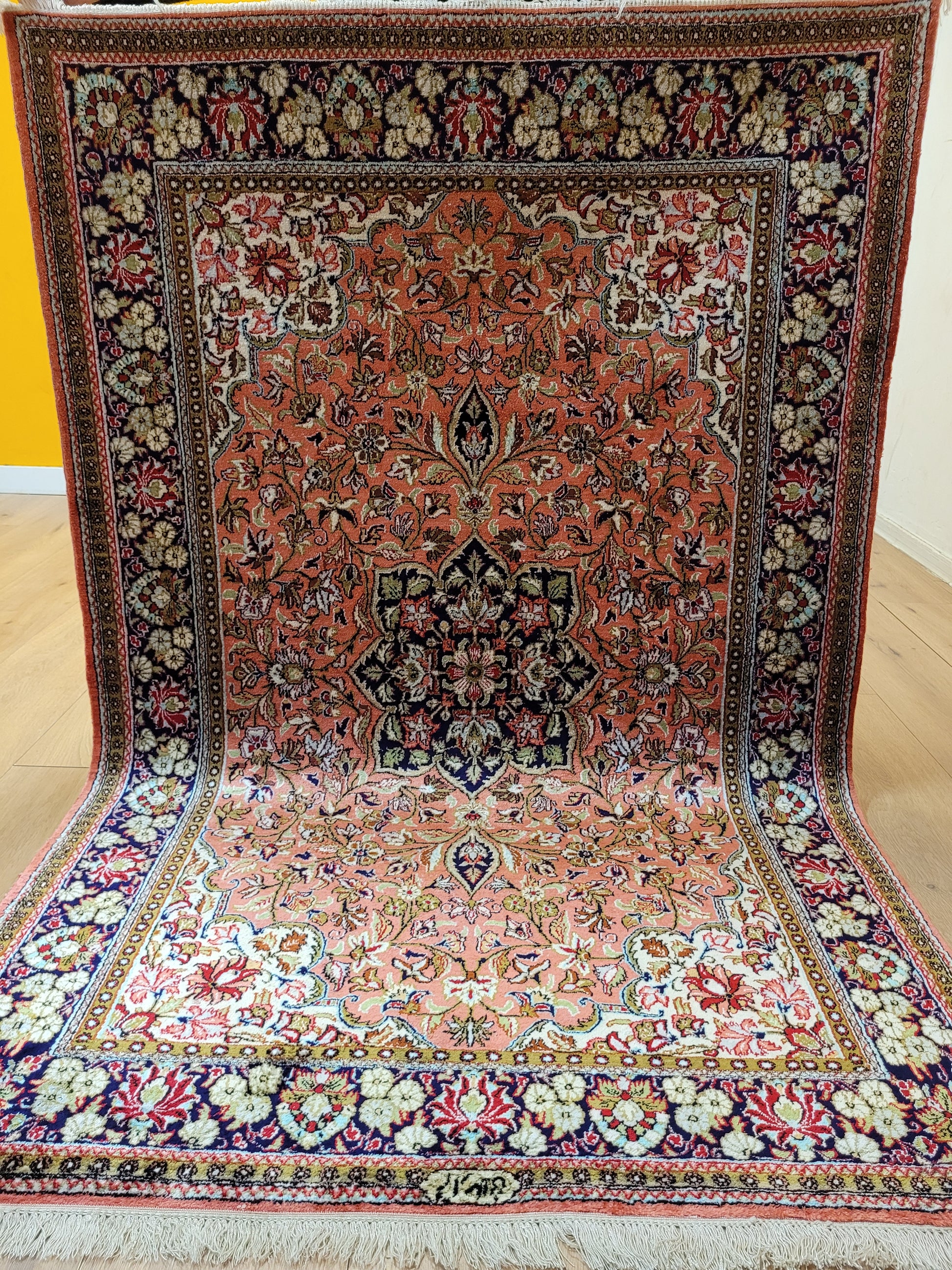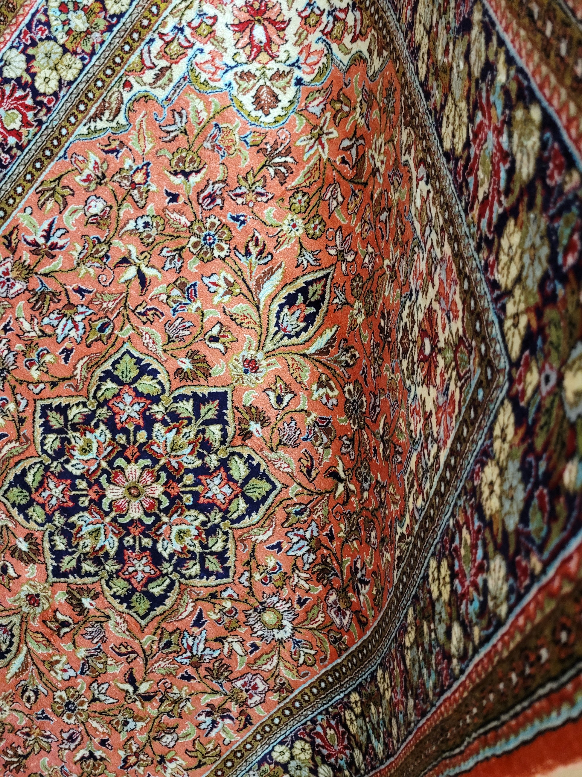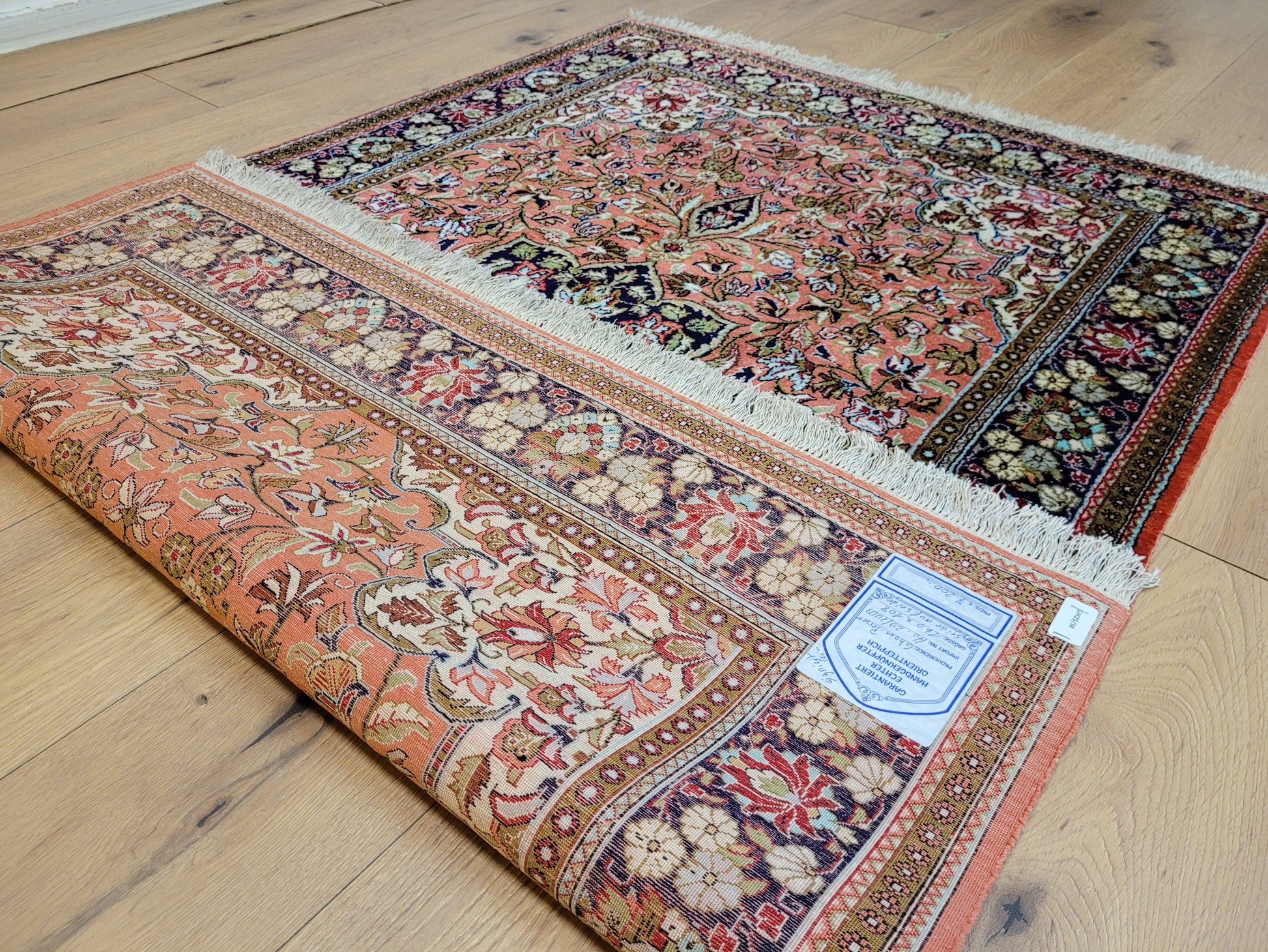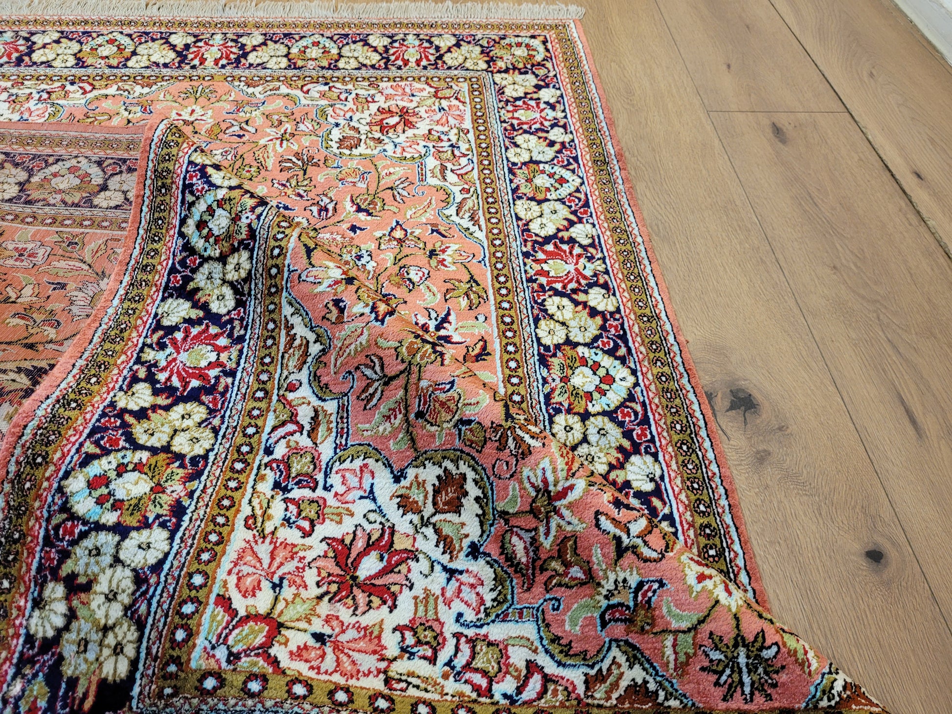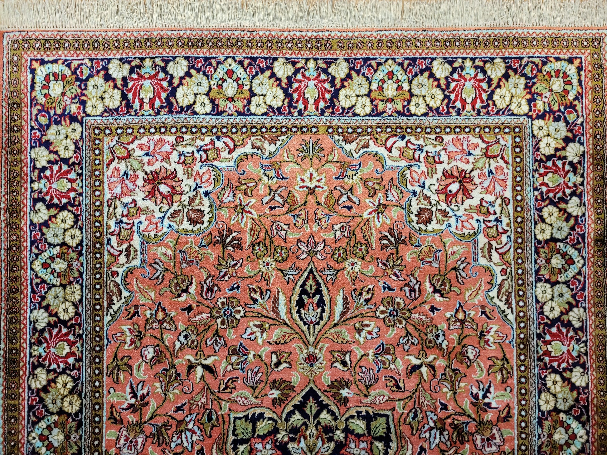angeboten wird ein edler Ghom Seidenteppich, handgeknüpft auf feiner Seidenkette in meisterhafter Qualität. Das zentrale Medaillon in tiefem Dunkelblau ist reich mit Blütenornamenten ausgearbeitet und eingebettet in ein warmes, lachsfarbenes Feld. Über das gesamte Teppichfeld verteilen sich elegante Ranken, Blüten und Palmetten in harmonischer Symmetrie. Die prachtvolle Bordüre mit floralen Mustern in kräftigem Dunkelblau, Rot, Beige und Grün rahmt die Komposition kunstvoll ein. Eine Besonderheit dieses Teppichs ist die Signatur des Knüpfmeisters, die seine künstlerische Herkunft und Exklusivität hervorhebt.