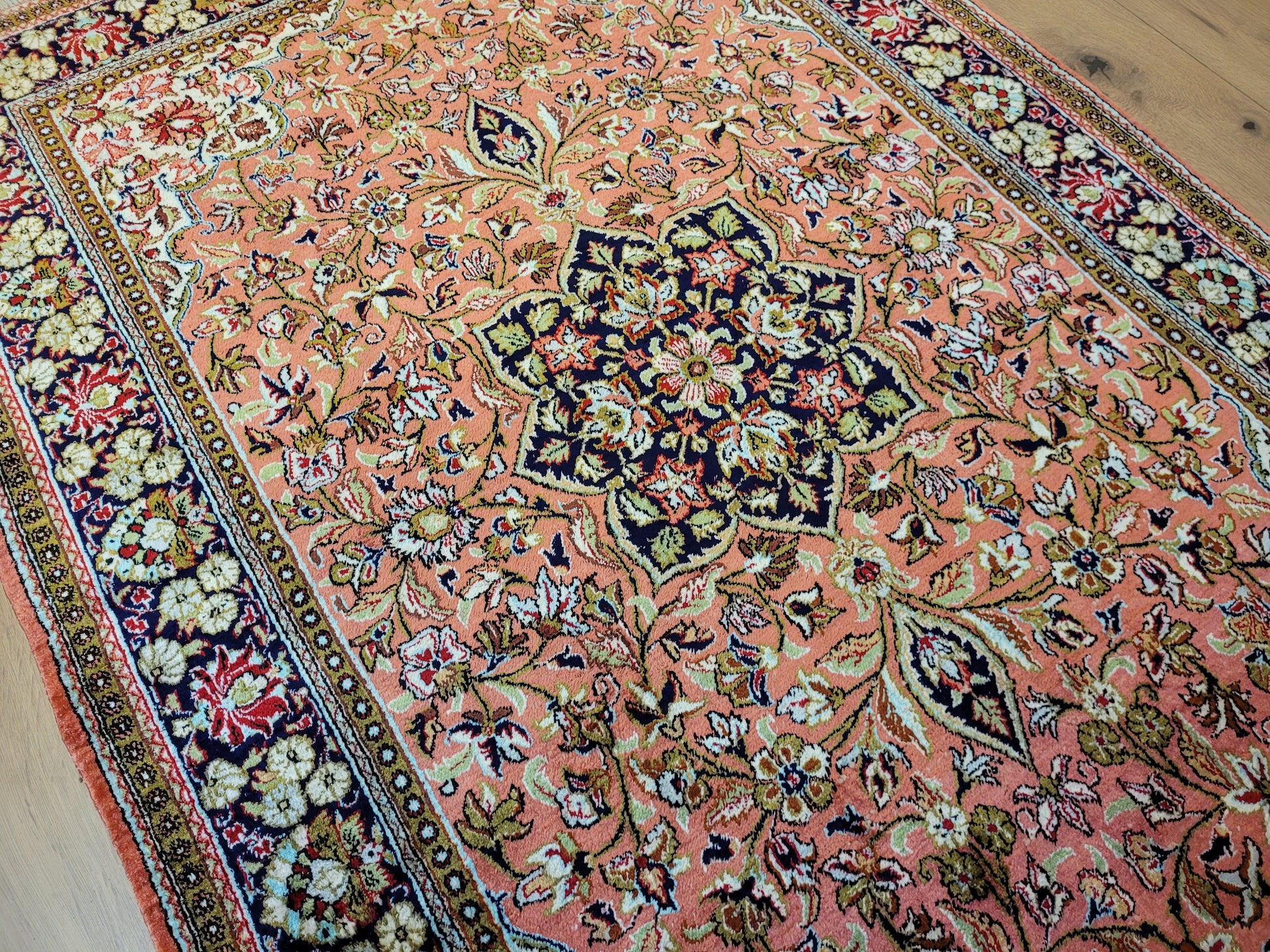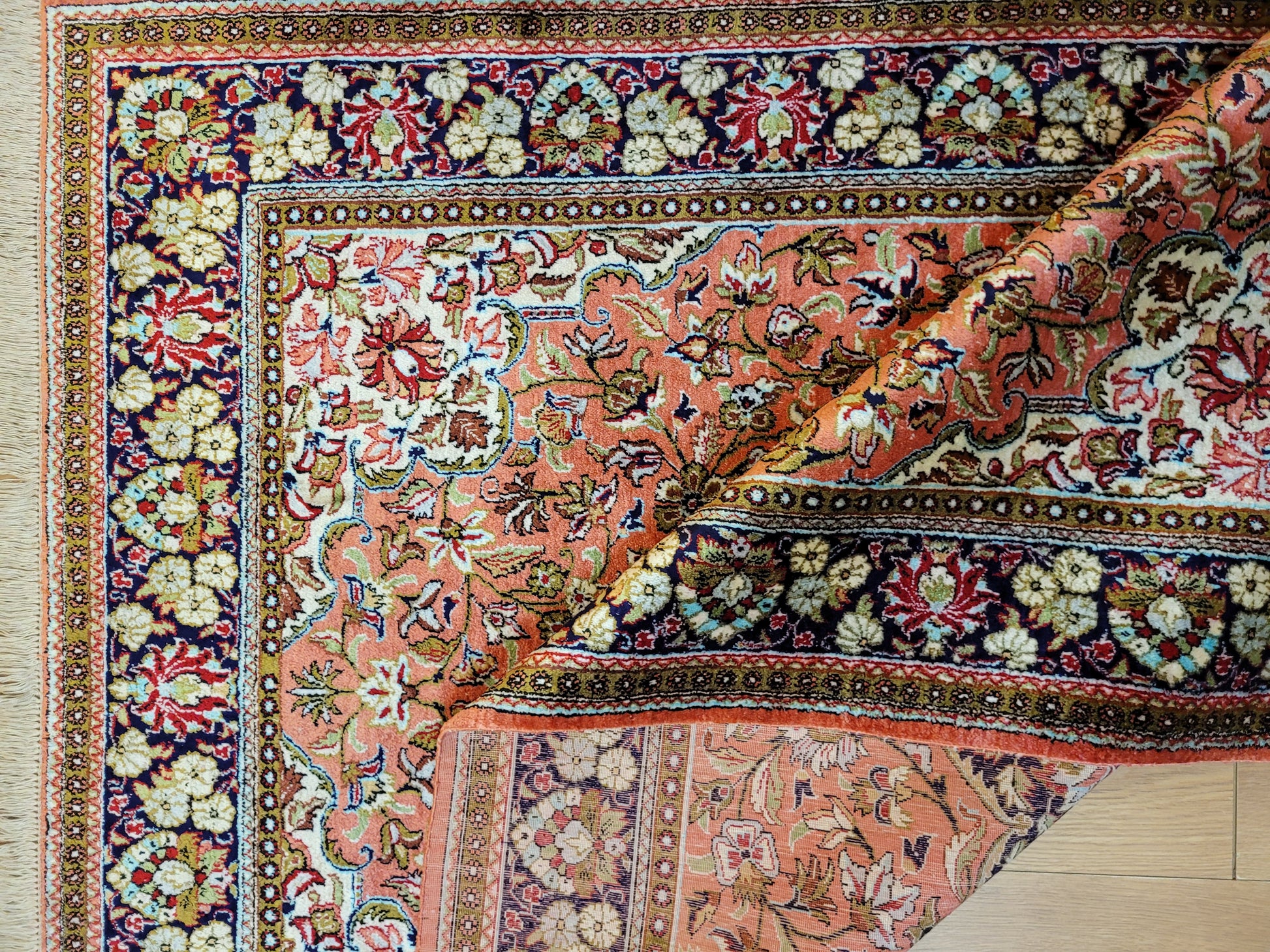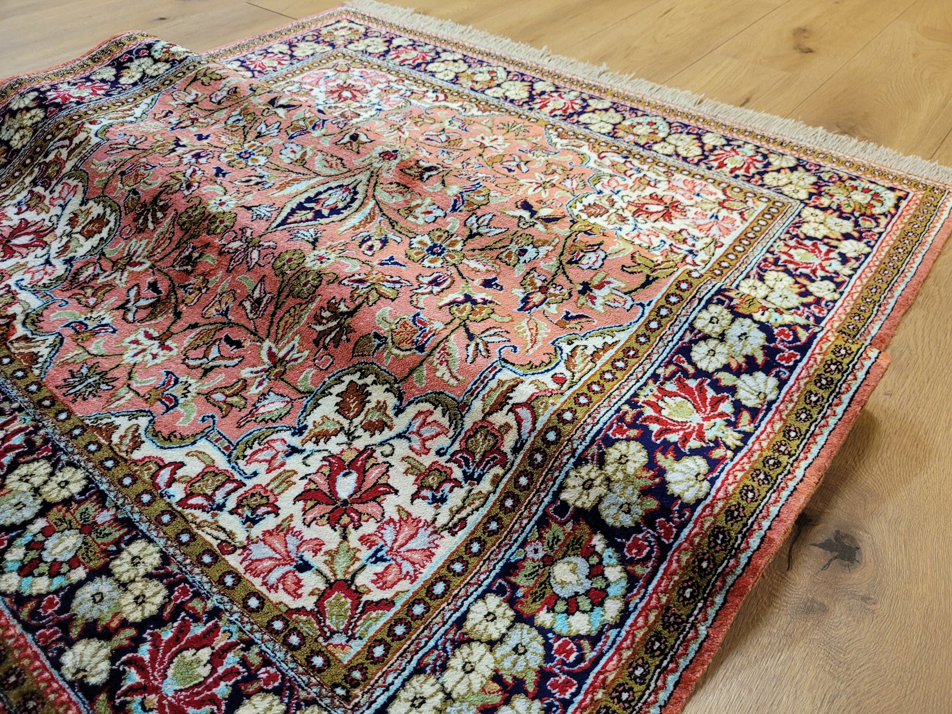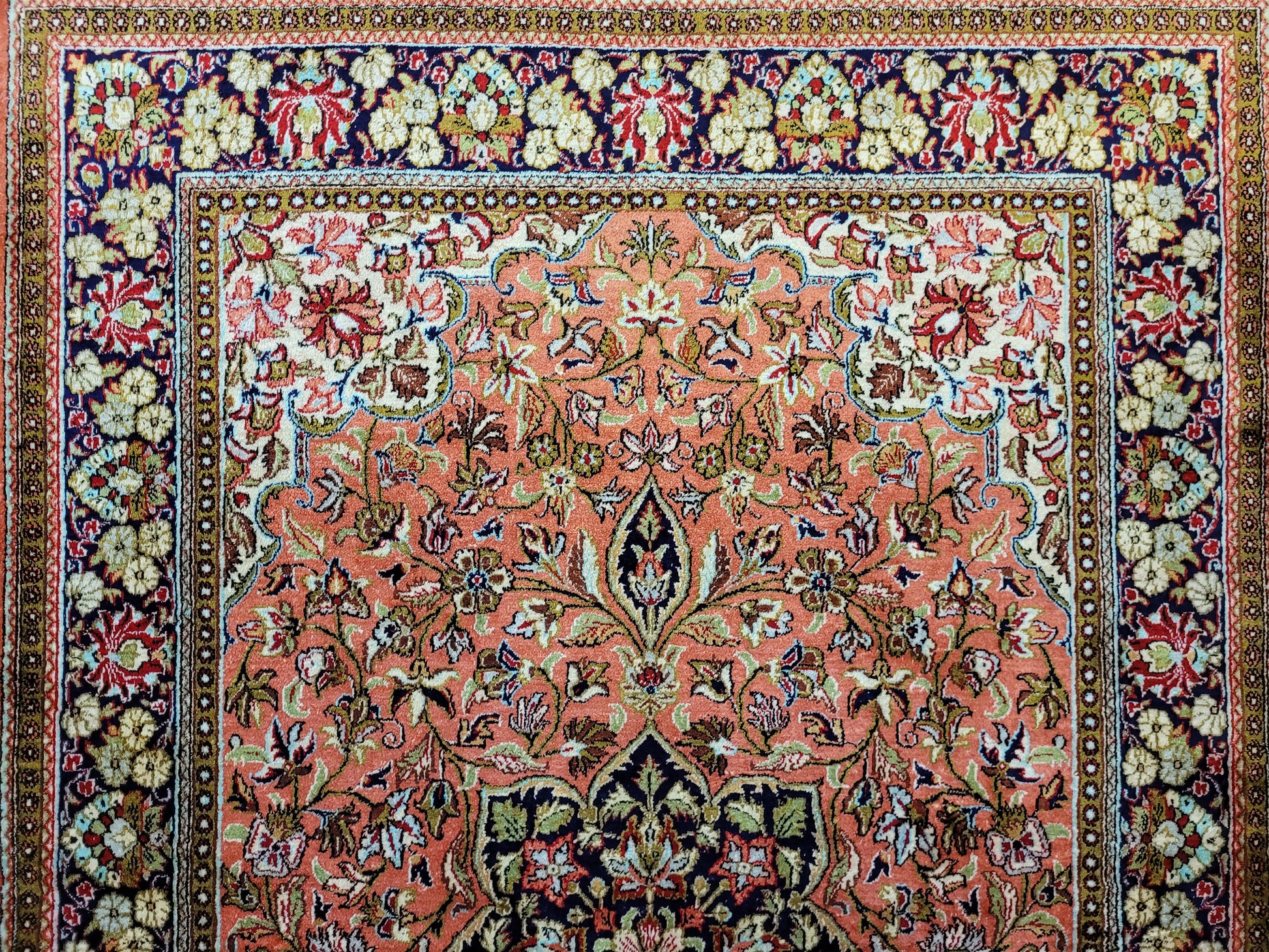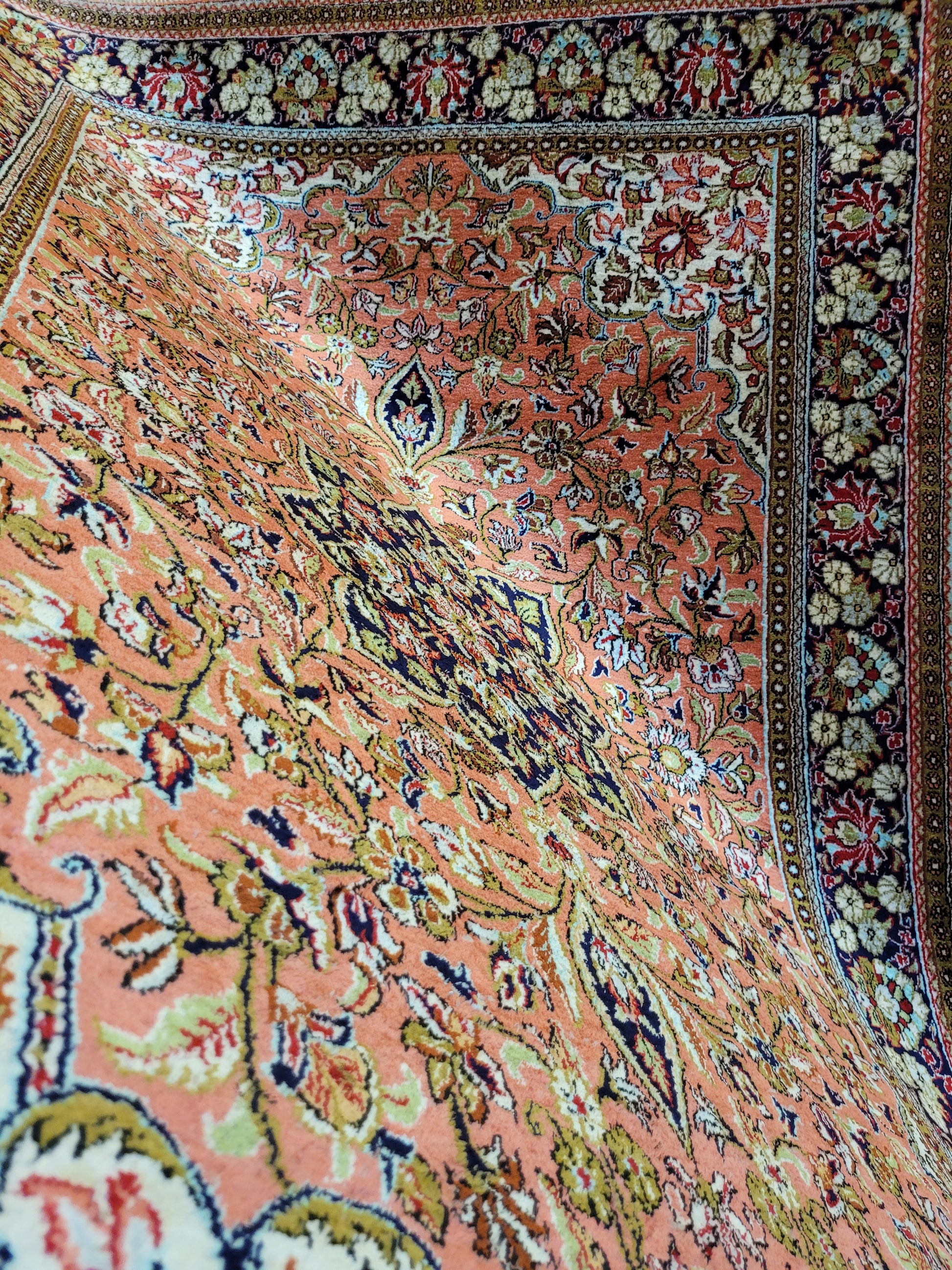 angeboten wird ein edler Ghom Seidenteppich, handgeknüpft auf feiner Seidenkette in meisterhafter Qualität. Das zentrale Medaillon in tiefem Dunkelblau ist reich mit Blütenornamenten ausgearbeitet und eingebettet in ein warmes, lachsfarbenes Feld. Über das gesamte Teppichfeld verteilen sich elegante Ranken, Blüten und Palmetten in harmonischer Symmetrie. Die prachtvolle Bordüre mit floralen Mustern in kräftigem Dunkelblau, Rot, Beige und Grün rahmt die Komposition kunstvoll ein. Eine Besonderheit dieses Teppichs ist die Signatur des Knüpfmeisters, die seine künstlerische Herkunft und Exklusivität hervorhebt.