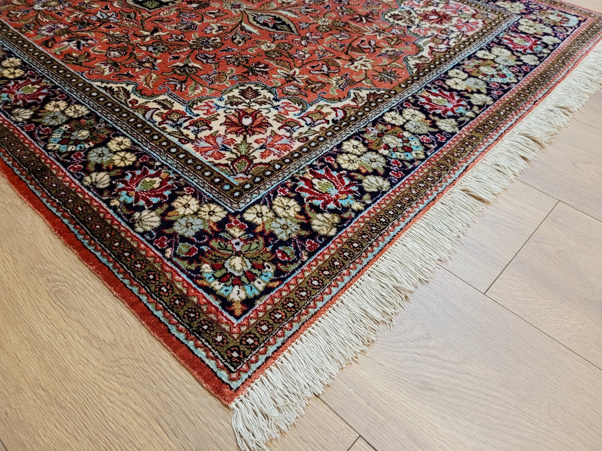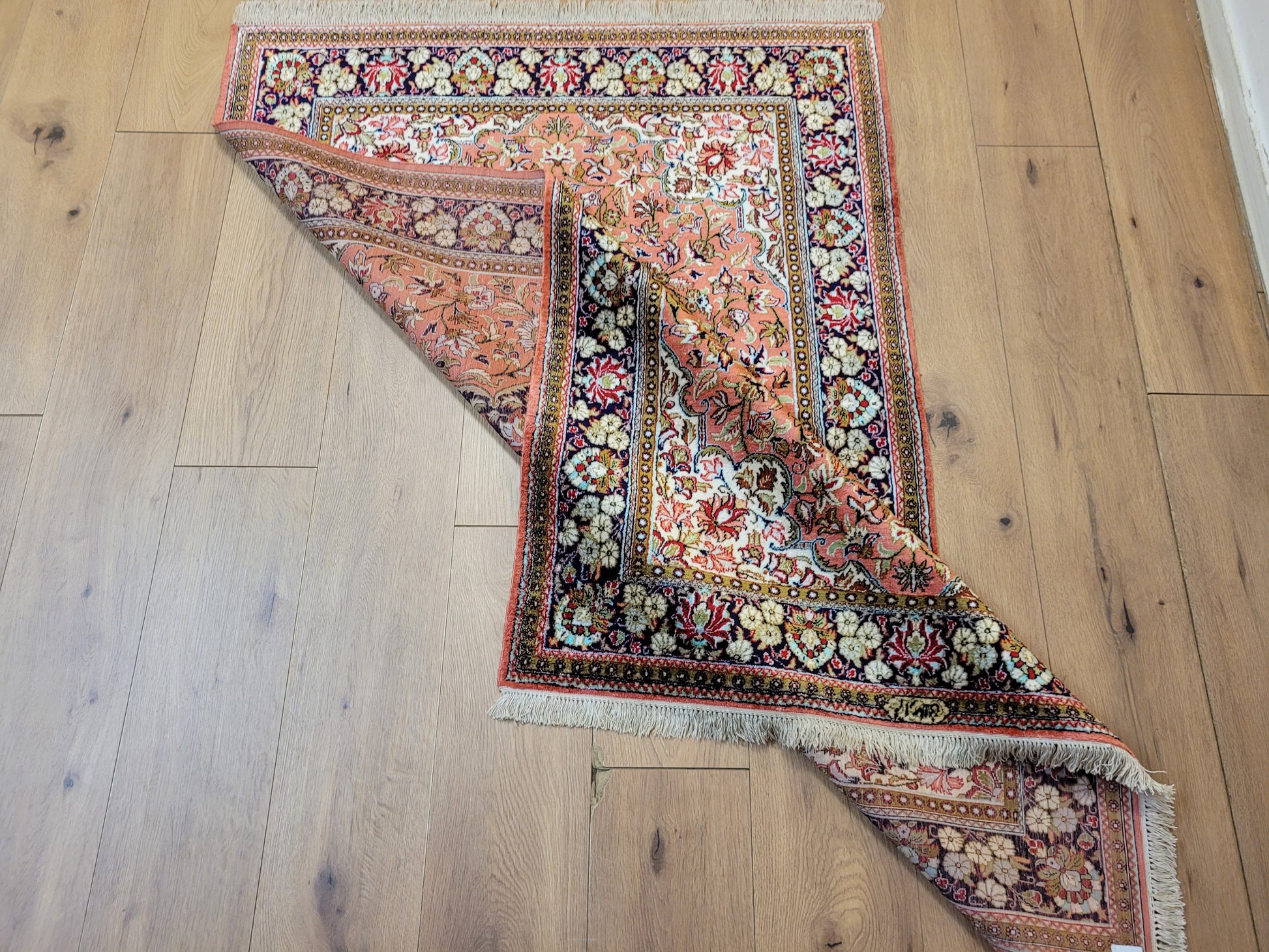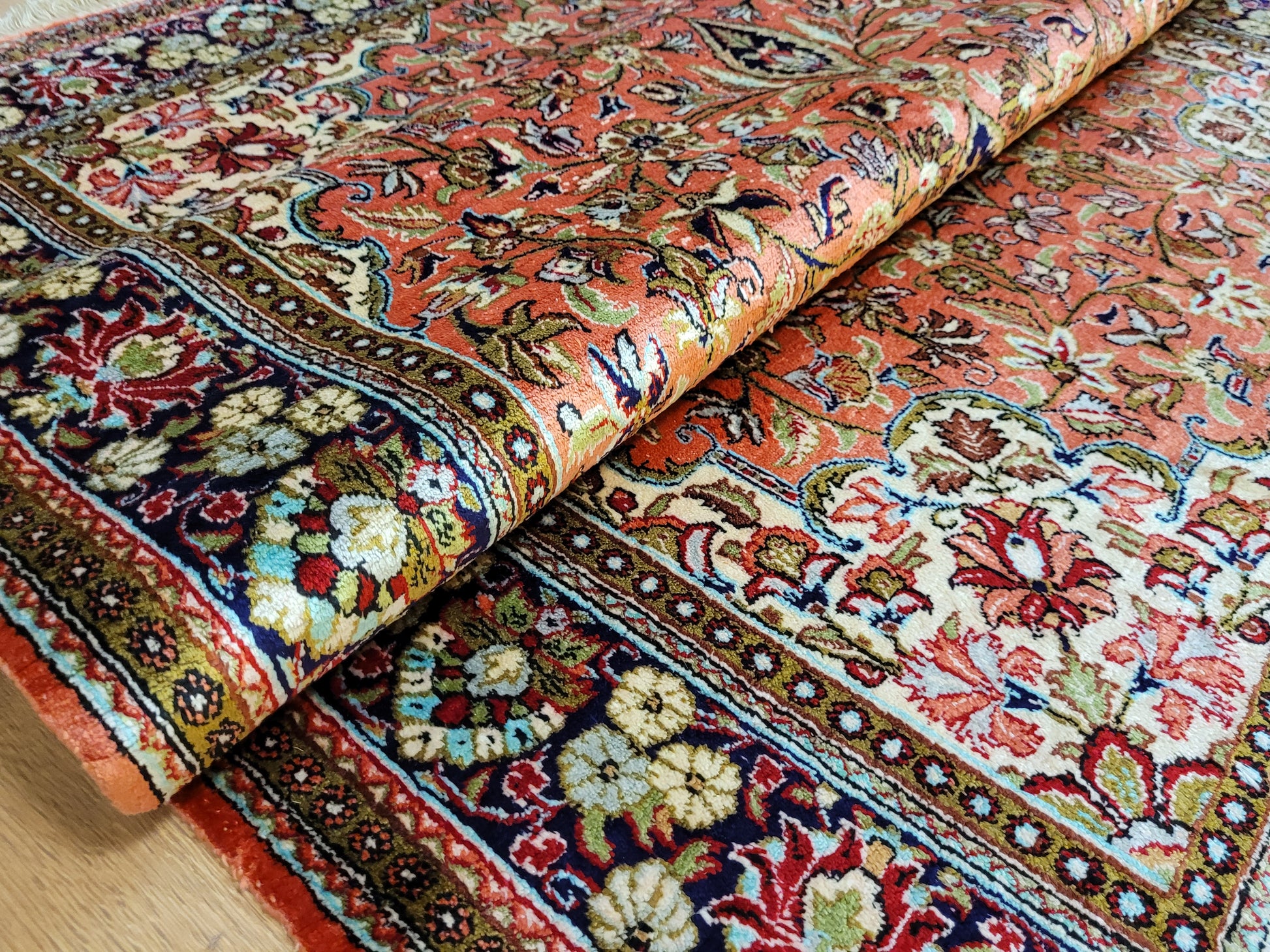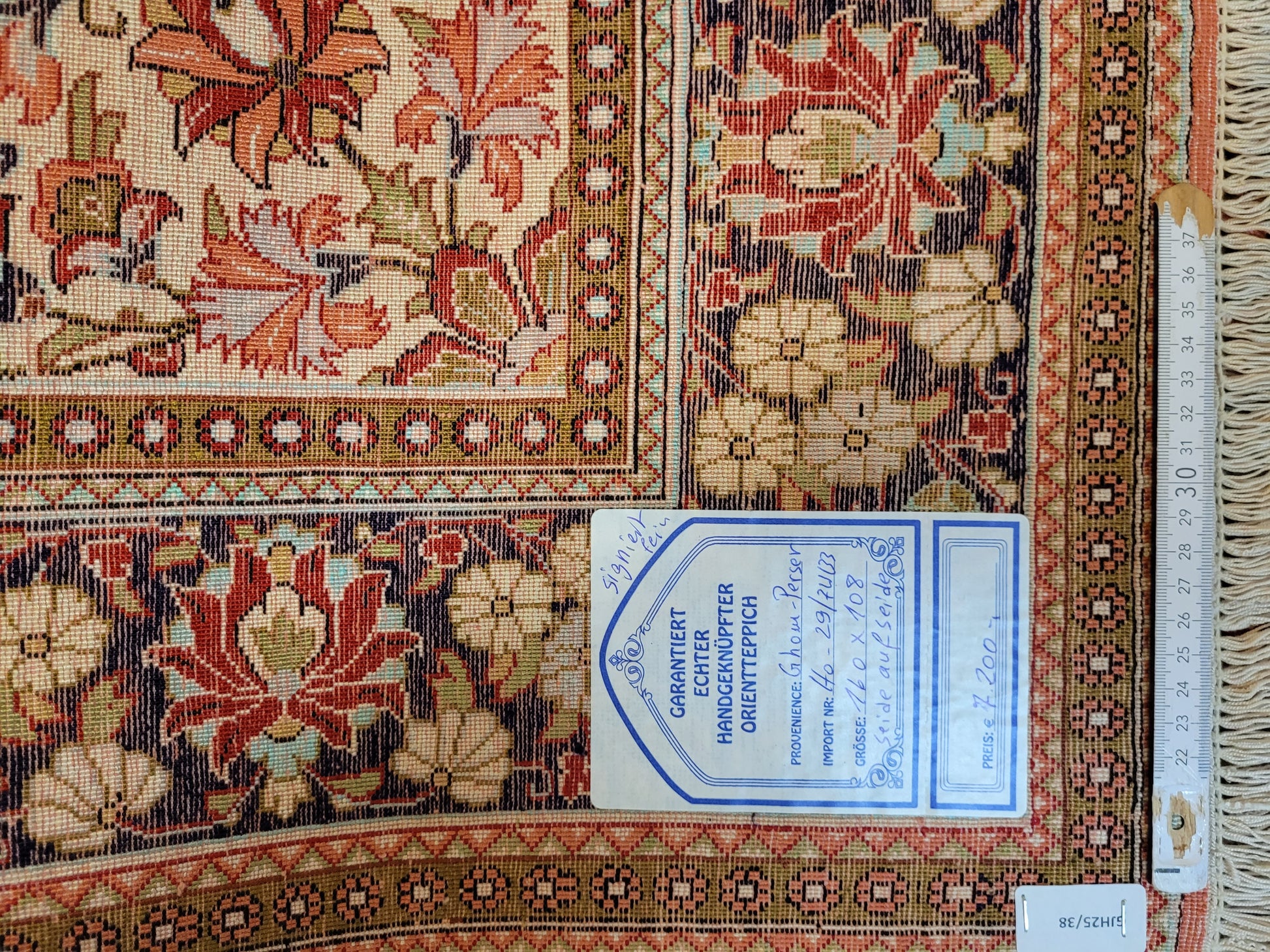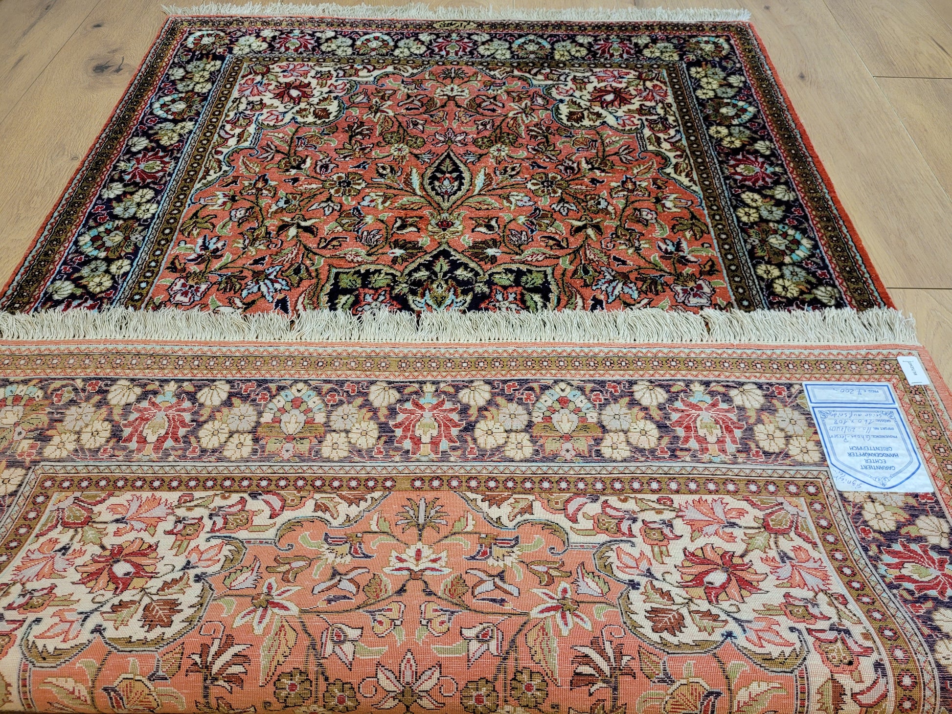 angeboten wird ein edler Ghom Seidenteppich, handgeknüpft auf feiner Seidenkette in meisterhafter Qualität. Das zentrale Medaillon in tiefem Dunkelblau ist reich mit Blütenornamenten ausgearbeitet und eingebettet in ein warmes, lachsfarbenes Feld. Über das gesamte Teppichfeld verteilen sich elegante Ranken, Blüten und Palmetten in harmonischer Symmetrie. Die prachtvolle Bordüre mit floralen Mustern in kräftigem Dunkelblau, Rot, Beige und Grün rahmt die Komposition kunstvoll ein. Eine Besonderheit dieses Teppichs ist die Signatur des Knüpfmeisters, die seine künstlerische Herkunft und Exklusivität hervorhebt.