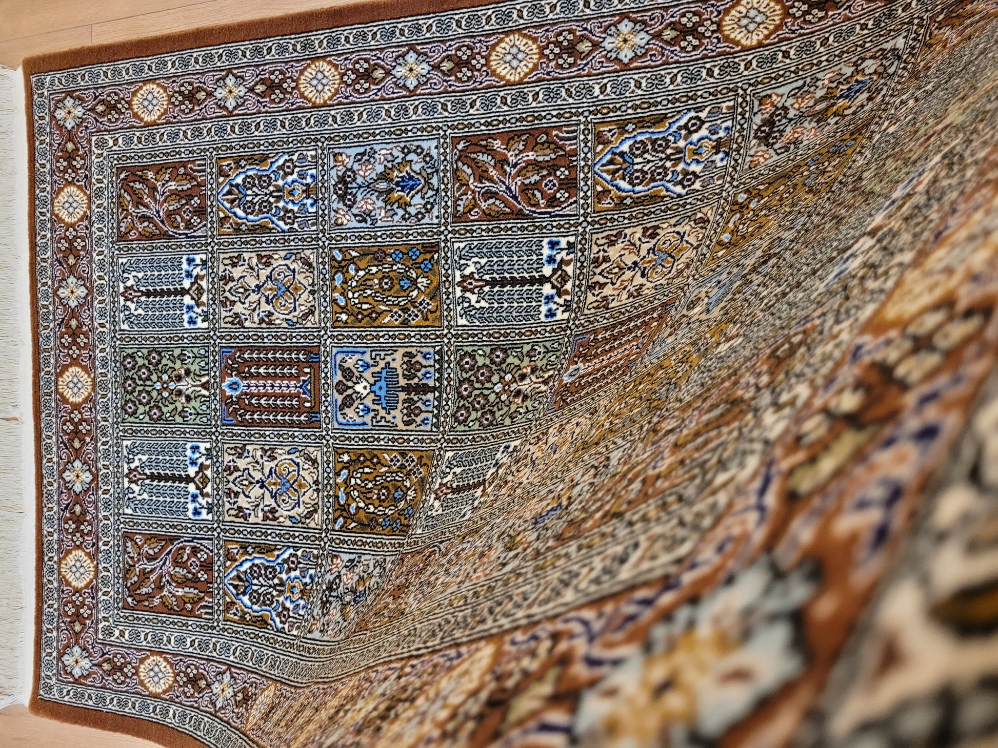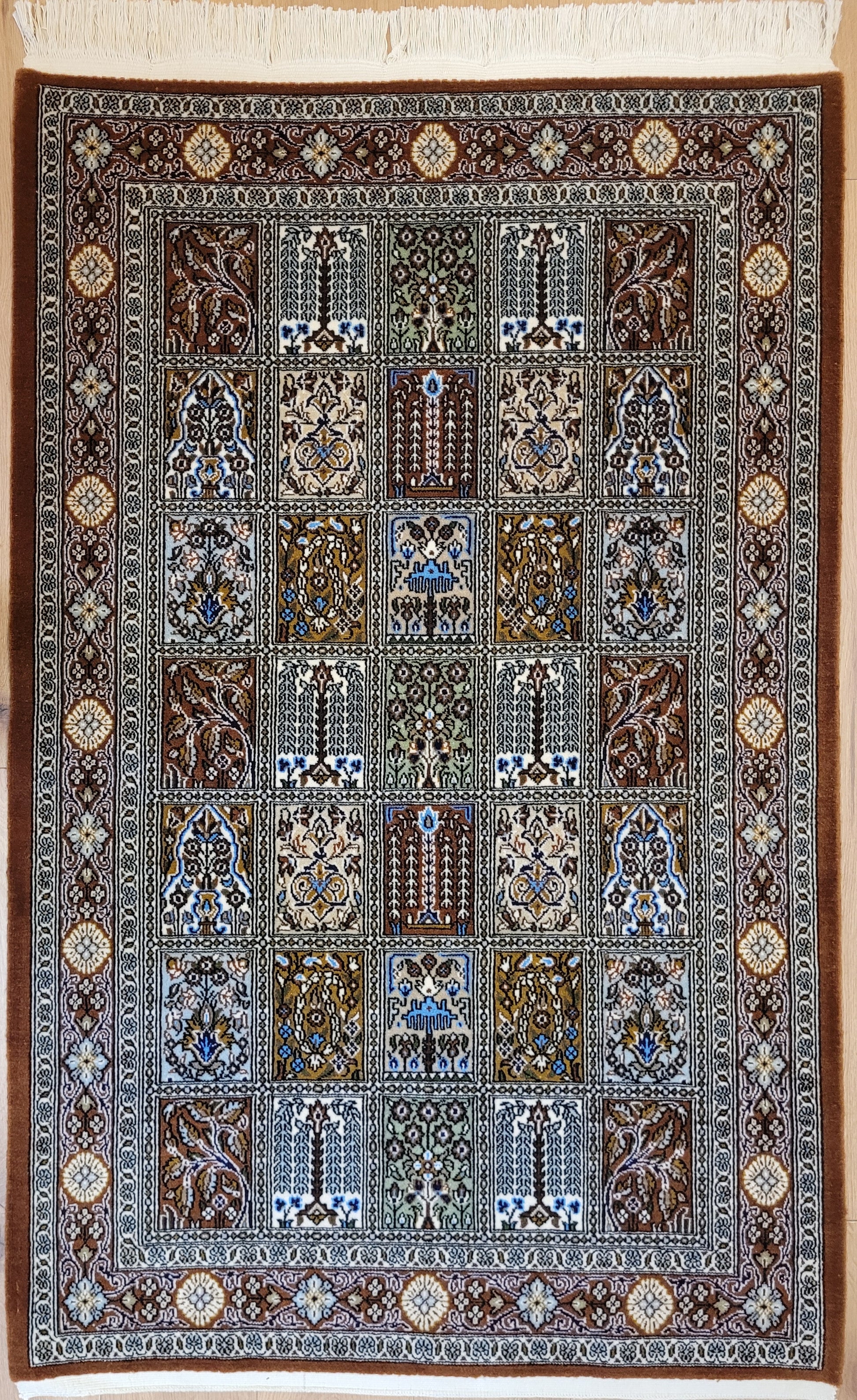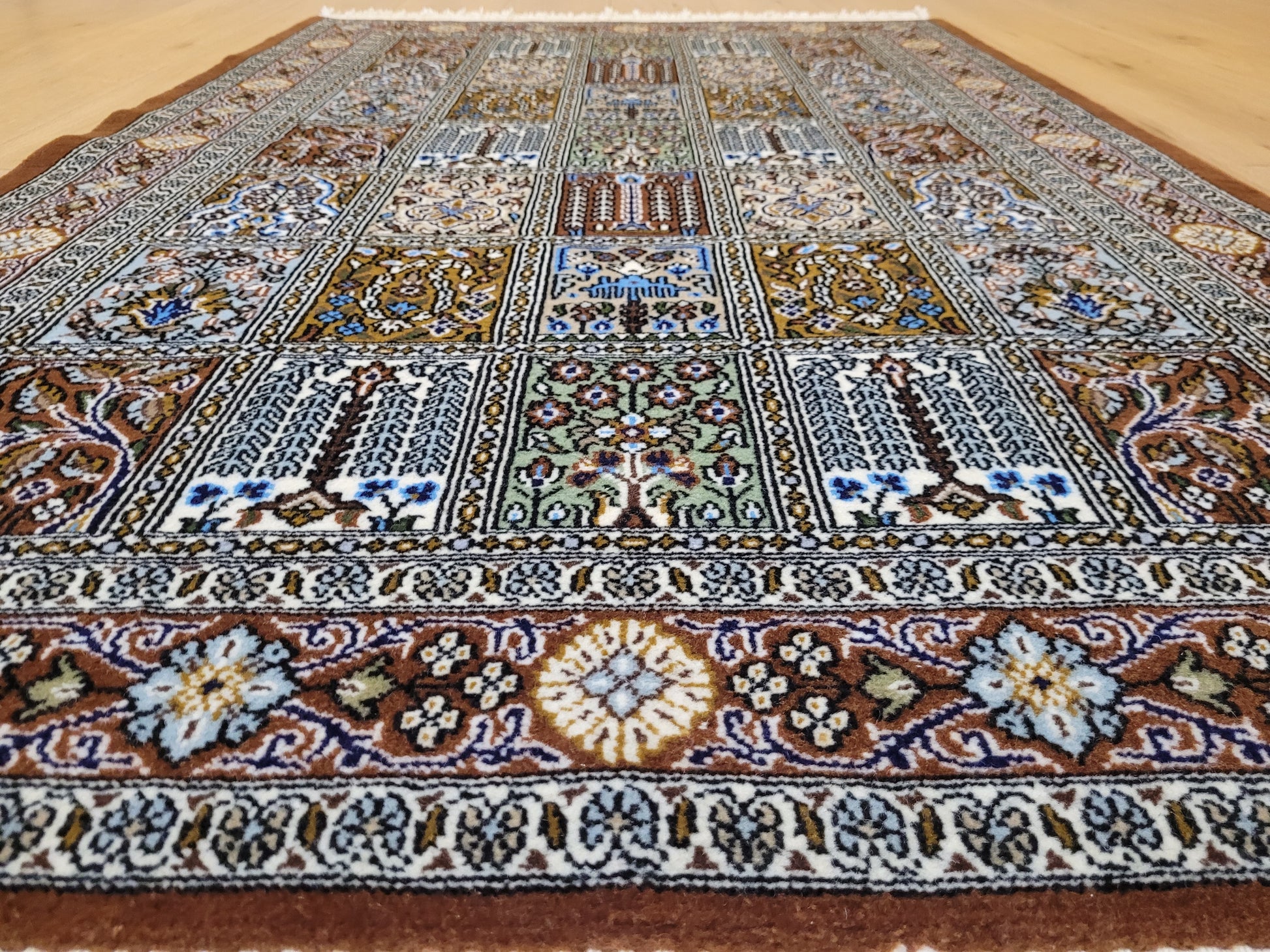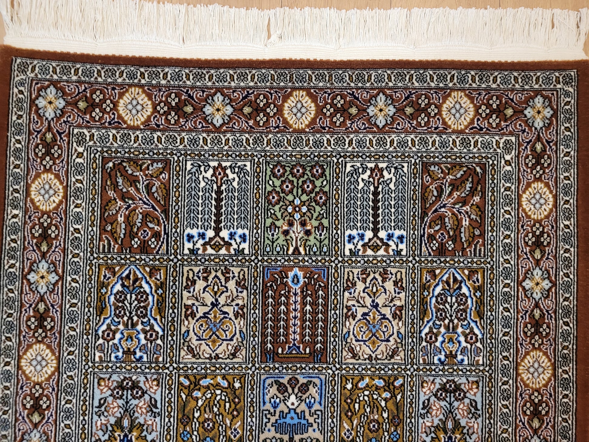 angeboten wird ein erlesener Ghom Teppich aus feiner Korkwolle, handgeknüpft in exzellenter Qualität. Das Design zeigt das klassische Gartenmuster in rechteckigen Feldern, die mit floralen Ranken, stilisierten Bäumen, Vasen und Ornamenten geschmückt sind. Jedes Feld erzählt ein eigenes Detail und fügt sich zu einer harmonischen Gesamtkomposition zusammen. Die umlaufende Bordüre mit Blüten- und Medaillonmotiven vollendet die elegante Wirkung.