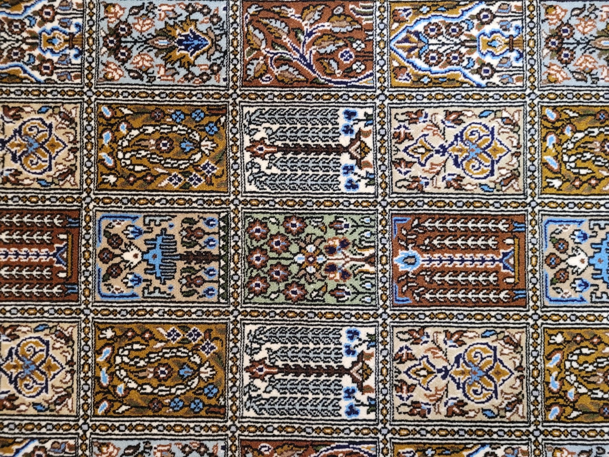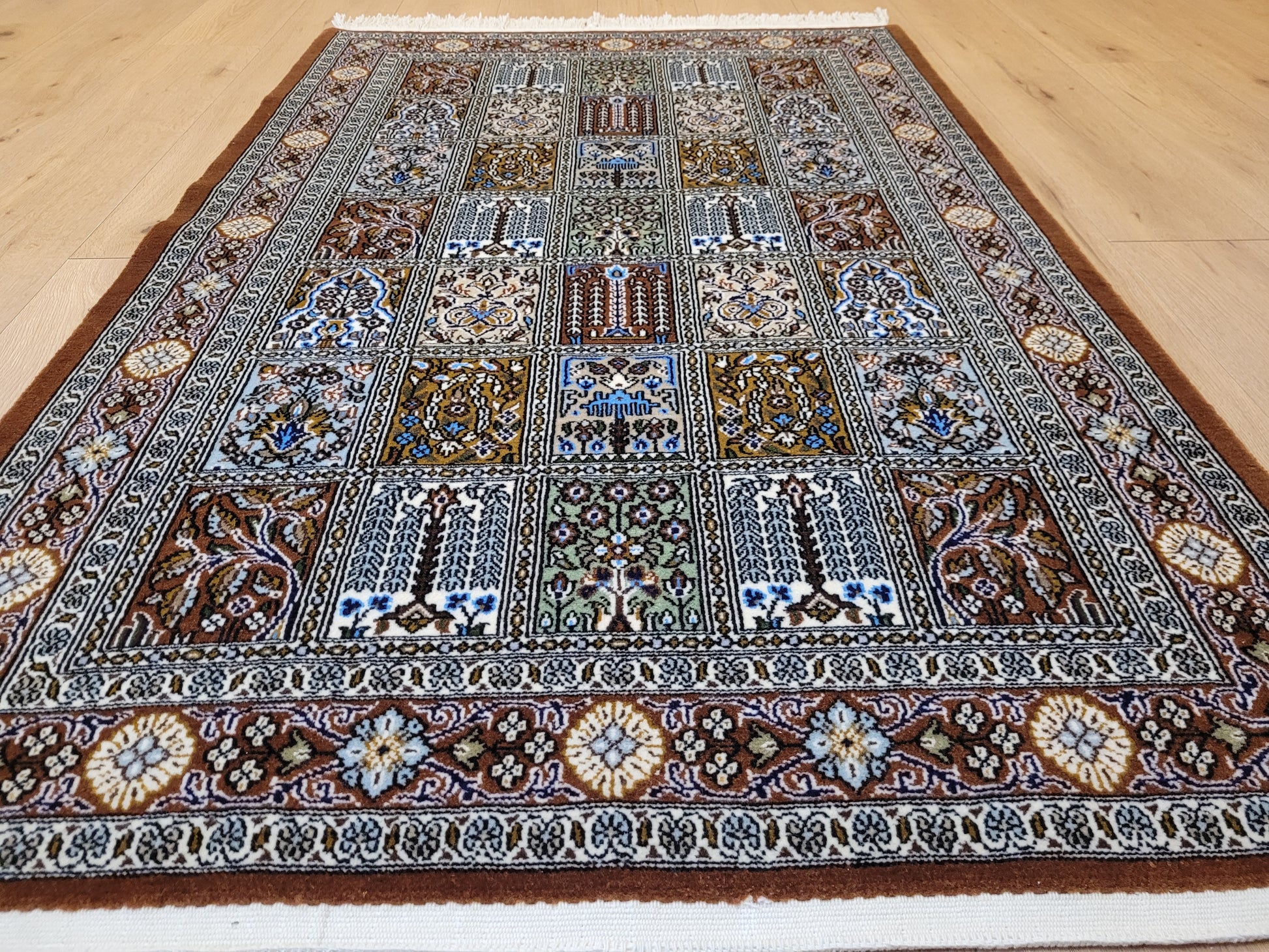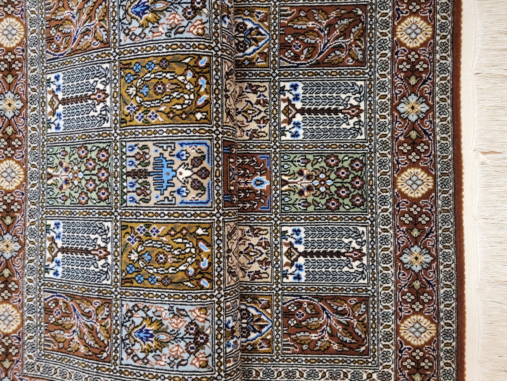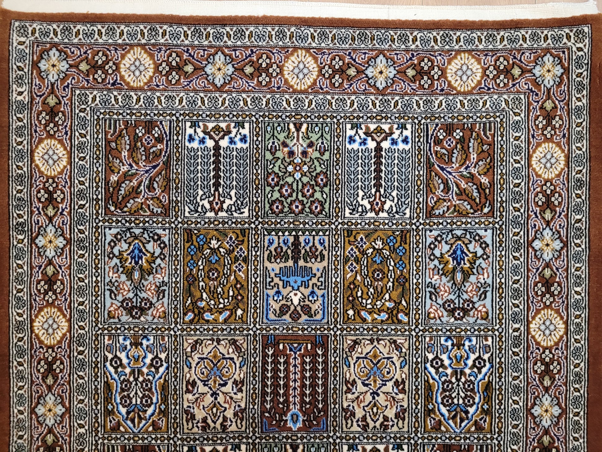 angeboten wird ein erlesener Ghom Teppich aus feiner Korkwolle, handgeknüpft in exzellenter Qualität. Das Design zeigt das klassische Gartenmuster in rechteckigen Feldern, die mit floralen Ranken, stilisierten Bäumen, Vasen und Ornamenten geschmückt sind. Jedes Feld erzählt ein eigenes Detail und fügt sich zu einer harmonischen Gesamtkomposition zusammen. Die umlaufende Bordüre mit Blüten- und Medaillonmotiven vollendet die elegante Wirkung.