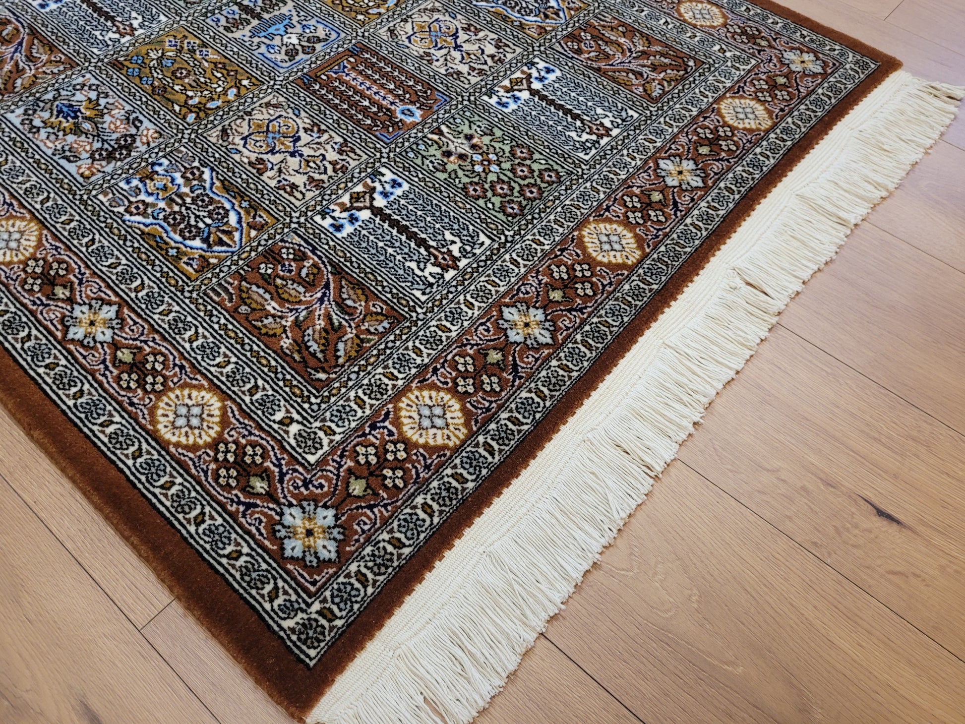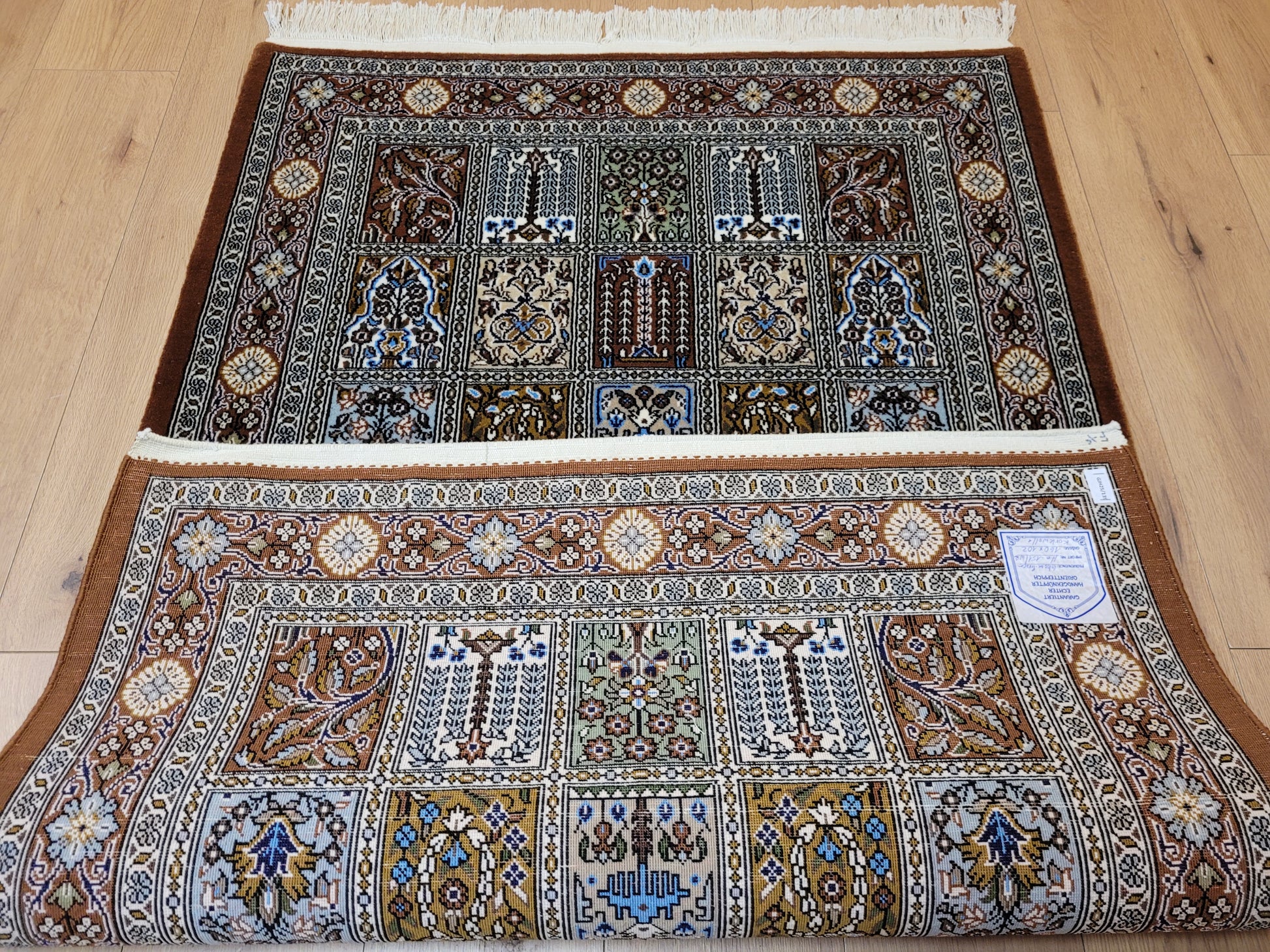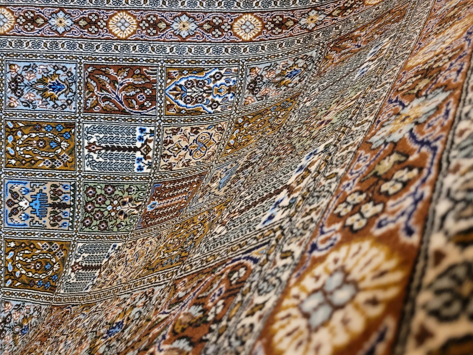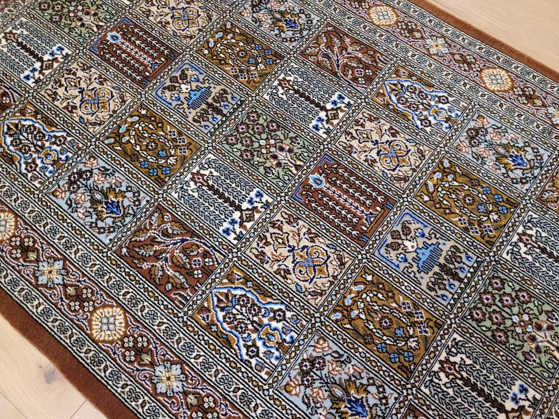 angeboten wird ein erlesener Ghom Teppich aus feiner Korkwolle, handgeknüpft in exzellenter Qualität. Das Design zeigt das klassische Gartenmuster in rechteckigen Feldern, die mit floralen Ranken, stilisierten Bäumen, Vasen und Ornamenten geschmückt sind. Jedes Feld erzählt ein eigenes Detail und fügt sich zu einer harmonischen Gesamtkomposition zusammen. Die umlaufende Bordüre mit Blüten- und Medaillonmotiven vollendet die elegante Wirkung.
