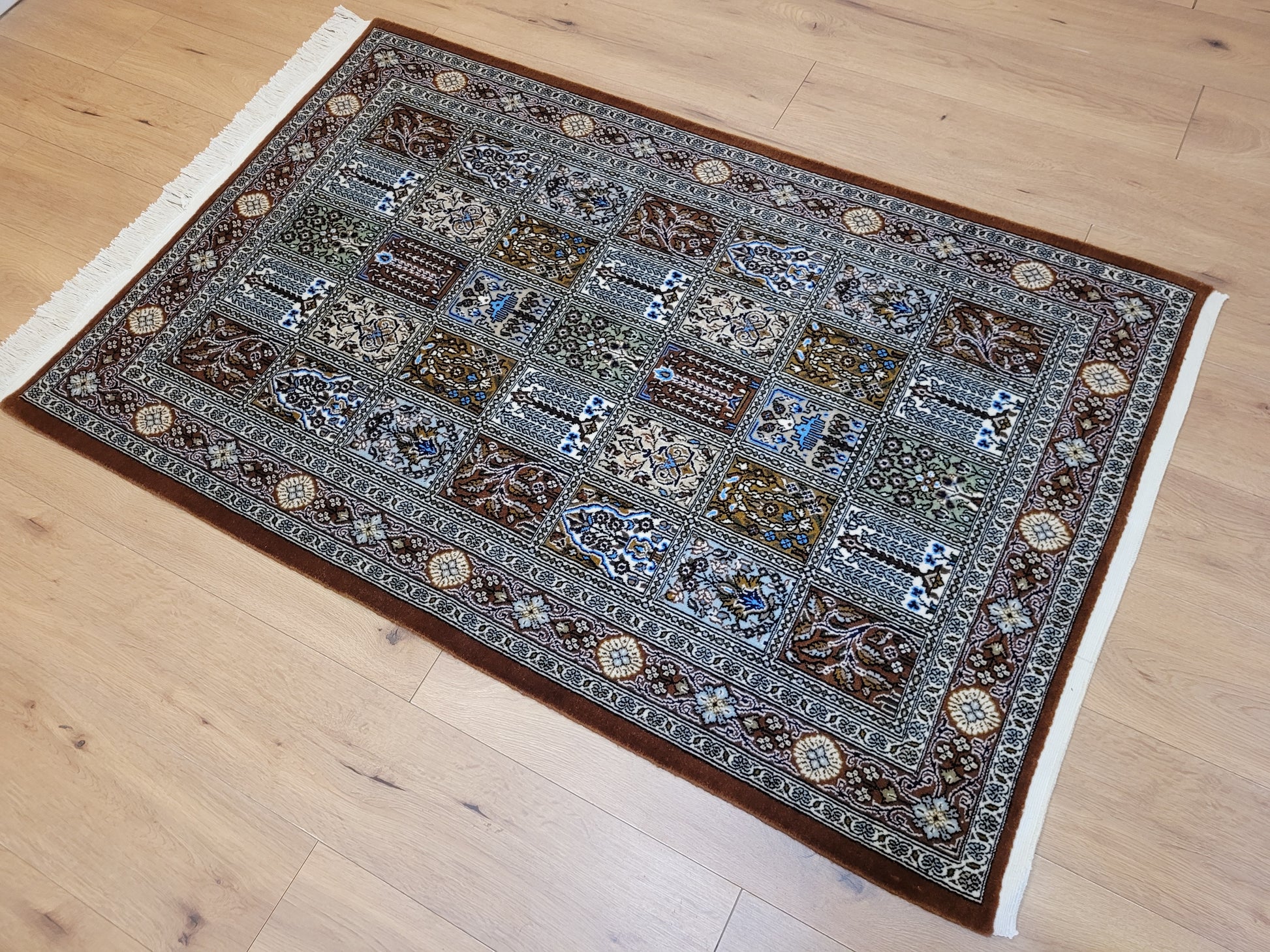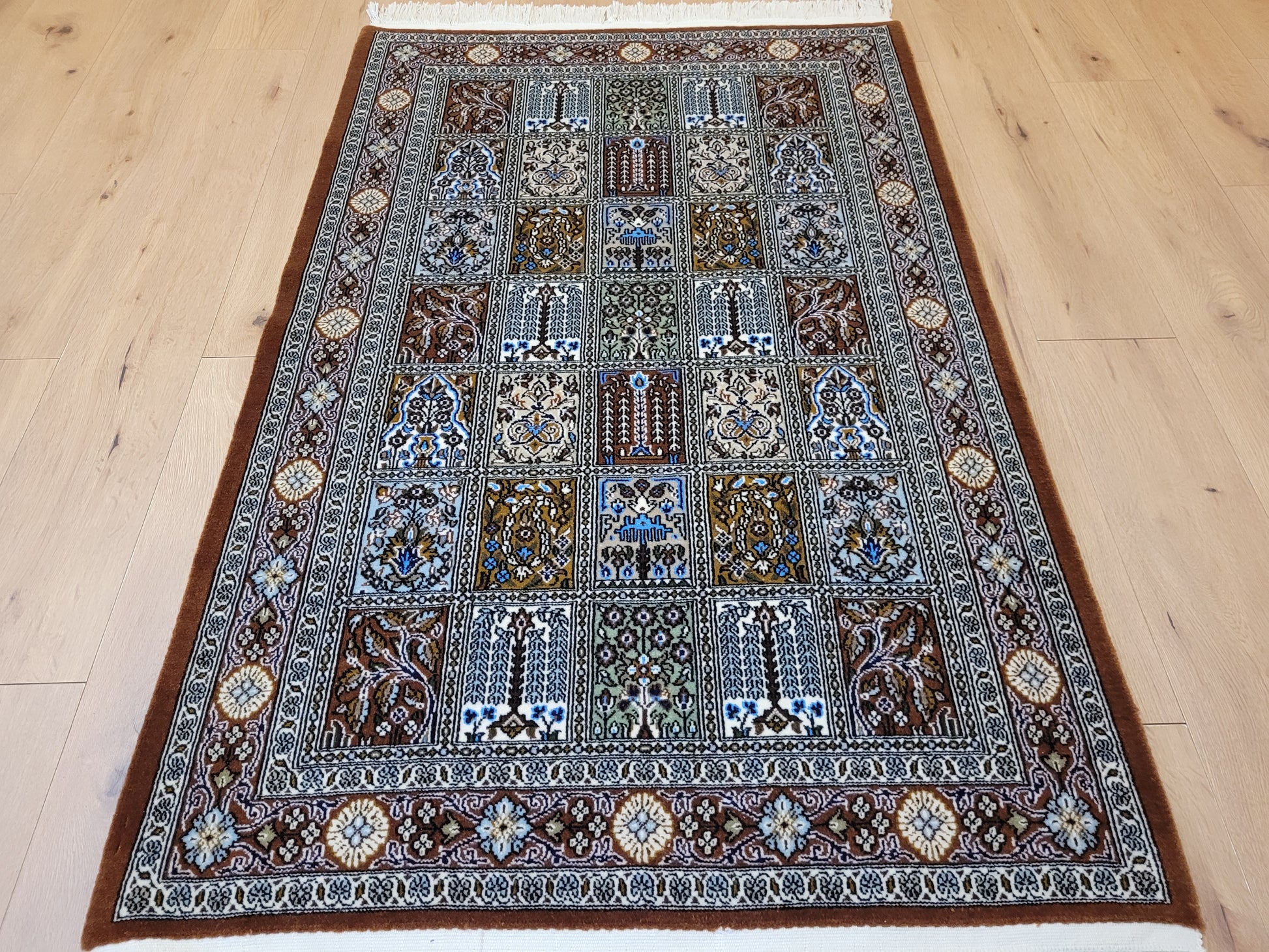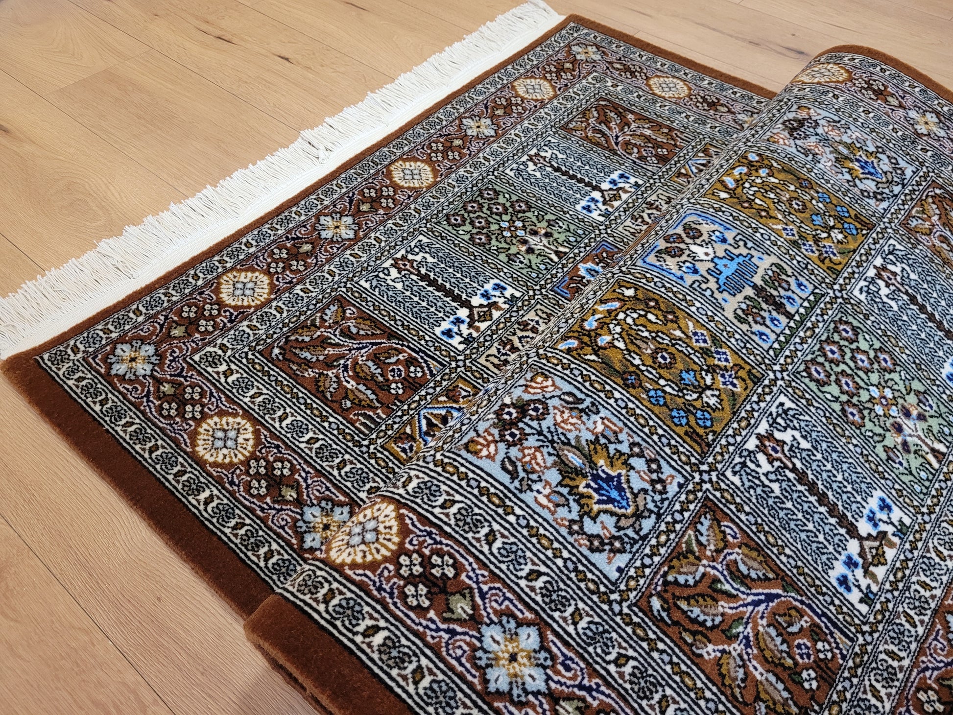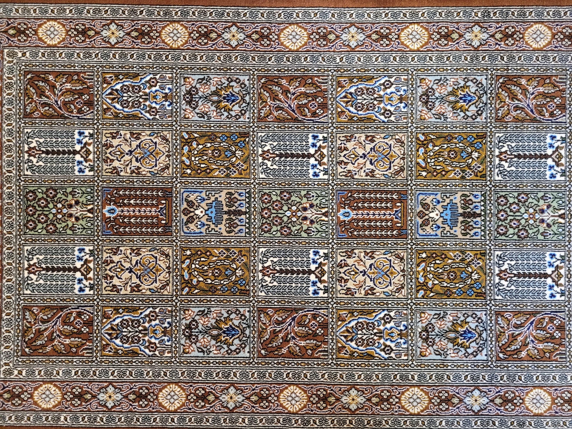 angeboten wird ein erlesener Ghom Teppich aus feiner Korkwolle, handgeknüpft in exzellenter Qualität. Das Design zeigt das klassische Gartenmuster in rechteckigen Feldern, die mit floralen Ranken, stilisierten Bäumen, Vasen und Ornamenten geschmückt sind. Jedes Feld erzählt ein eigenes Detail und fügt sich zu einer harmonischen Gesamtkomposition zusammen. Die umlaufende Bordüre mit Blüten- und Medaillonmotiven vollendet die elegante Wirkung.