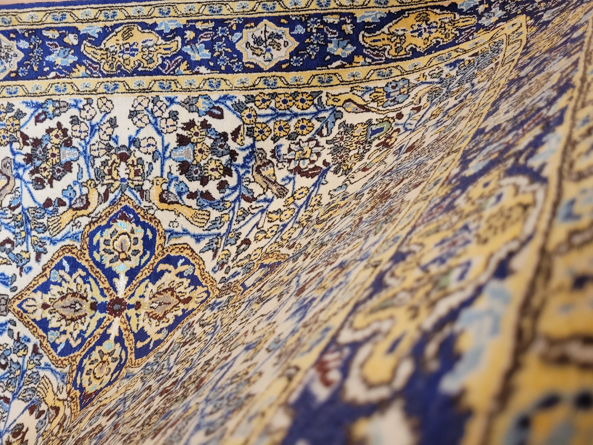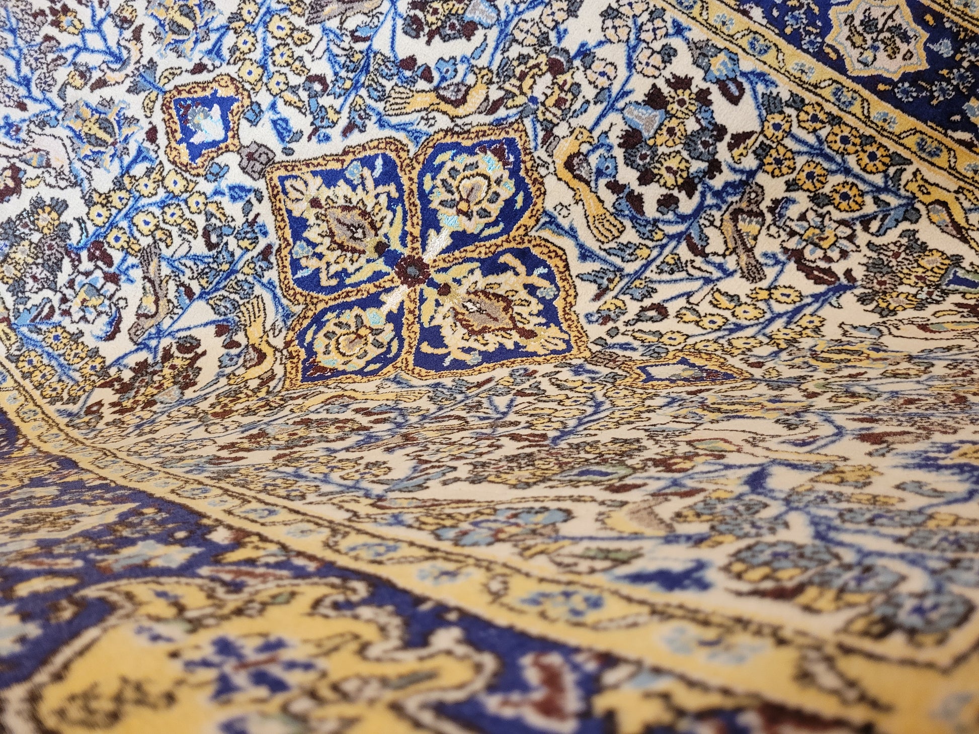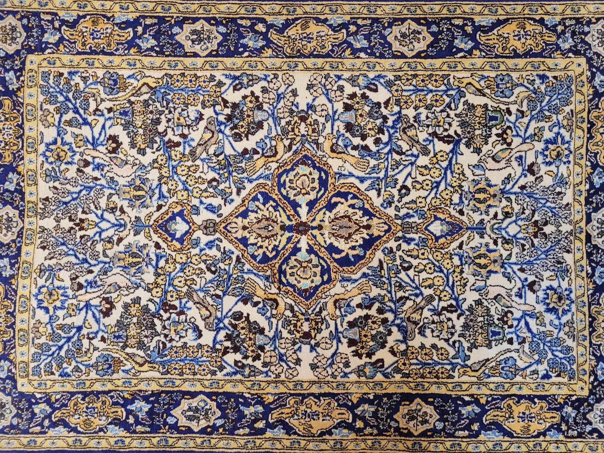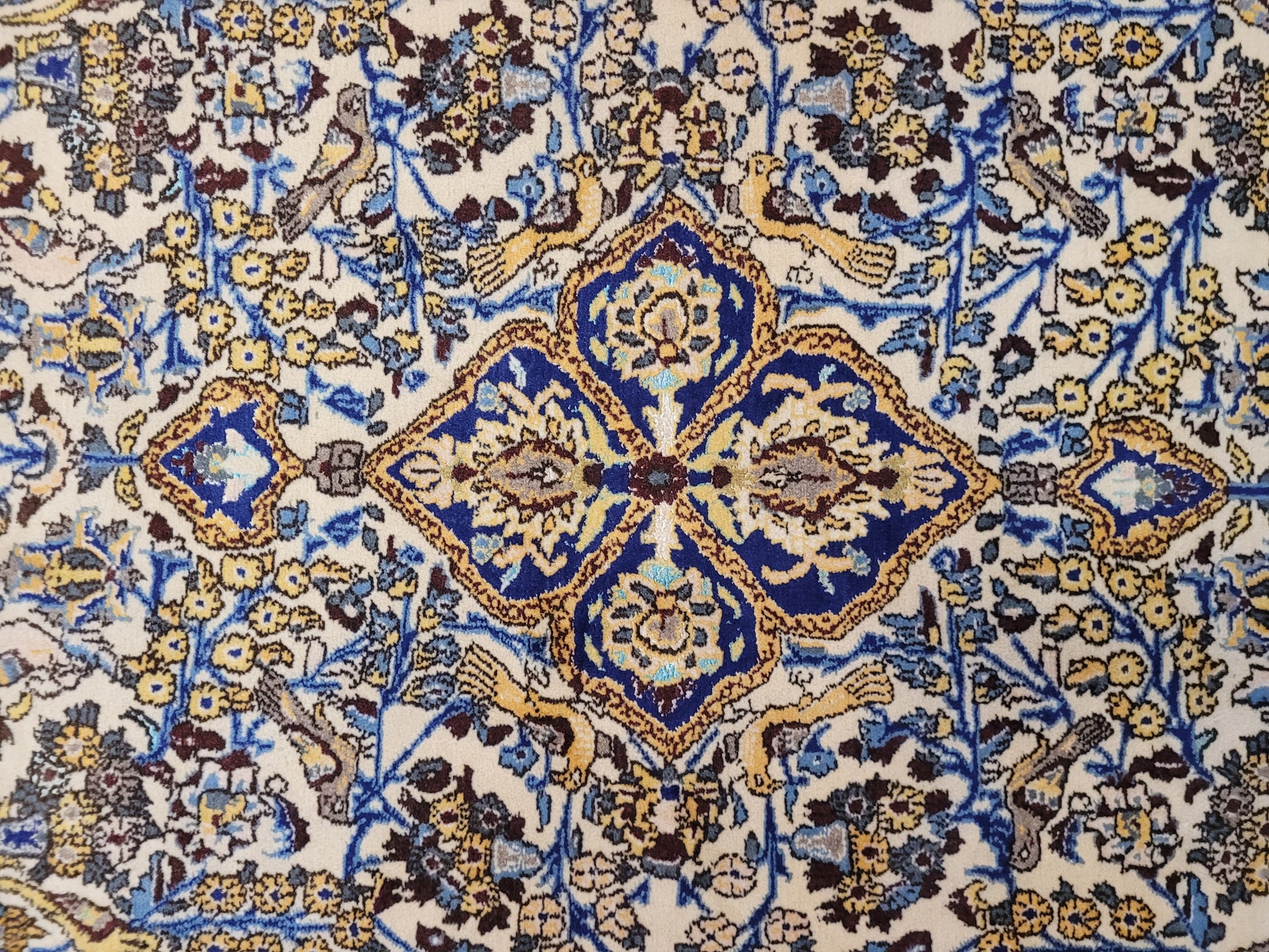 angeboten wird ein edler Ghom Teppich aus Korkwolle mit Seidenanteilen, handgeknüpft in detailreicher Ausführung. Das Design zeigt ein quadratisches Medaillon im Zentrum, umrahmt von floralen Ranken, Blüten und kunstvoll eingearbeiteten Vogelmotiven. Seidene Akzente verleihen dem Teppich einen leichten Glanz und heben feine Musterdetails besonders hervor.