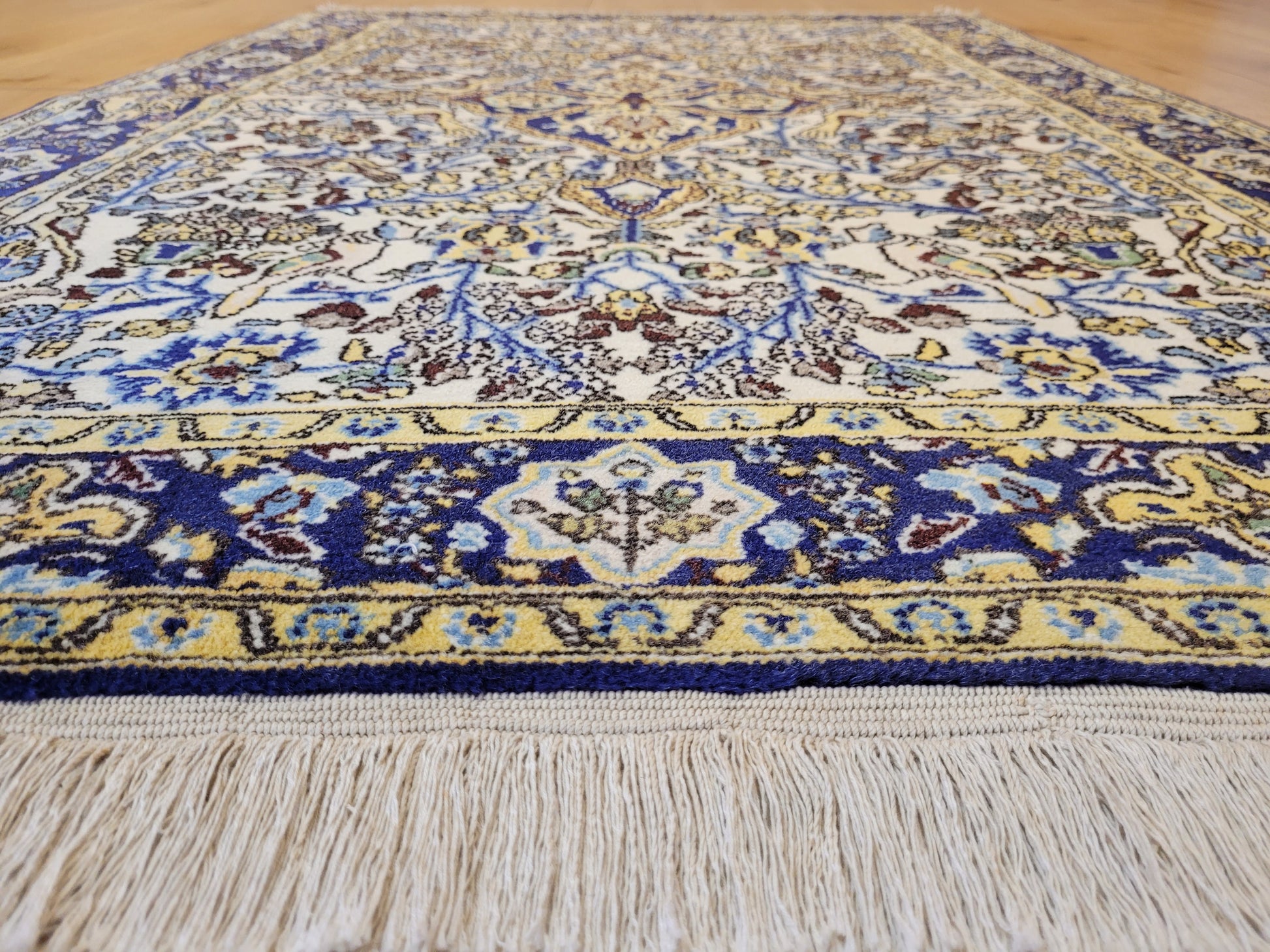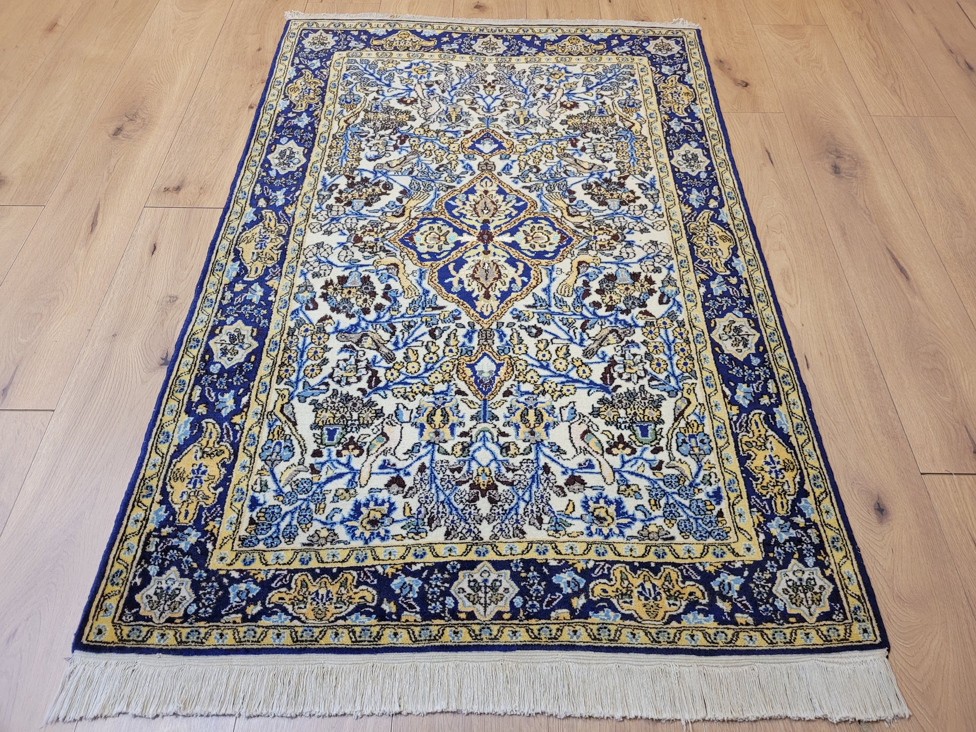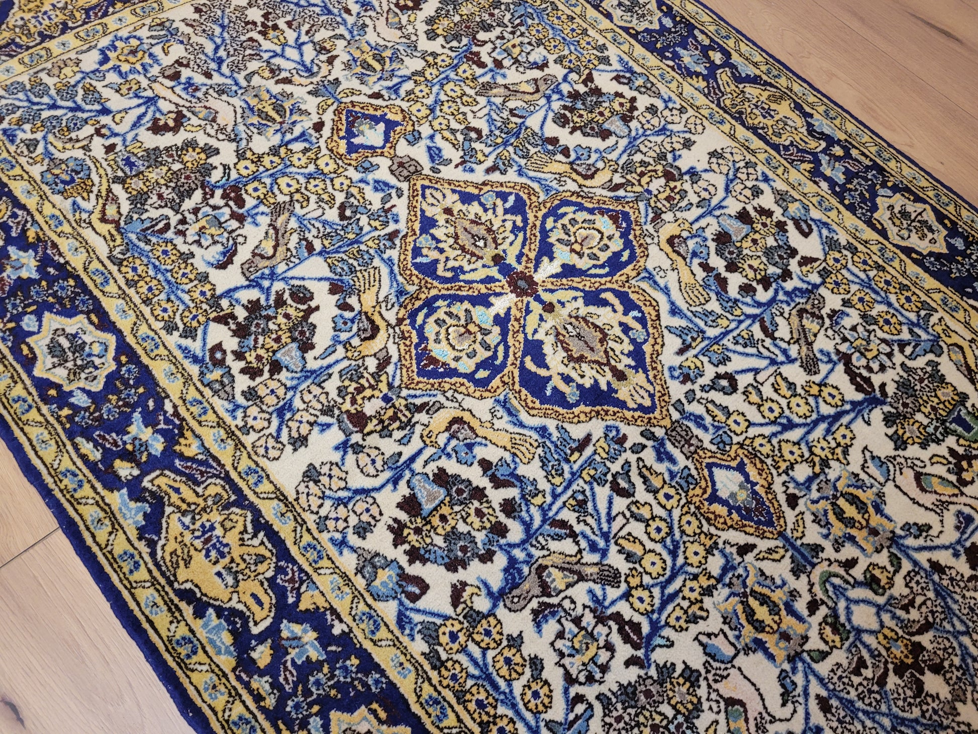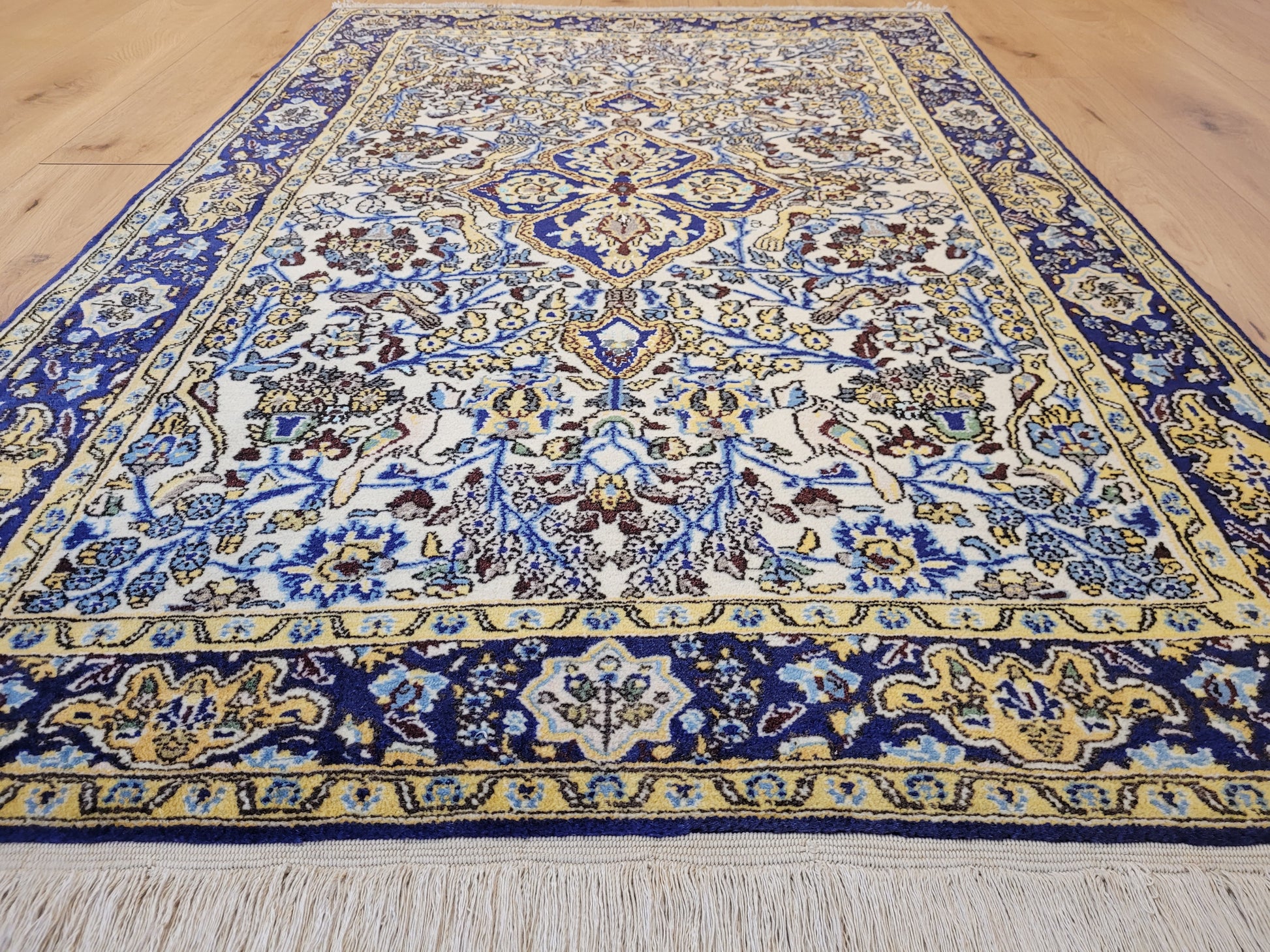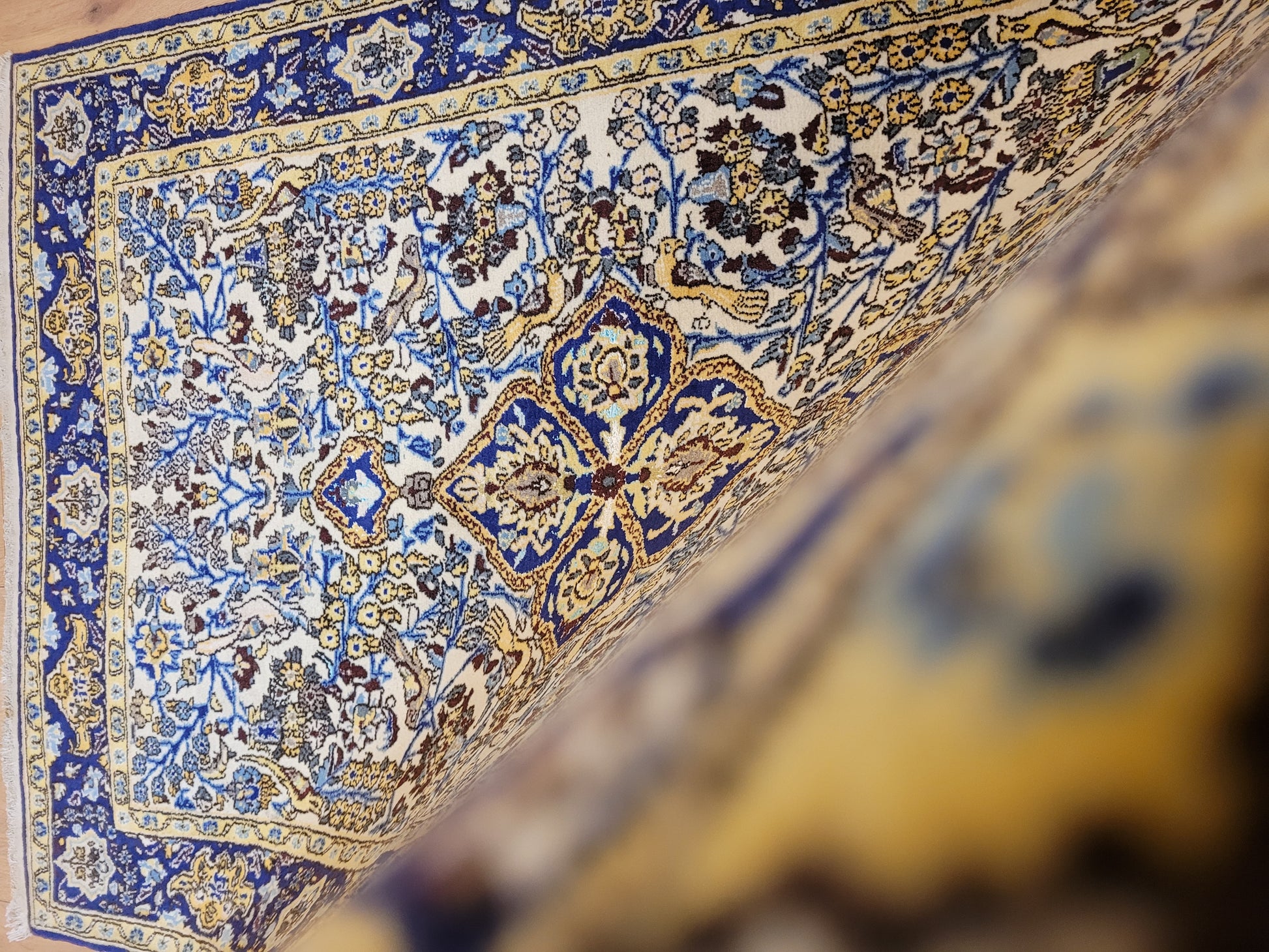 angeboten wird ein edler Ghom Teppich aus Korkwolle mit Seidenanteilen, handgeknüpft in detailreicher Ausführung. Das Design zeigt ein quadratisches Medaillon im Zentrum, umrahmt von floralen Ranken, Blüten und kunstvoll eingearbeiteten Vogelmotiven. Seidene Akzente verleihen dem Teppich einen leichten Glanz und heben feine Musterdetails besonders hervor.