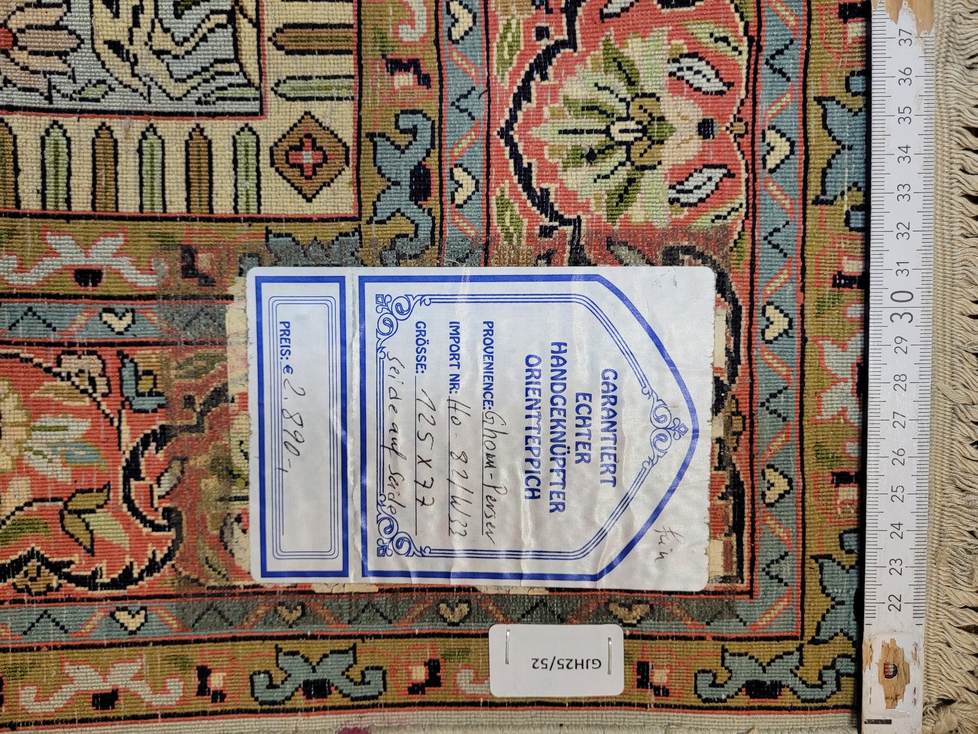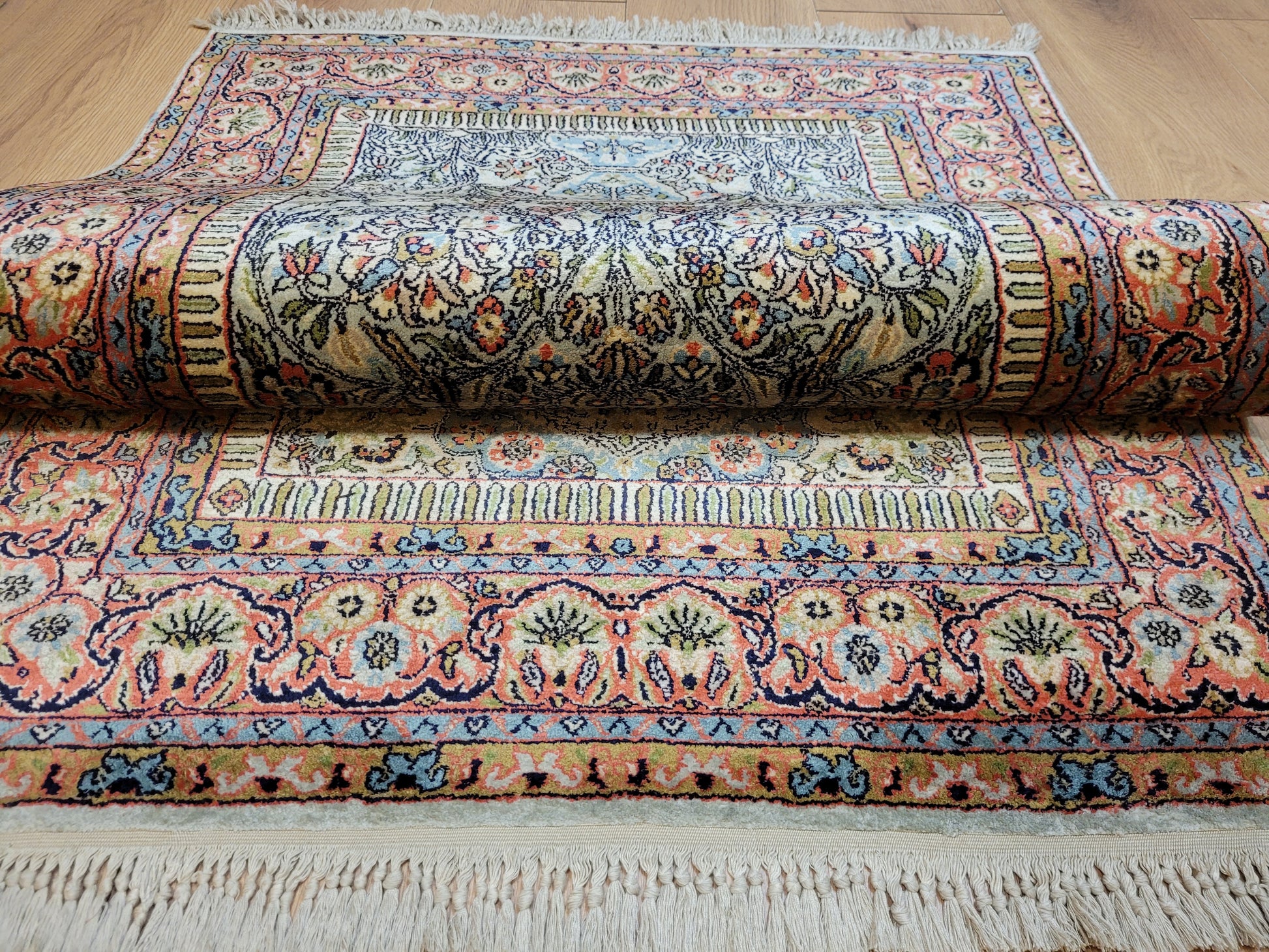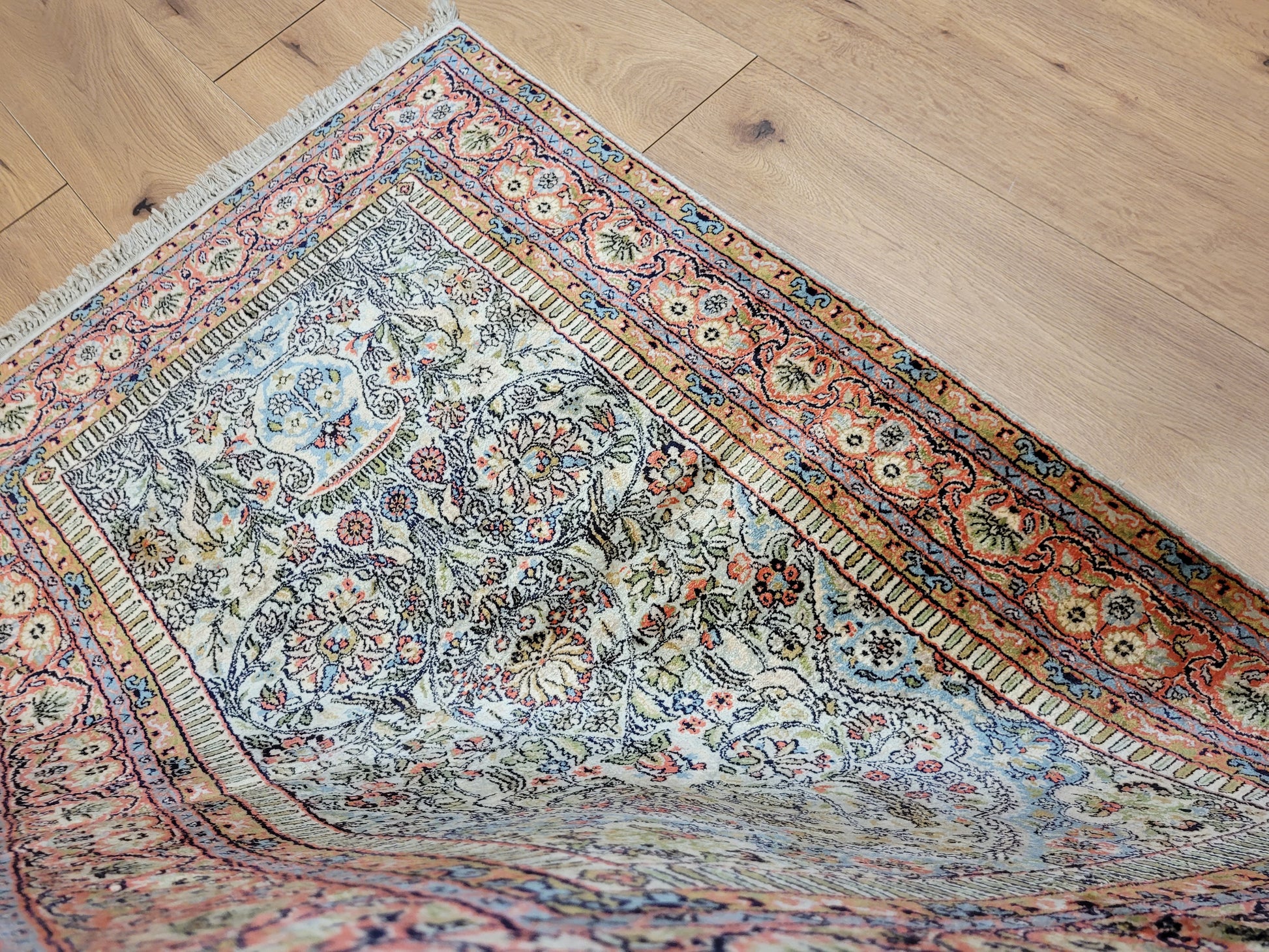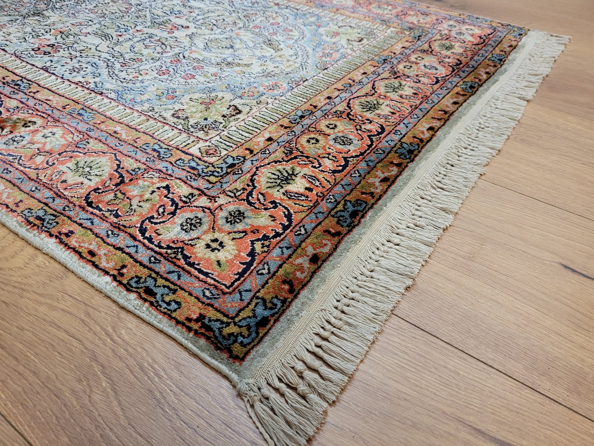 angeboten wird ein edler Ghom Teppich aus reiner Seide auf Seide, fein handgeknüpft in meisterlicher Ausführung. Das zentrale Motiv zeigt eine kunstvoll gestaltete Vase, aus der sich detailreiche Blütenranken symmetrisch entfalten. Die Farbgebung in Elfenbein, Blau, Zartrosa, Grün und Orange verleiht dem Teppich eine elegante Leuchtkraft. Eine prachtvolle Bordüre mit Blütenmedaillons auf rotem Grund rahmt die Komposition harmonisch ein.