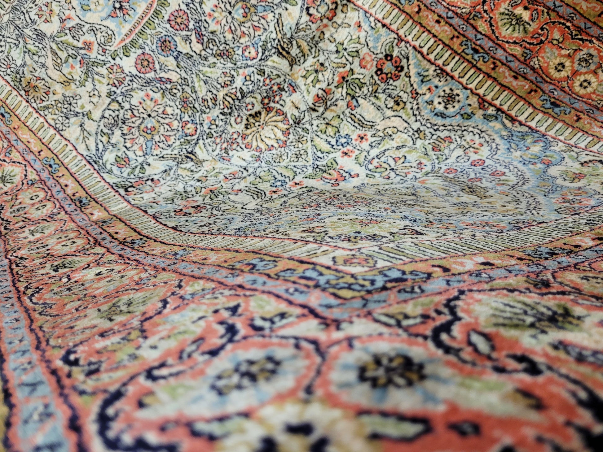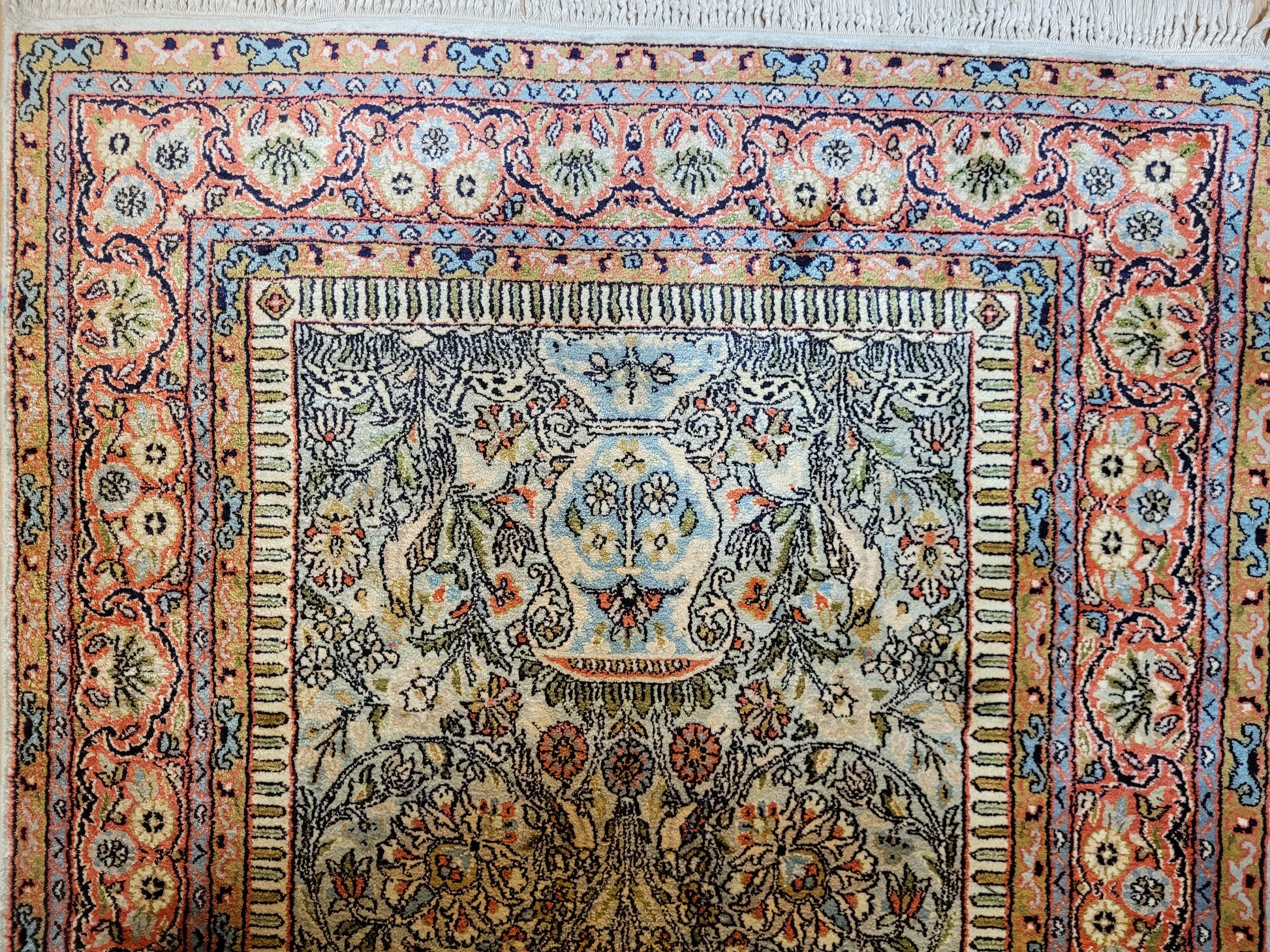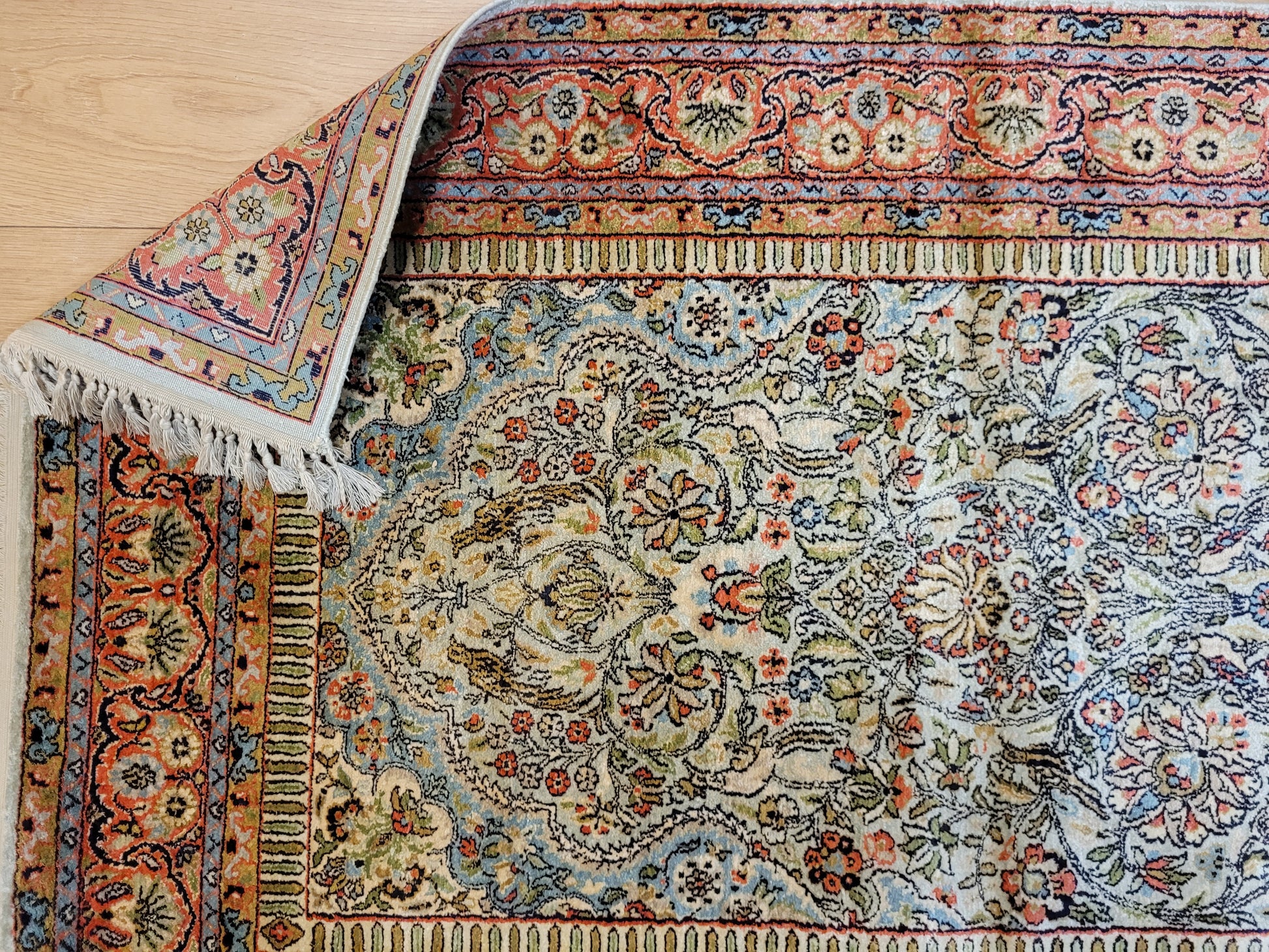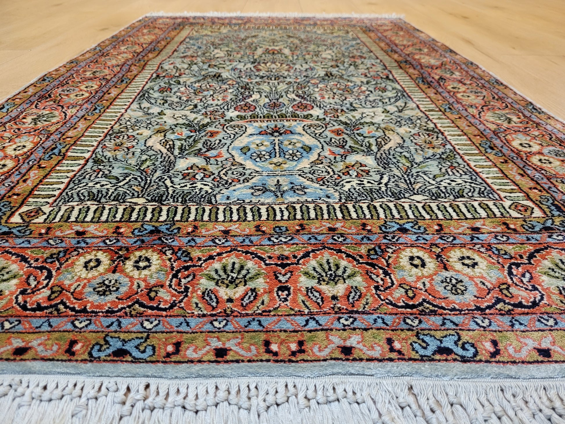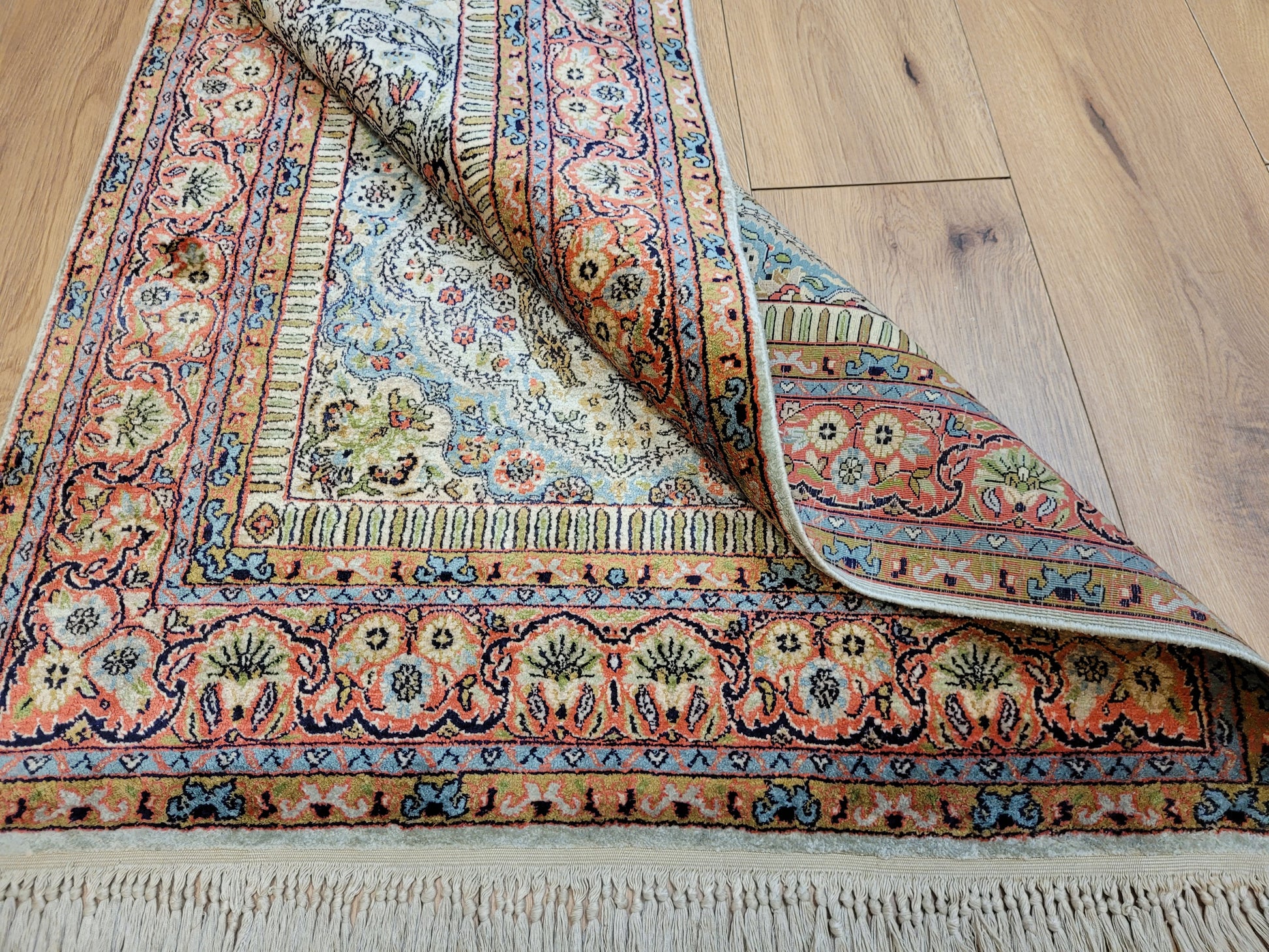 angeboten wird ein edler Ghom Teppich aus reiner Seide auf Seide, fein handgeknüpft in meisterlicher Ausführung. Das zentrale Motiv zeigt eine kunstvoll gestaltete Vase, aus der sich detailreiche Blütenranken symmetrisch entfalten. Die Farbgebung in Elfenbein, Blau, Zartrosa, Grün und Orange verleiht dem Teppich eine elegante Leuchtkraft. Eine prachtvolle Bordüre mit Blütenmedaillons auf rotem Grund rahmt die Komposition harmonisch ein.