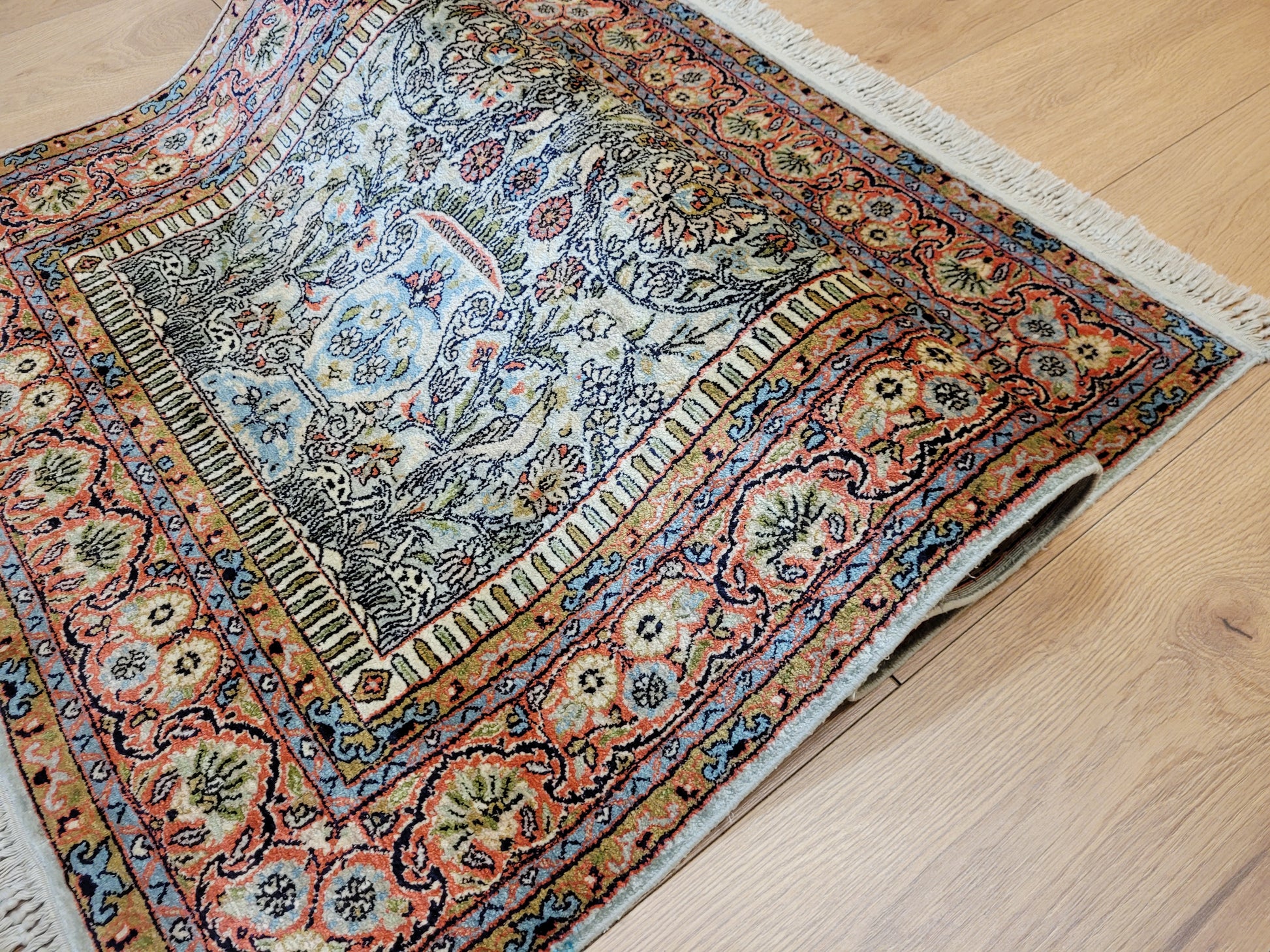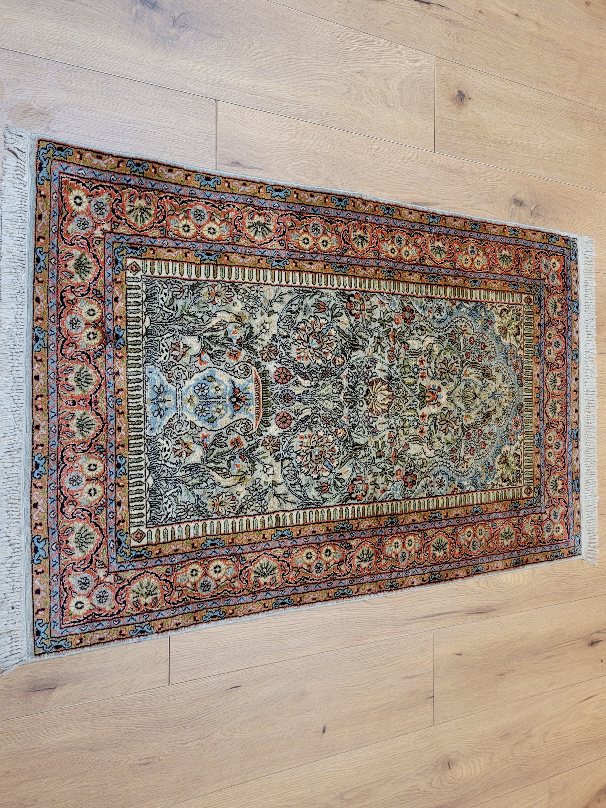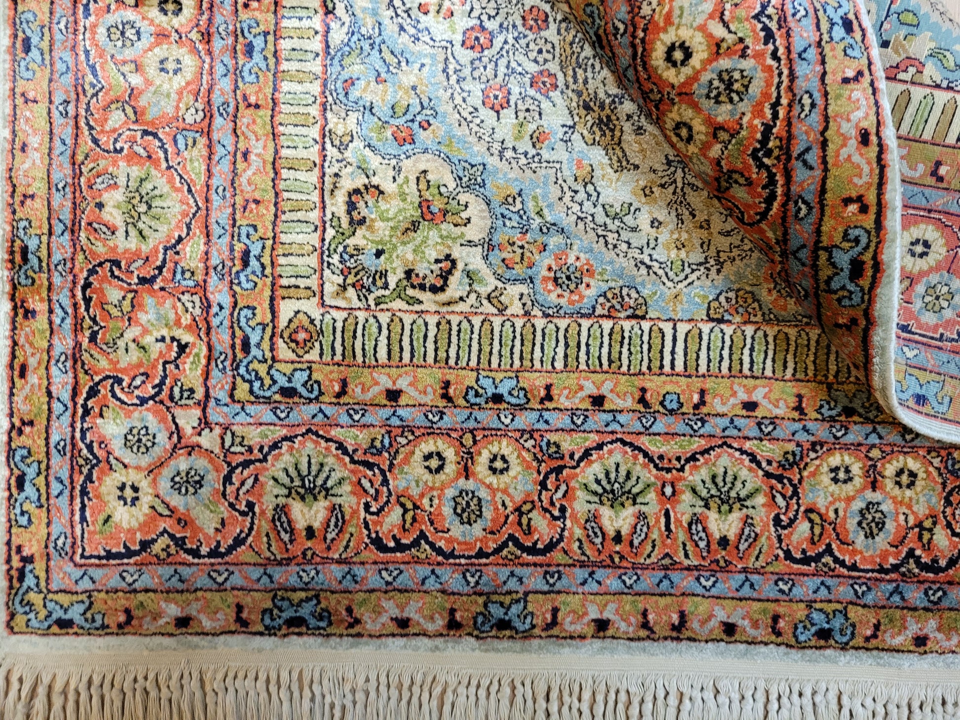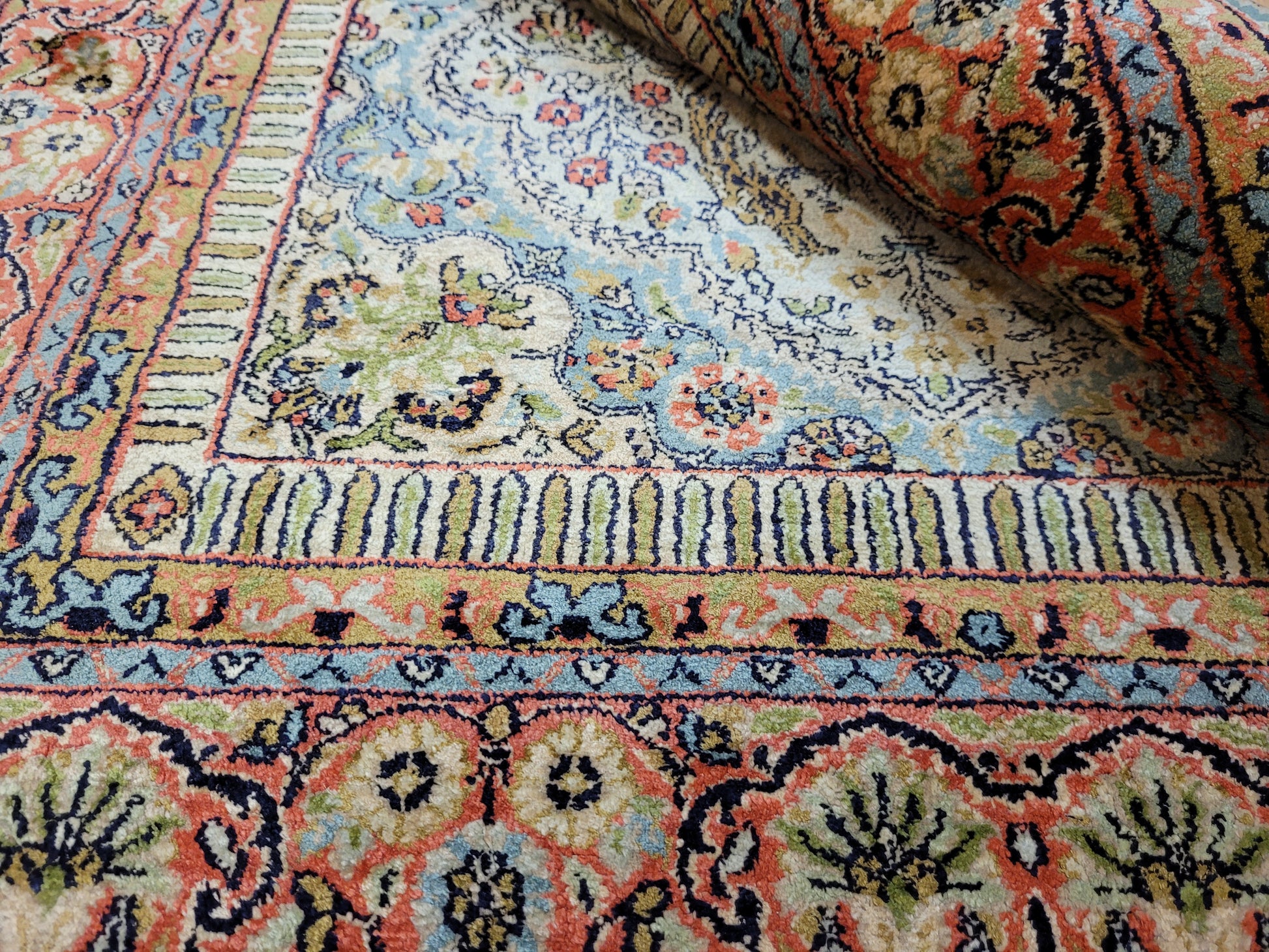 angeboten wird ein edler Ghom Teppich aus reiner Seide auf Seide, fein handgeknüpft in meisterlicher Ausführung. Das zentrale Motiv zeigt eine kunstvoll gestaltete Vase, aus der sich detailreiche Blütenranken symmetrisch entfalten. Die Farbgebung in Elfenbein, Blau, Zartrosa, Grün und Orange verleiht dem Teppich eine elegante Leuchtkraft. Eine prachtvolle Bordüre mit Blütenmedaillons auf rotem Grund rahmt die Komposition harmonisch ein.