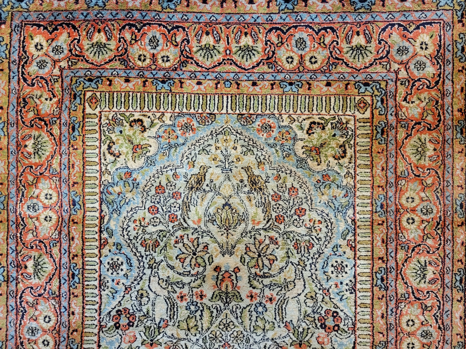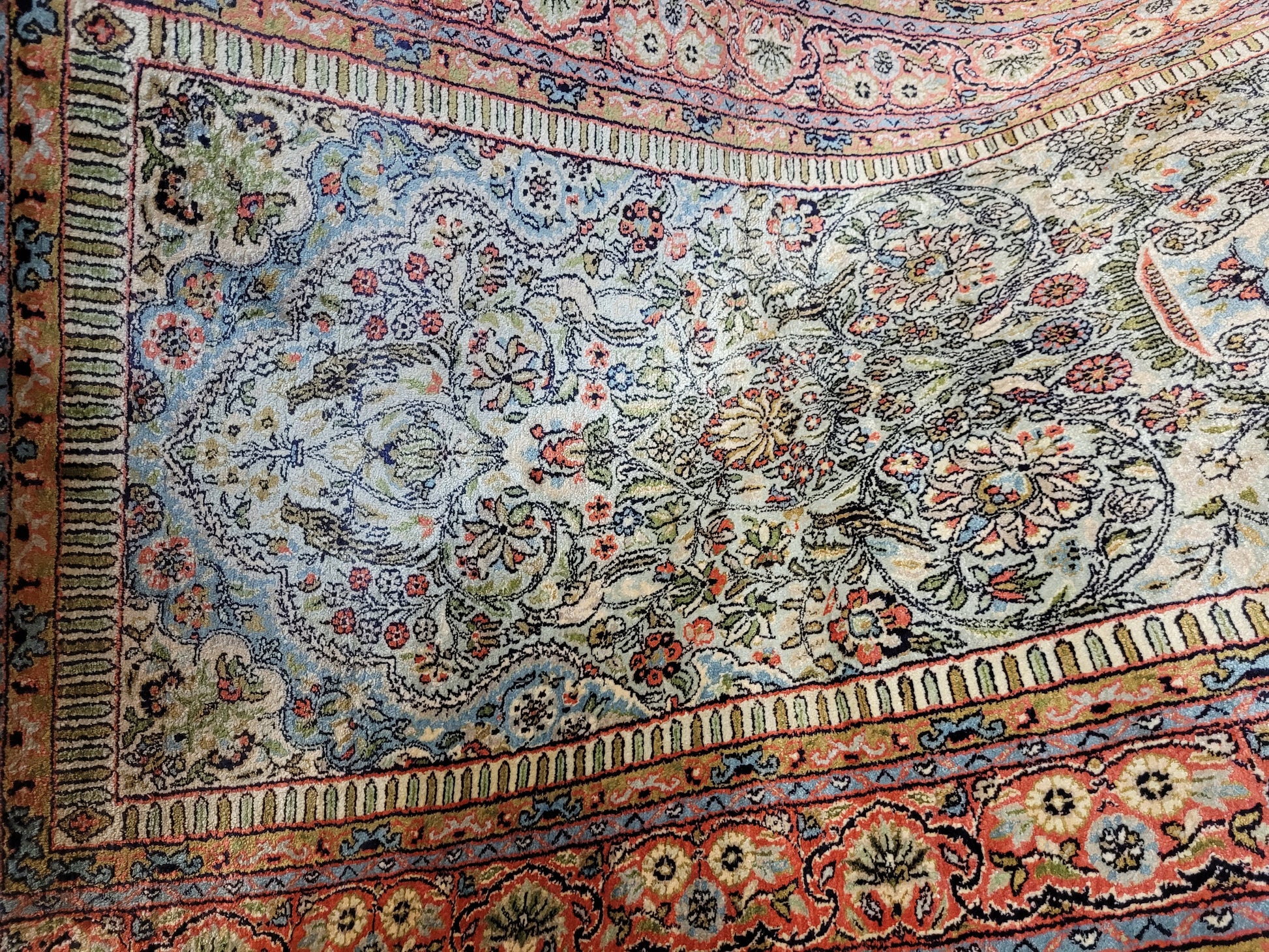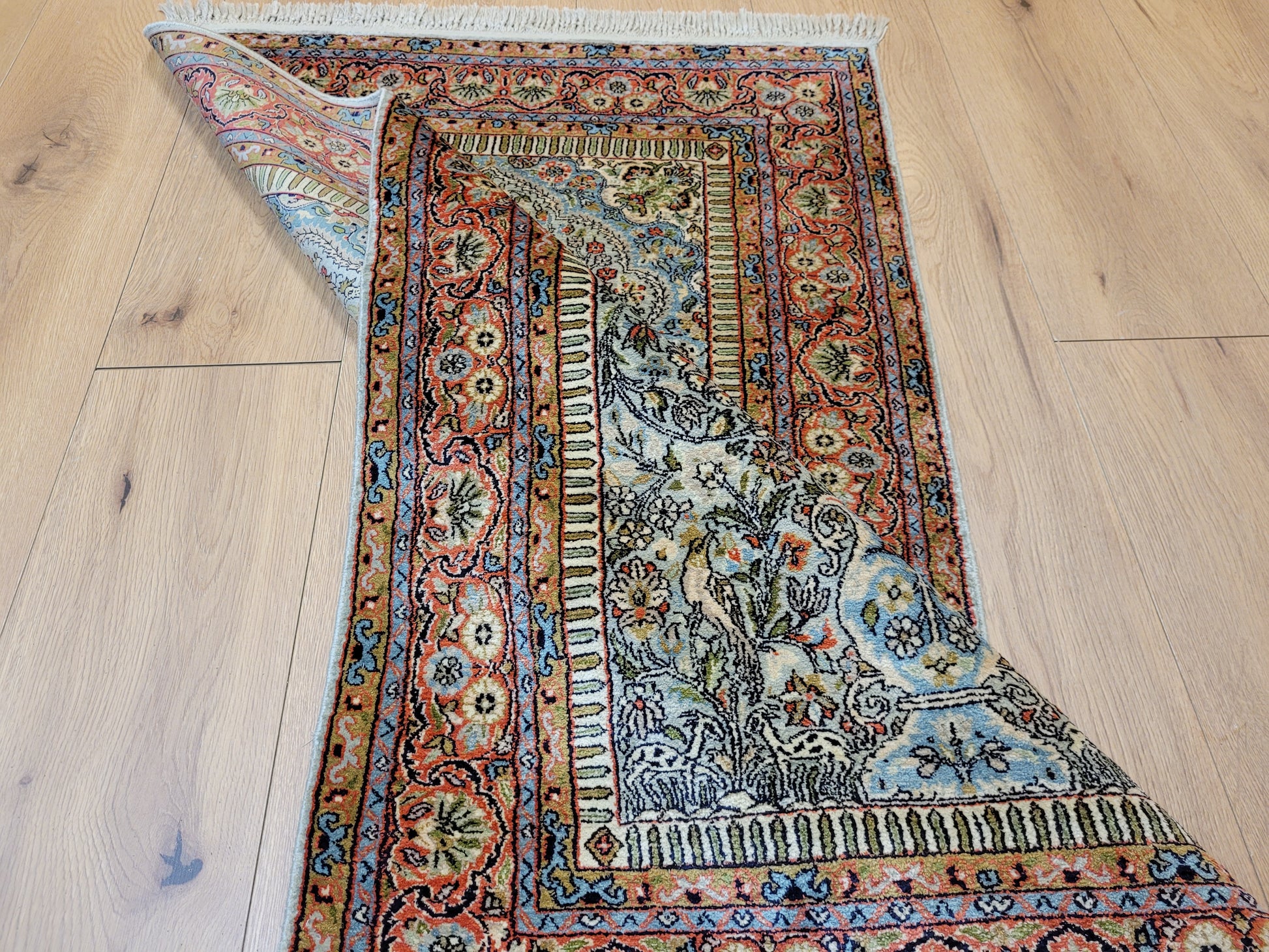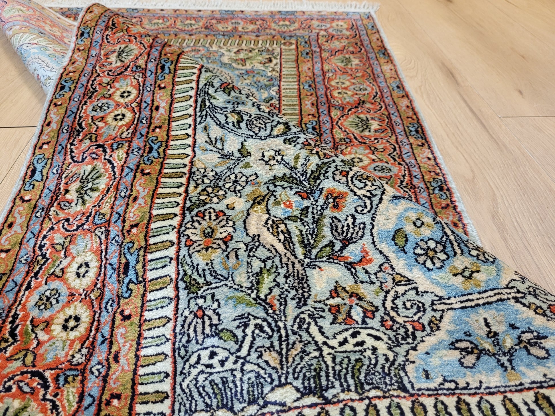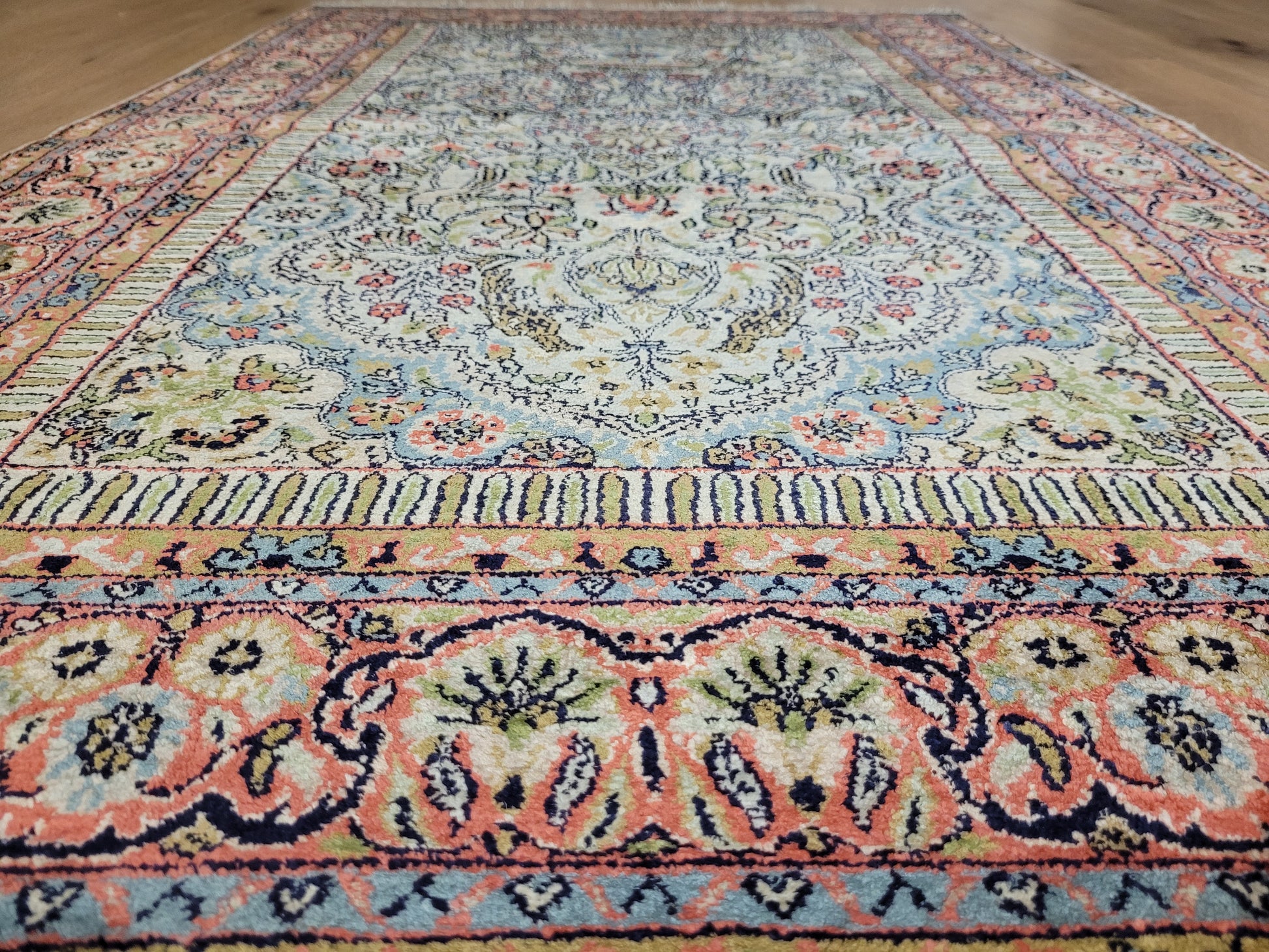 angeboten wird ein edler Ghom Teppich aus reiner Seide auf Seide, fein handgeknüpft in meisterlicher Ausführung. Das zentrale Motiv zeigt eine kunstvoll gestaltete Vase, aus der sich detailreiche Blütenranken symmetrisch entfalten. Die Farbgebung in Elfenbein, Blau, Zartrosa, Grün und Orange verleiht dem Teppich eine elegante Leuchtkraft. Eine prachtvolle Bordüre mit Blütenmedaillons auf rotem Grund rahmt die Komposition harmonisch ein.