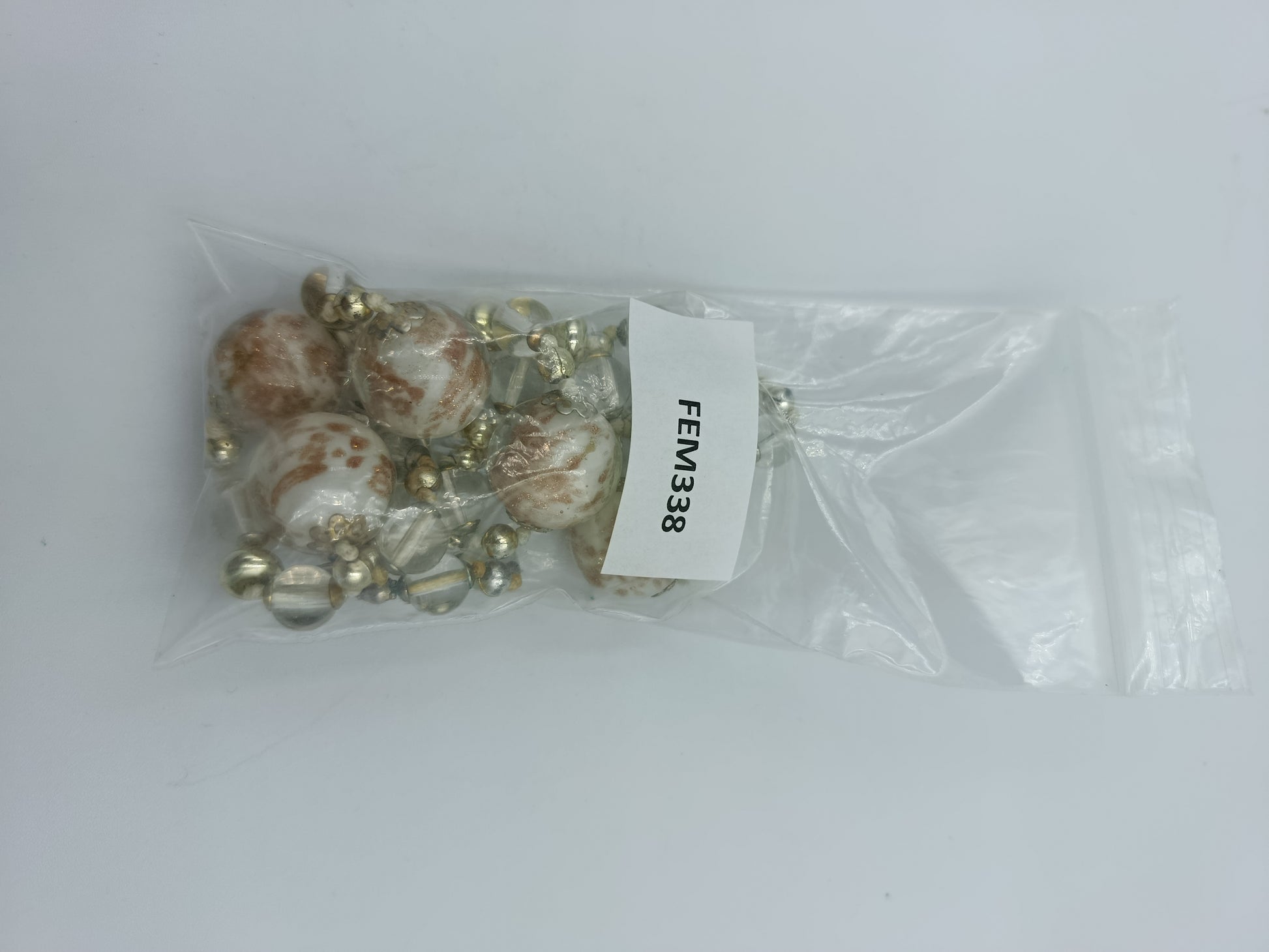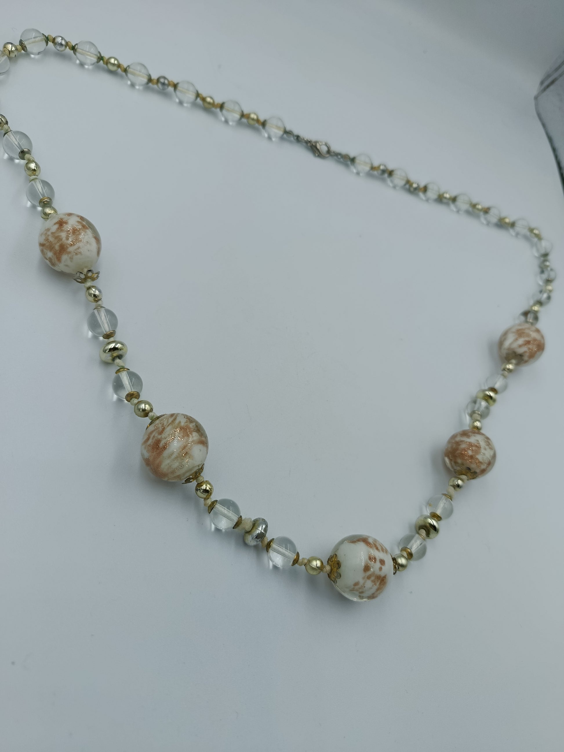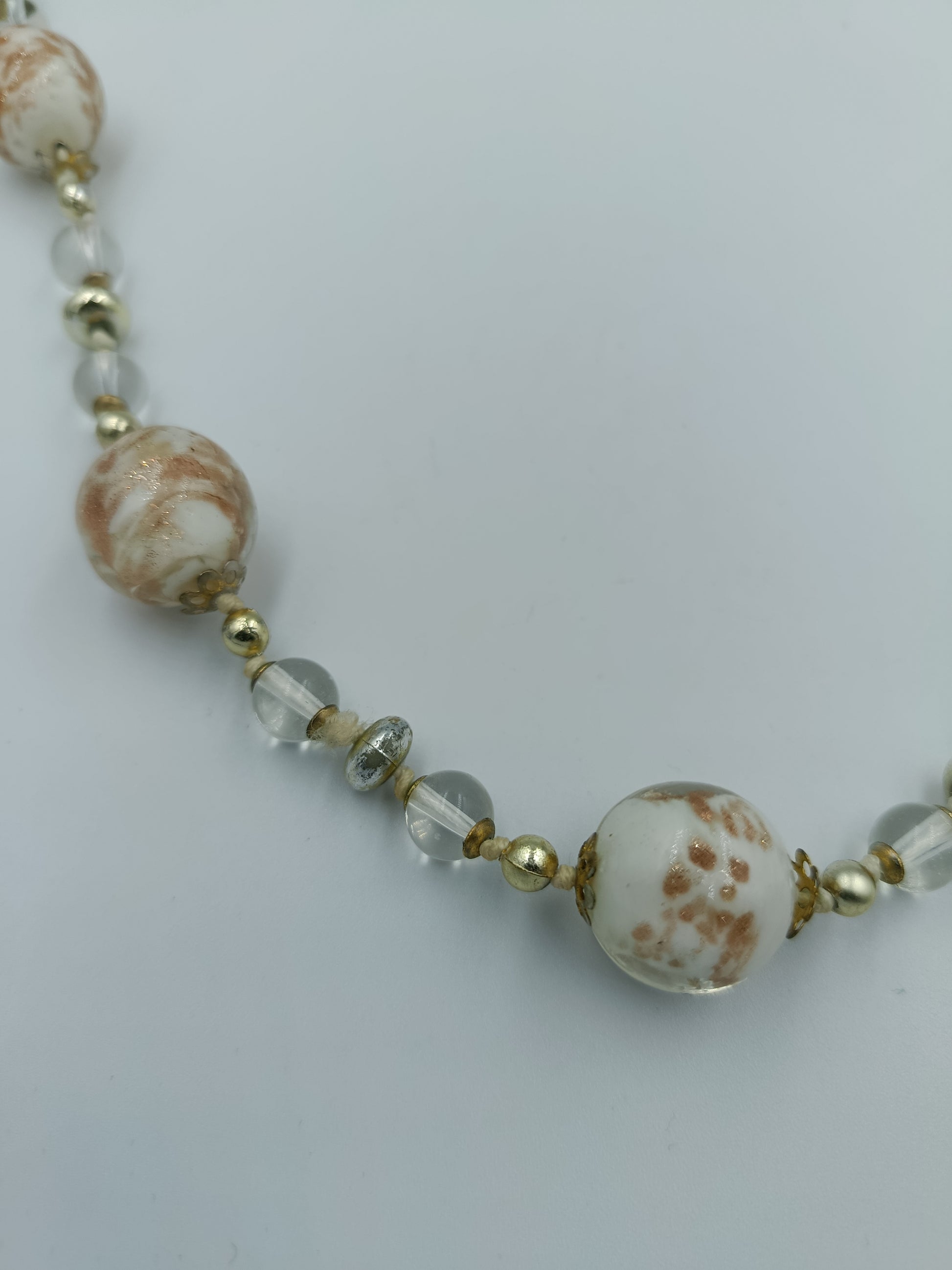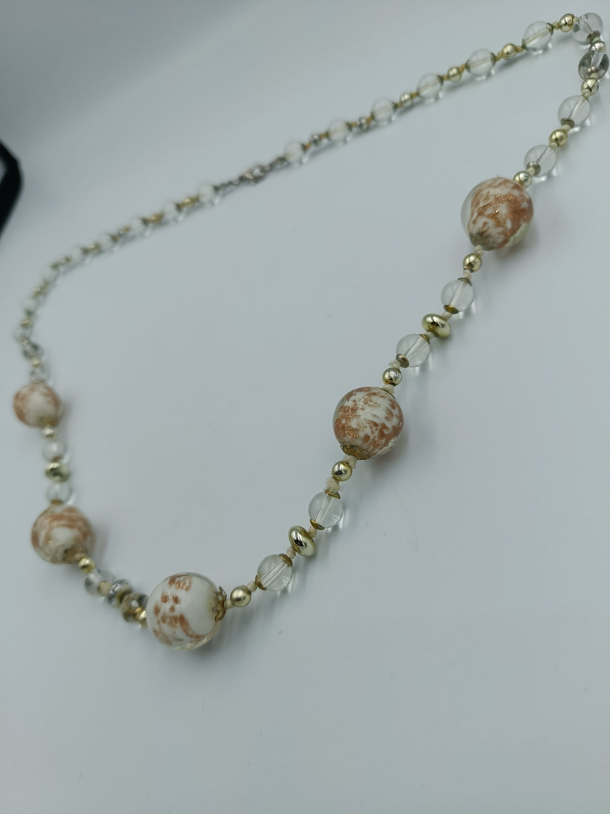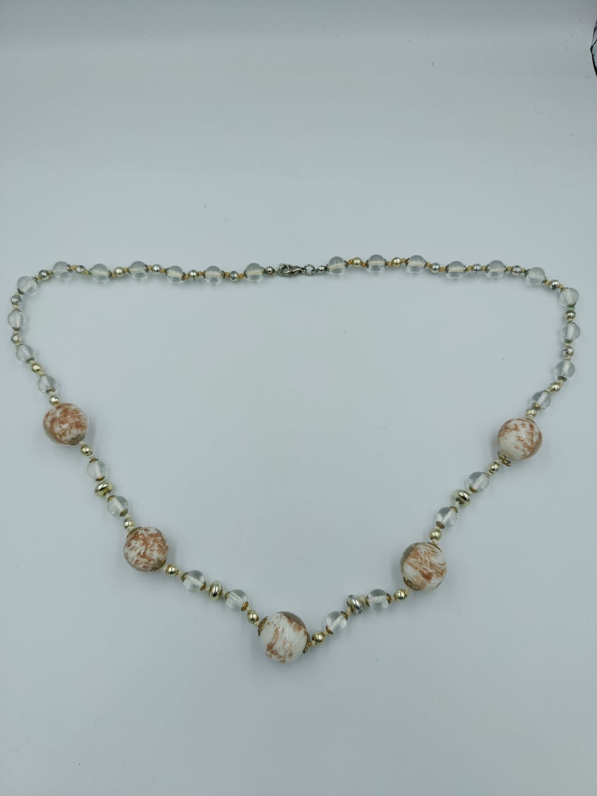 Eine elegante Halskette aus klaren, facettierten Glasperlen, kombiniert mit goldfarbenen Zierelementen und großen, marmorierten Perlen in Beige und Weiß. Die abwechslungsreiche Gestaltung macht dieses Stück zu einem interessanten Hingucker, der sich sowohl für den Alltag als auch für besondere Anlässe eignet.