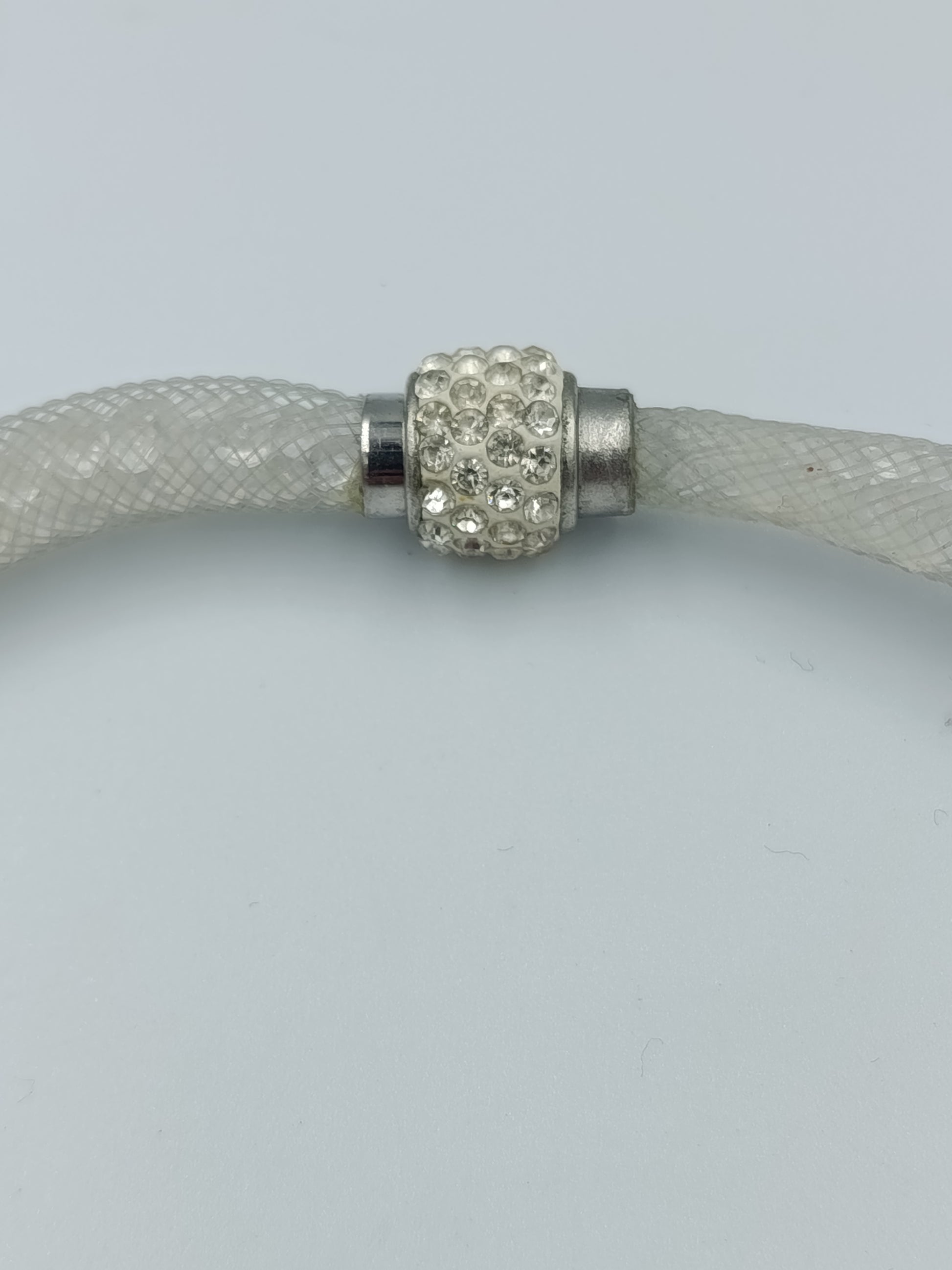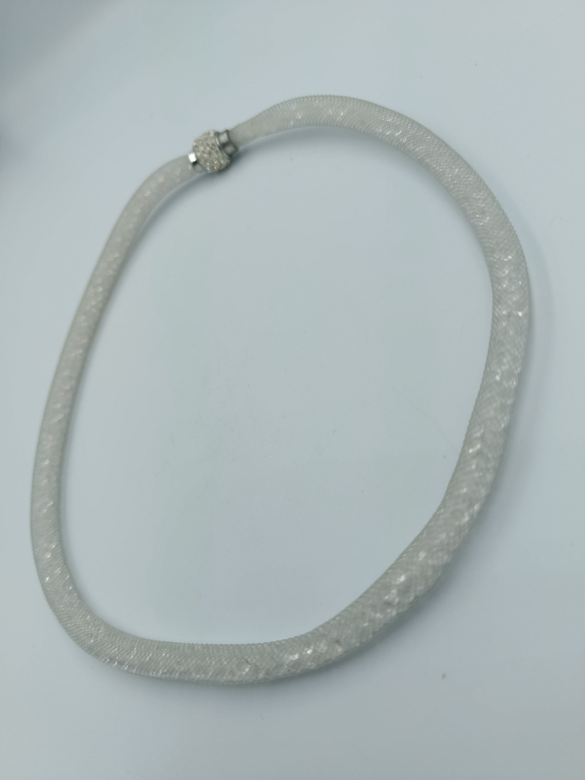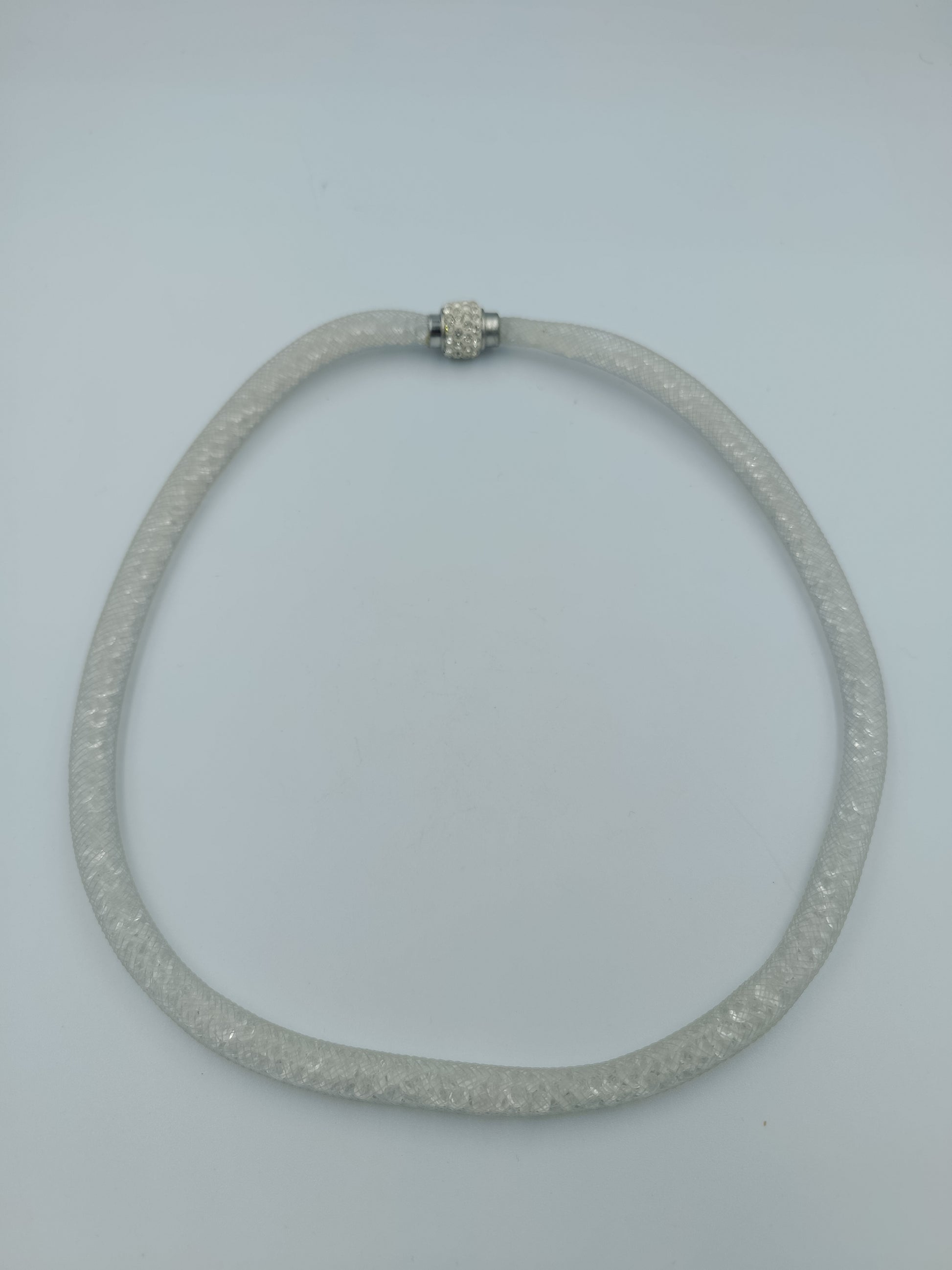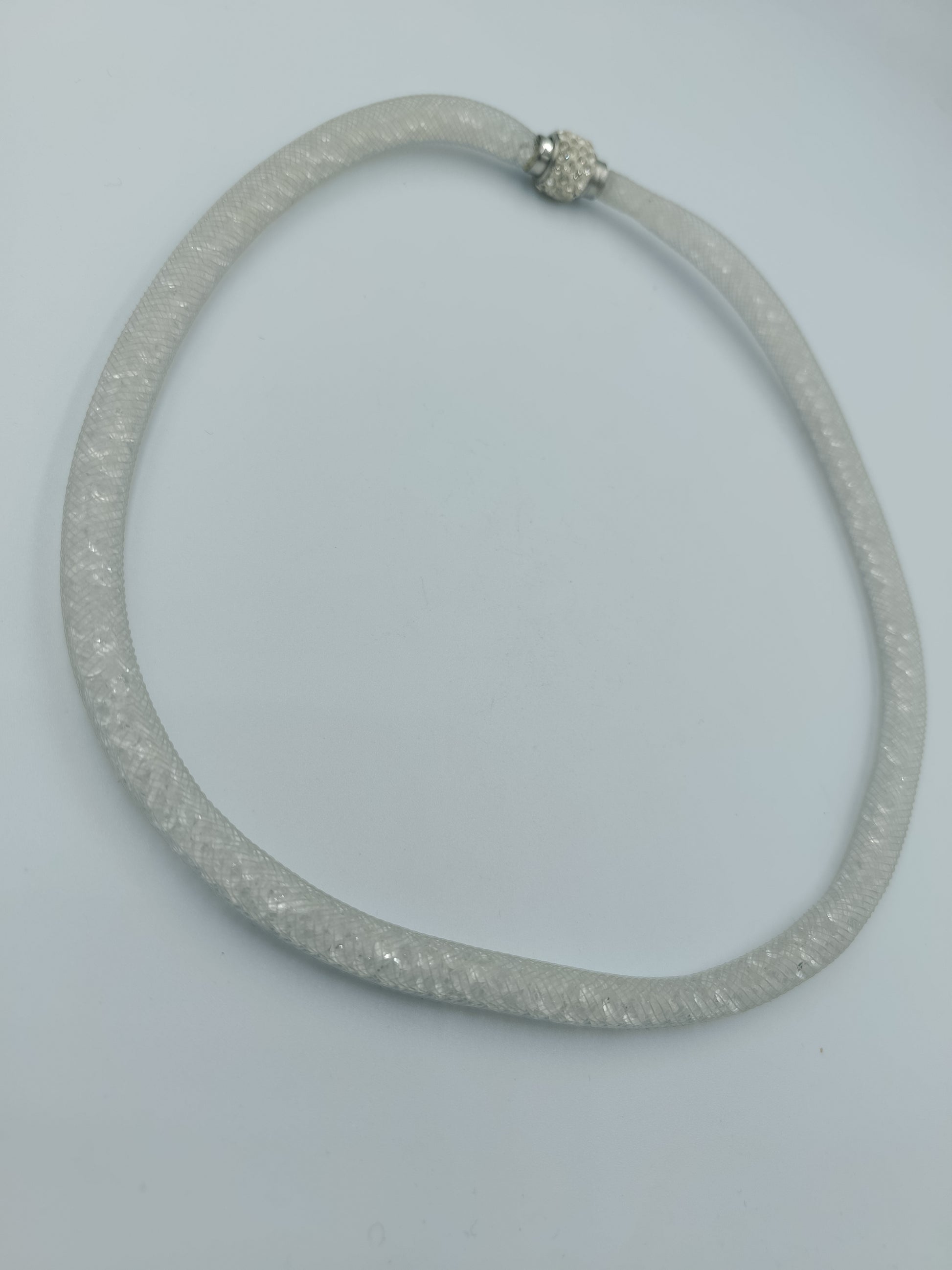 Elegante Halskette aus weißem Mesh-Schlauch, gefüllt mit funkelnden Glitzerpartikeln. Der Magnetverschluss ist mit klaren Strasssteinen besetzt und sorgt nicht nur für sicheren Halt, sondern auch für einen extra Hauch Glamour. Ideal für festliche Anlässe oder als edles Accessoire im Alltag.