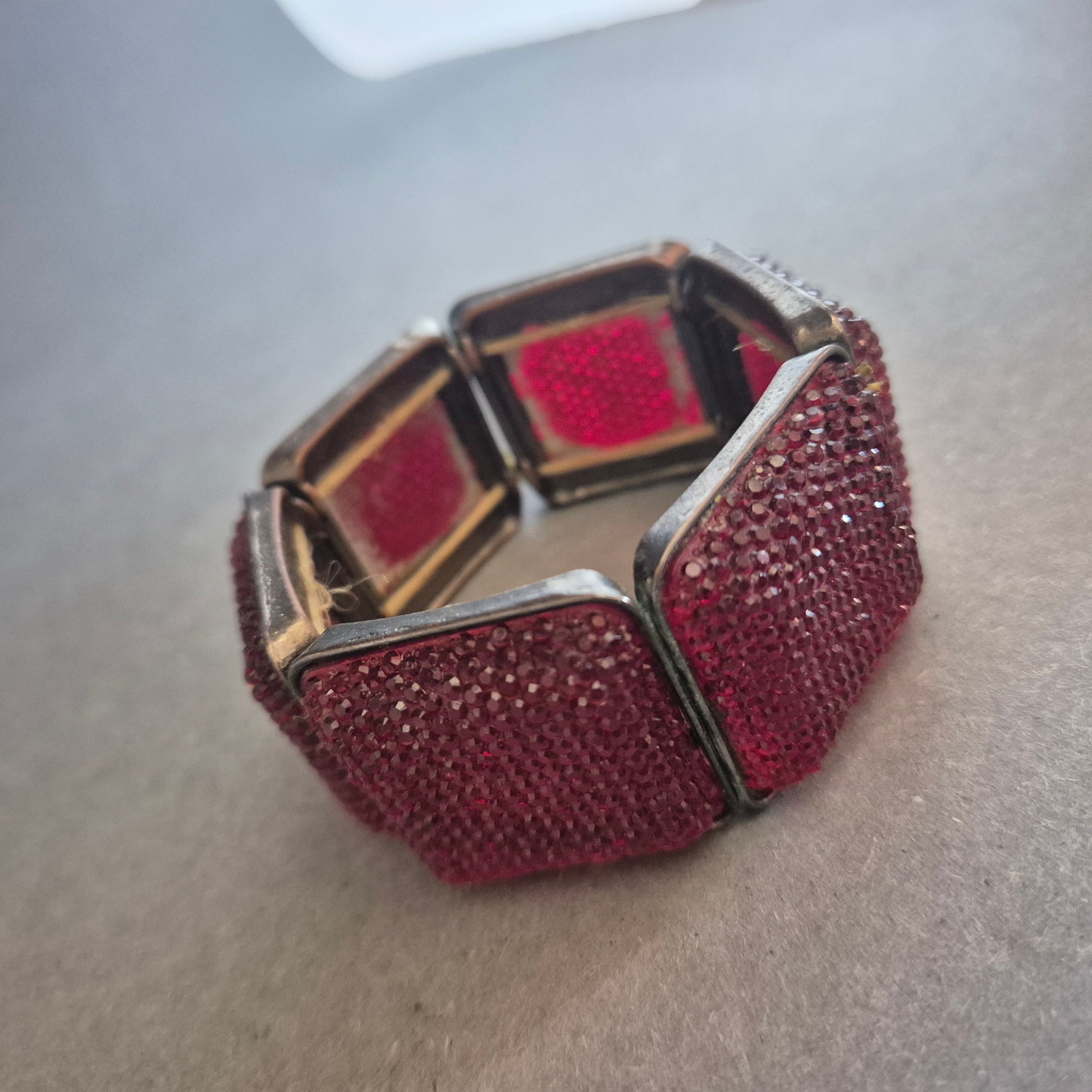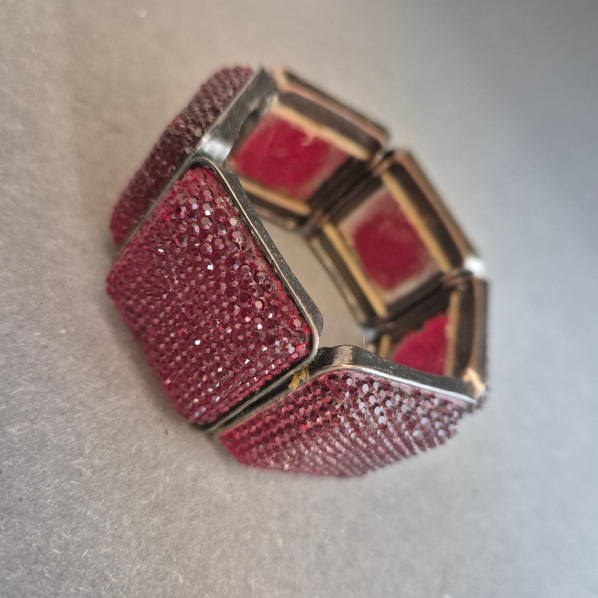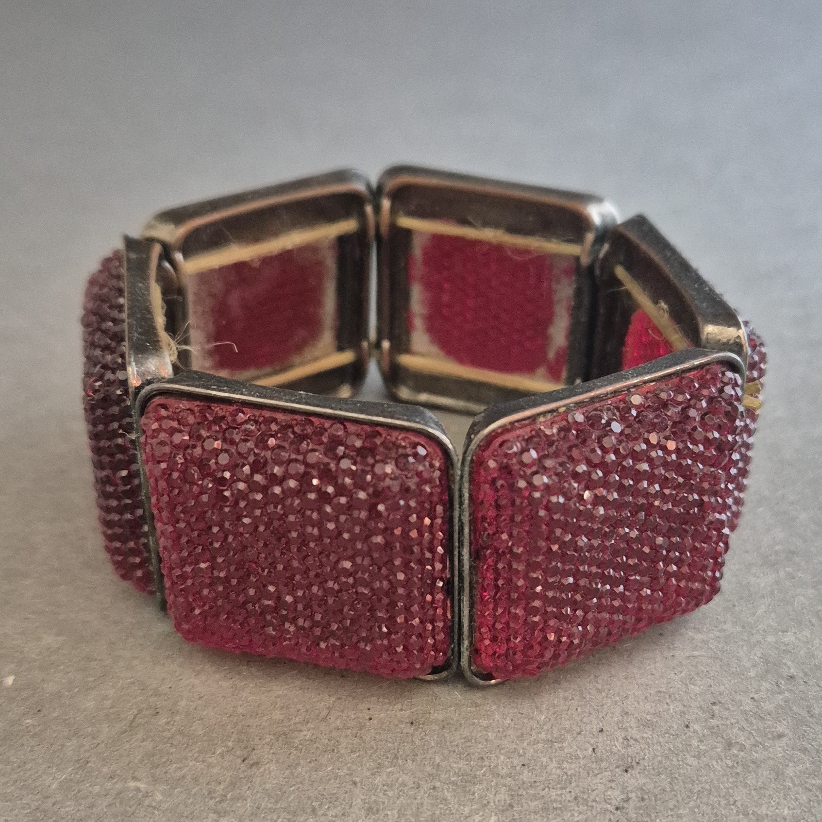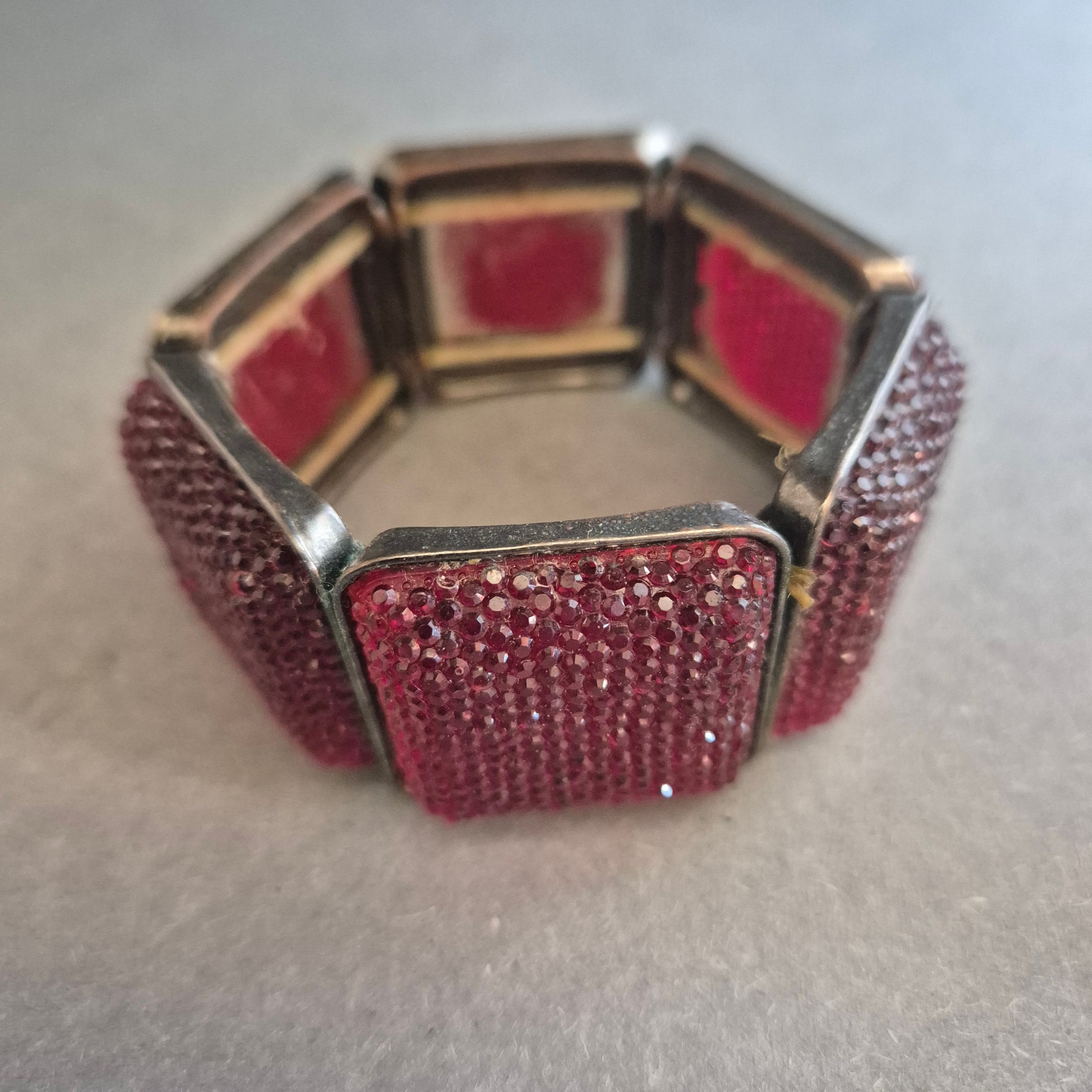 Dieses auffällige Stretcharmband begeistert mit seinen großen, dunkelroten Elementen, die dicht mit glitzernden Strasssteinchen besetzt sind. Die quadratische Form und das elastische Band sorgen für einen markanten Look und hohen Tragekomfort. Ein glamouröses Accessoire für Abendveranstaltungen, Partys oder besondere Auftritte mit Stil.