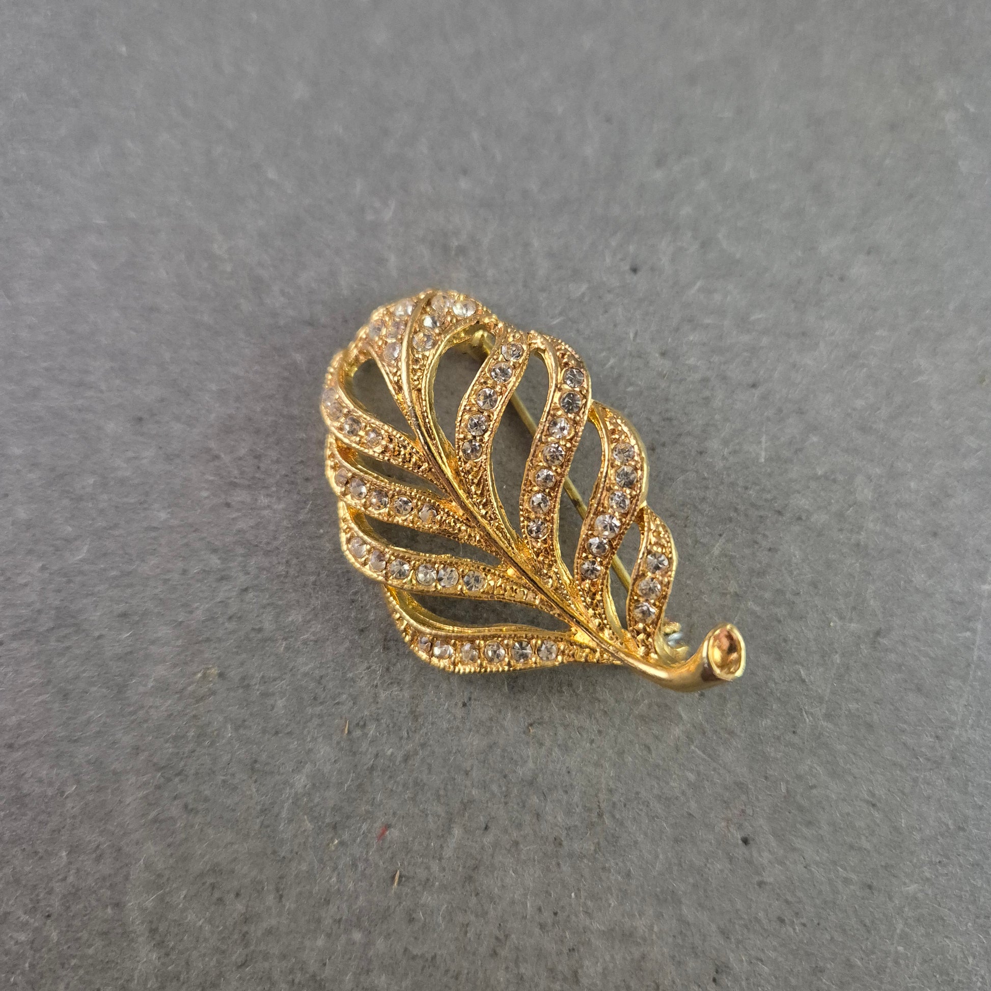 Diese goldfarbene Vintage-Brosche in stilisierter Blattform besticht durch ihre detailreiche Gestaltung und die edle Verzierung mit zahlreichen klaren Strasssteinen. Die elegante, geschwungene Form verleiht der Brosche eine natürliche Leichtigkeit, während die funkelnden Akzente ihr einen Hauch Glamour verleihen. Ideal als eleganter Hingucker an Blusen, Mänteln oder Tüchern.