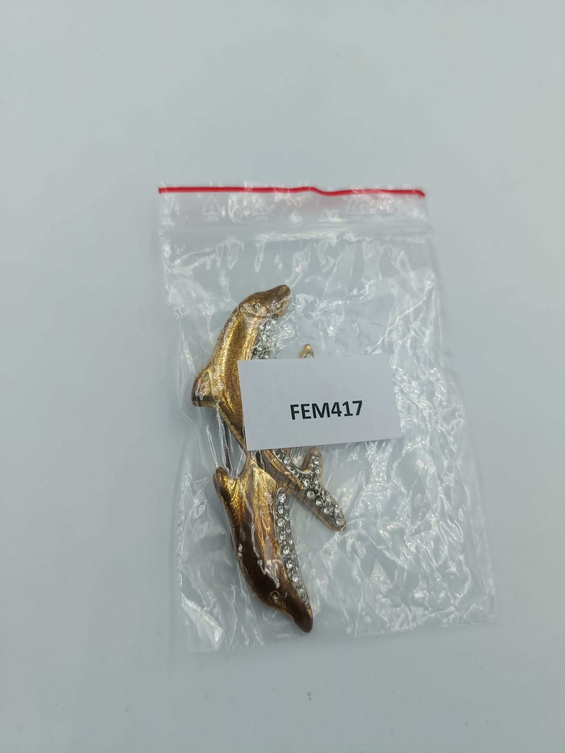 Elegante und detailreich gestaltete Brosche in Form von zwei springenden Delfinen. Die Oberfläche ist goldfarben veredelt und mit funkelnden Strasssteinen besetzt, die der Brosche einen strahlenden Glanz verleihen.