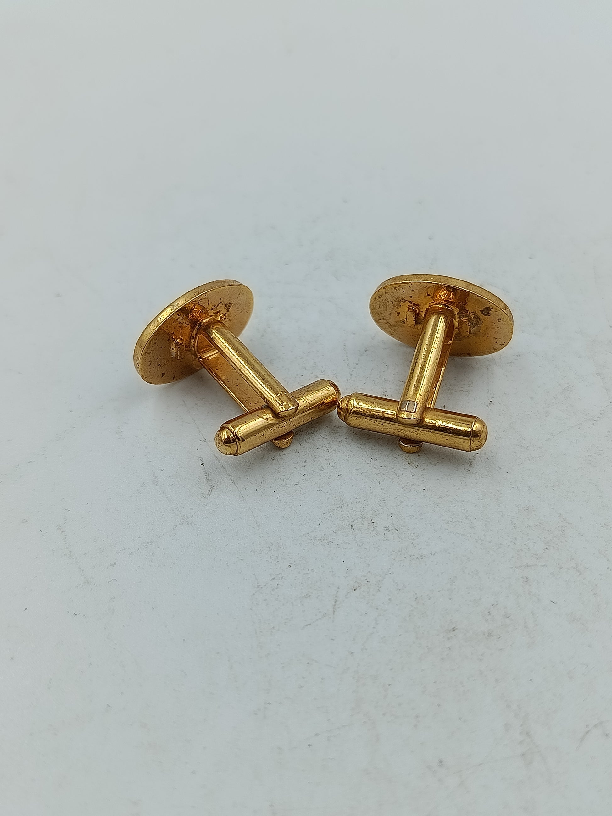 Elegante Manschettenknöpfe in goldfarbener Ausführung mit ovaler Form und grünem Emaille Einsatz. Das feine Motiv verleiht den Knöpfen eine stilvolle und zeitlose Ausstrahlung. Die hochwertige Verarbeitung macht dieses Paar zu einem passenden Accessoire für formelle Anlässe oder für Liebhaber klassischer Herrenmode. Ideal auch als Sammlerstück geeignet.