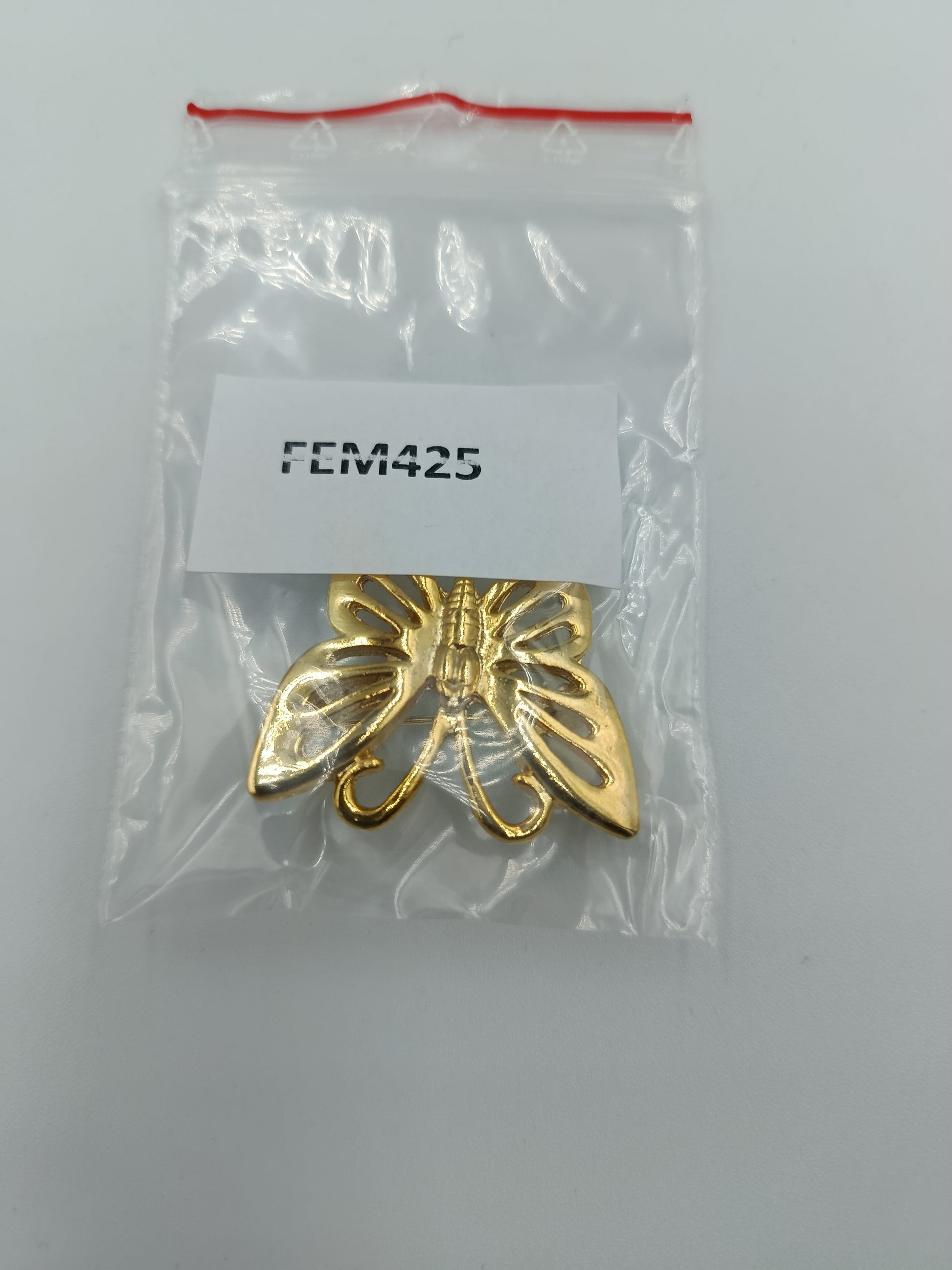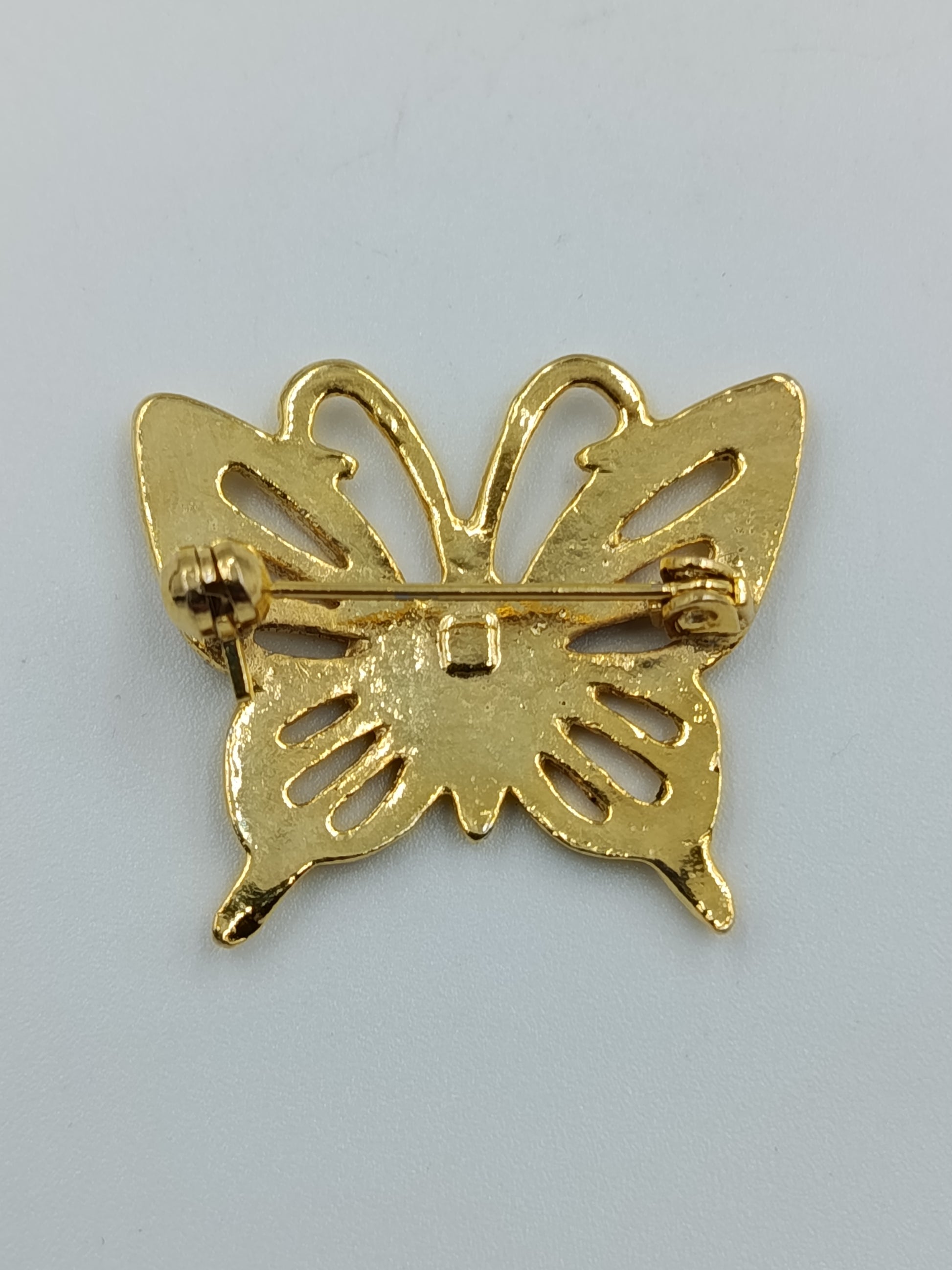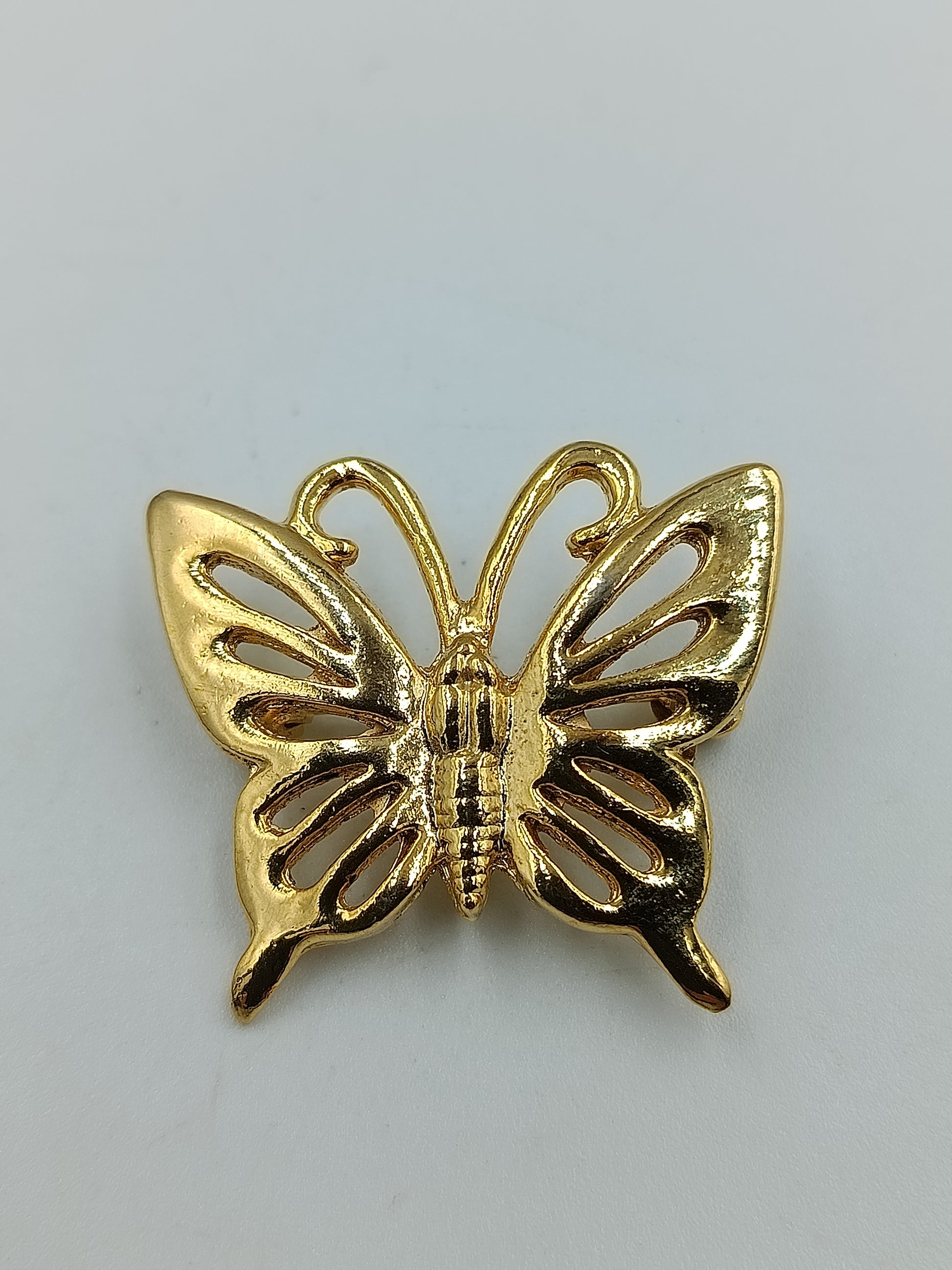 Elegante Brosche in Schmetterlingsform, gefertigt aus goldfarbenem Metall. Die Flügel sind mit filigranen Aussparungen gestaltet, die der Brosche eine luftige und edle Optik verleihen. Ein zeitlos schönes Accessoire, das sich ideal an Blusen, Jacken oder Schals tragen lässt.