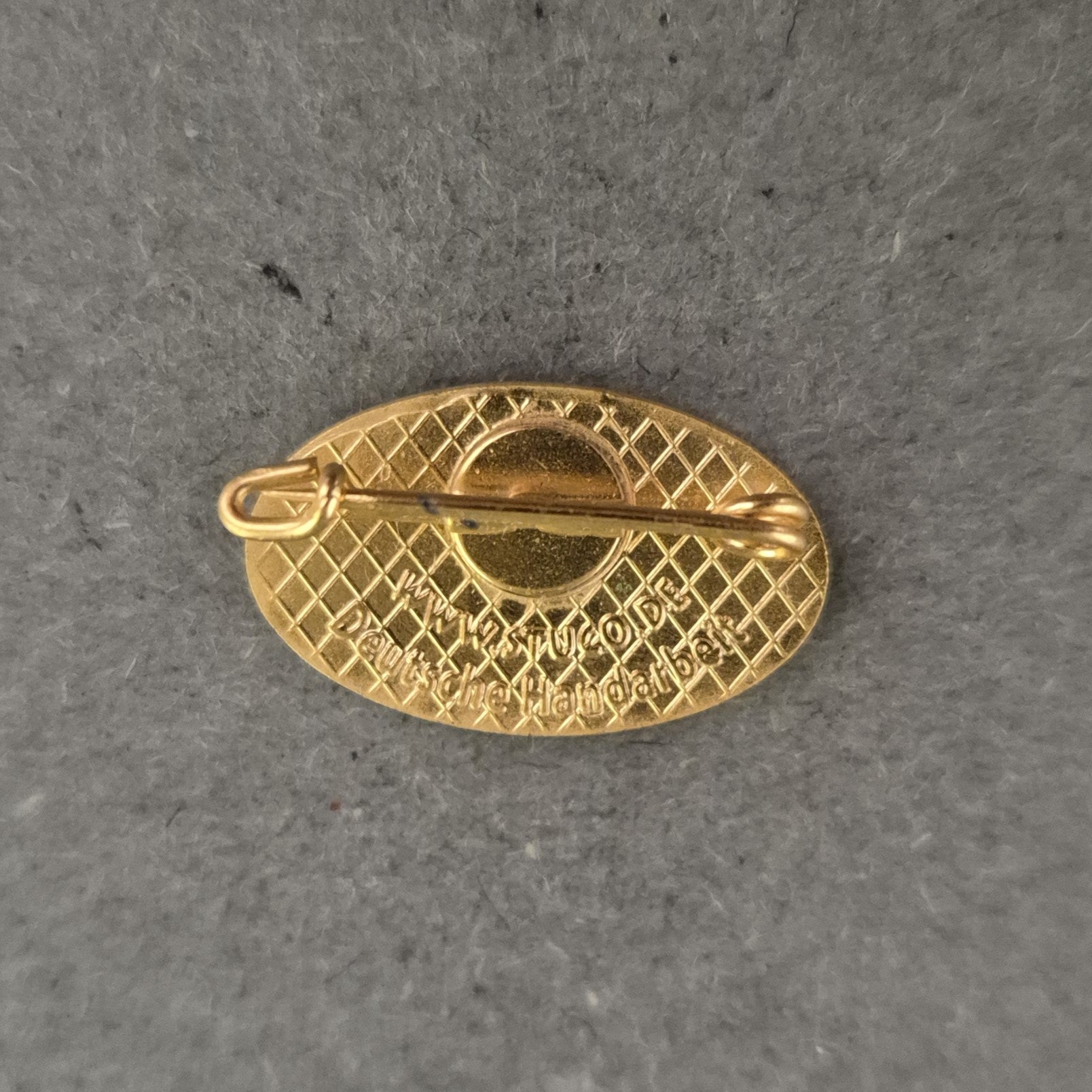 Dieser elegante, ovalförmige Pin in goldfarbener Ausführung wurde zur Feier eines 60-jährigen Jubiläums gefertigt. Mit einem stilisierten, erhabenen Logo auf der Vorderseite und der schlichten Zahl „60“ eignet sich dieser Anstecker ideal als Erinnerungsstück, Sammlerobjekt oder dekoratives Accessoire für offizielle Anlässe.