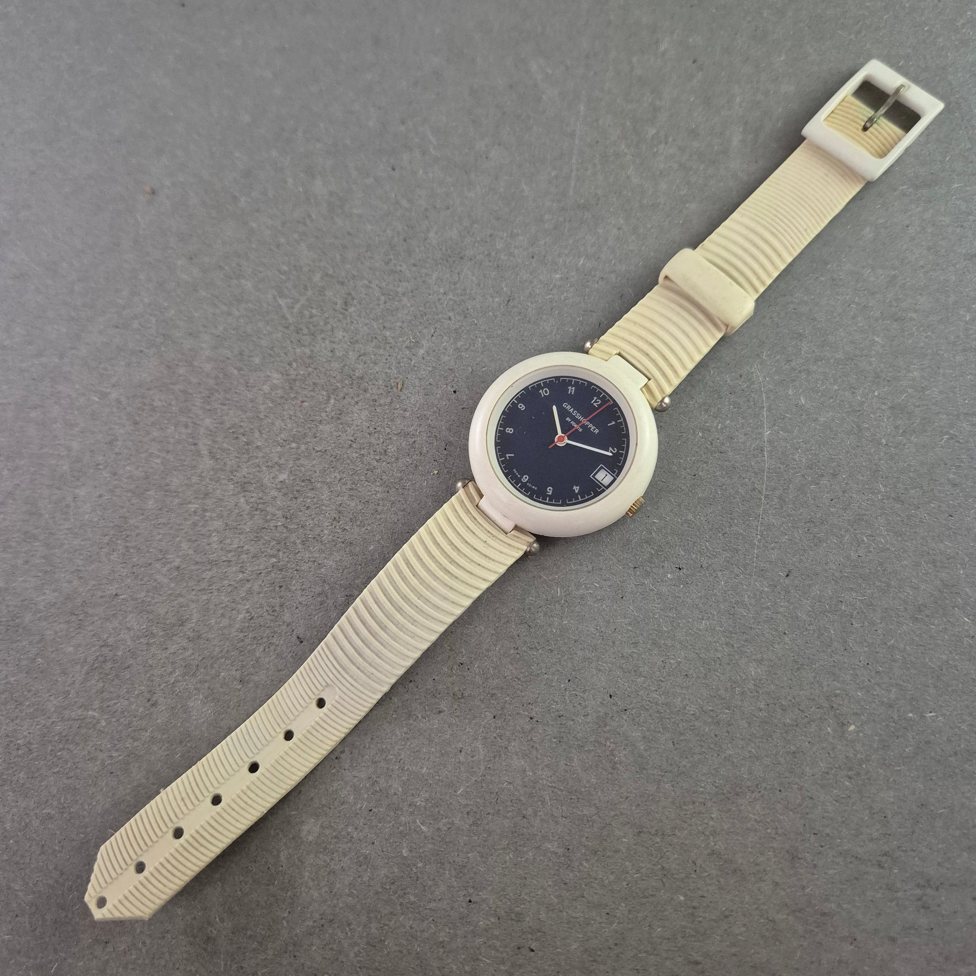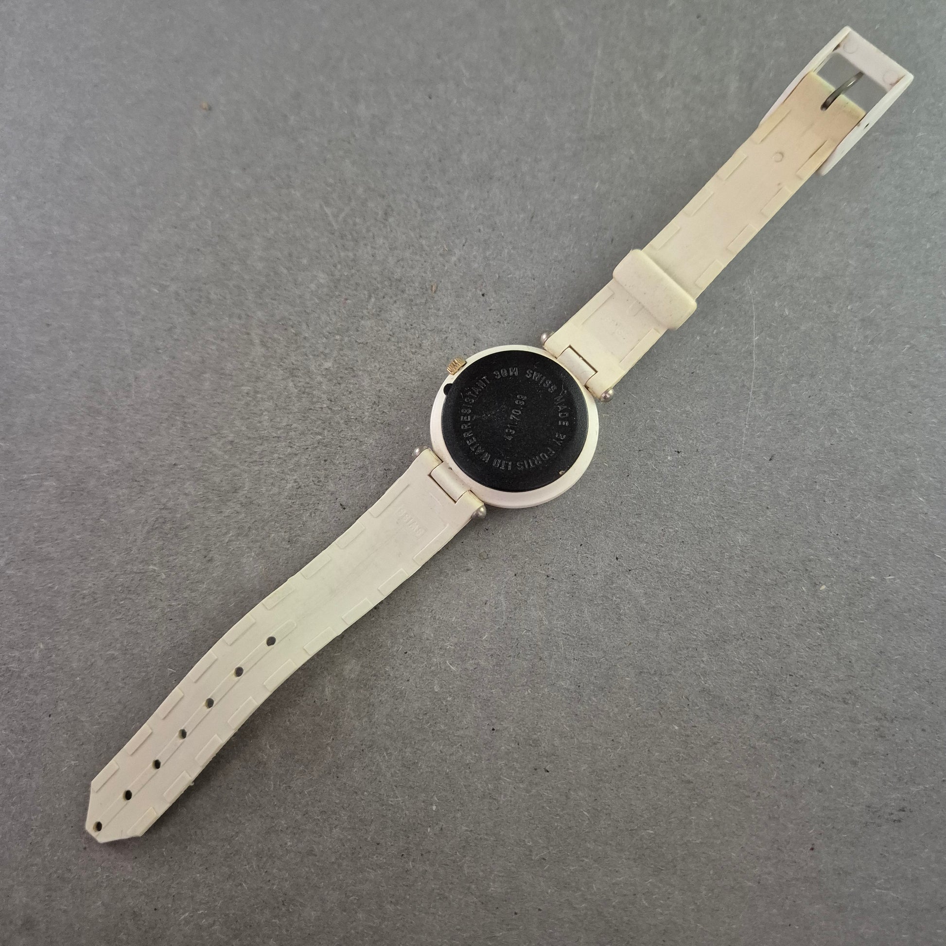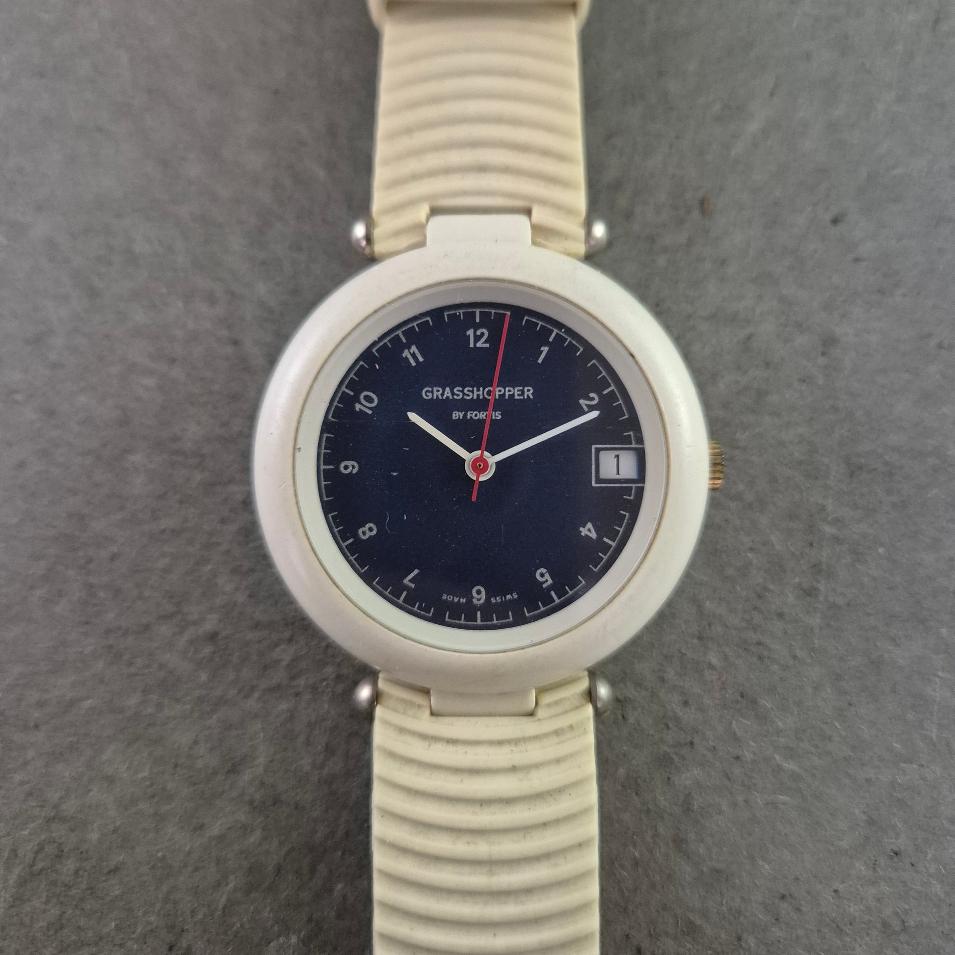 Diese Grasshopper Damen Uhr von Fortis ist ein echtes Sammlerstück mit markantem Retro-Design. Das weiße Kunststoffgehäuse verleiht der Uhr einen sportlich-leichten Charakter, während das schwarze Zifferblatt mit weißen Ziffern und rotem Sekundenzeiger für eine klare Ablesbarkeit sorgt. Besonders hervorzuheben ist die Datumsanzeige auf der 3-Uhr-Position. Ein seltenes Modell, das Swiss Made Qualität mit außergewöhnlichem Design kombiniert.