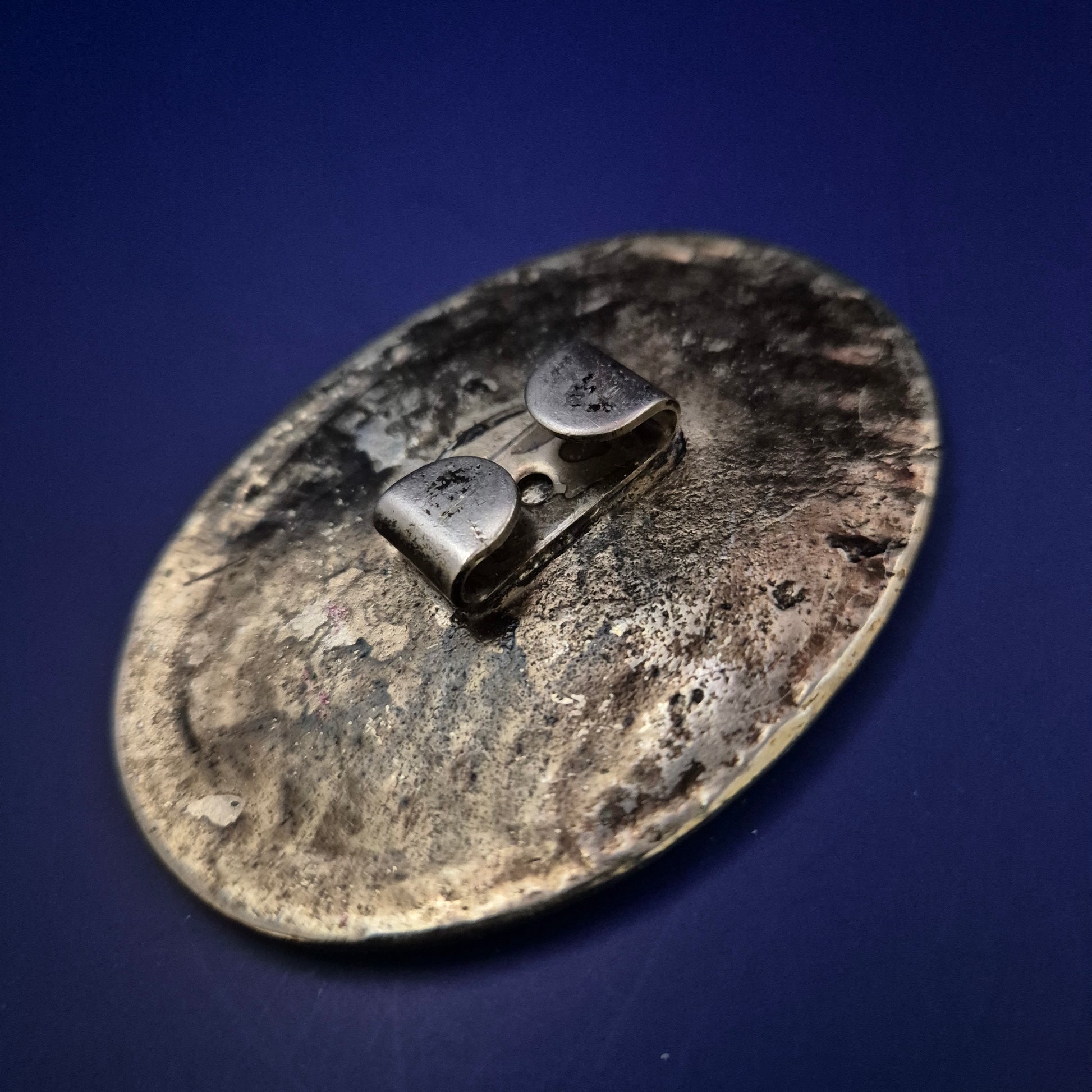 Diese auffällige, ovale Vintage Brosche begeistert mit zwei schimmernden Abalone-Steinen, umgeben von filigranen Gravuren, Strasssteinen und Perl-Imitationen. Das antik-silberne Finish verleiht dem Stück einen besonders edlen und historischen Charakter – perfekt für Liebhaber ausgefallener Schmuckstücke mit Ausdruck.