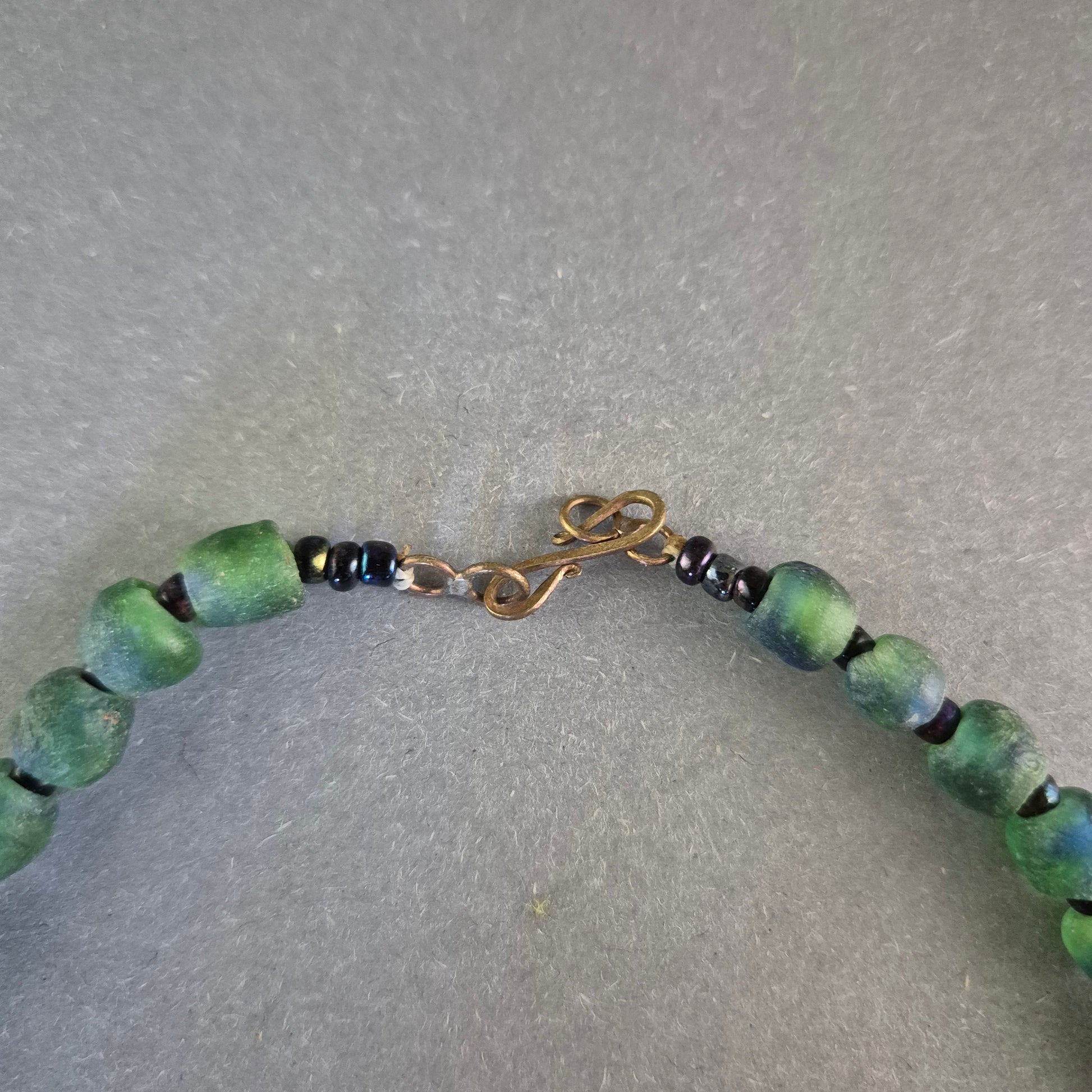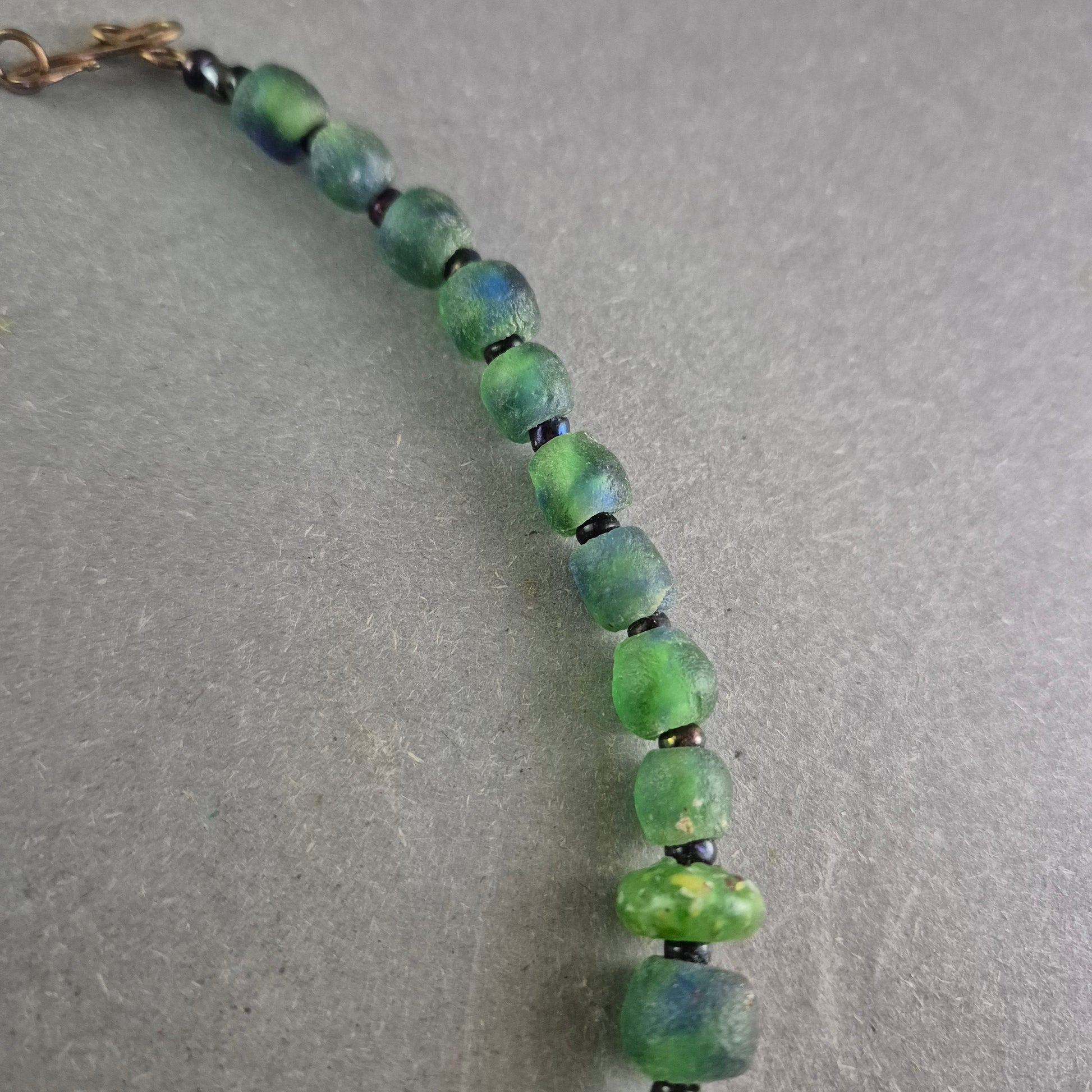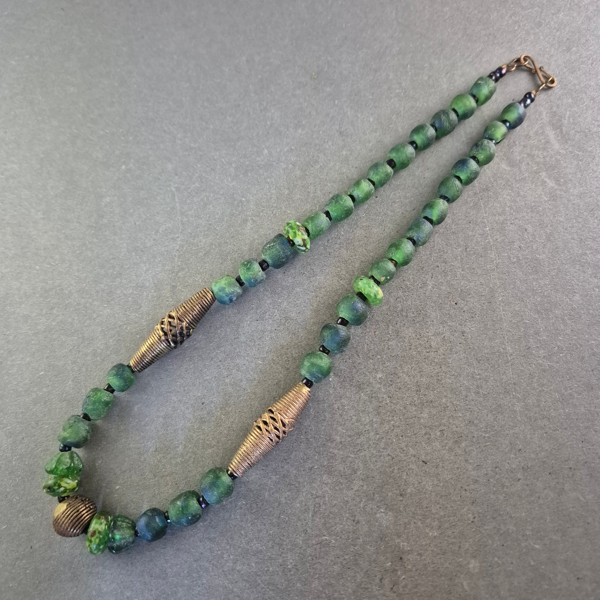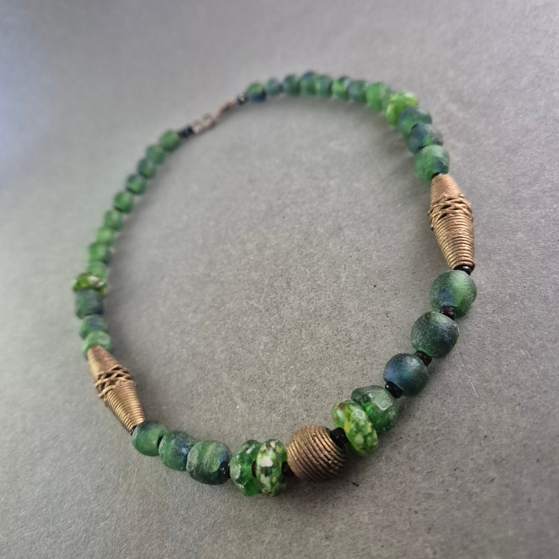 Diese Ethno-inspirierte Halskette verbindet rustikalen Charme mit handwerklicher Kunst. Die grün schimmernden Glasperlen mit unterschiedlichen Strukturen und Formen verleihen der Kette eine natürliche Lebendigkeit. Akzente setzen handgearbeitete Messingelemente, die dem Schmuckstück einen Hauch afrikanischer oder asiatischer Tradition verleihen.
