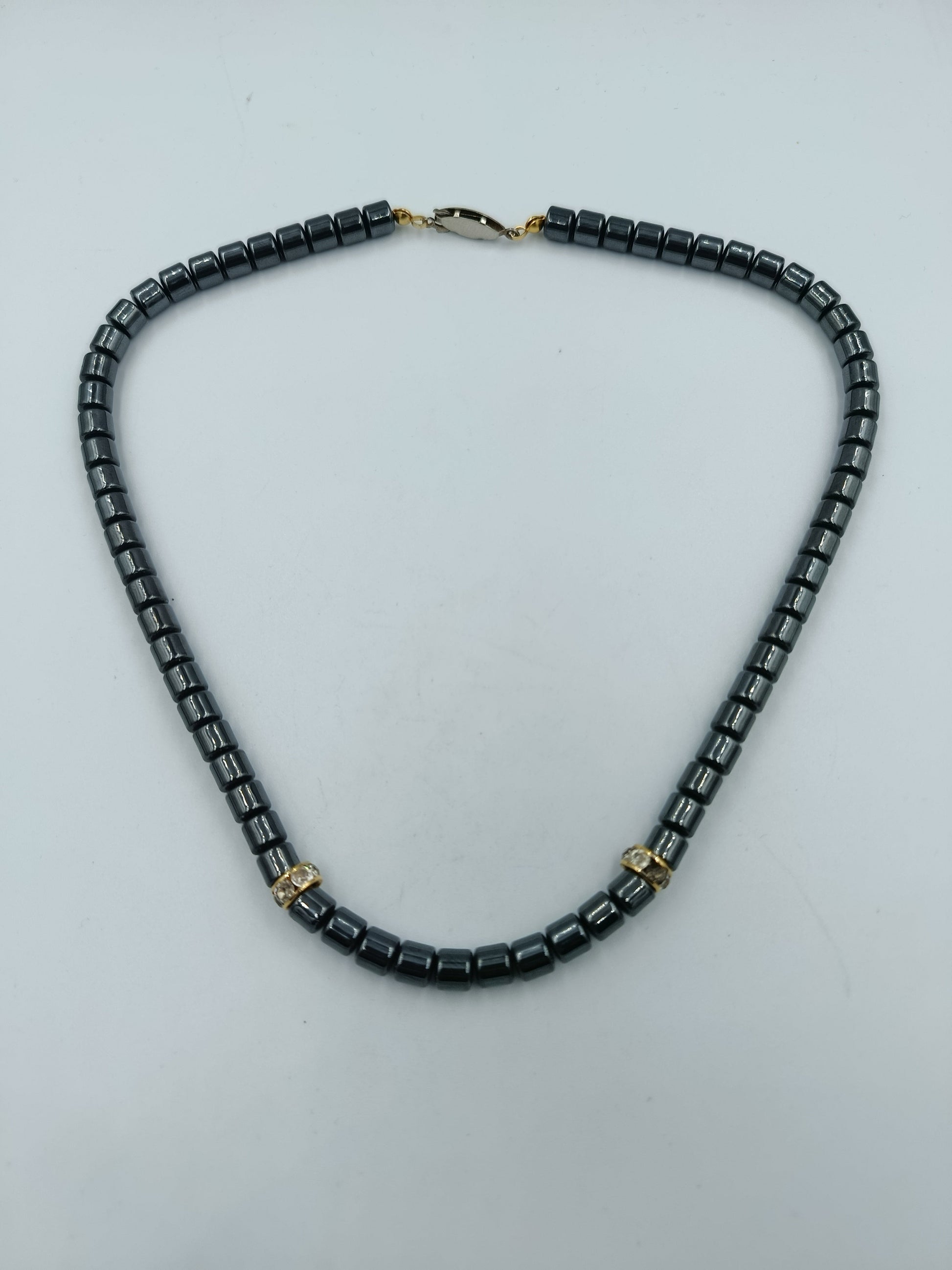 Stilvolle Vintage-Halskette aus glänzenden Hämatitwürfeln, die durch ihre glatte, dunkelgraue Oberfläche einen modernen und zugleich eleganten Look erhalten. Zwei goldfarbene Zwischenelemente mit Strassbesatz setzen funkelnde Akzente und lockern das gleichmäßige Design auf.