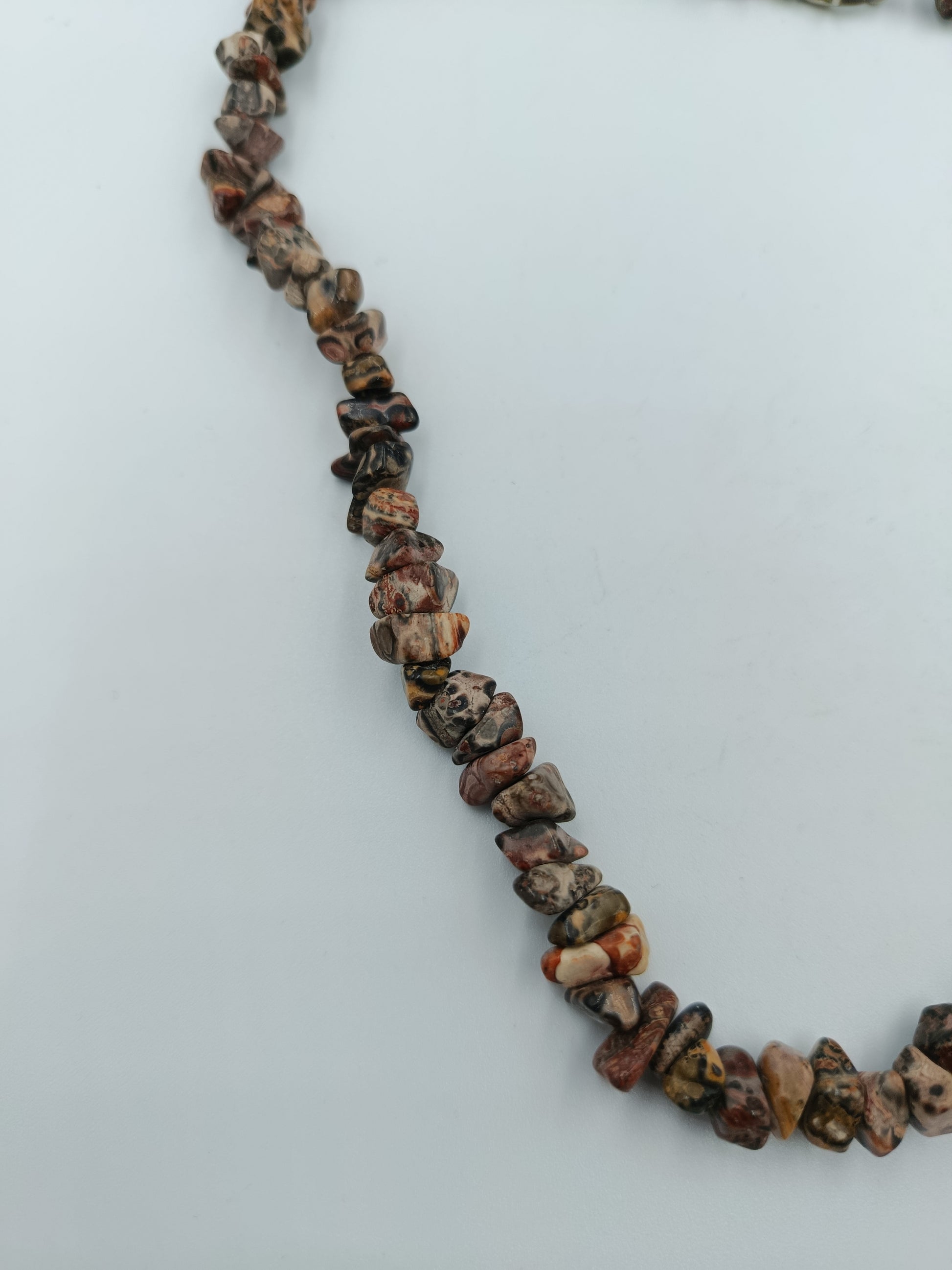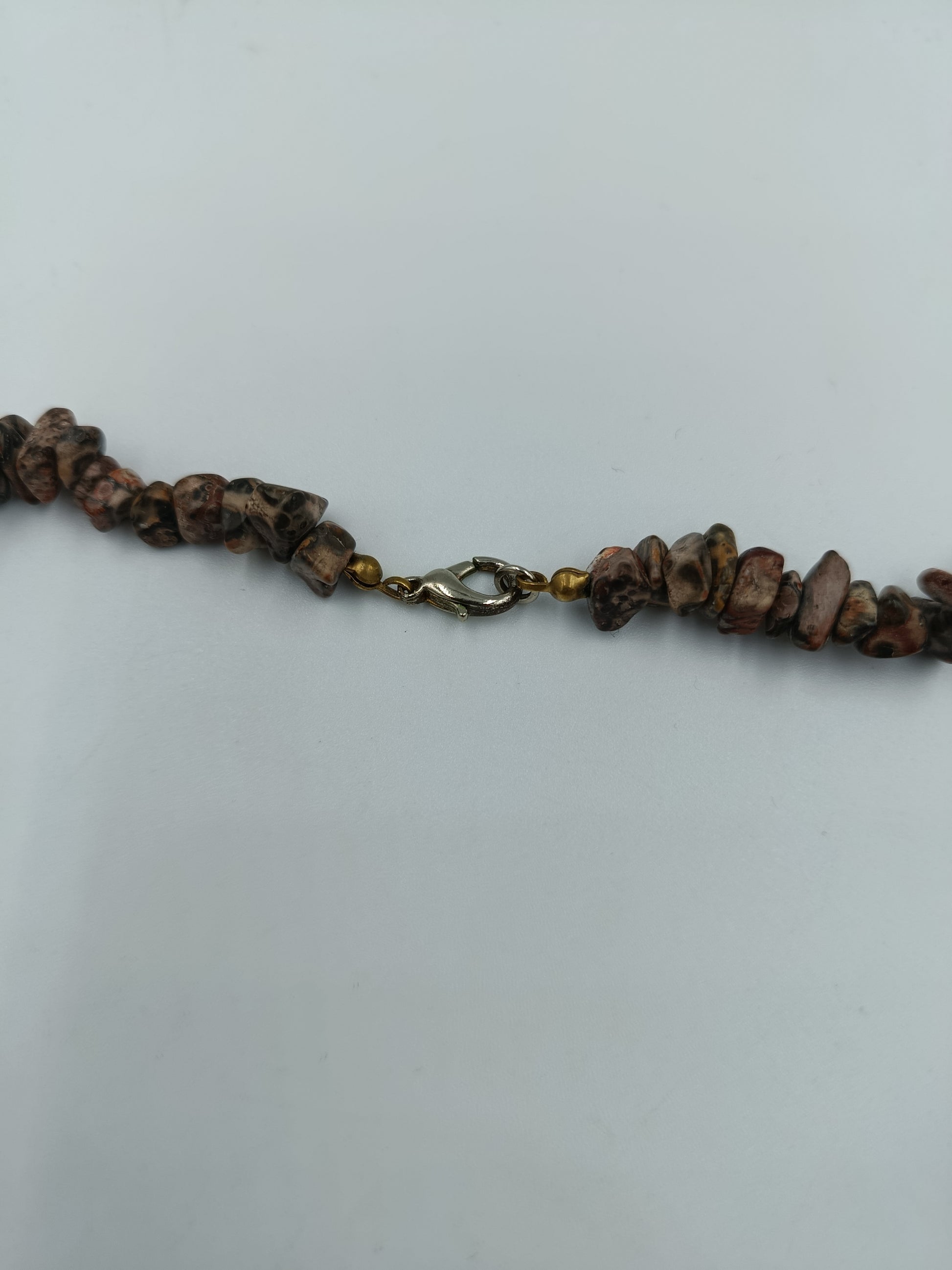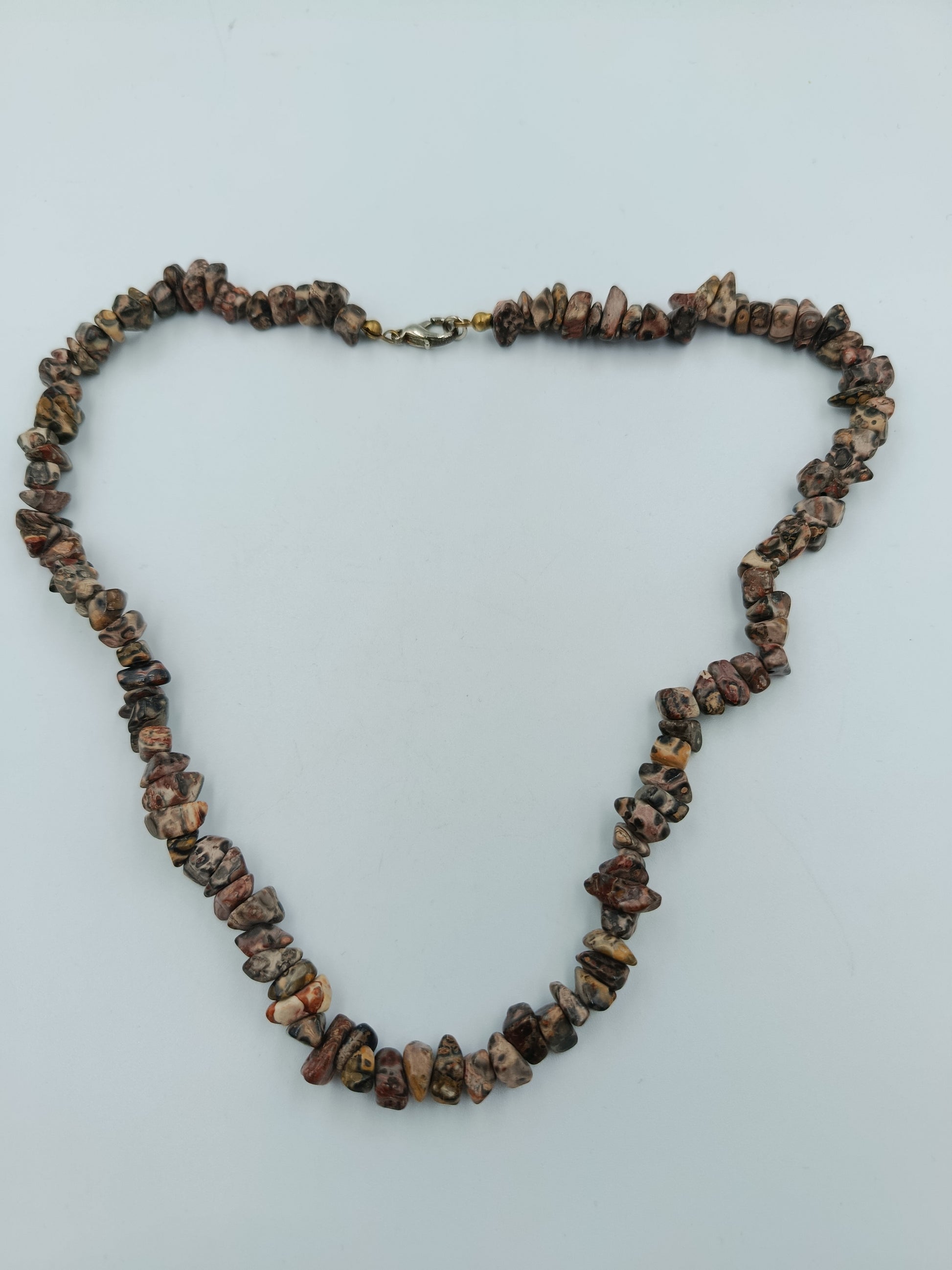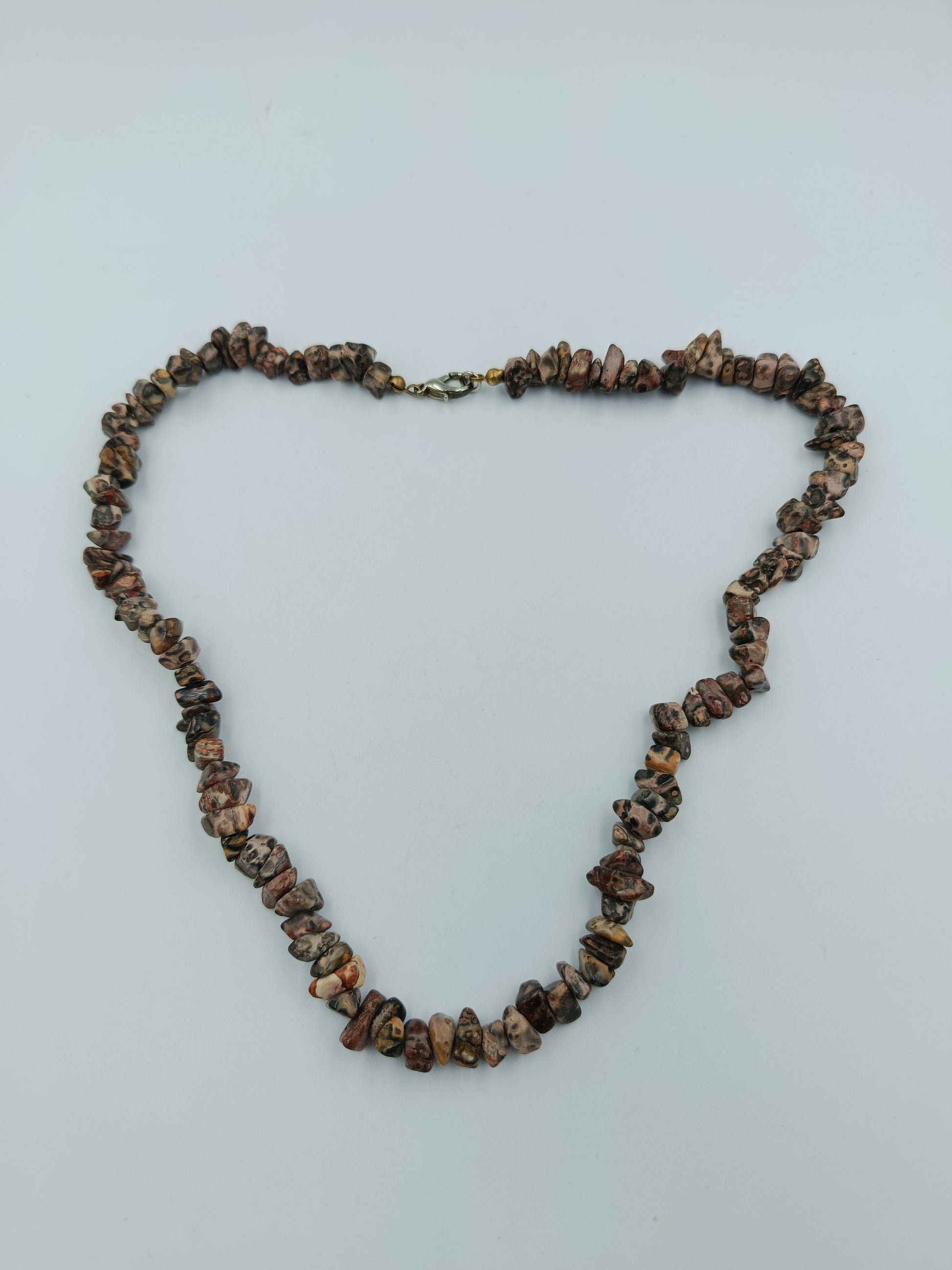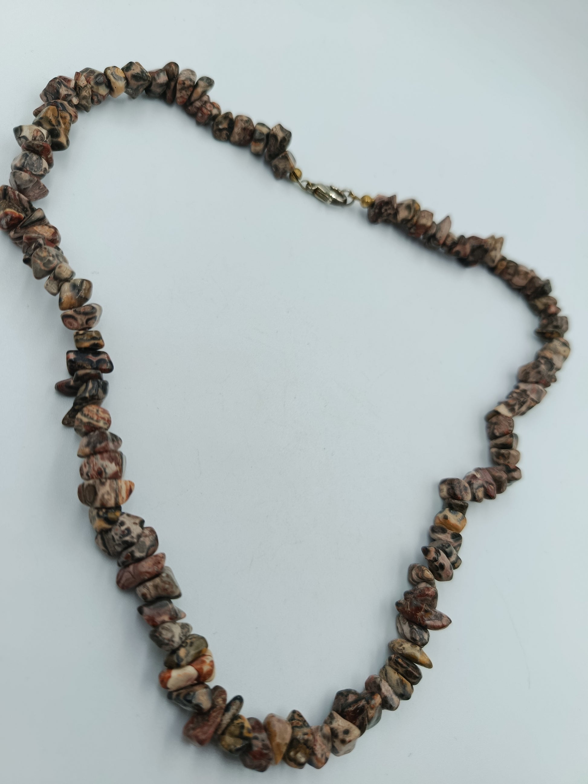 Diese schöne Halskette besteht aus polierten Naturstein-Splittern in warmen Braun-, Rot- und Beigetönen. Jeder Stein ist ein Unikat mit individueller Maserung, was der Kette einen natürlichen, erdigen Charme verleiht. Mit Karabinerverschluss, angenehm zu tragen und vielseitig kombinierbar.