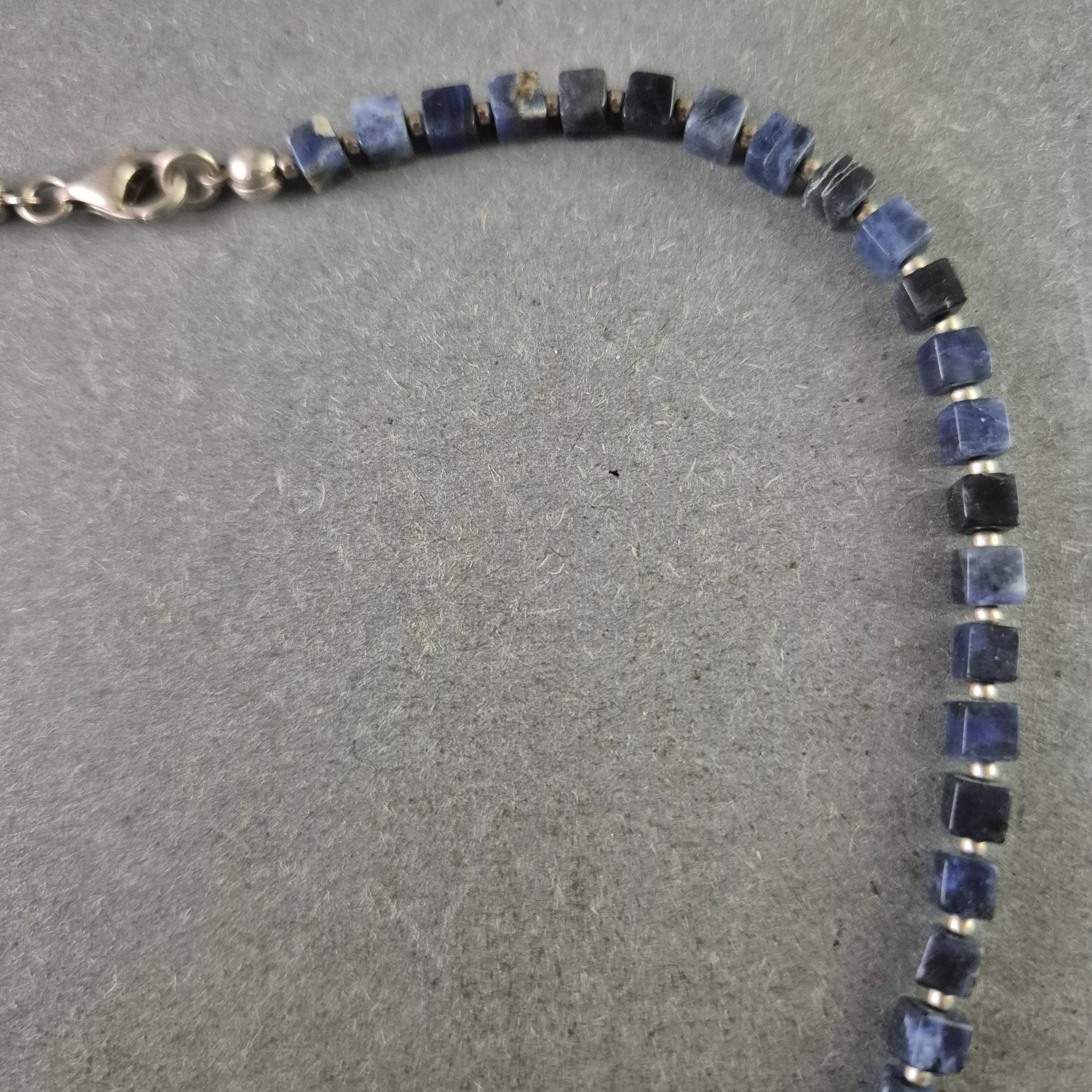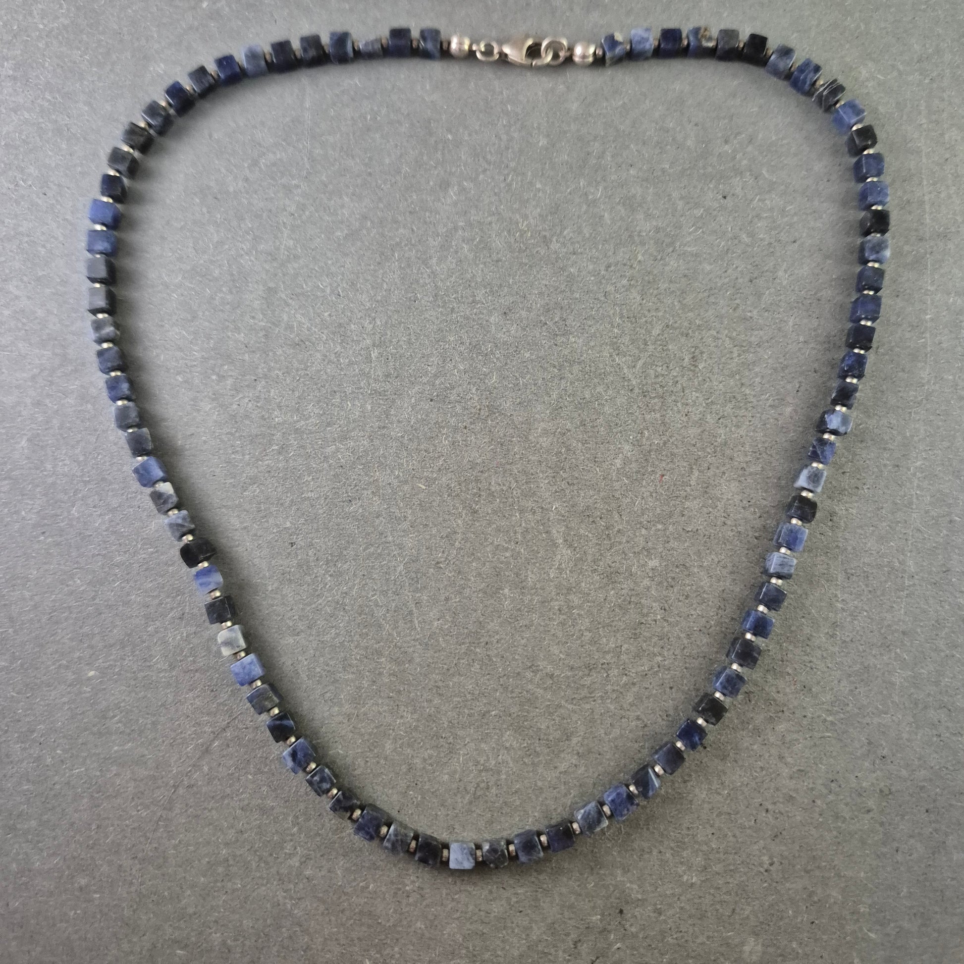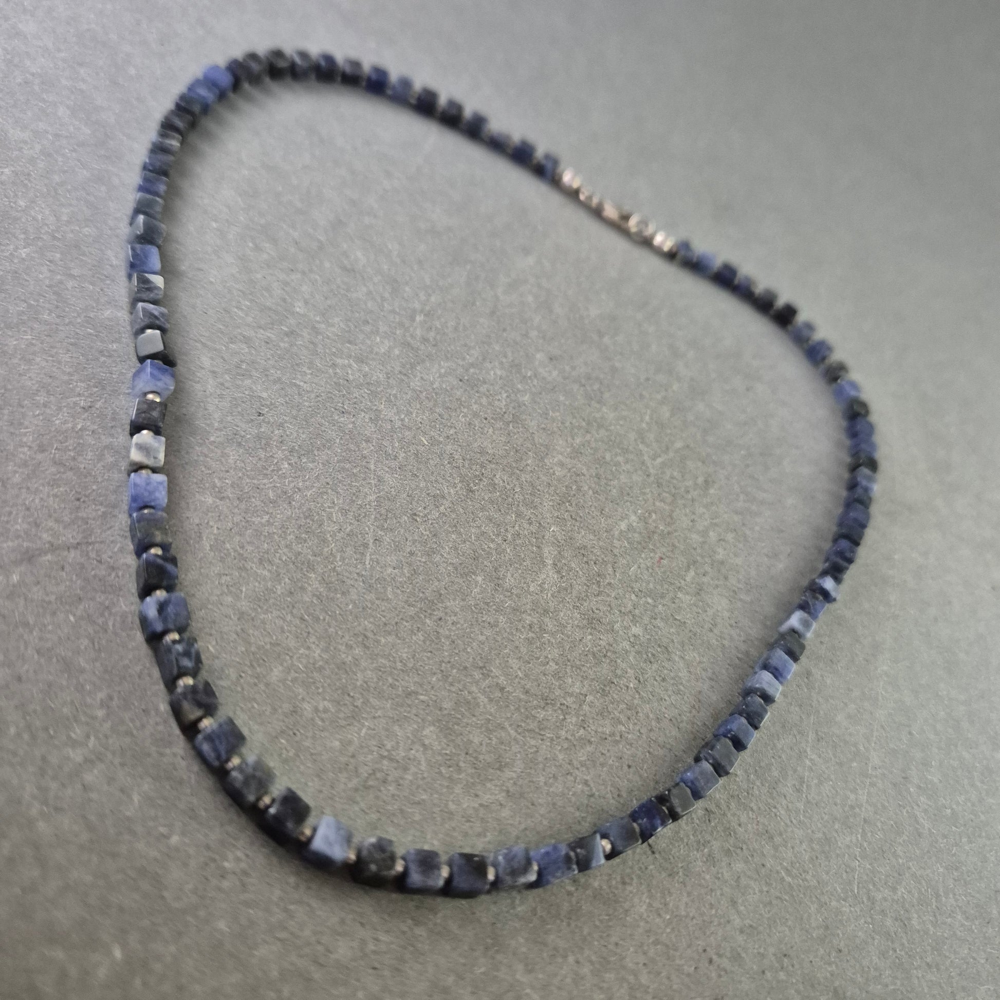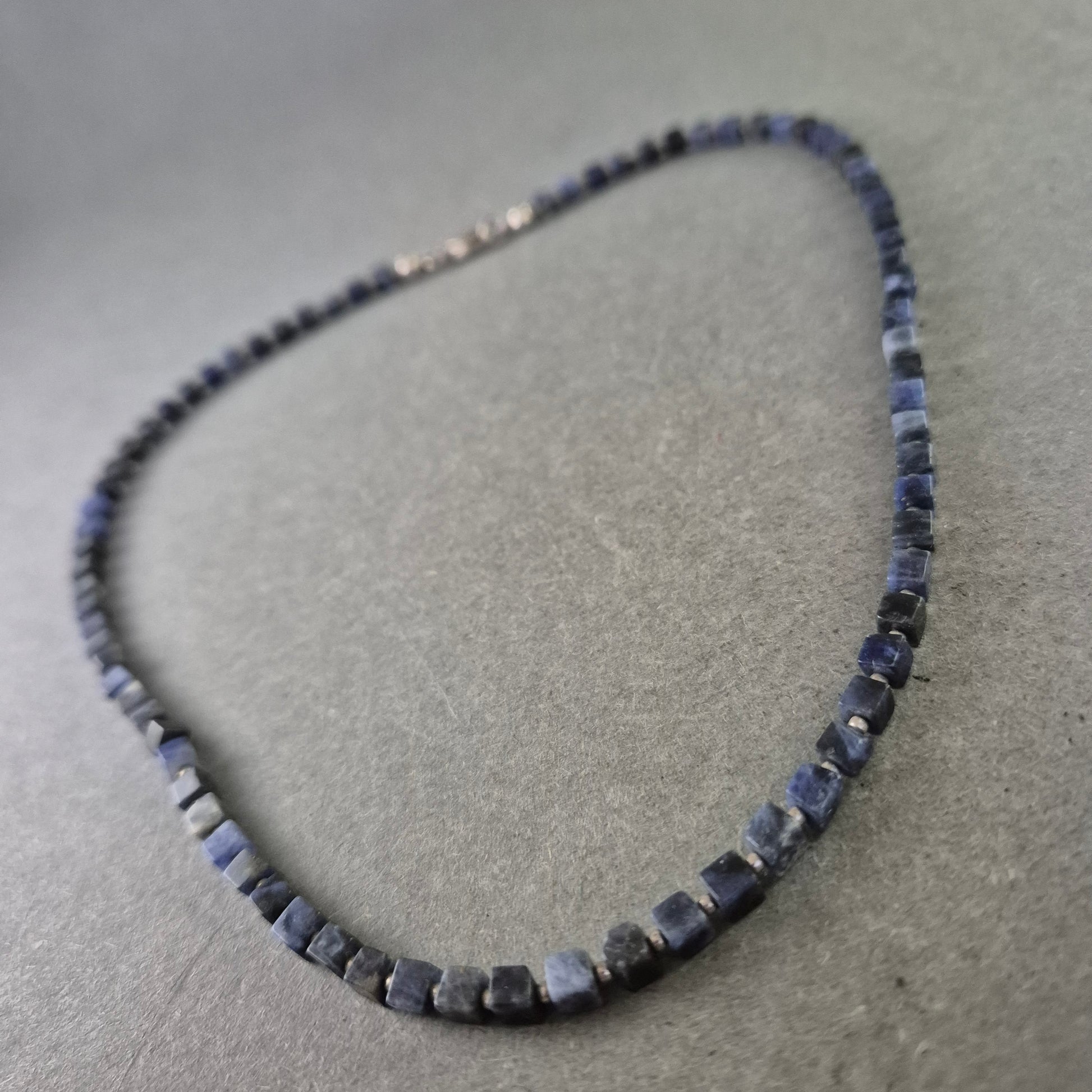 Diese elegante Halskette besteht aus kleinen, gleichmäßig geschliffenen Würfelperlen in sattem Dunkelblau, vermutlich Sodalith. Das klare, geometrische Design verleiht dem Schmuckstück eine moderne Note, während die natürlichen Farbnuancen Tiefe und Charakter schaffen. Ideal für Liebhaber:innen minimalistischer Natursteinoptik.