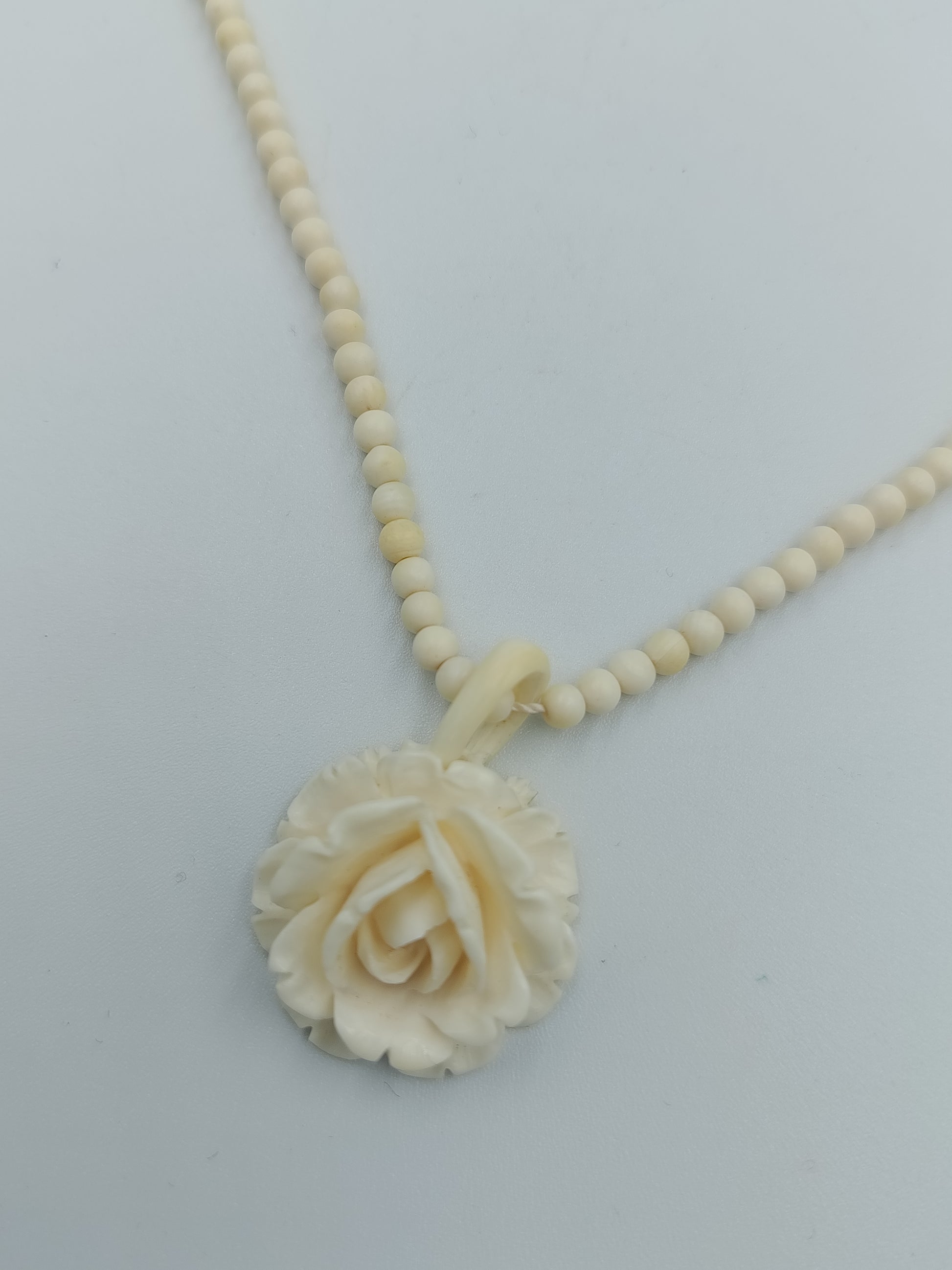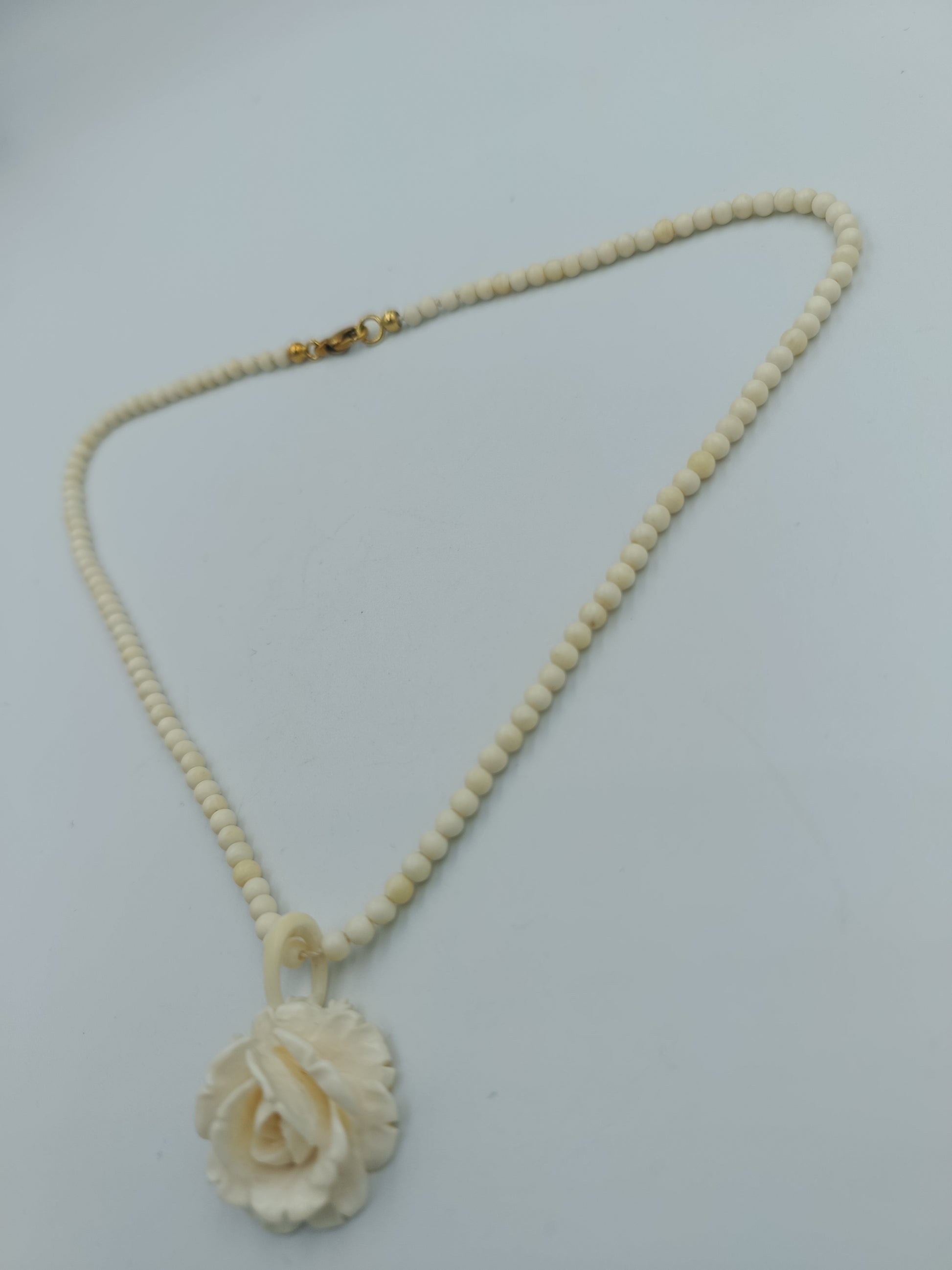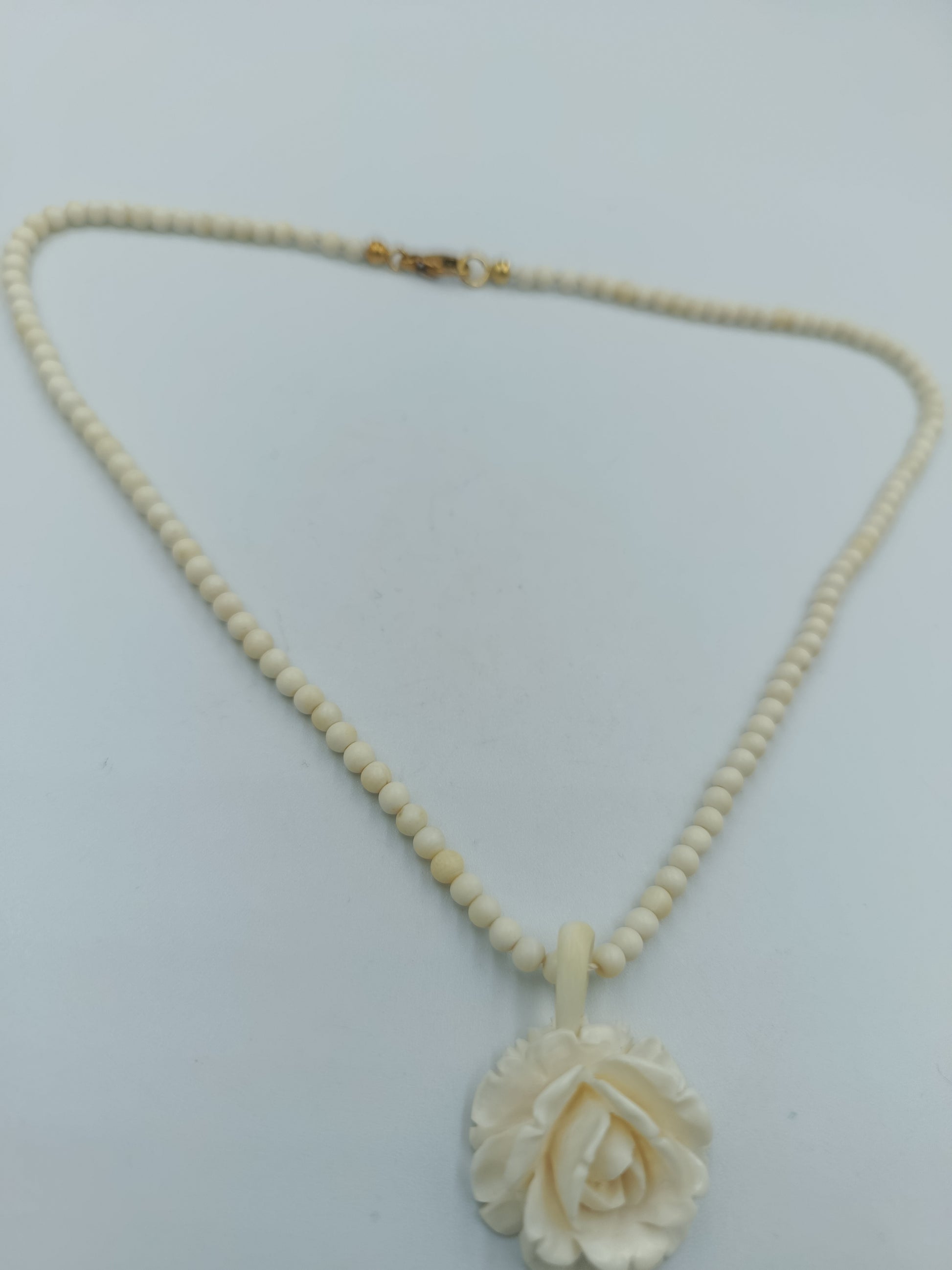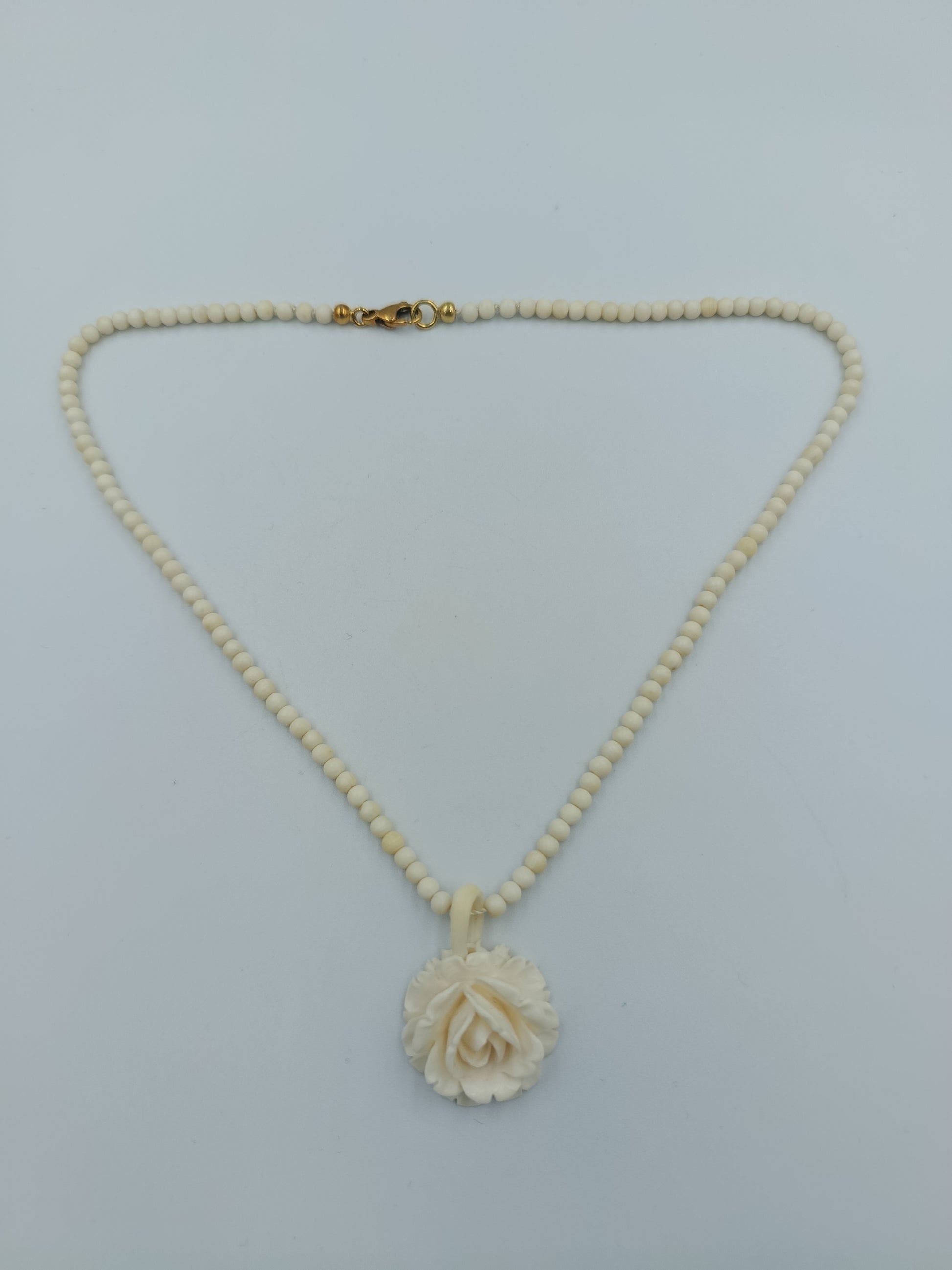 Eine zarte Halskette, die natürliche Eleganz mit feinen Details verbindet: Kleine, elfenbeinfarbene Perlen reihen sich harmonisch aneinander und tragen als Highlight einen detailreich gearbeiteten Anhänger in Form einer blühenden Rose. Der hochwertige, vergoldete Verschluss aus 585er Gold unterstreicht den edlen Charakter und macht die Kette zu einem besonderen Schmuckstück für Sammlerinnen und Liebhaberinnen klassischer Designs.