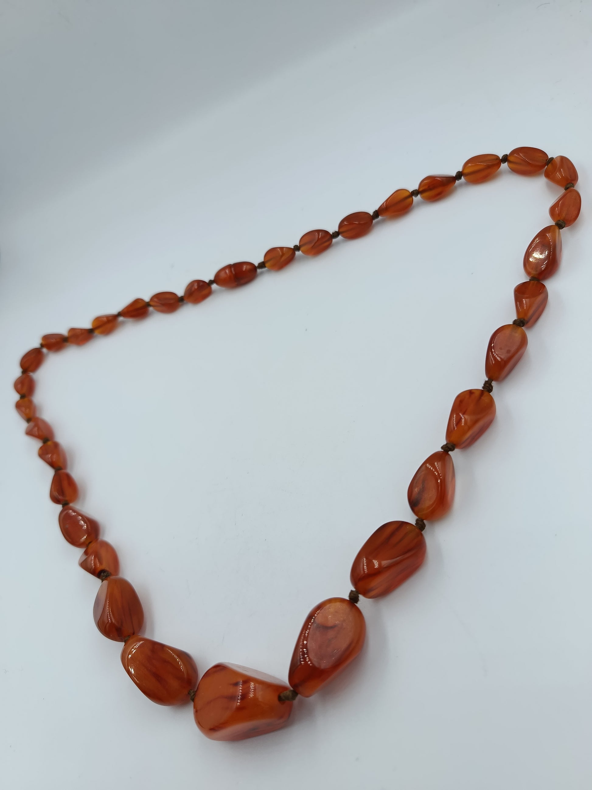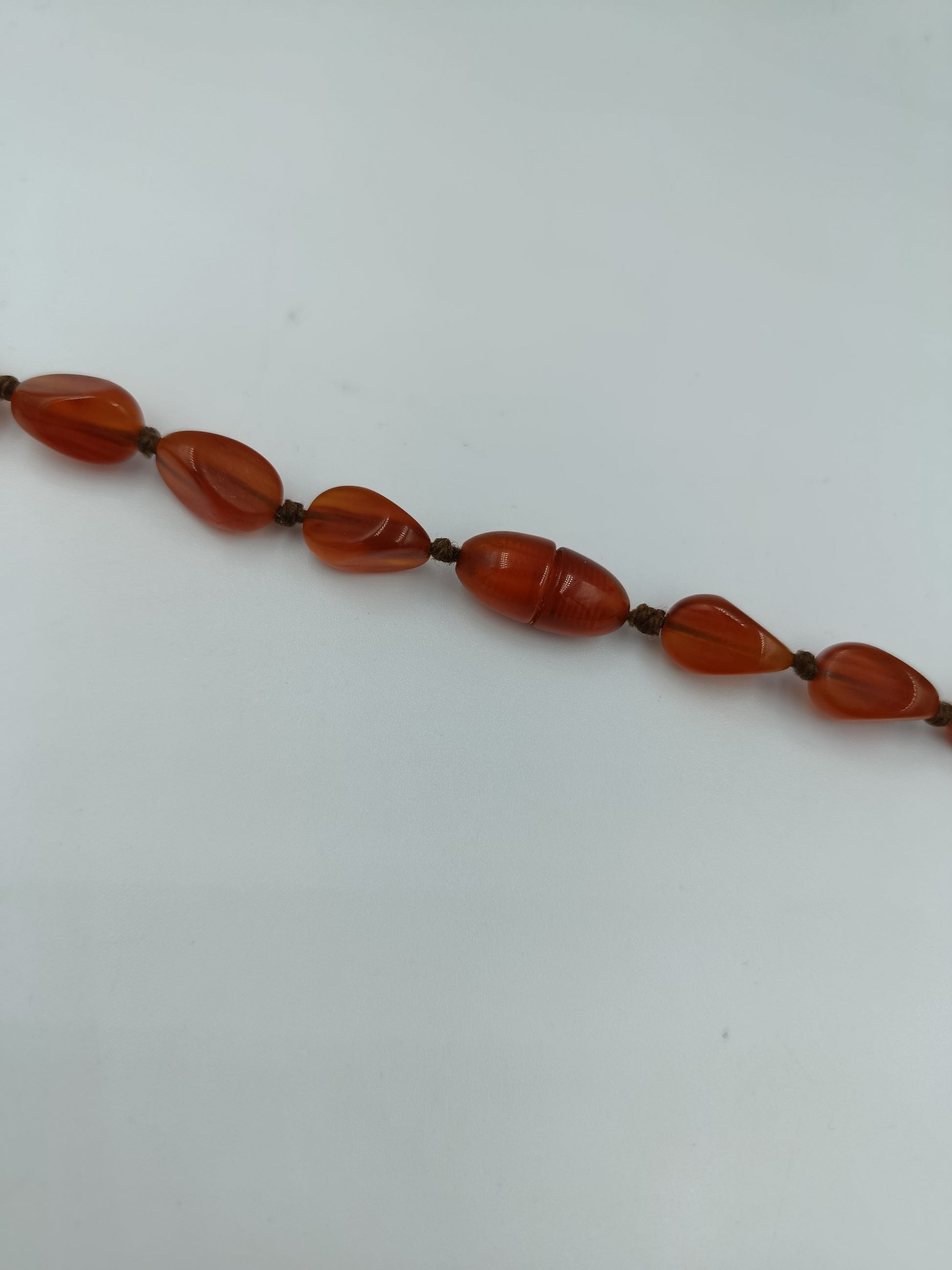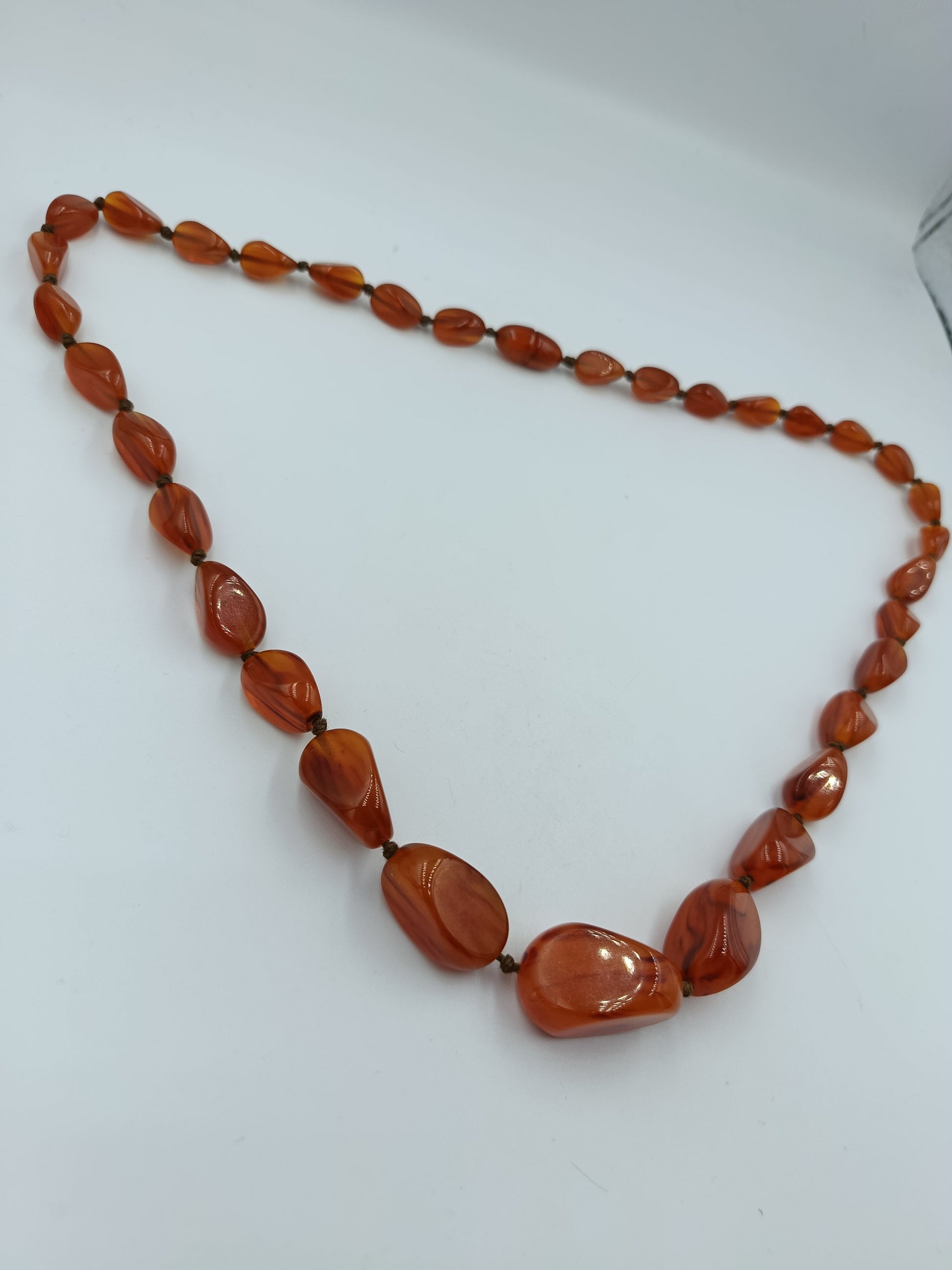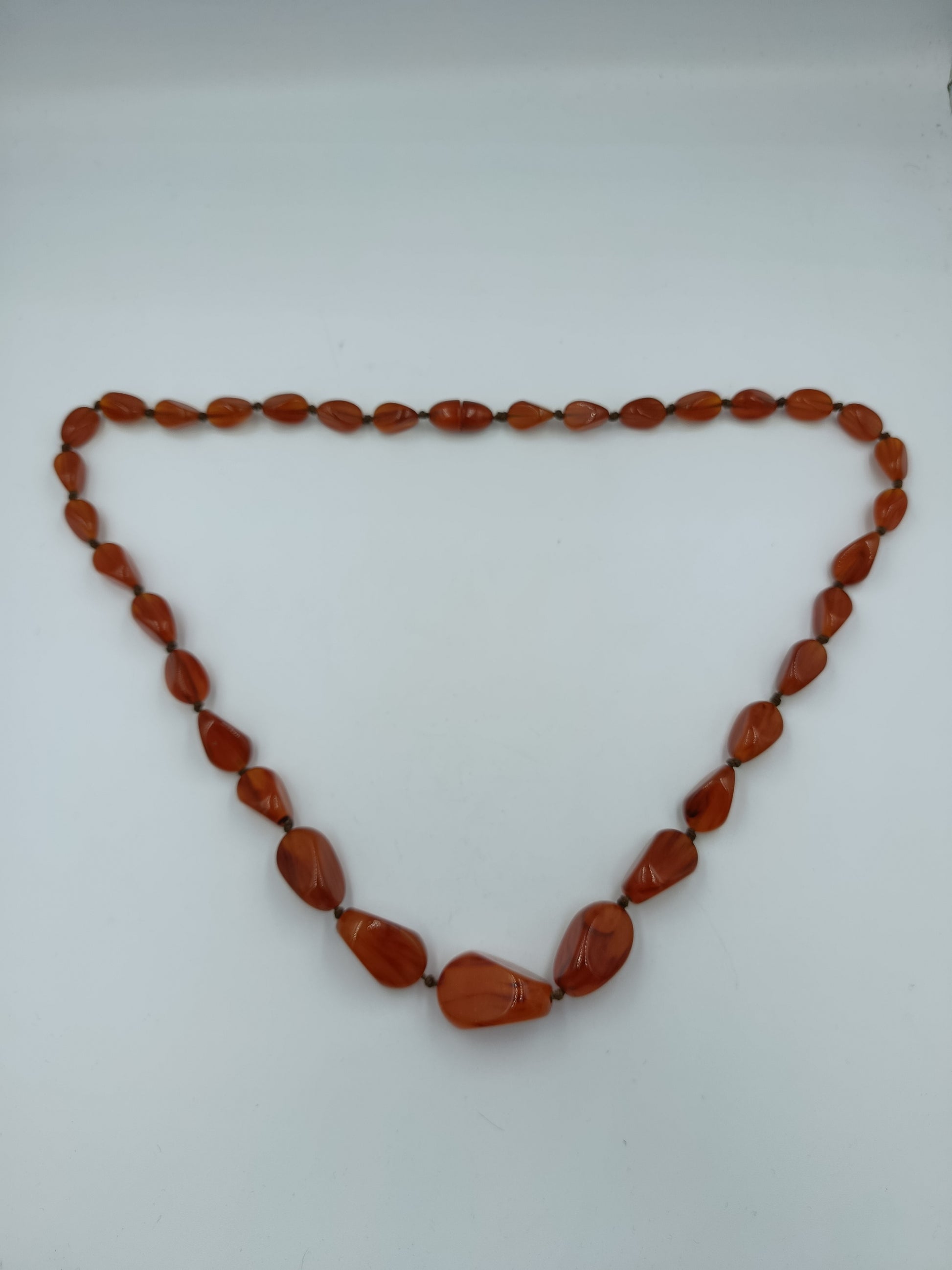 Eine stilvolle, längere Halskette aus rotbraunen Steinen in unregelmäßiger, natürlicher Form. Die polierten Schmucksteine schimmern warm und verleihen jedem Outfit eine elegante und zugleich naturverbundene Note. Ideal für Vintage-Liebhaber und alle, die auffällige Schmuckstücke schätzen.