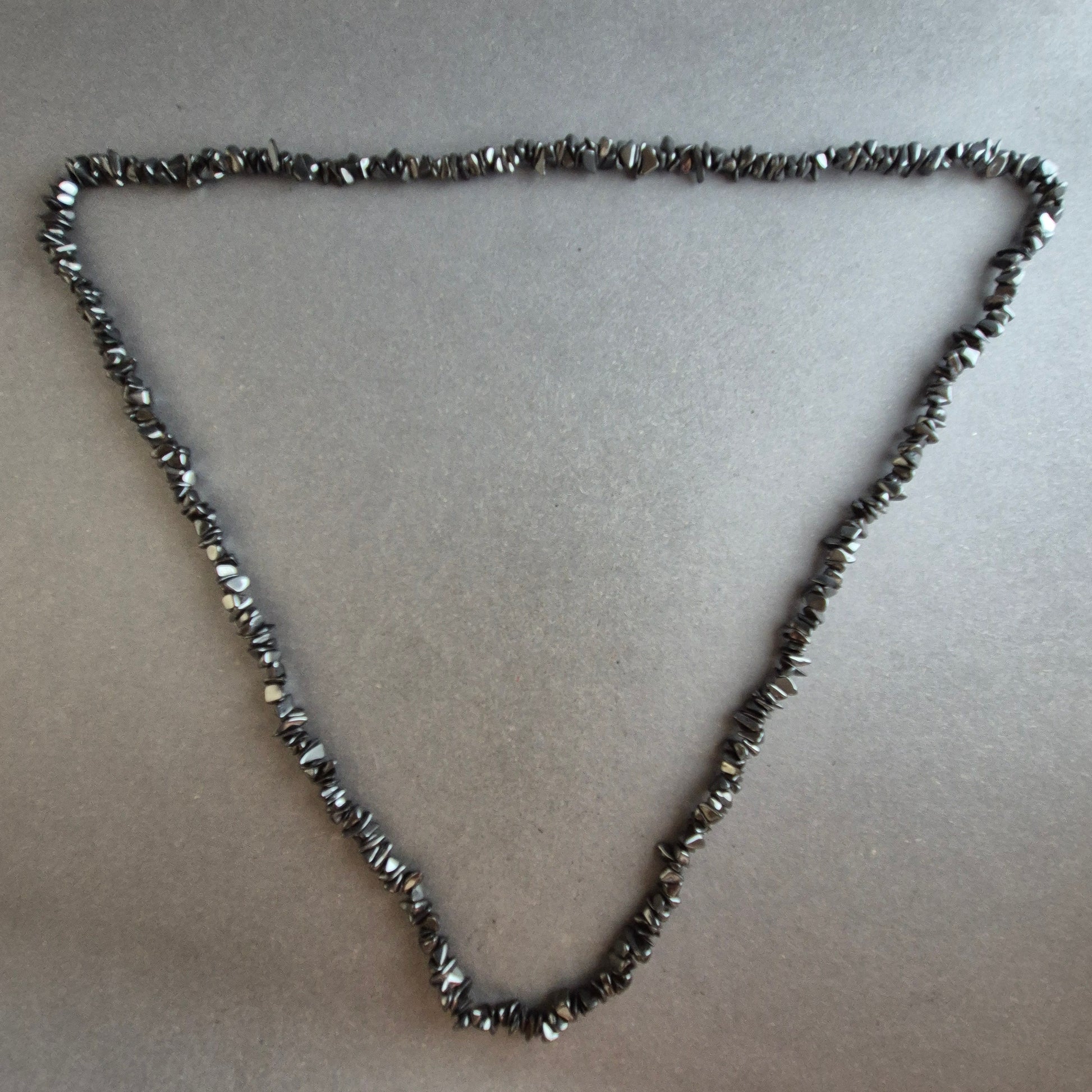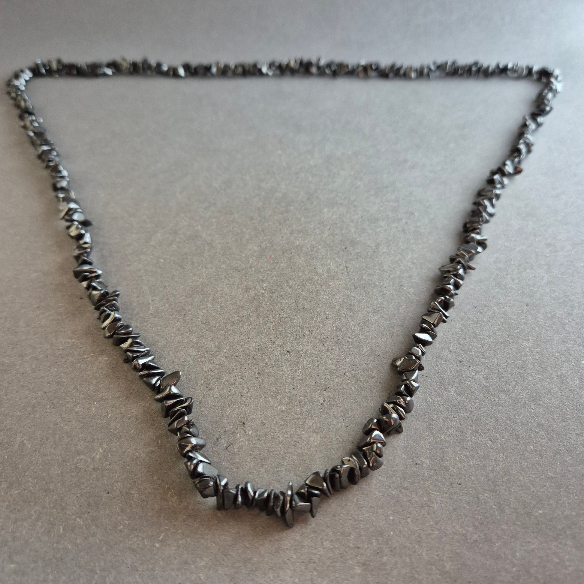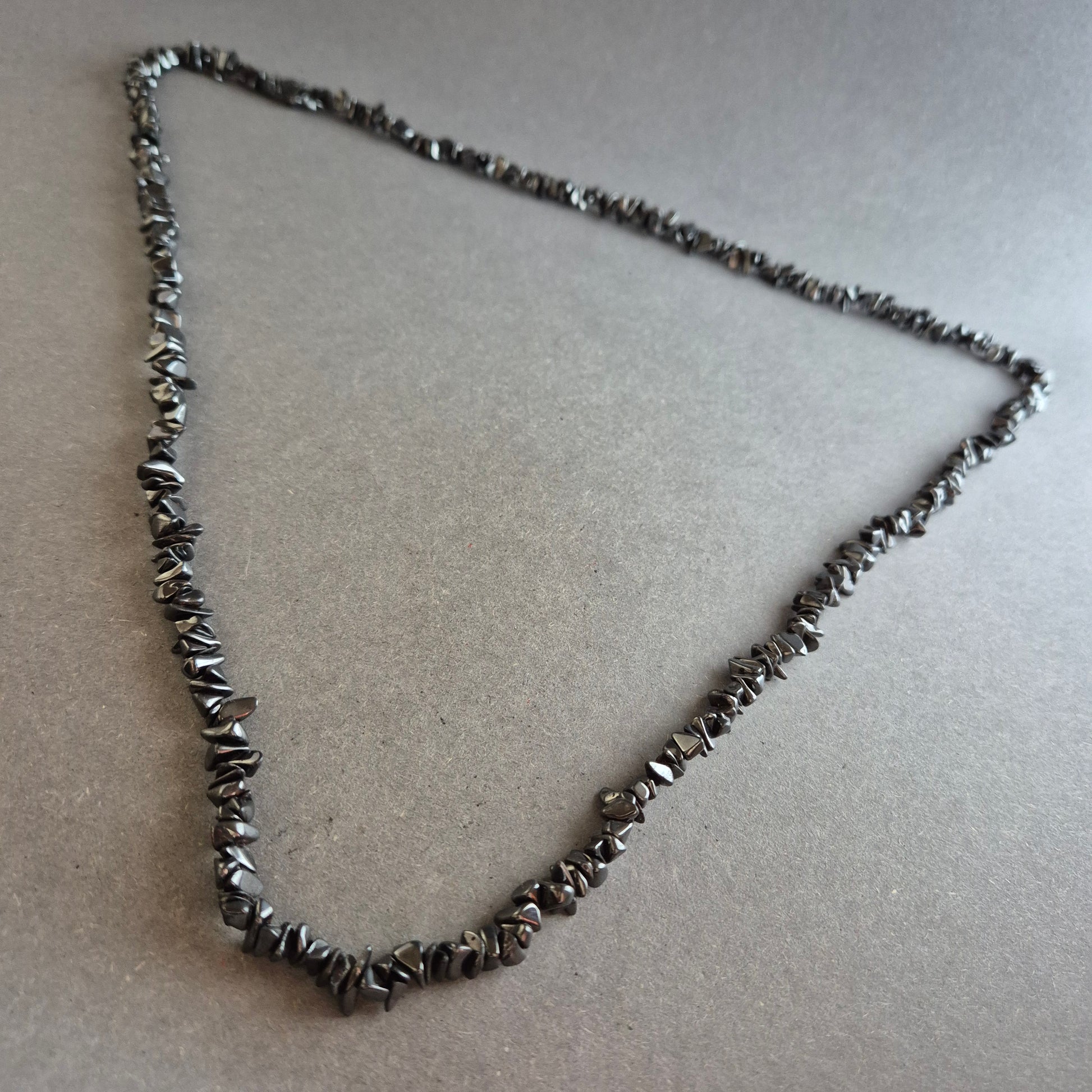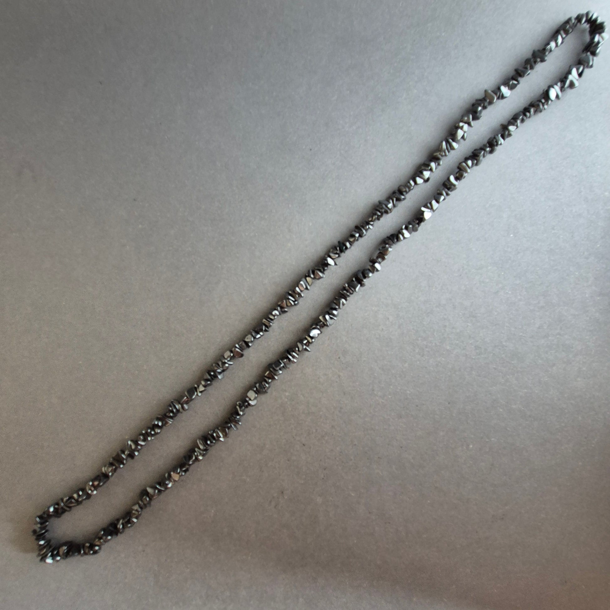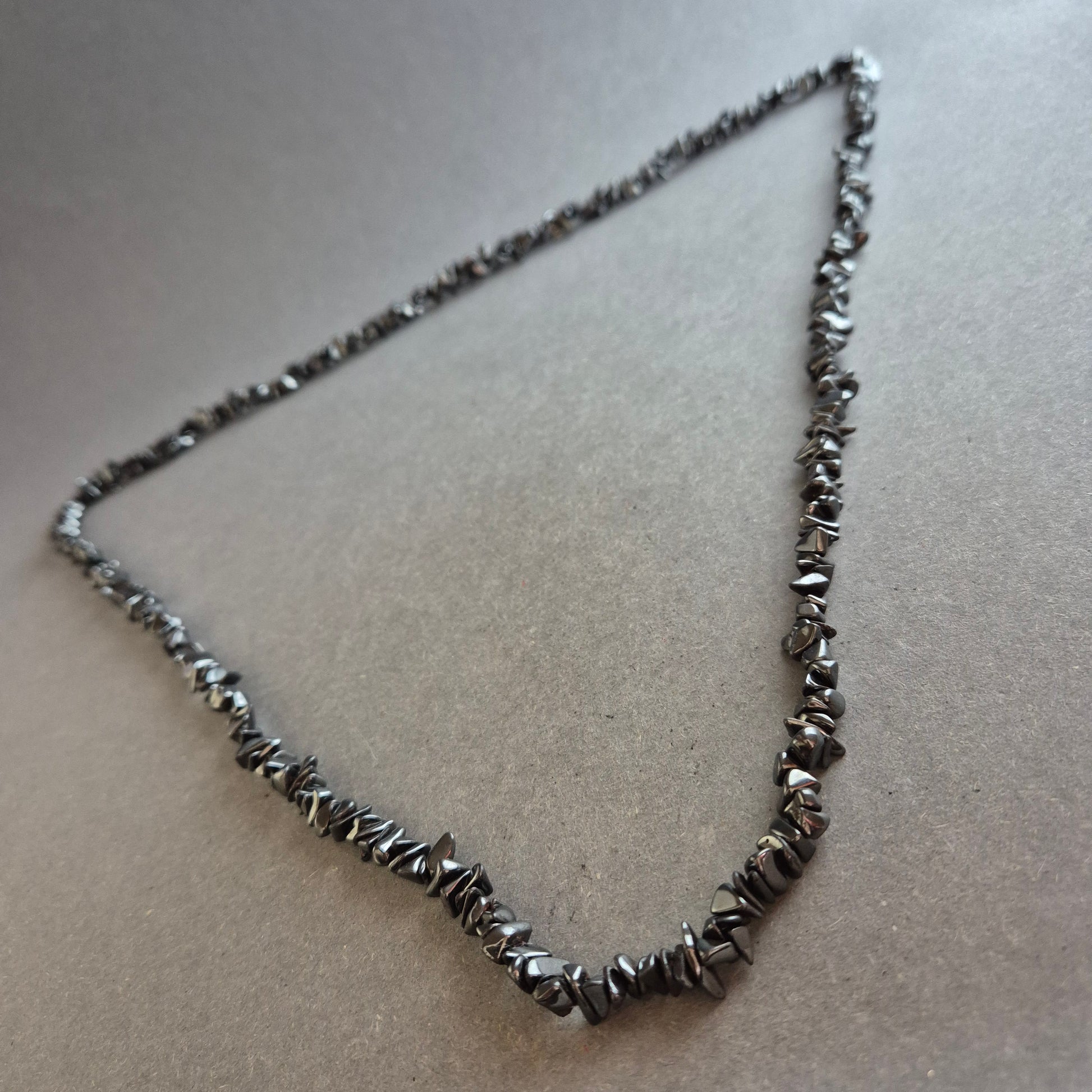 Diese elegante Kette aus echtem Hämatit überzeugt durch ihre glänzende, dunkel-metallische Optik. Die naturbelassenen Splitter sind facettenreich geschliffen und erzeugen ein dezentes Funkeln im Licht. Ob zu festlicher Kleidung oder im Alltag – dieses zeitlose Schmuckstück passt zu jedem Stil.
