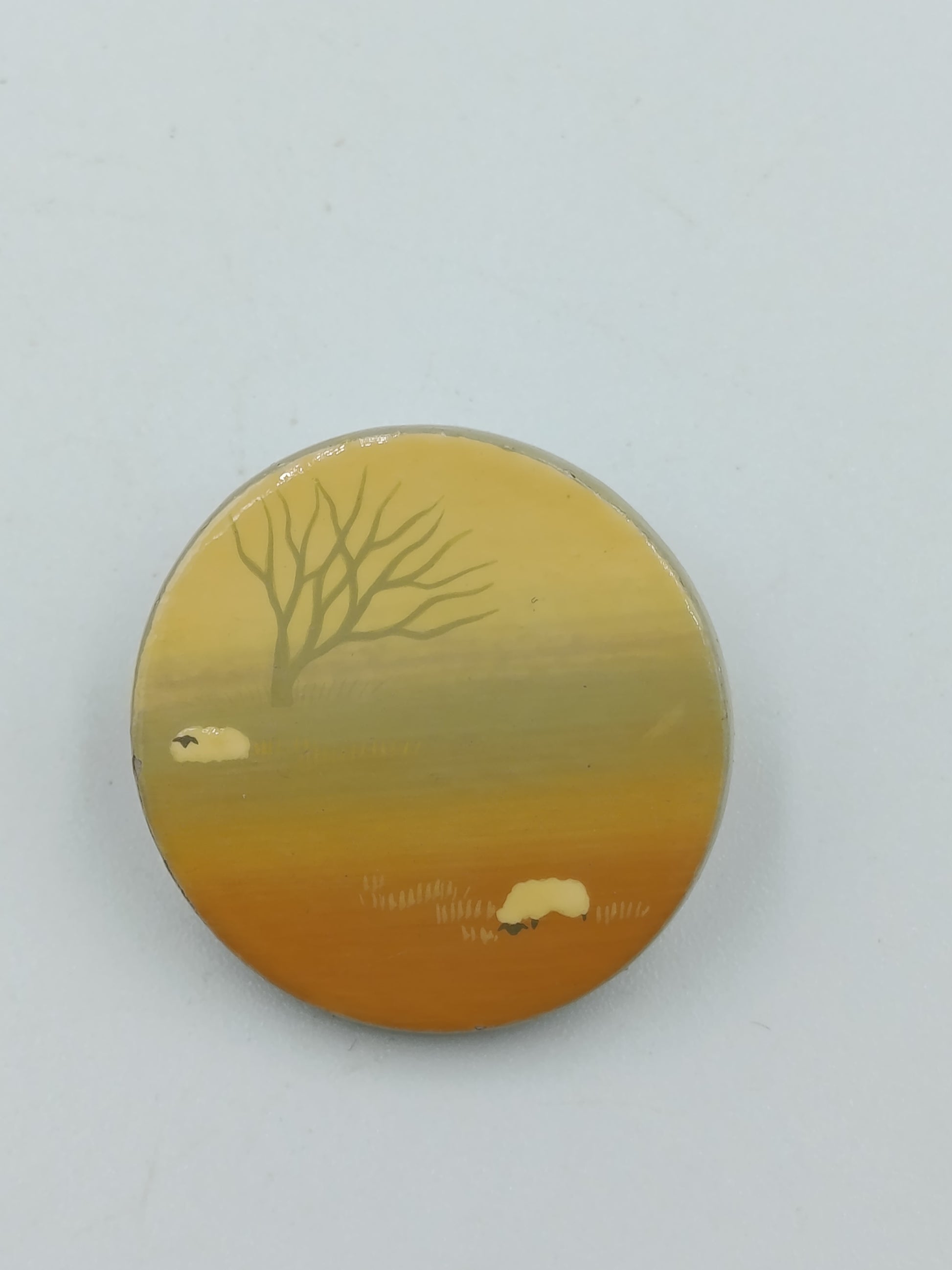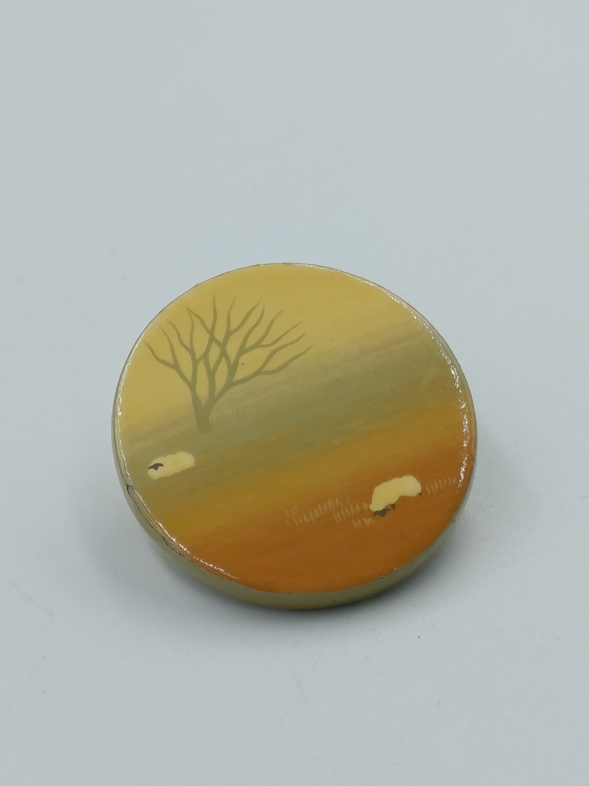 Zarte, handbemalte Brosche mit idyllischem Landschaftsmotiv. Die sanften Gelb- und Orangetöne erinnern an einen Sonnenuntergang, während der feine schwarze Baum und die kleinen weißen Schafe dem Design eine romantische, fast meditative Wirkung verleihen. Perfekt als Vintage-Accessoire für Blusen, Jacken oder Schals.