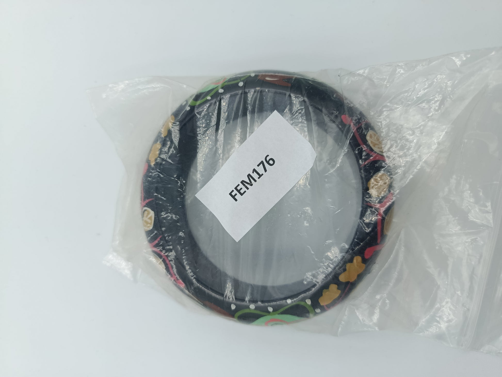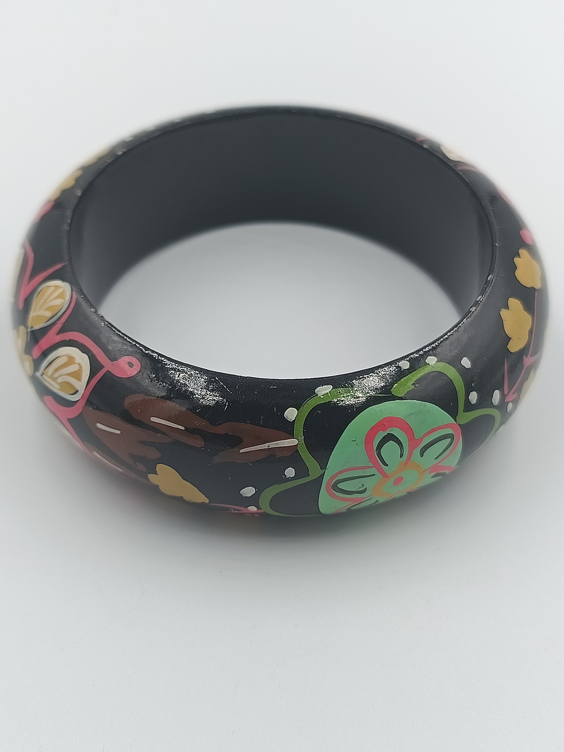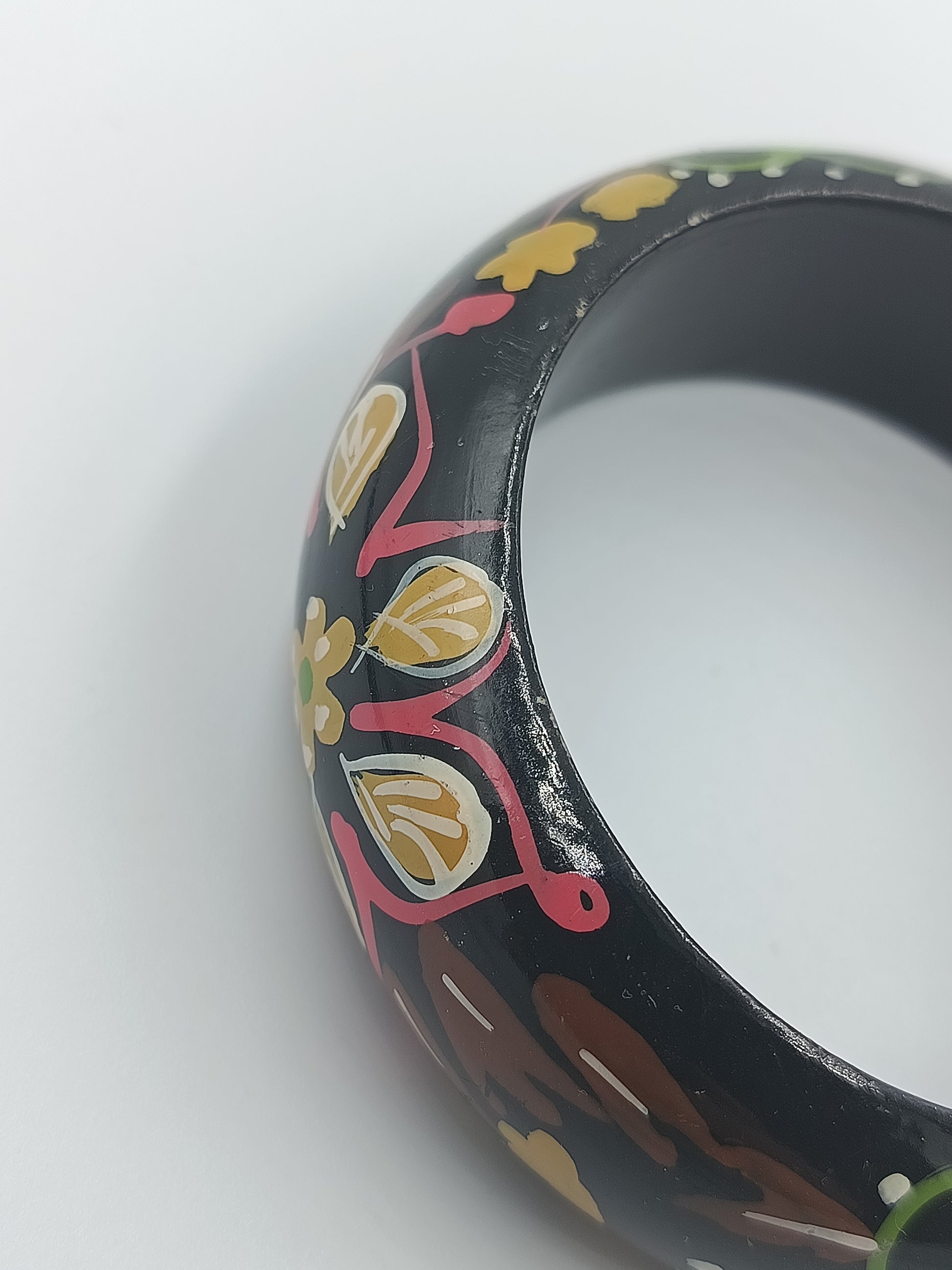 Ein farbenfrohes, handbemaltes Vintage-Armreif aus Holz. Die schwarze Basis ist mit floralen Mustern in Rot, Grün, Gelb und Weiß verziert und macht das Armband zu einem echten Hingucker. Perfekt als Boho- oder Ethno-Statement-Piece.