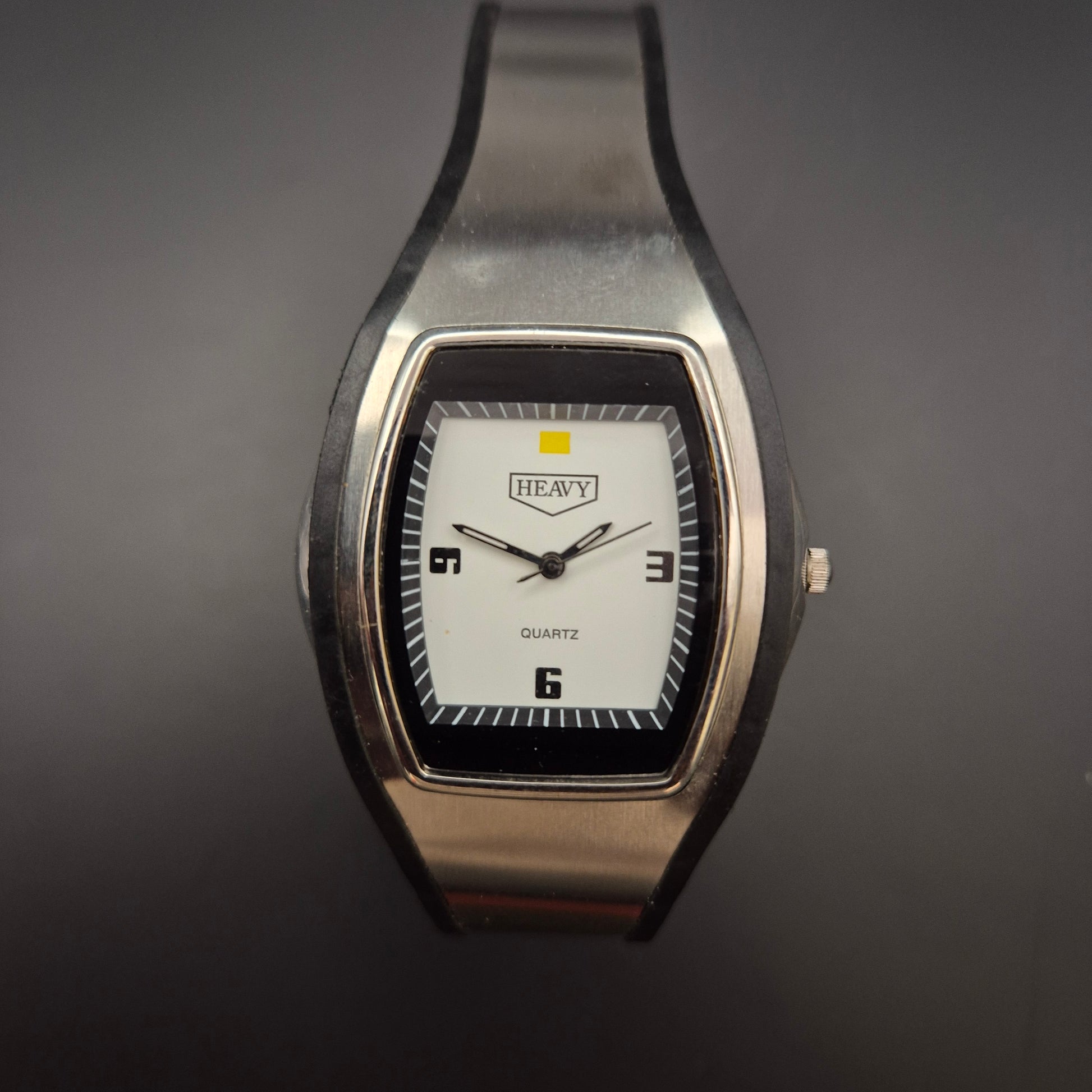 Diese Heavy Herren Uhr verbindet ein markantes Retrodesign mit sportlicher Eleganz. Das rechteckig gewölbte Edelstahlgehäuse hebt das weiße Zifferblatt mit schwarzen Kontrasten hervor. Die großen Zahlen bei 3, 6 und 9 sorgen für eine klare Ablesbarkeit, während das schwarze Kautschukarmband einen hohen Tragekomfort bietet. Ausgestattet mit Quarzwerk, ist diese Uhr ein zuverlässiger Begleiter für den Alltag.