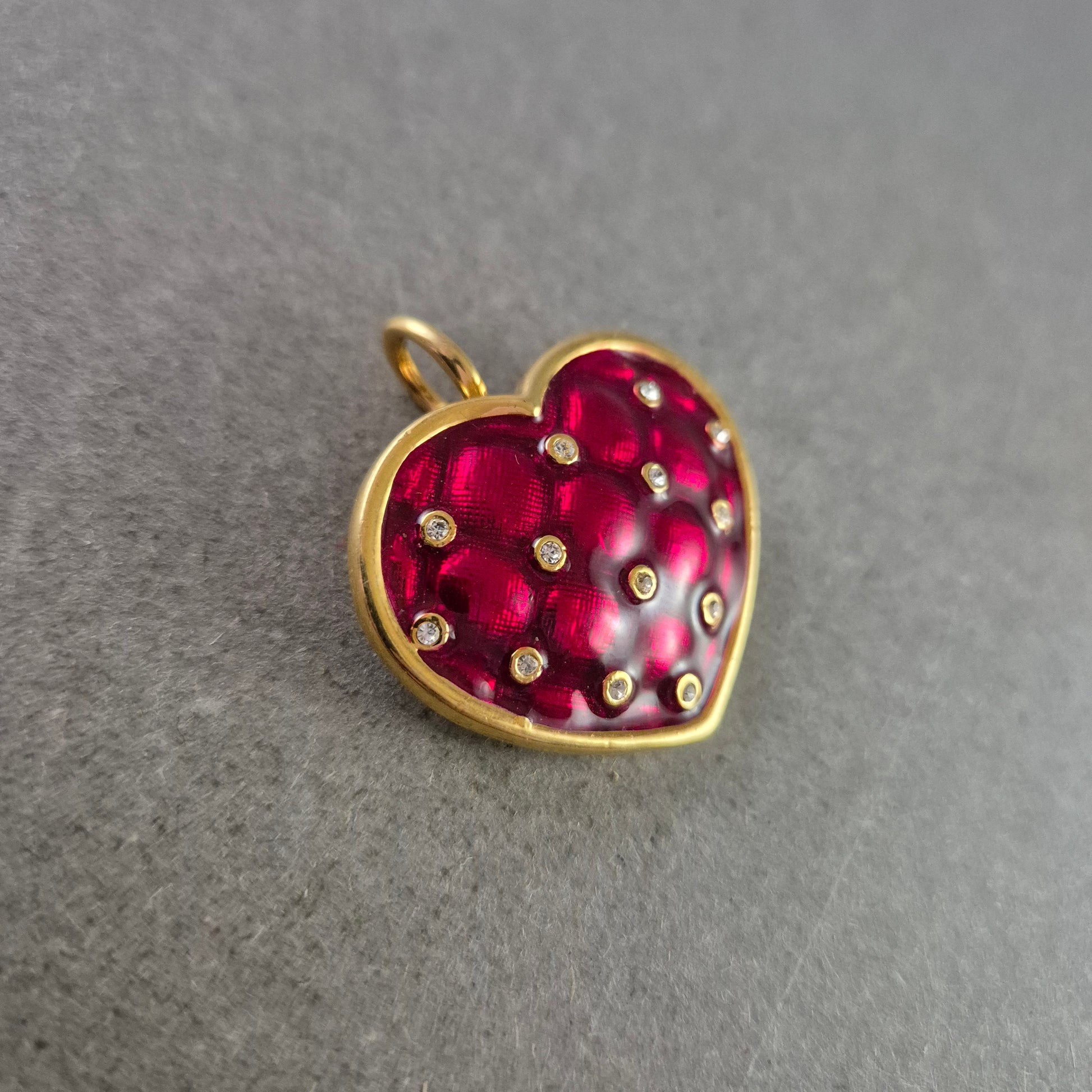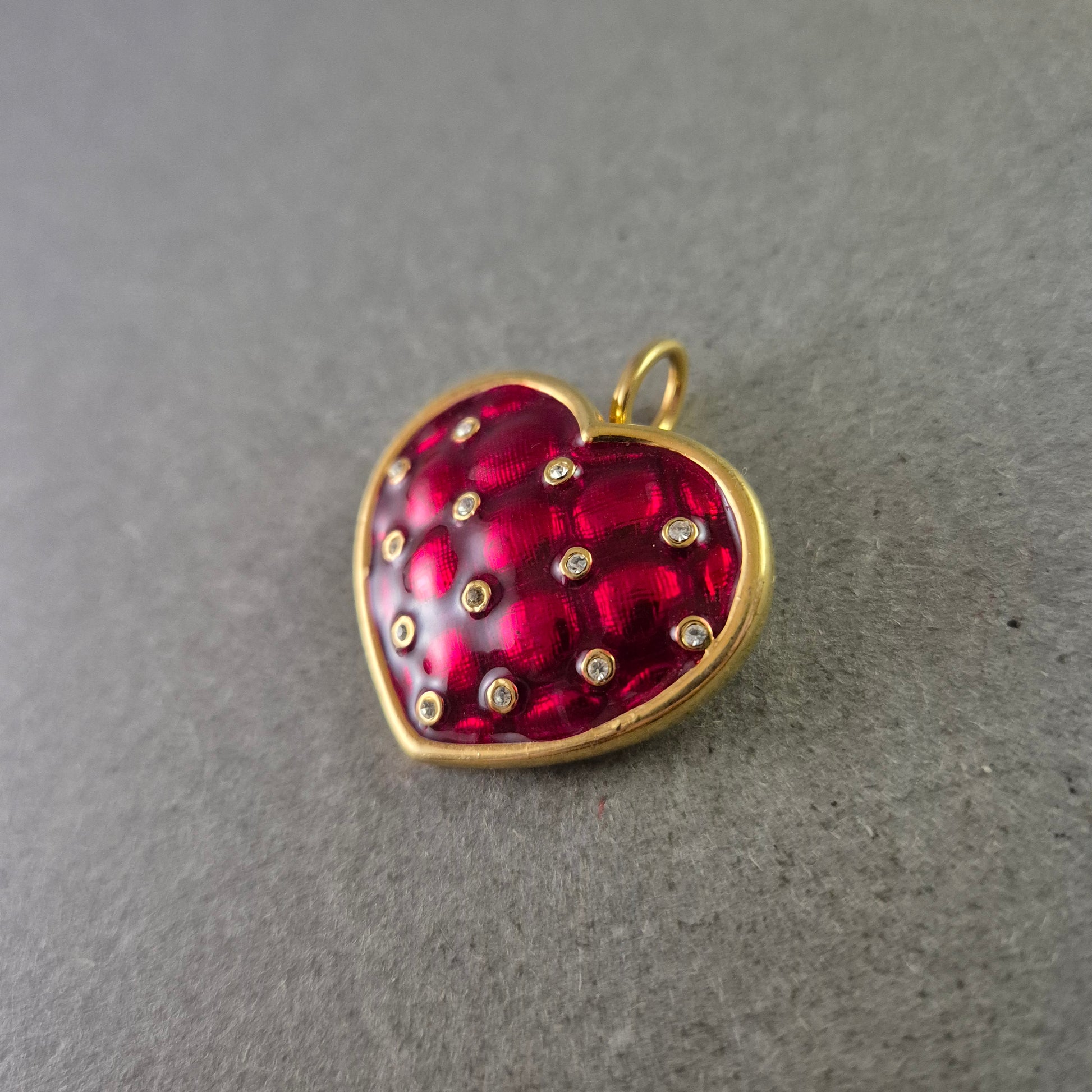 Diese elegante Brosche in Herzform zieht mit ihrem leuchtend roten Design sofort die Blicke auf sich. Das Herz ist mit einer glänzenden, leicht gewölbten Oberfläche gestaltet und wird durch funkelnde Strasssteine akzentuiert. Die goldfarbene Fassung rundet das Schmuckstück stilvoll ab. Dank der Anstecknadel auf der Rückseite lässt sich die Brosche sicher an Kleidung, Taschen oder Schals befestigen.