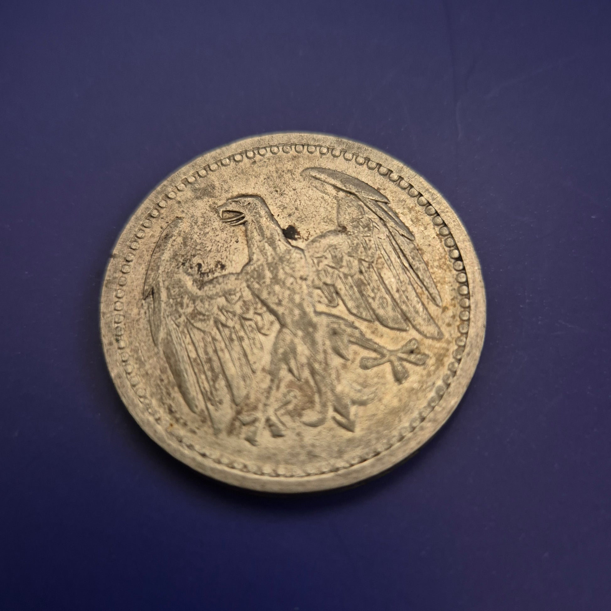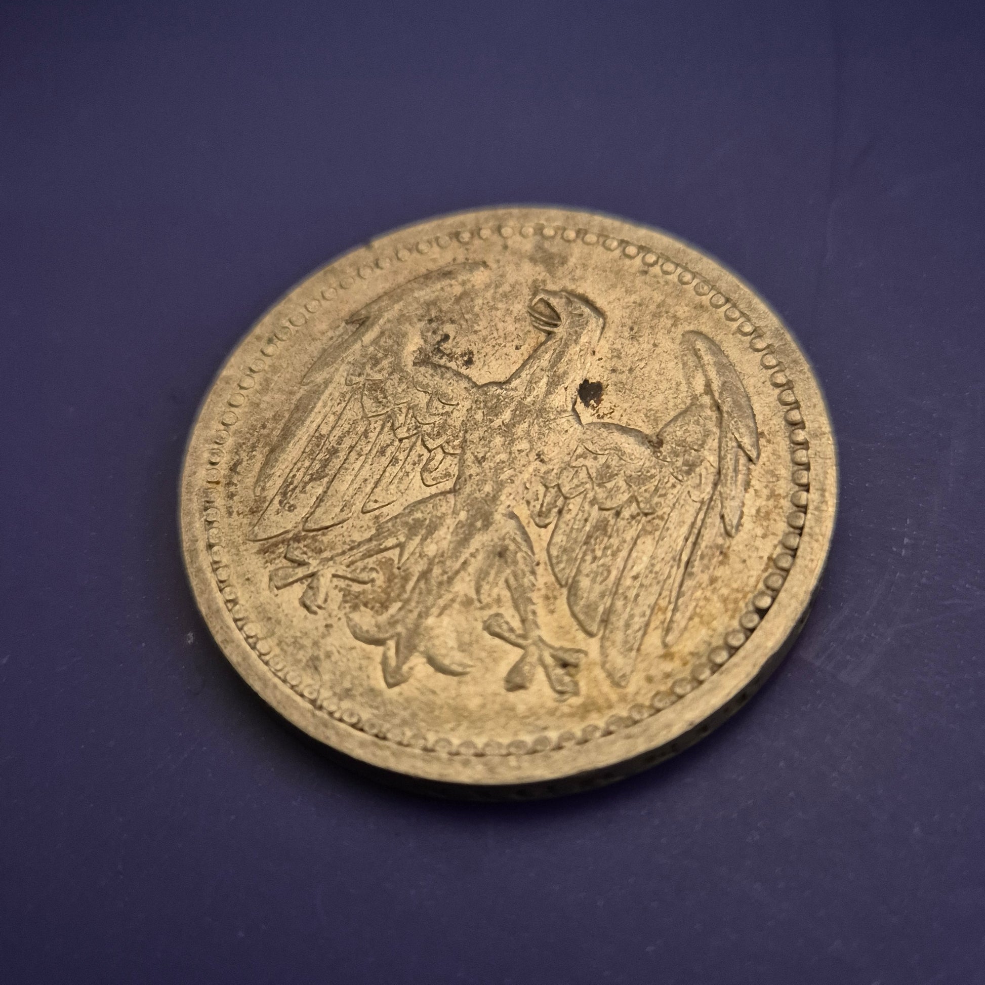 Dieses historische Sammlerstück ist eine Münze des Deutschen Reiches von 1924 mit dem Nennwert „DREI MARK“. Die Vorderseite zeigt den Reichsadler, während die Rückseite den Nennwert, das Prägejahr 1924 und die Inschrift „DEUTSCHES REICH“ trägt. Es handelt sich hierbei um eine Münze, die in der Zeit der Weimarer Republik geprägt wurde. Ein interessantes numismatisches Objekt mit deutlichen Gebrauchs- und Alterungsspuren, die seine Geschichte bezeugen.