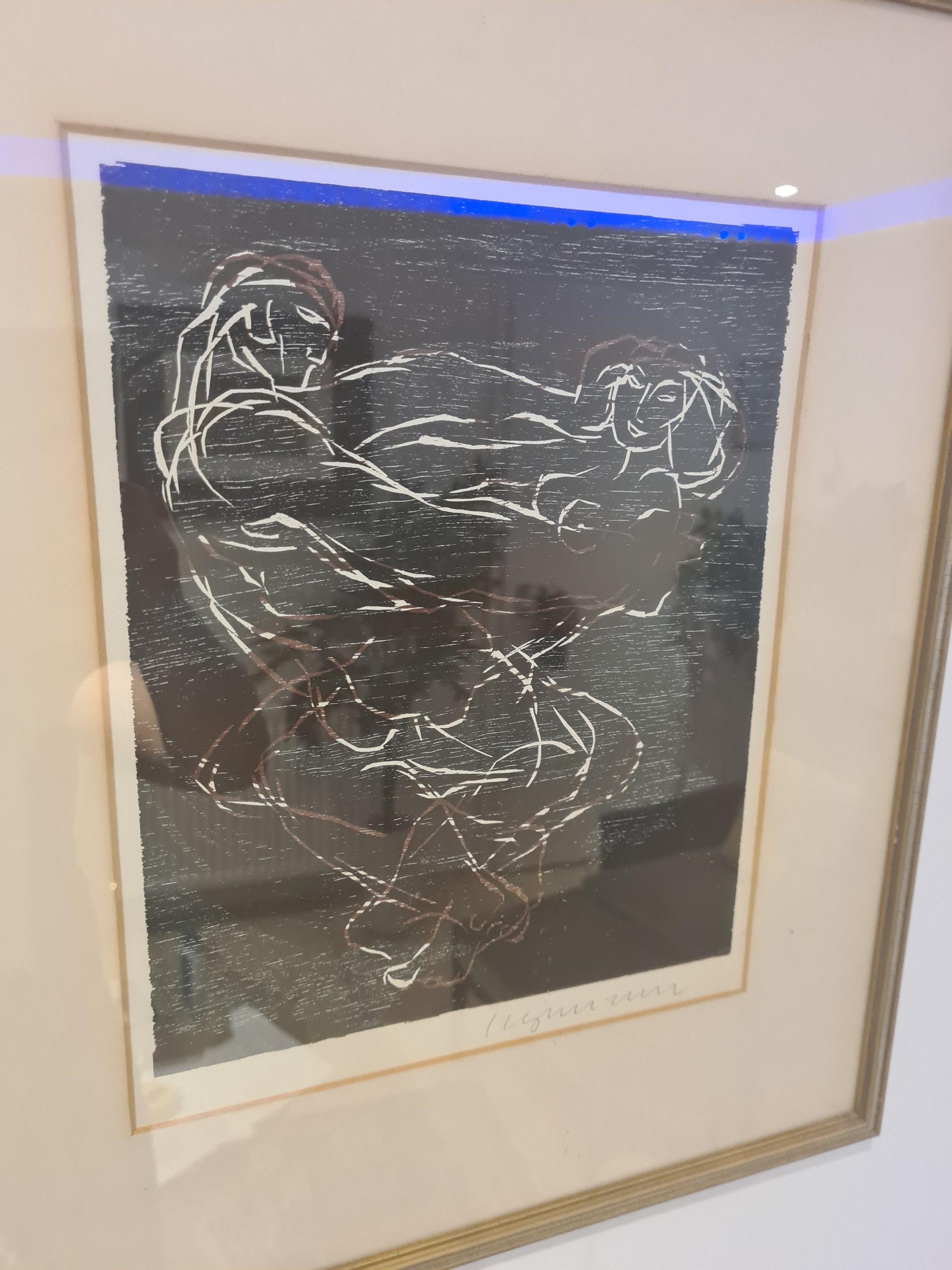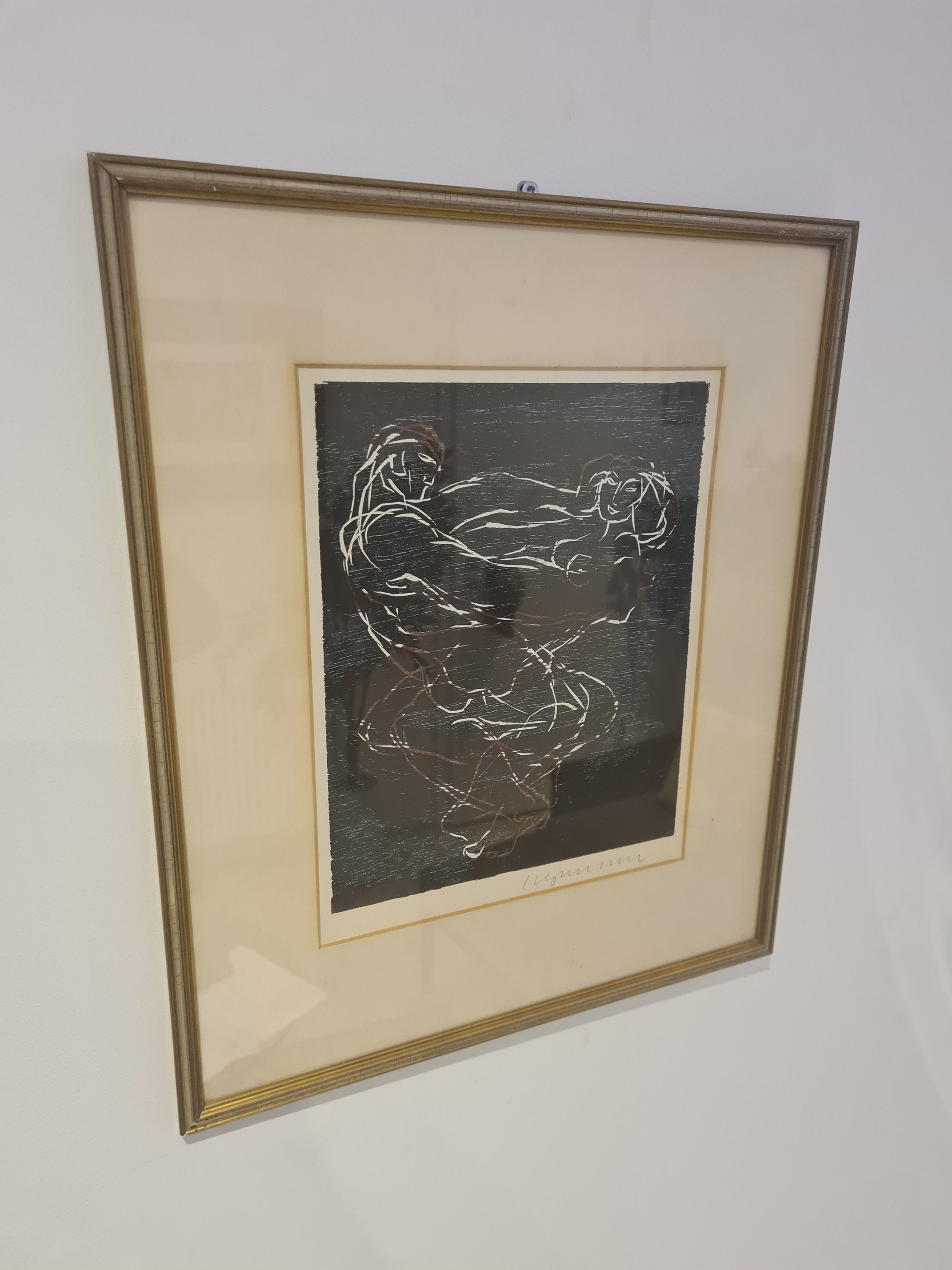 wir präsentieren Ihnen einen expressiven Holzschnitt mit der Darstellung eines Aktpaares. Die grafische Arbeit überzeugt durch klare Formen, starke Kontraste und die kraftvolle Ausdrucksweise des Mediums.