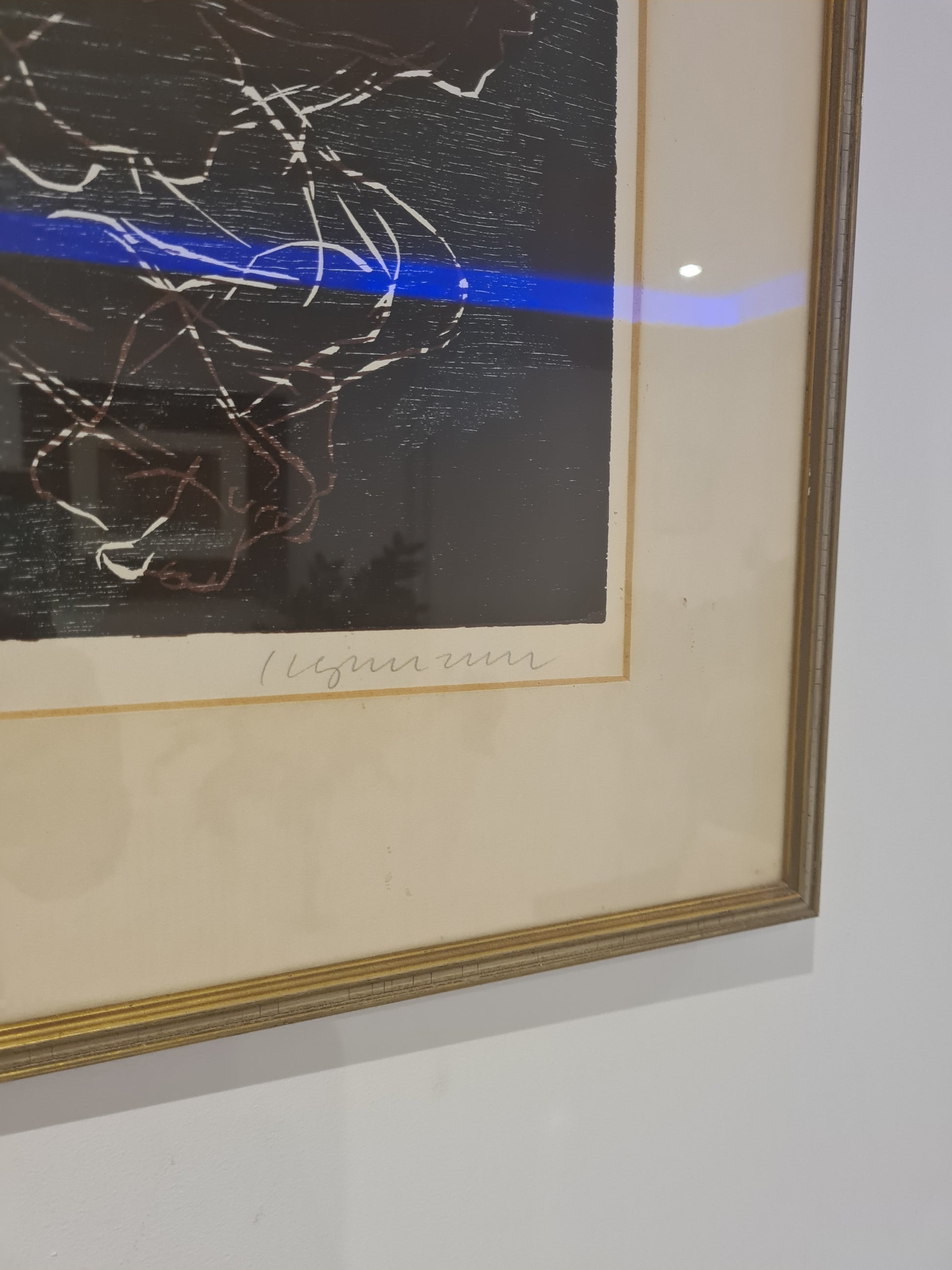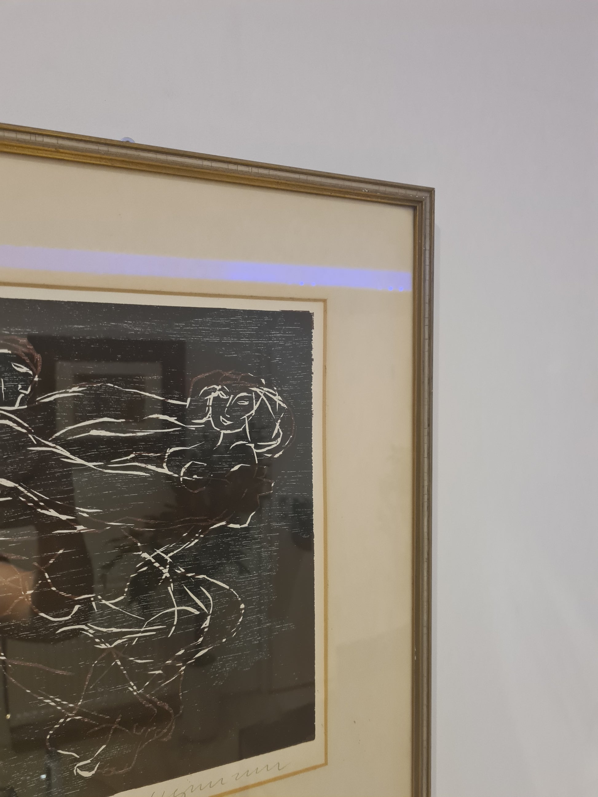 Original-Holzschnitt, signiert. Dargestellt ist ein Paar – Frau und Mann – in Aktdarstellung. Die reduzierte Formensprache und die starke Hell-Dunkel-Wirkung unterstreichen die Spannung zwischen Nähe und Abgrenzung der Figuren. Klassisches Beispiel moderner Grafik.